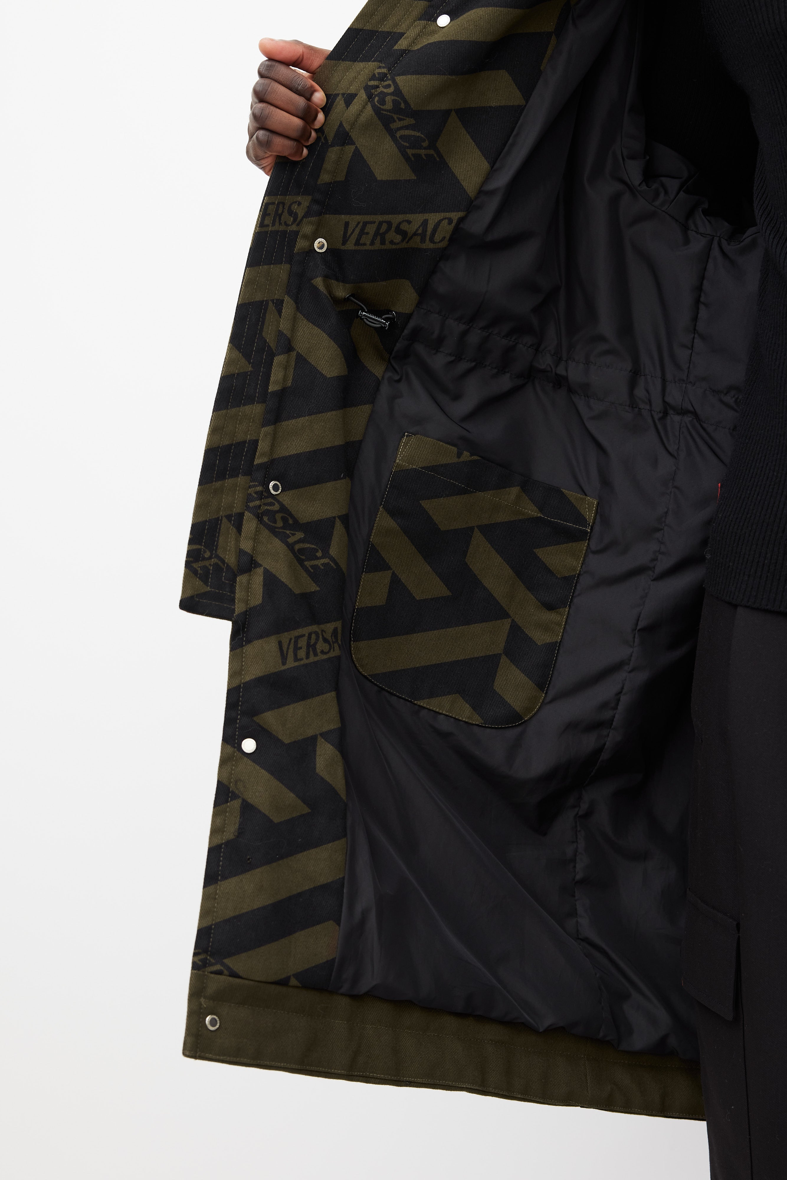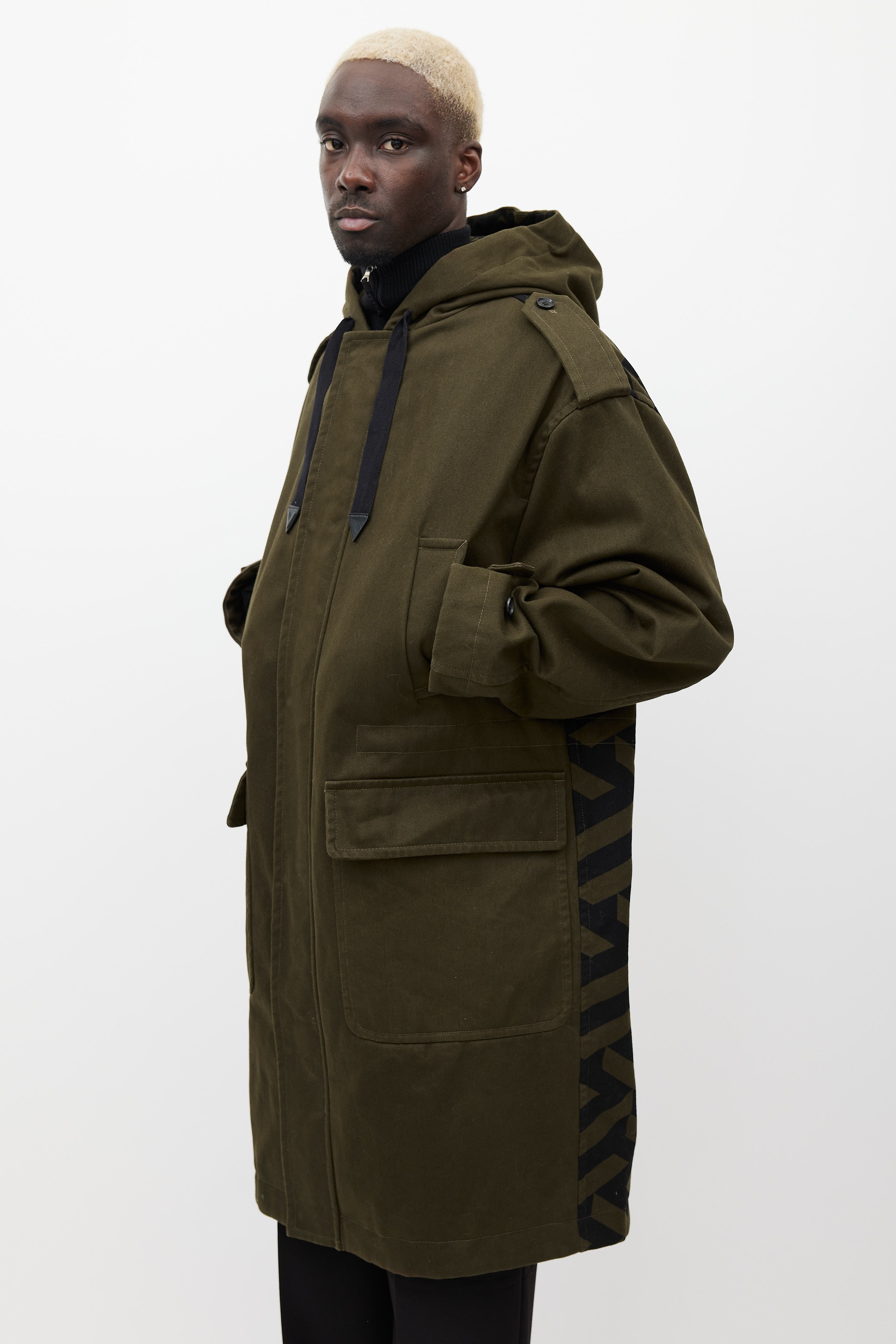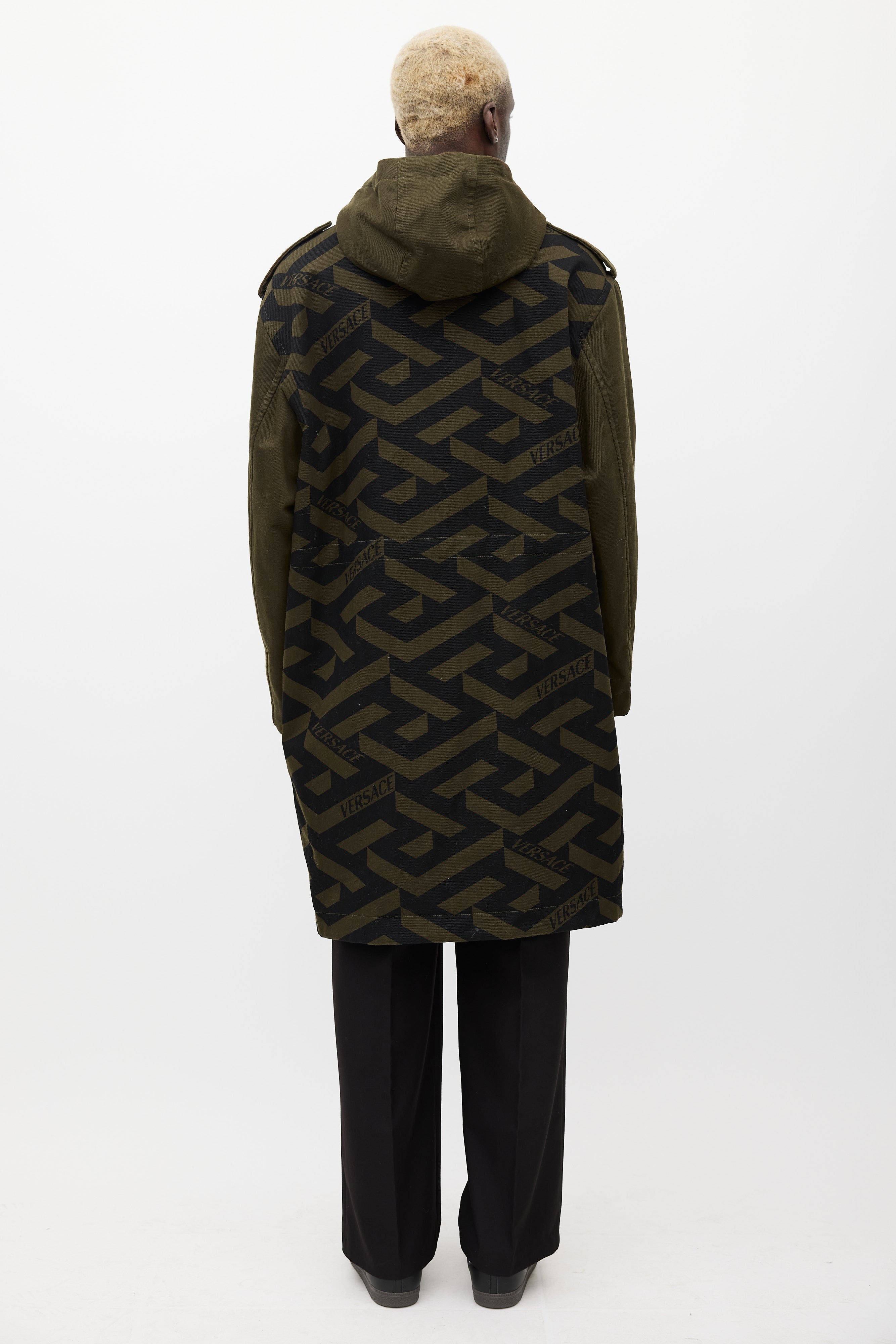 Pre-owned Versace green coat featuring a black logo monogram pattern at back, attached drawstring hood, epaulets at shoulder, long sleeves, two flap pockets at hip, two slip pockets at chest, drawstring waist, and zip closure. Lined.