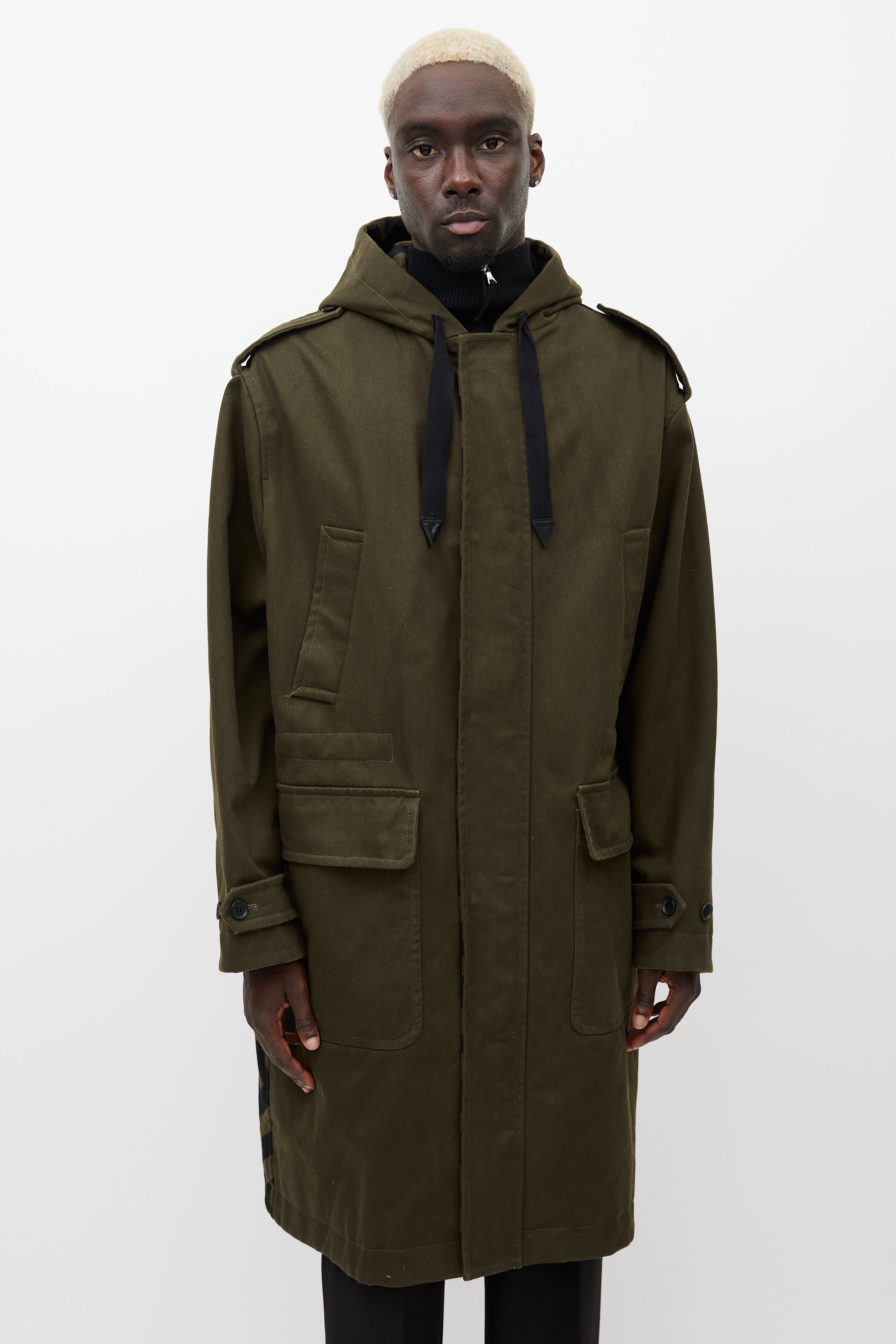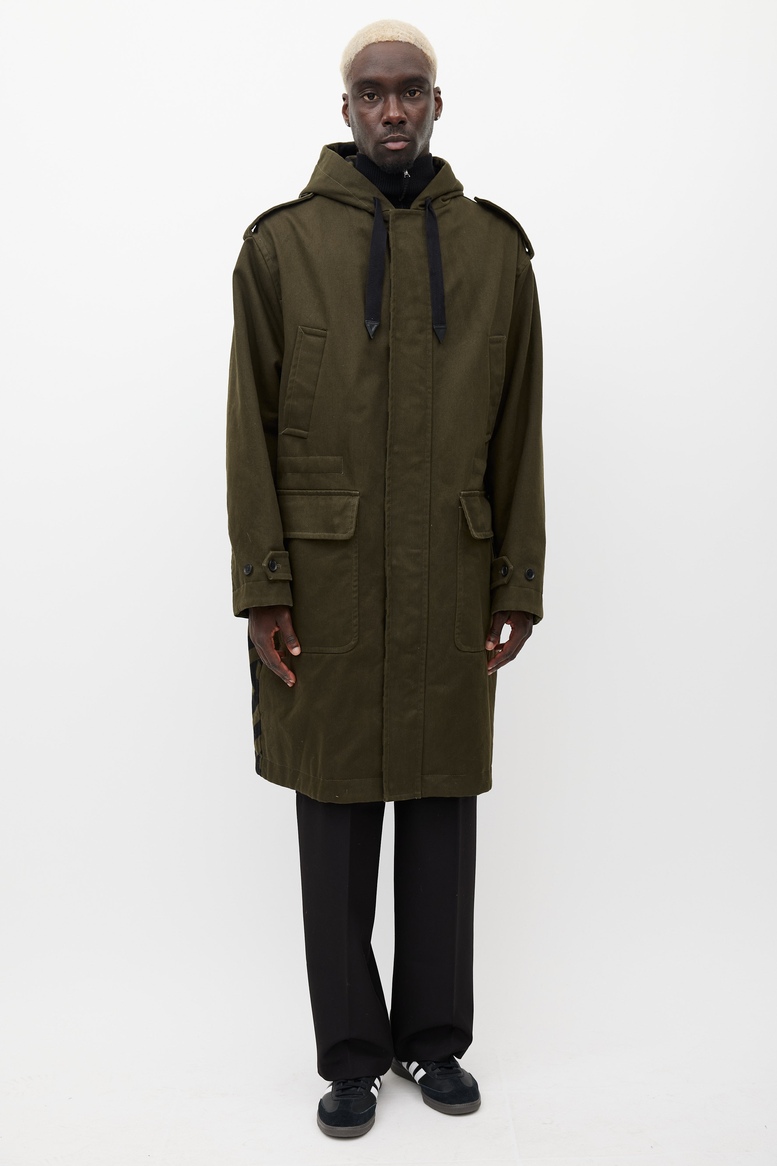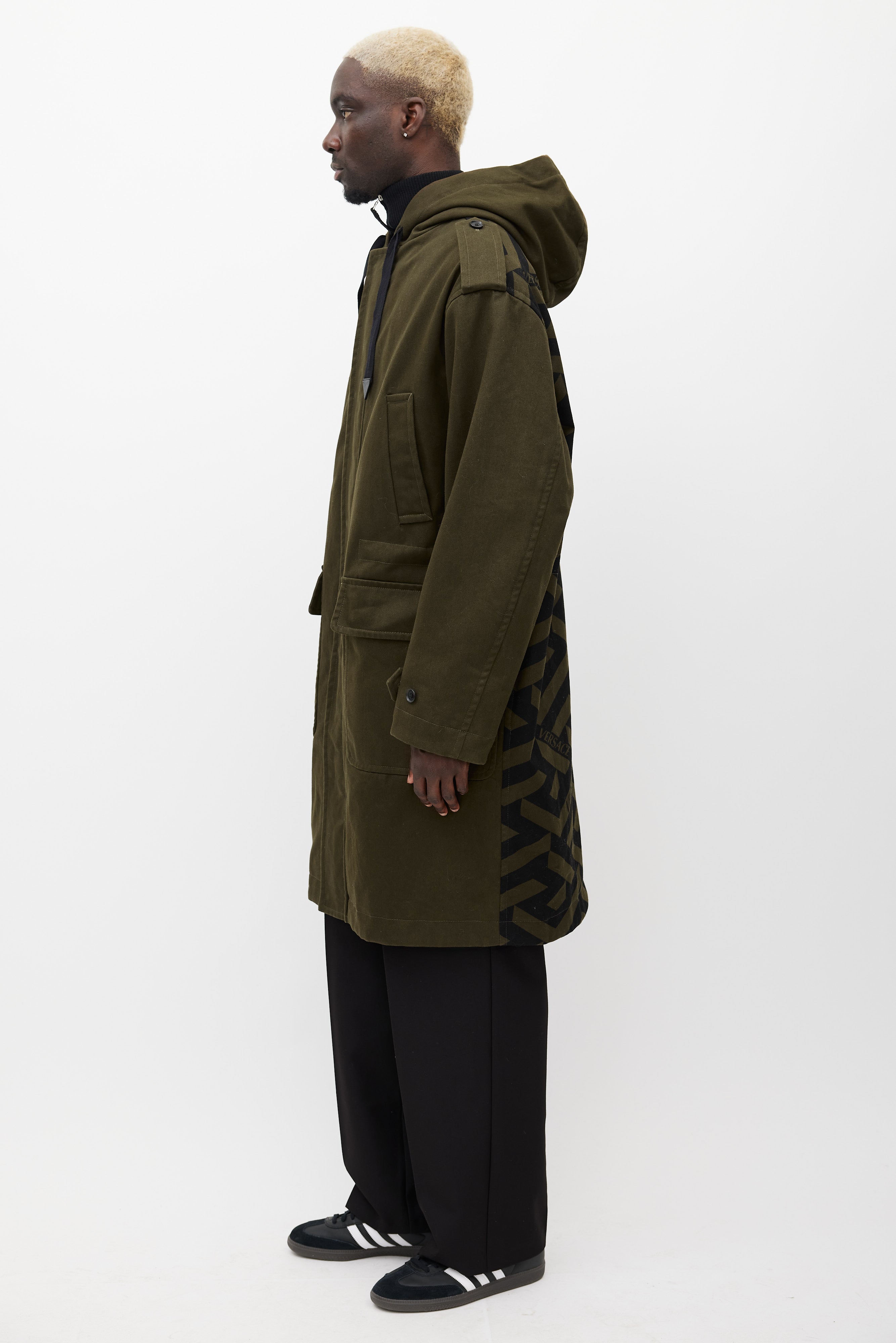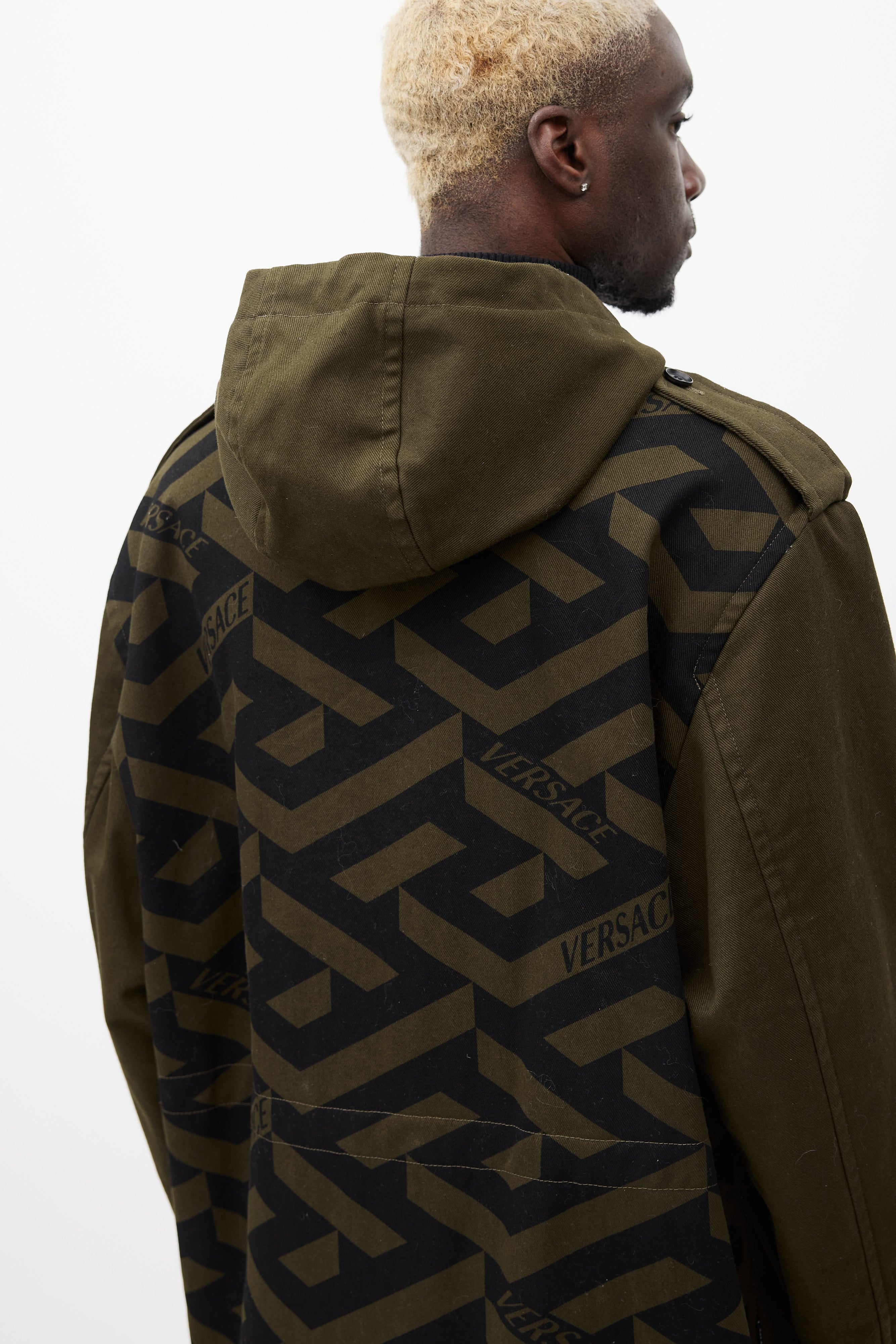 Pre-owned Versace green coat featuring a black logo monogram pattern at back, attached drawstring hood, epaulets at shoulder, long sleeves, two flap pockets at hip, two slip pockets at chest, drawstring waist, and zip closure. Lined.