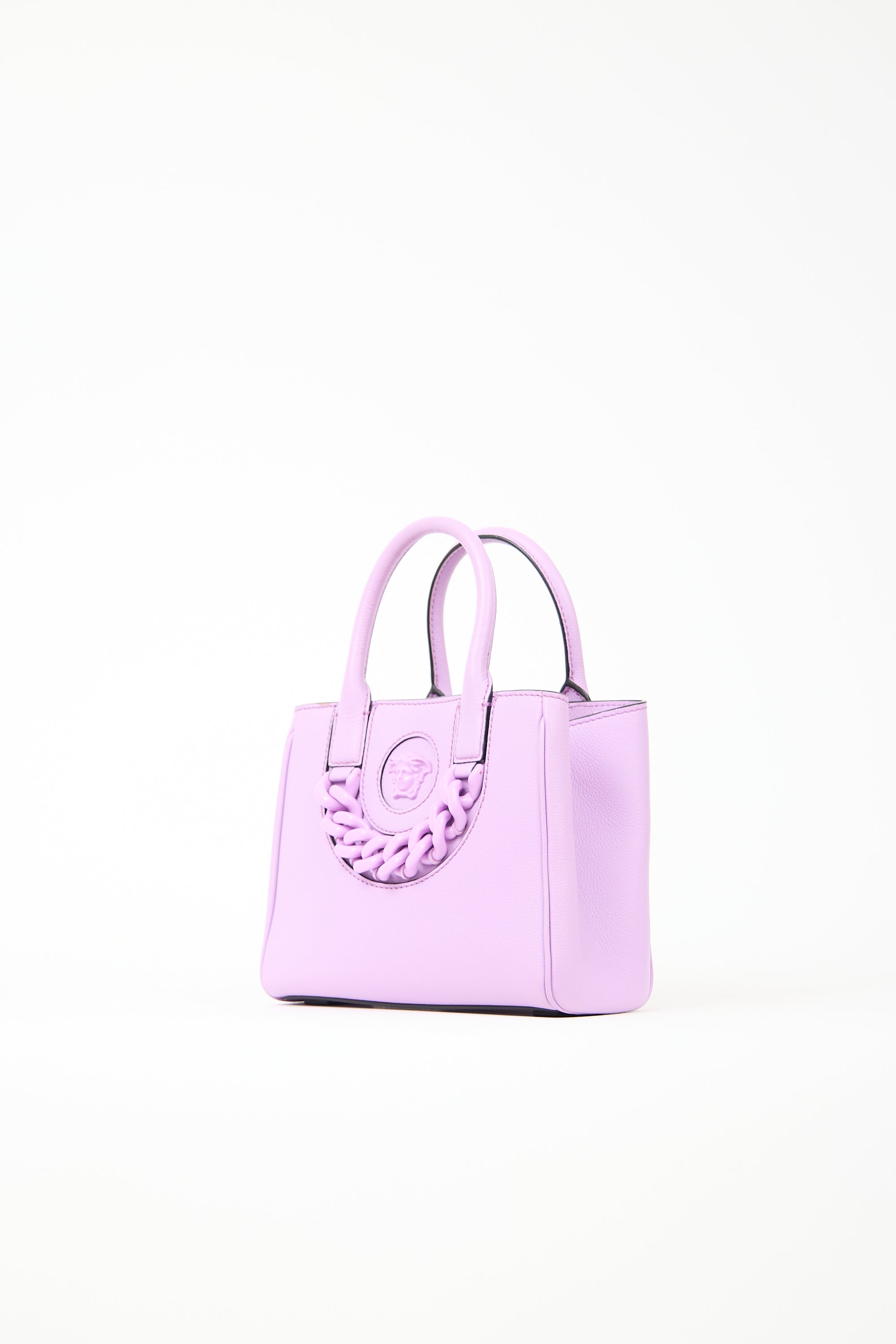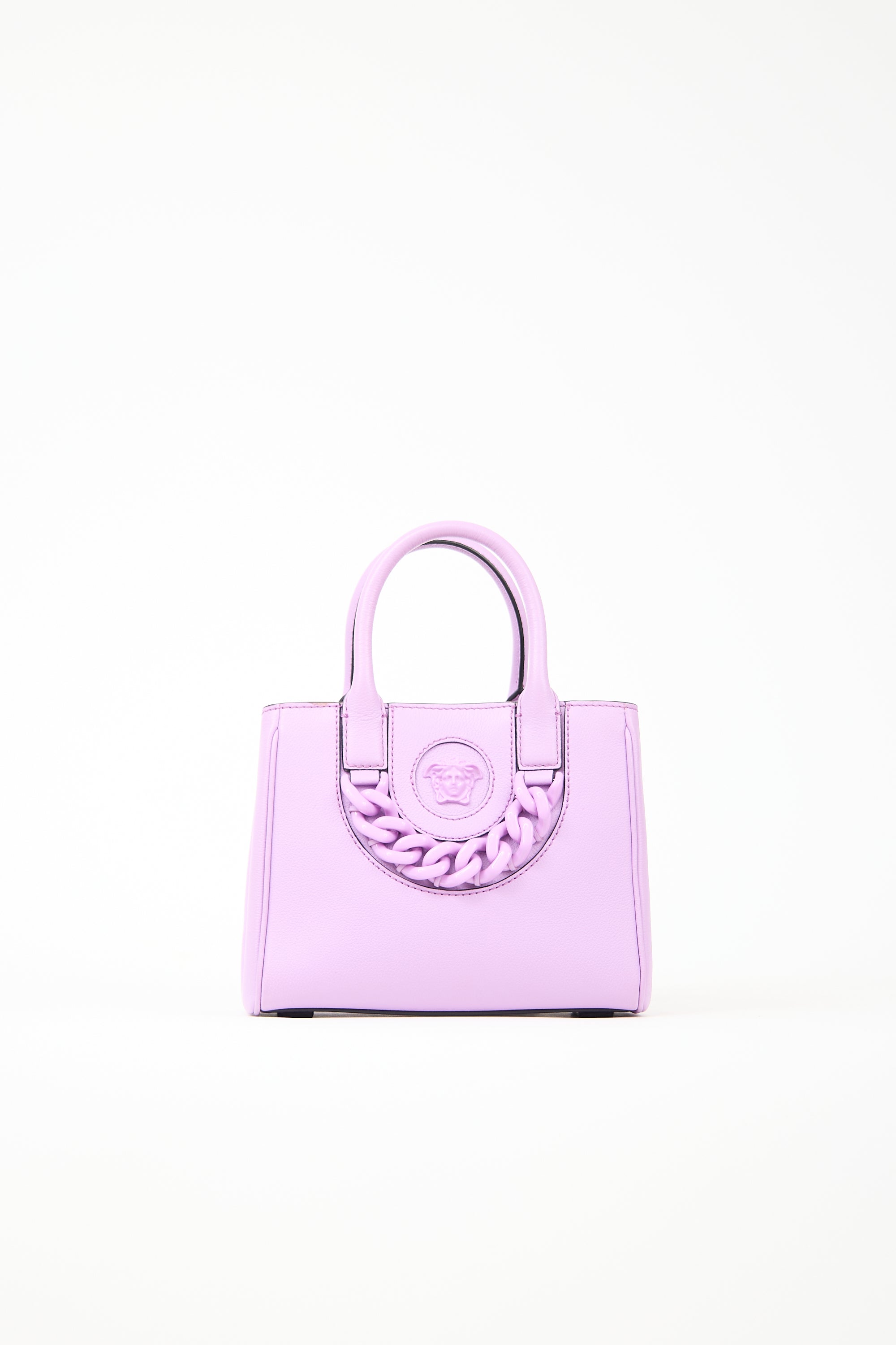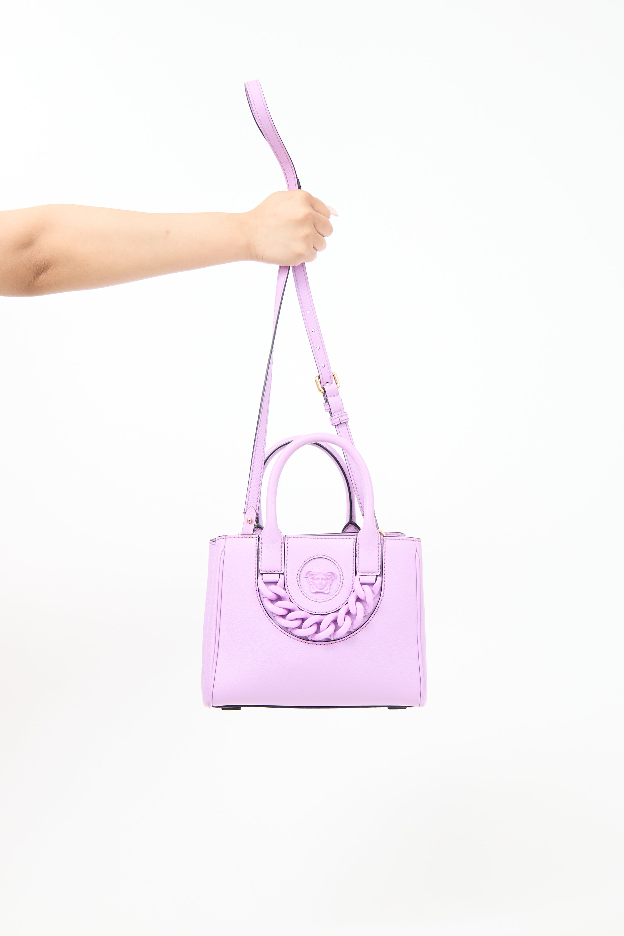 Pre-owned Versace purple leather La Medusa bag featuring tonal Medusa and chain embellishment, gold tone foil logo at bottom centre back, dual rolled top handles, removable and adjustable shoulder strap, lobster clasp top closure, and one lined main compartment with one zip pocket and one slip pocket. Comes with original dust bag and care guide.