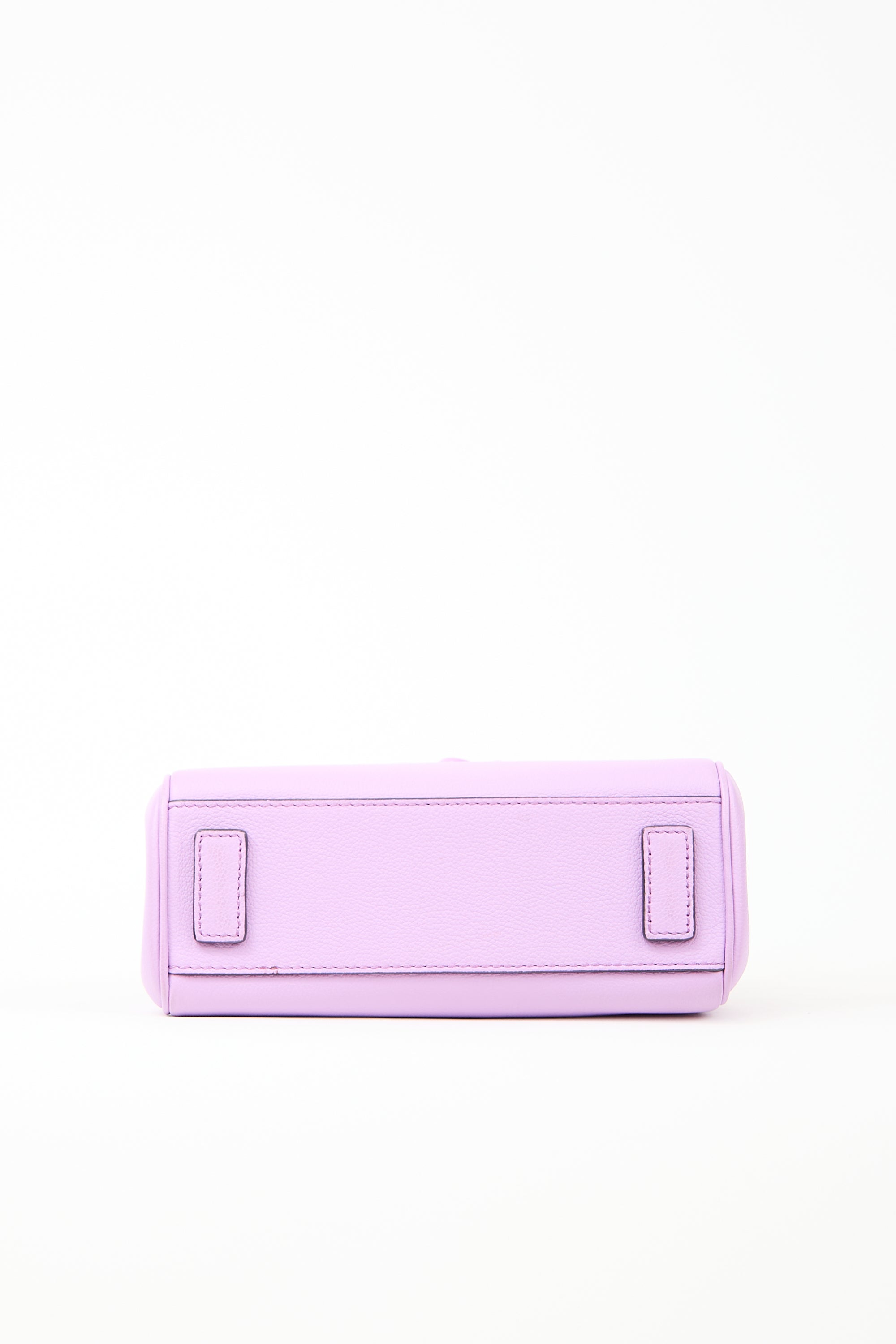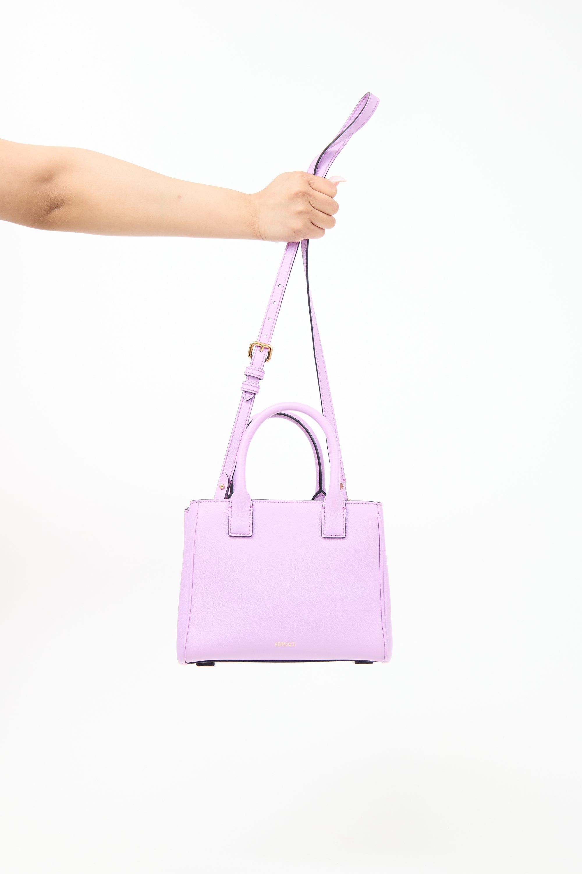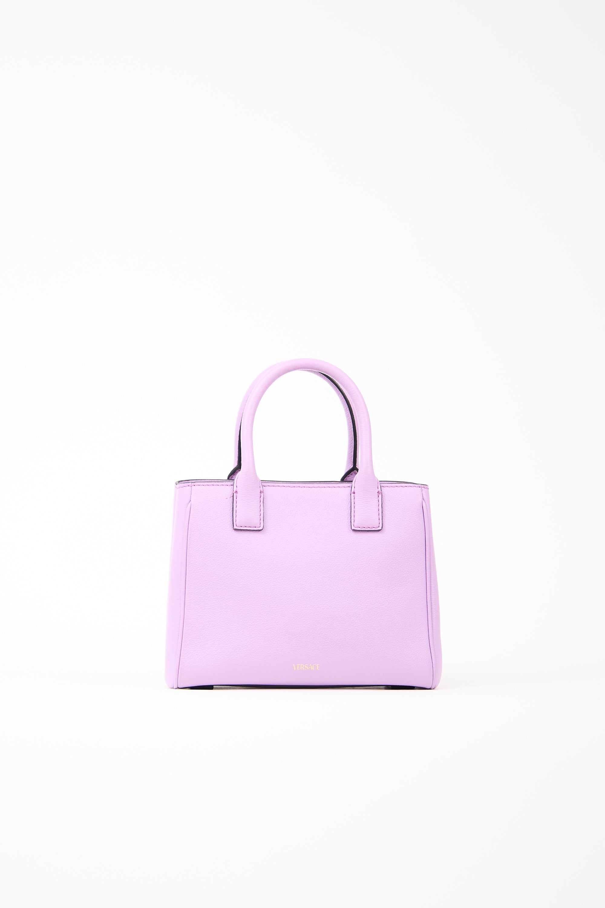 Pre-owned Versace purple leather La Medusa bag featuring tonal Medusa and chain embellishment, gold tone foil logo at bottom centre back, dual rolled top handles, removable and adjustable shoulder strap, lobster clasp top closure, and one lined main compartment with one zip pocket and one slip pocket. Comes with original dust bag and care guide.