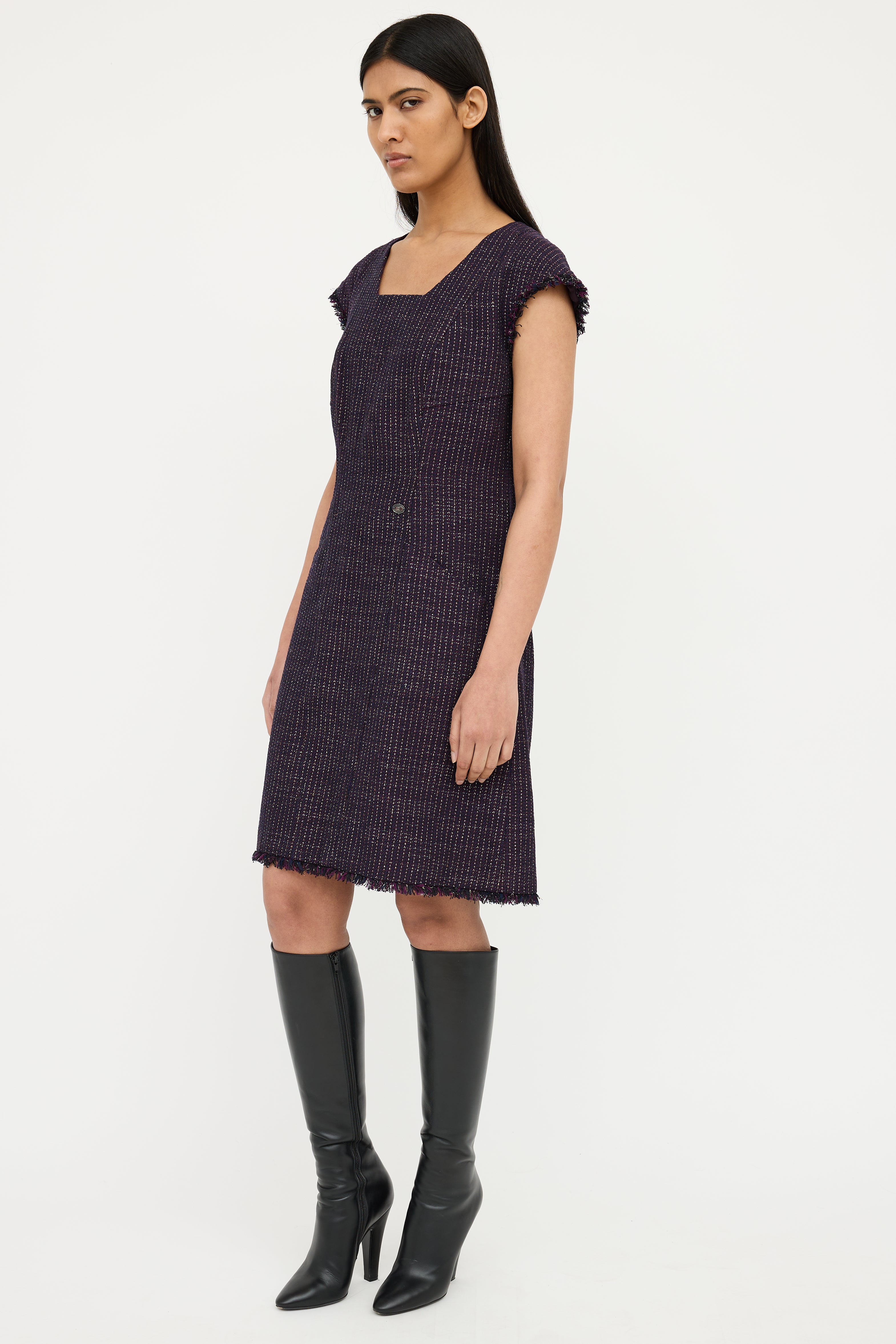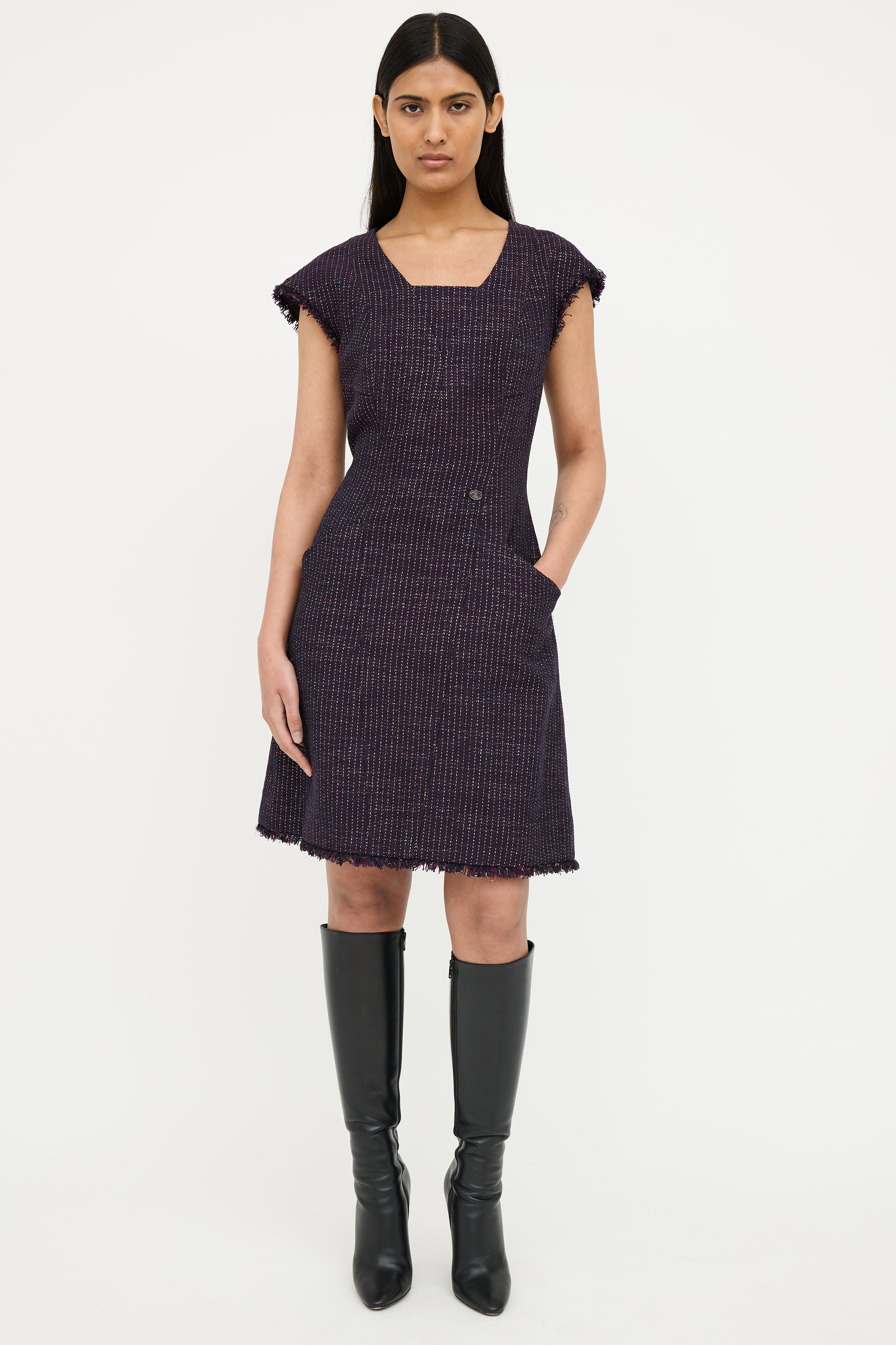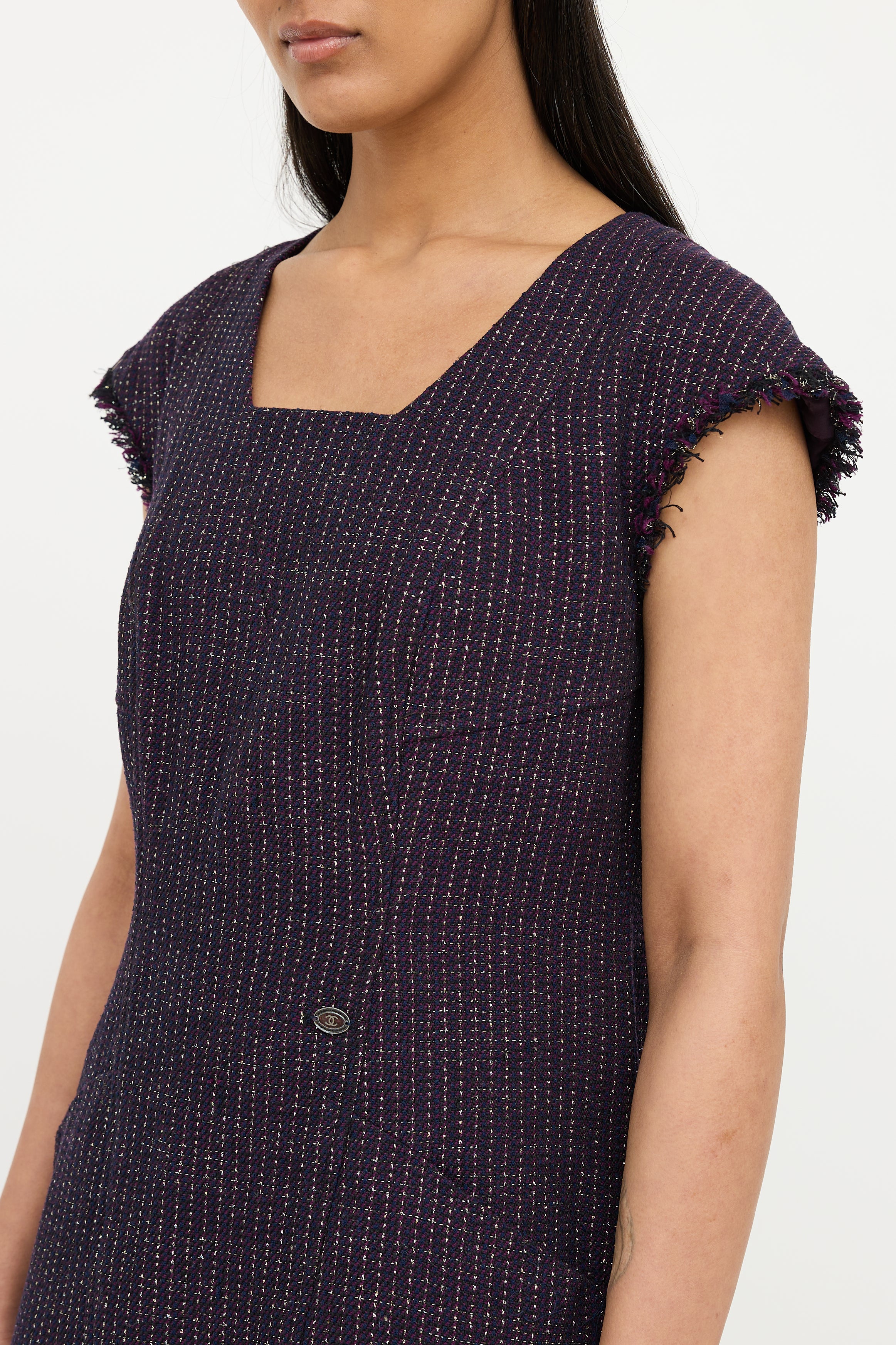 Pre-owned Chanel Spring 2008 purple short sleeve dress featuring square neck, cap sleeves with fringe, sparkle tweed, silver tone CC button detail on waist, dual slip pockets on waist, fringe hem and zip back. Fully lined.