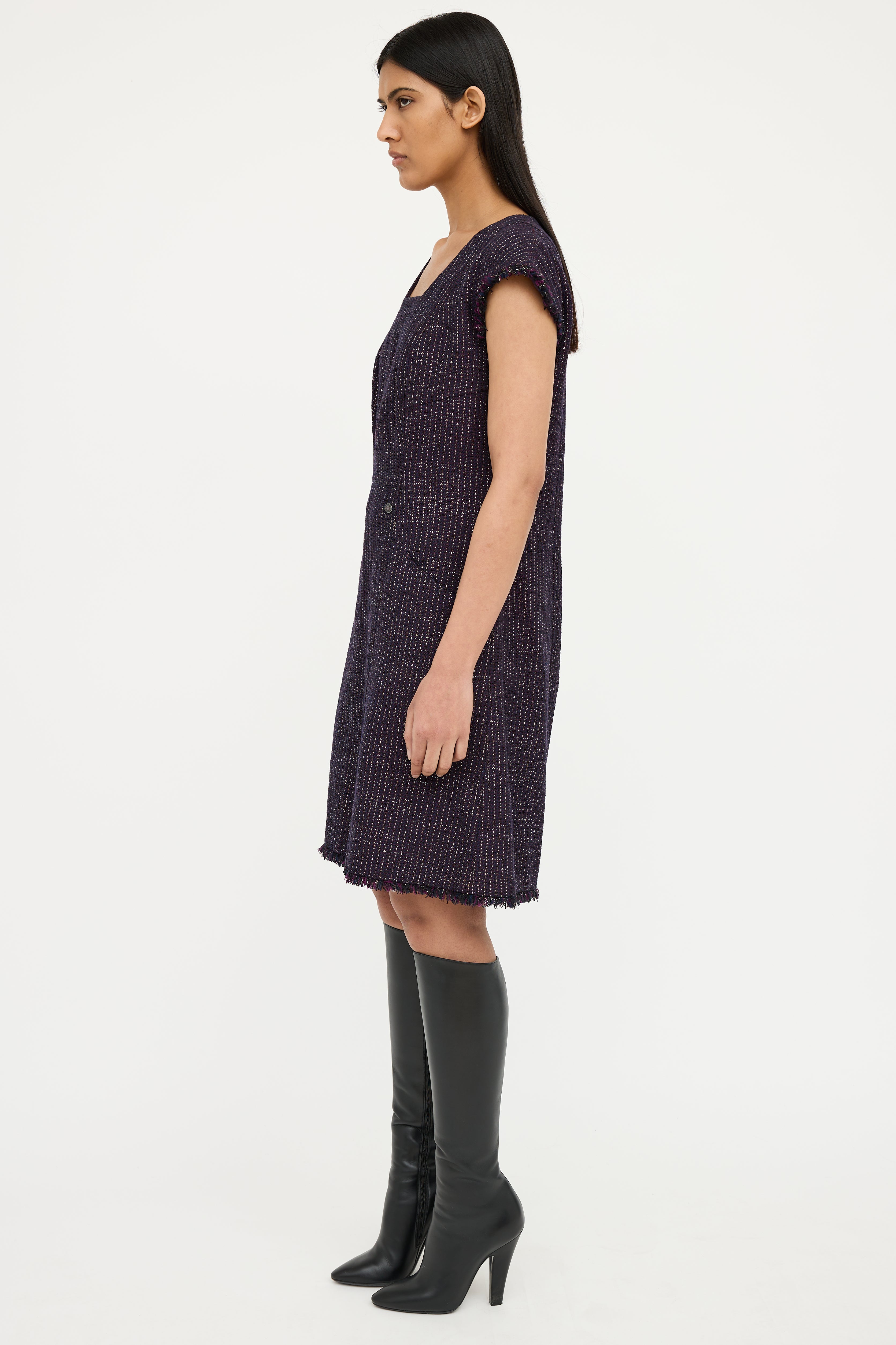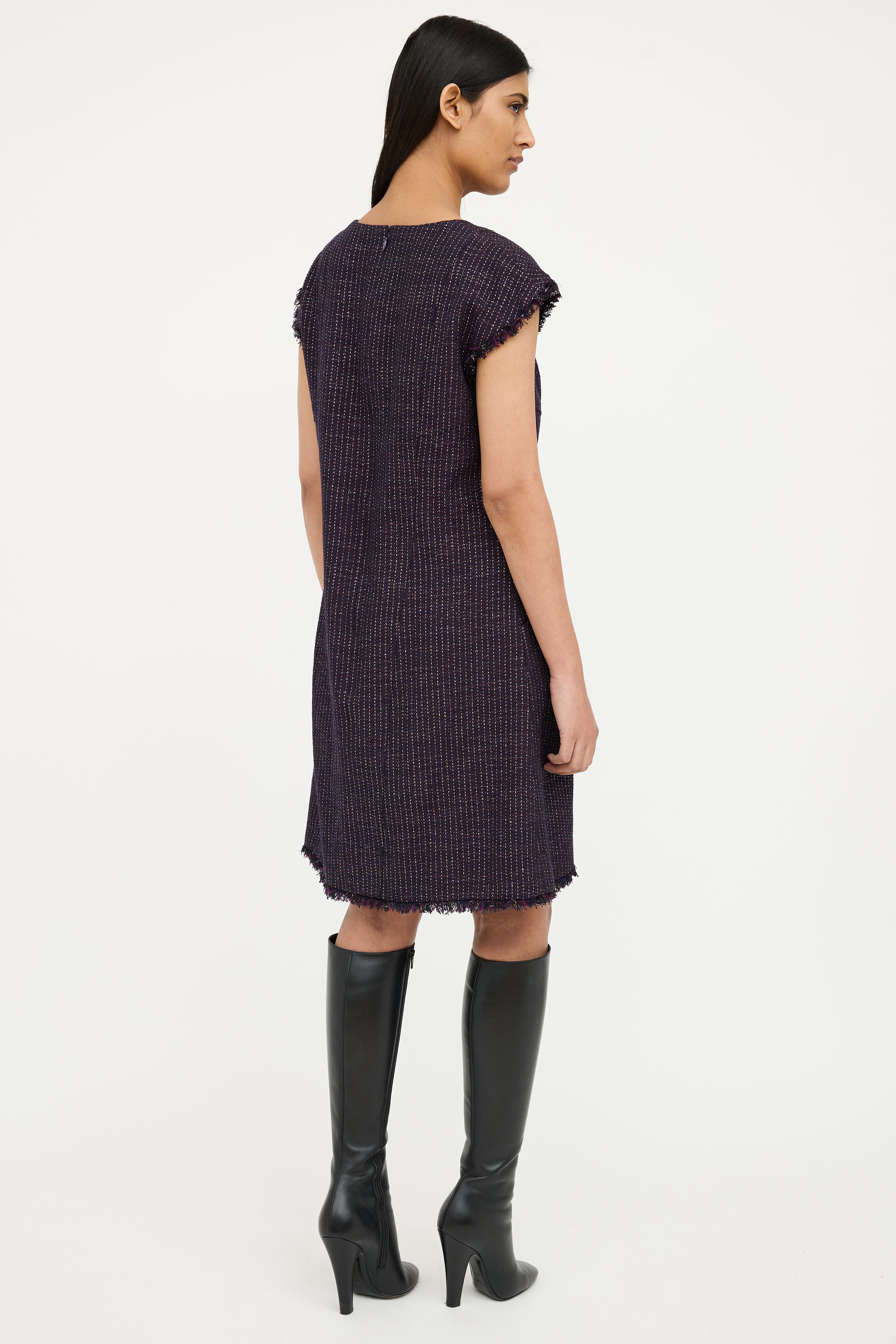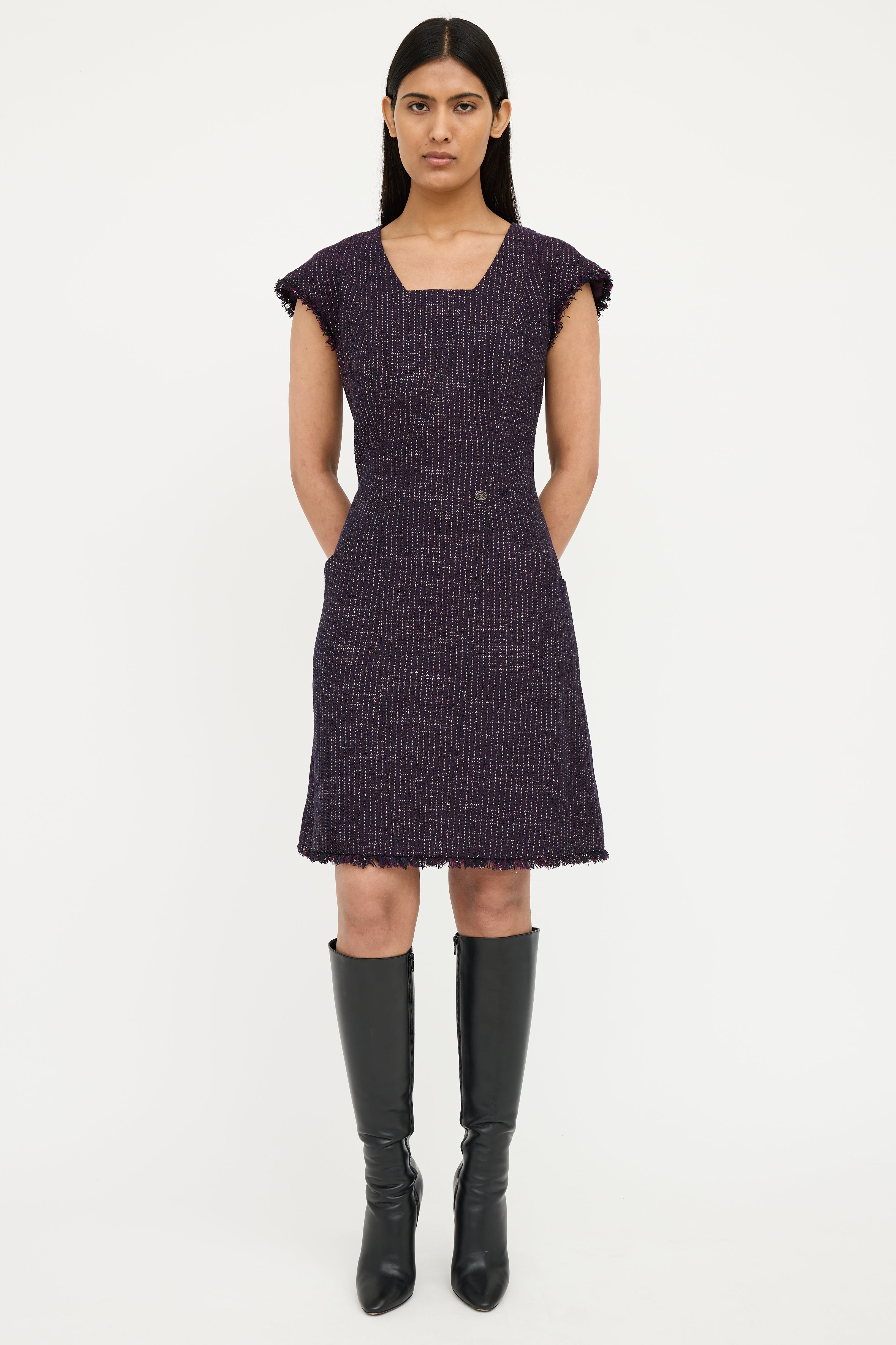 Pre-owned Chanel Spring 2008 purple short sleeve dress featuring square neck, cap sleeves with fringe, sparkle tweed, silver tone CC button detail on waist, dual slip pockets on waist, fringe hem and zip back. Fully lined.