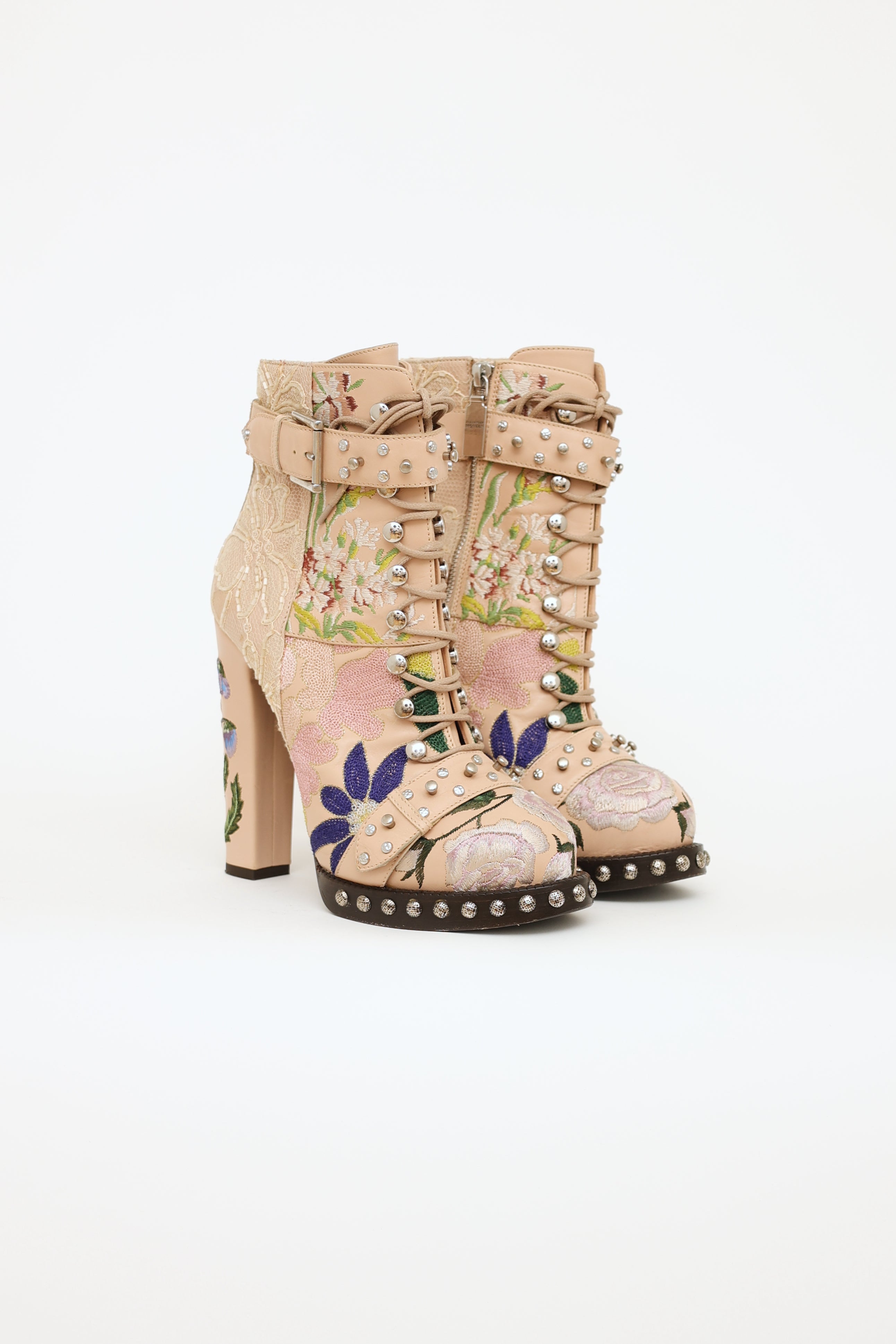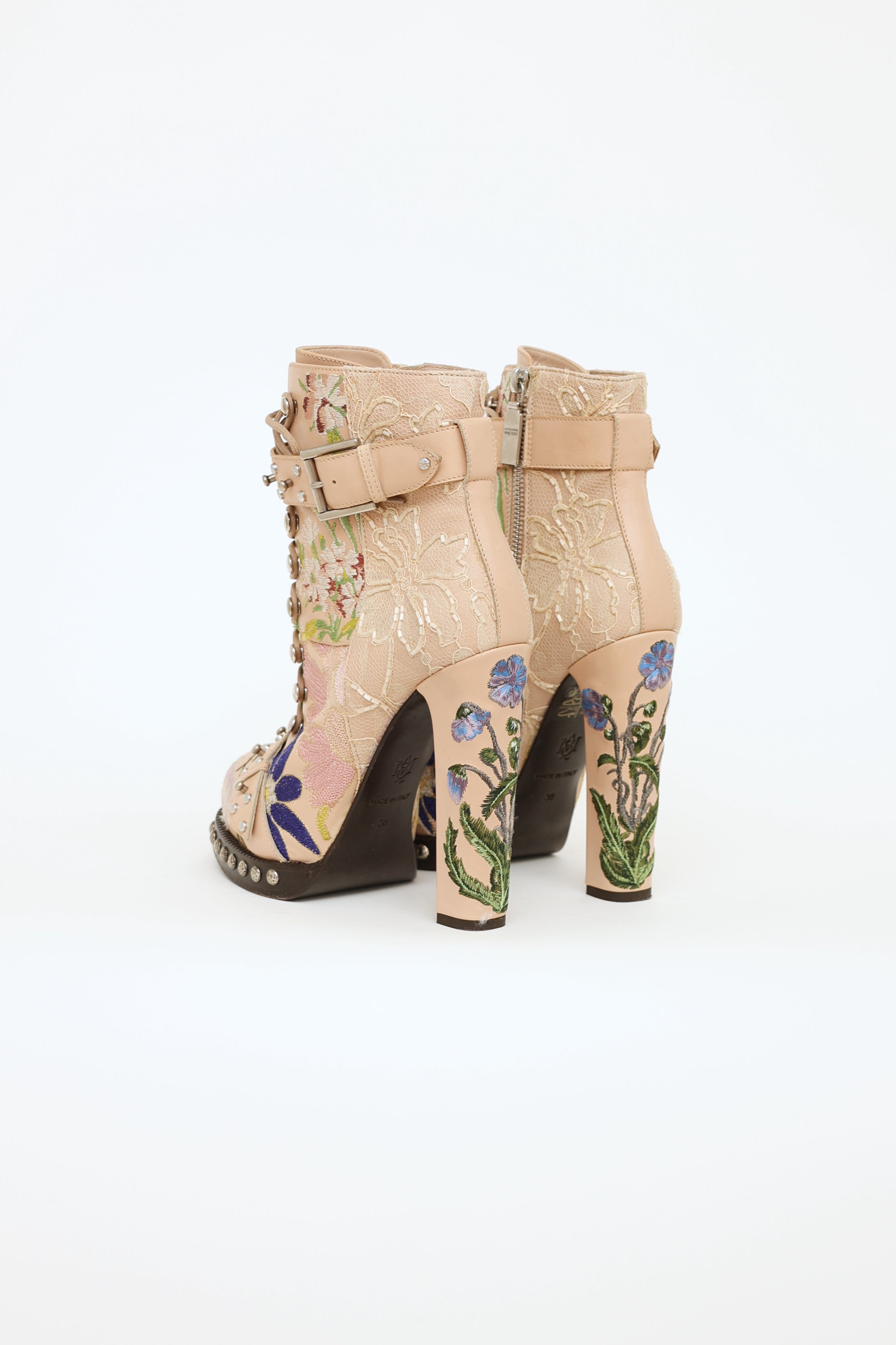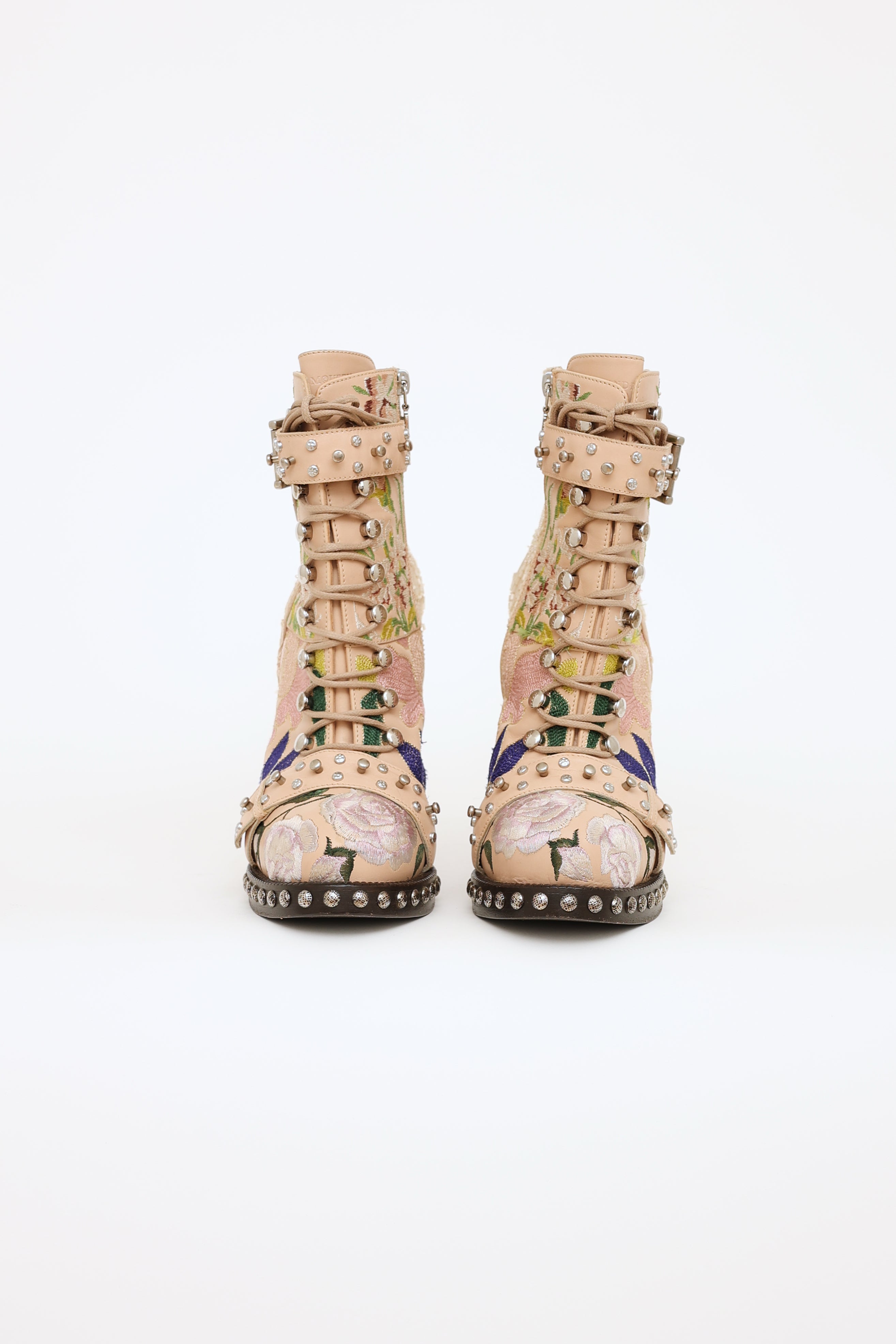 Pre-owned Alexander McQueen beige lace embroidered boots featuring an almond toe, beige leather upper with embroidered floral motifs throughout, beige leather counter with white embroidered lace, strap over toe box with silver-tone stud detailing, lace-up vamp with strap and tang buckle closure at ankle with additional silver-tone studded detailing, short ankle shaft, zip closure on inner side, block heel with additional embroidered detailing, silver-tone studs on midsole and leather insole.