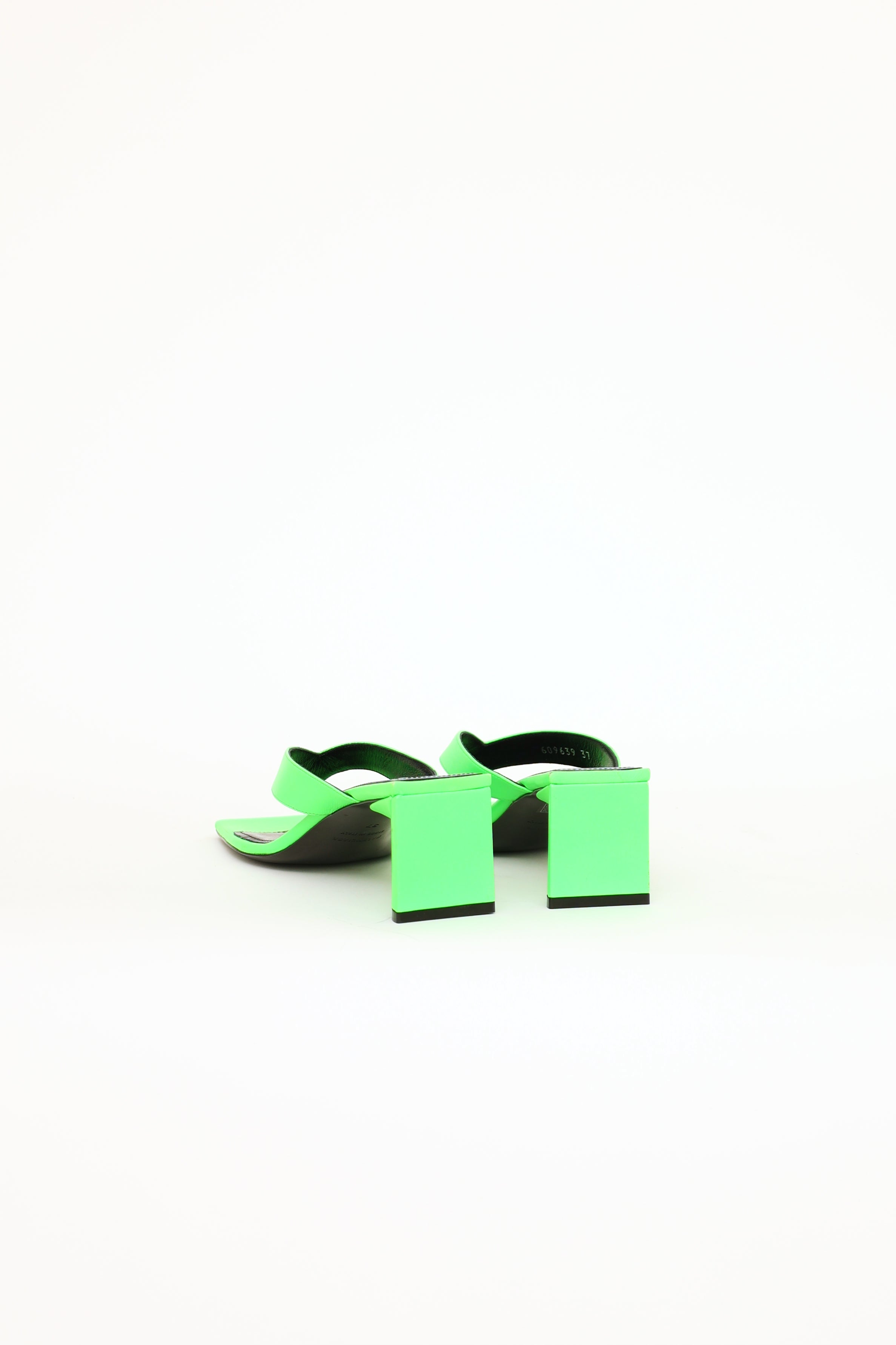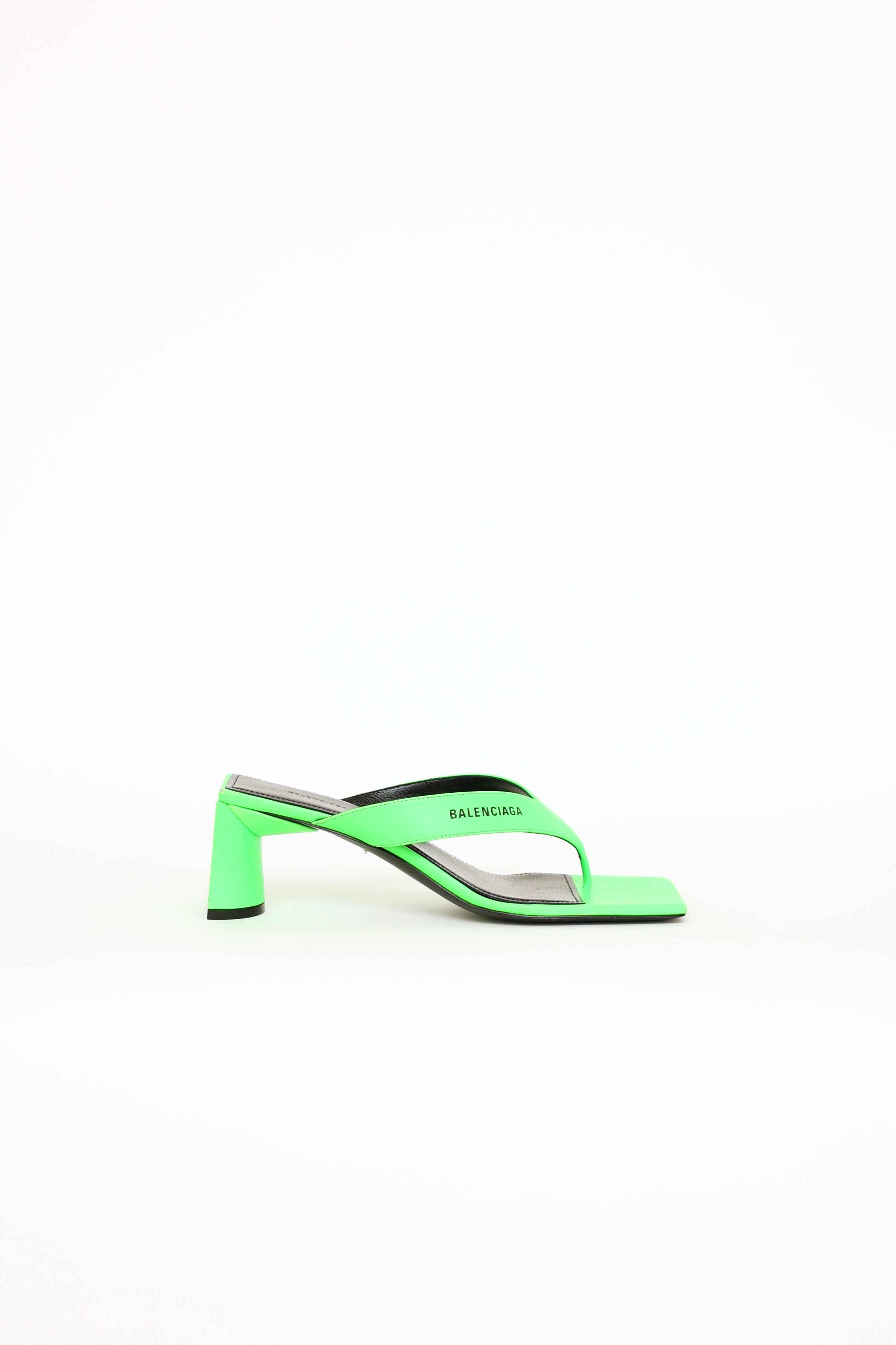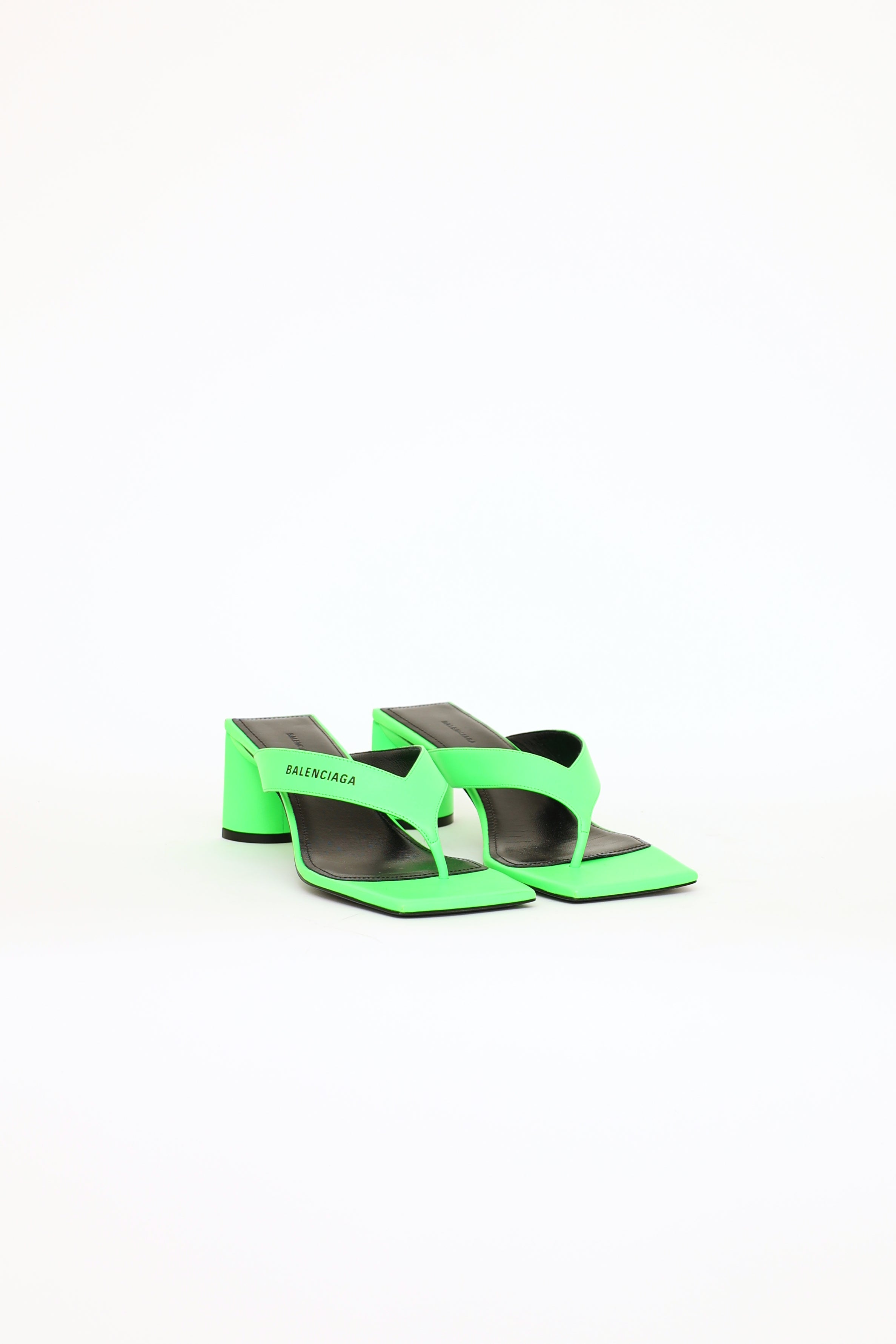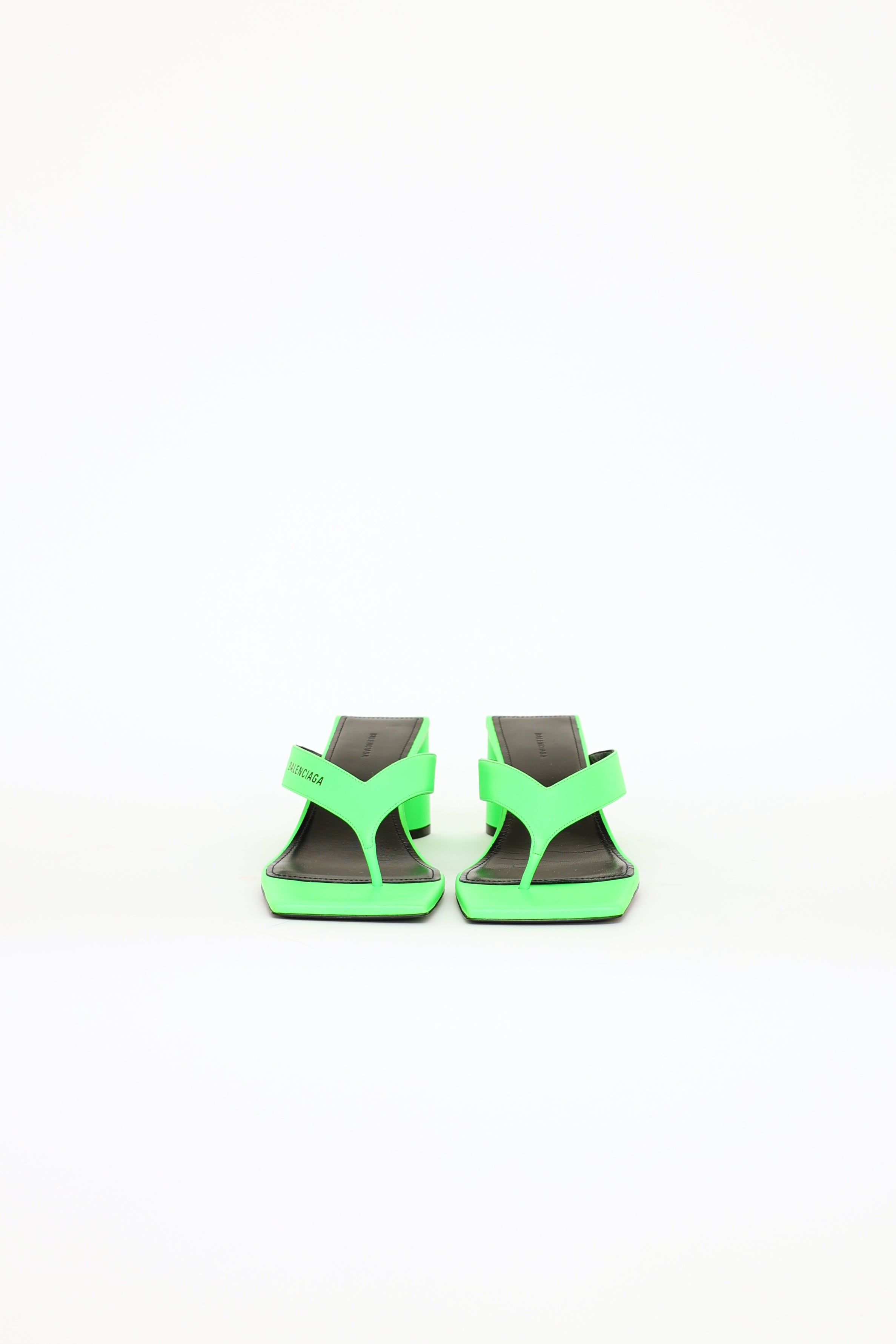 Pre-owned Balenciaga green double square thong sandals featuring a square open toe, thong style straps over upper, Balenciaga logo detail on right sandal, semi-circle style block heel and leather insole.