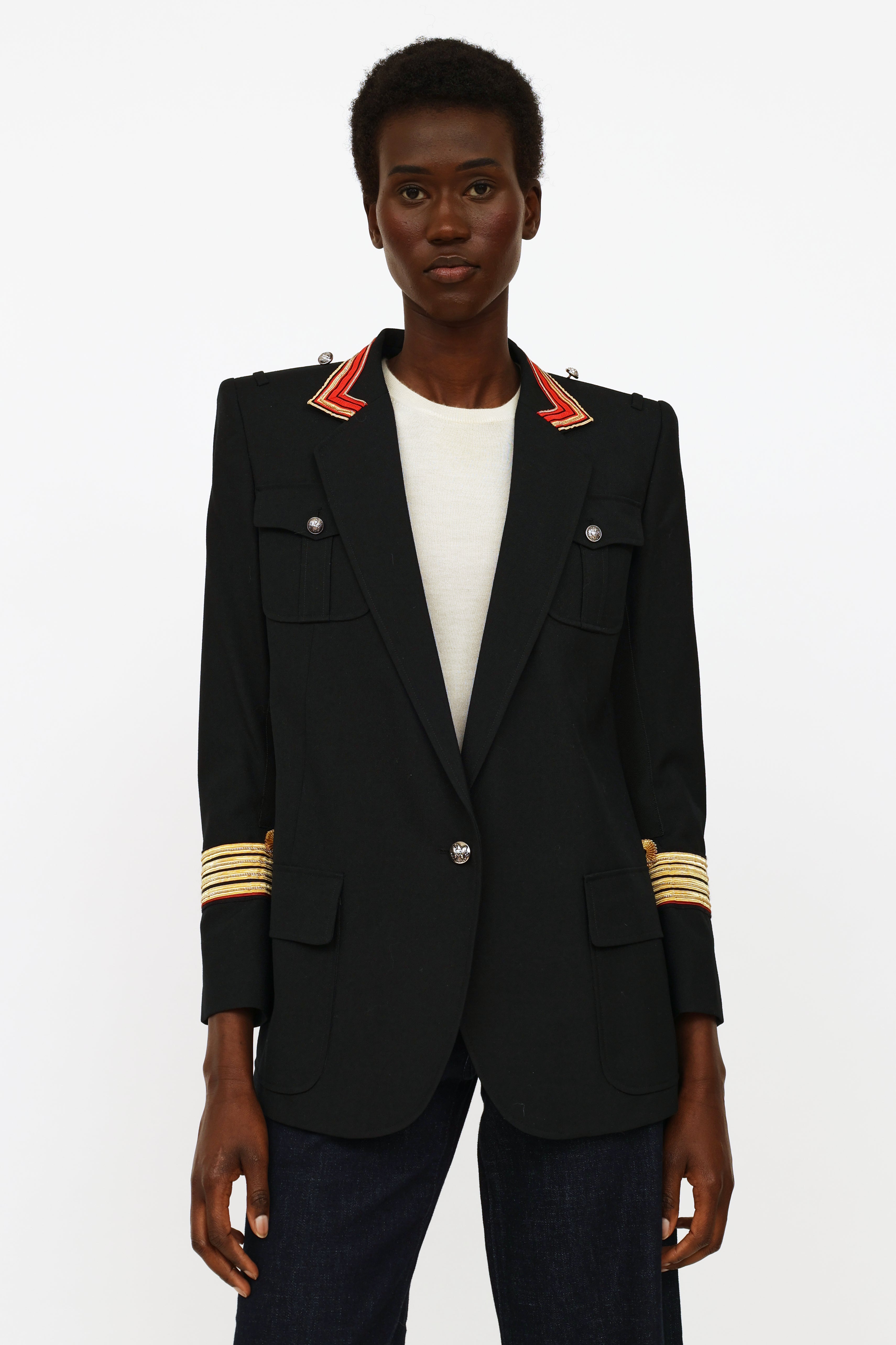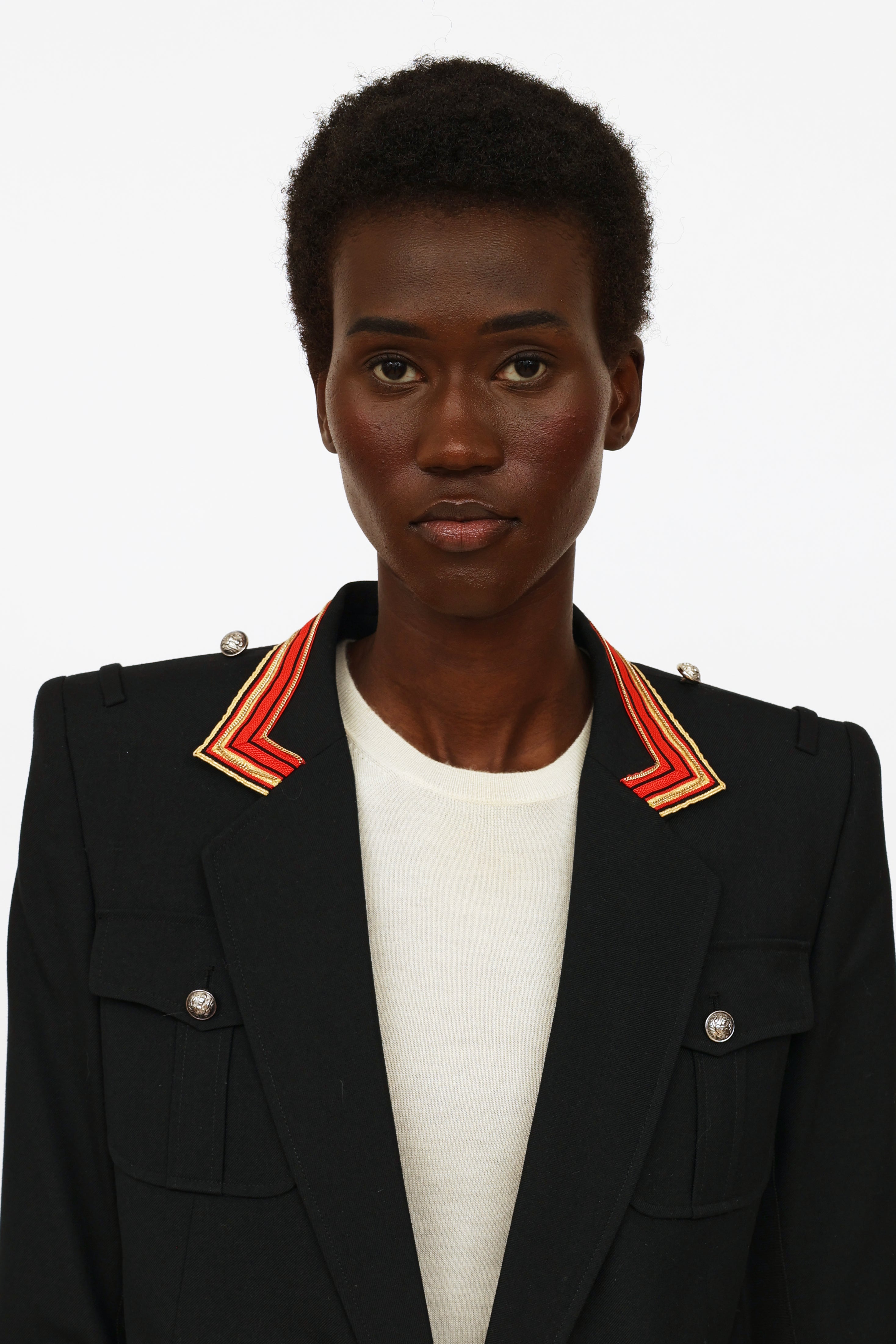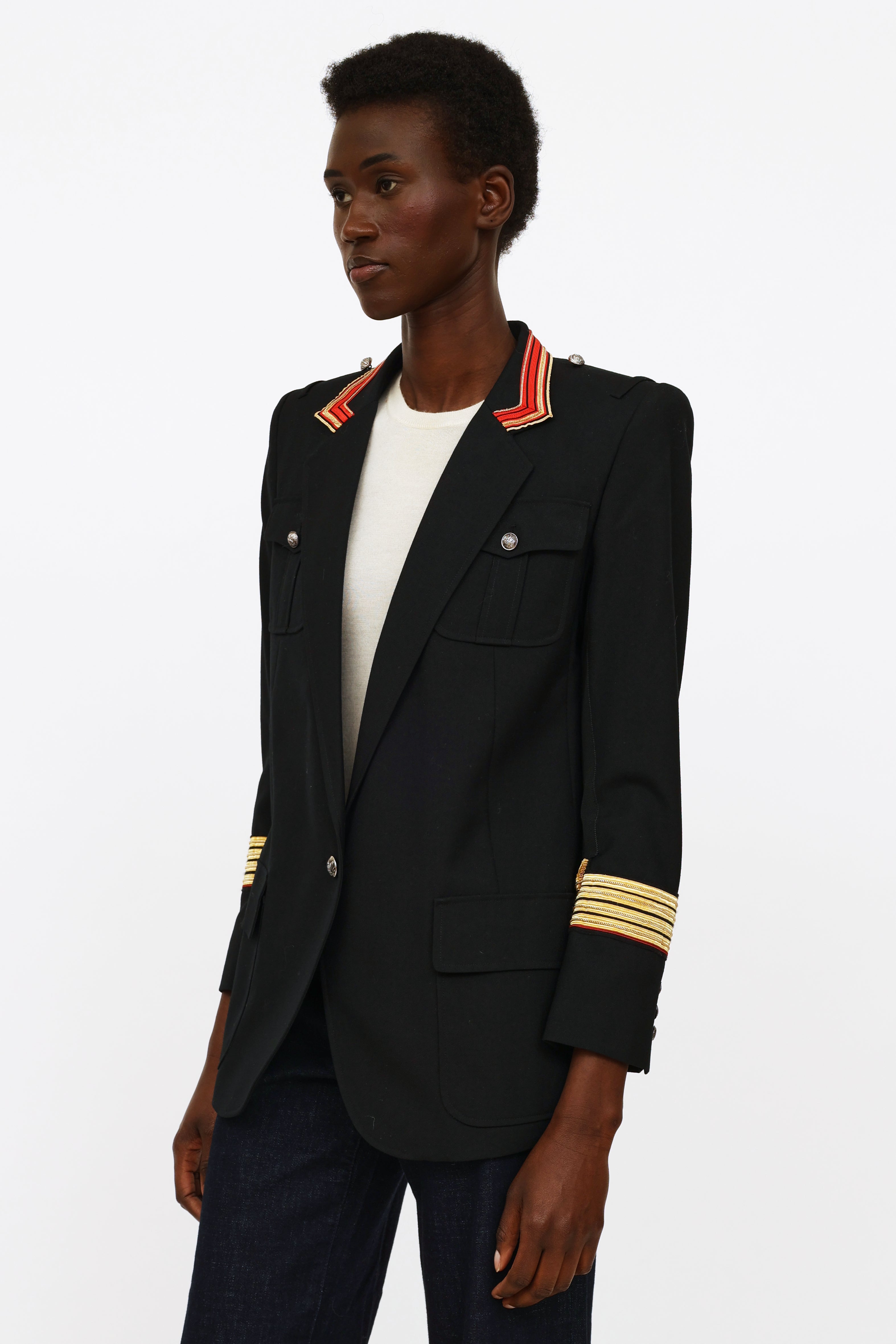 Pre-owned Balmain black wool military blazer featuring a notch lapel, heavily padded shoulders, three quarter length sleeves with buttoned cuffs, single button closure at centre front, dual patch pockets at chest, dual flap pockets at waist, single kick pleat at centre back, military style red and gold trim and silver-tone hardware.