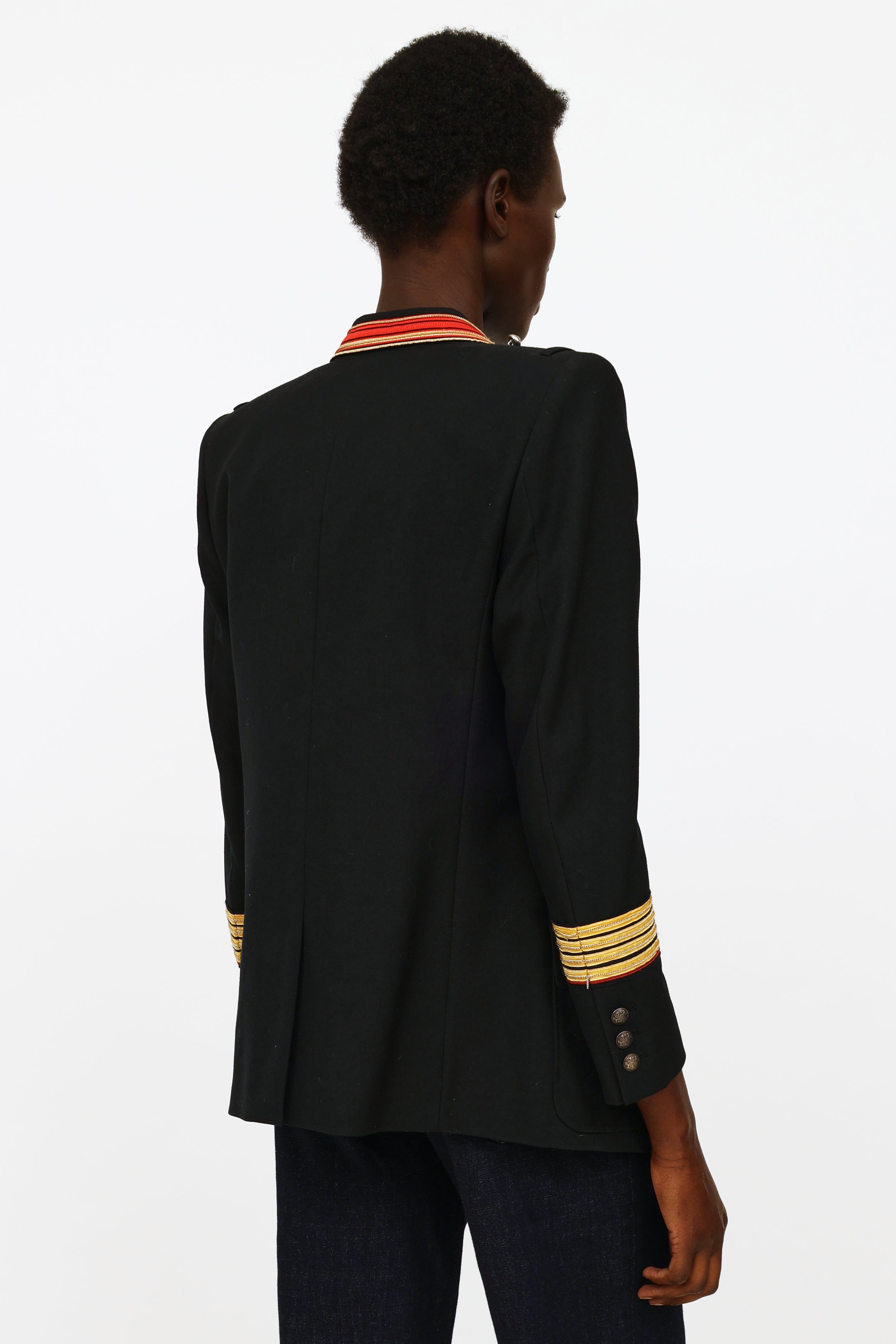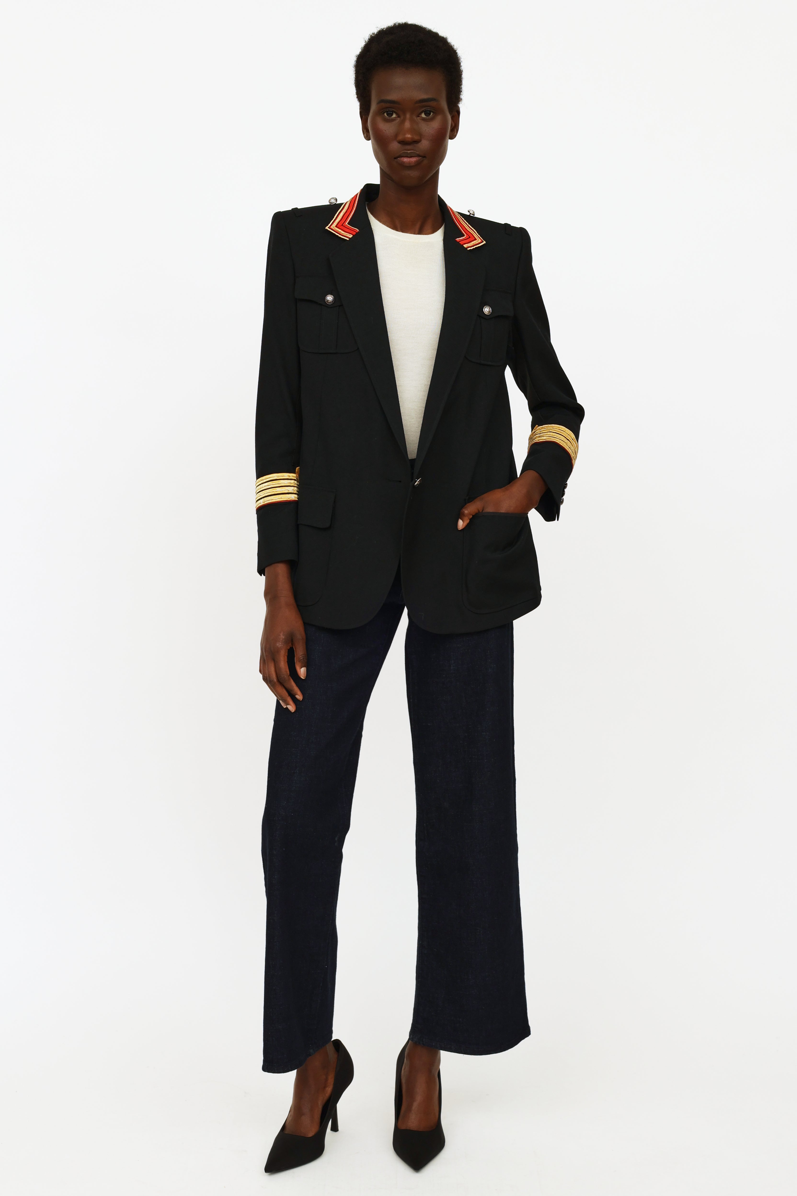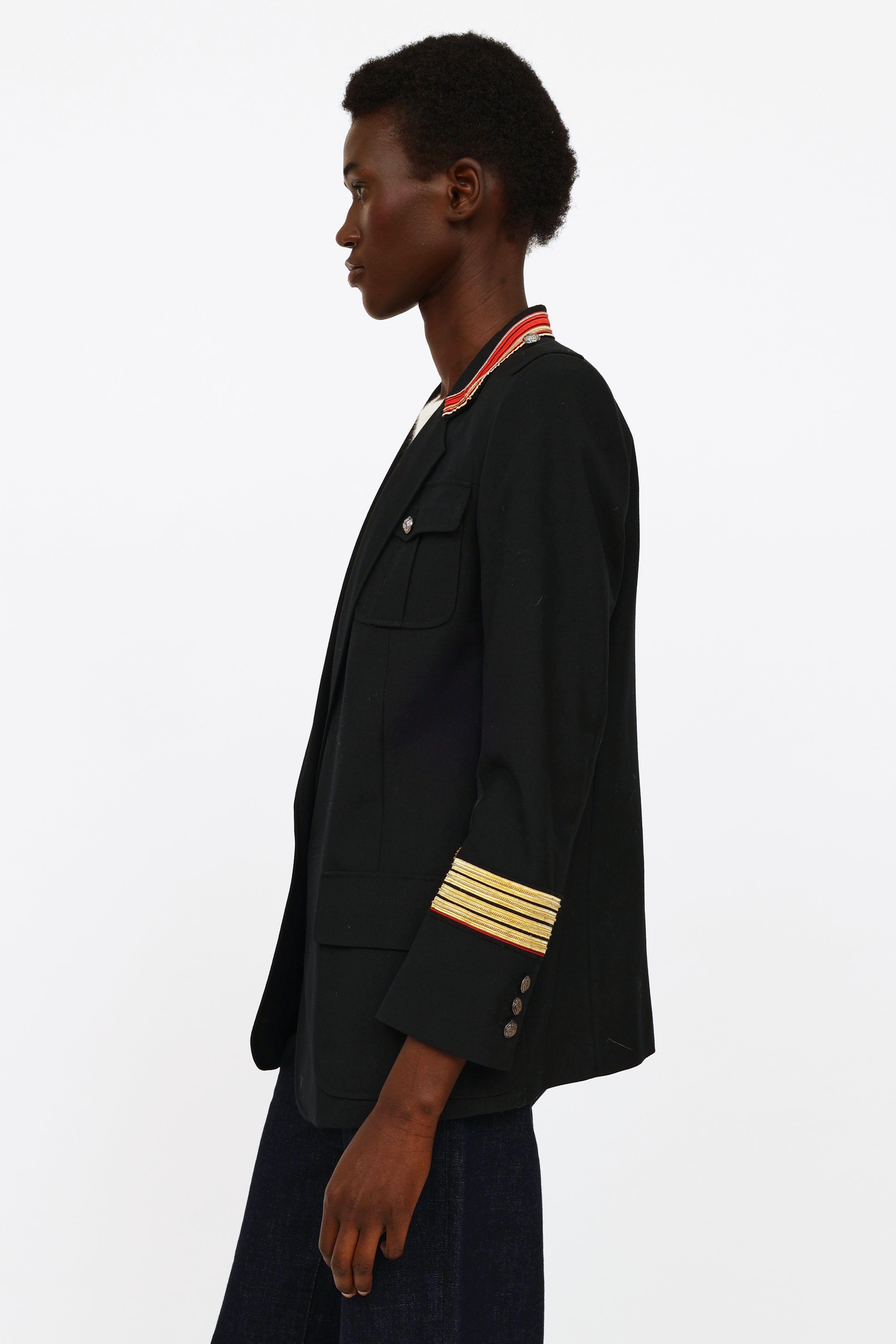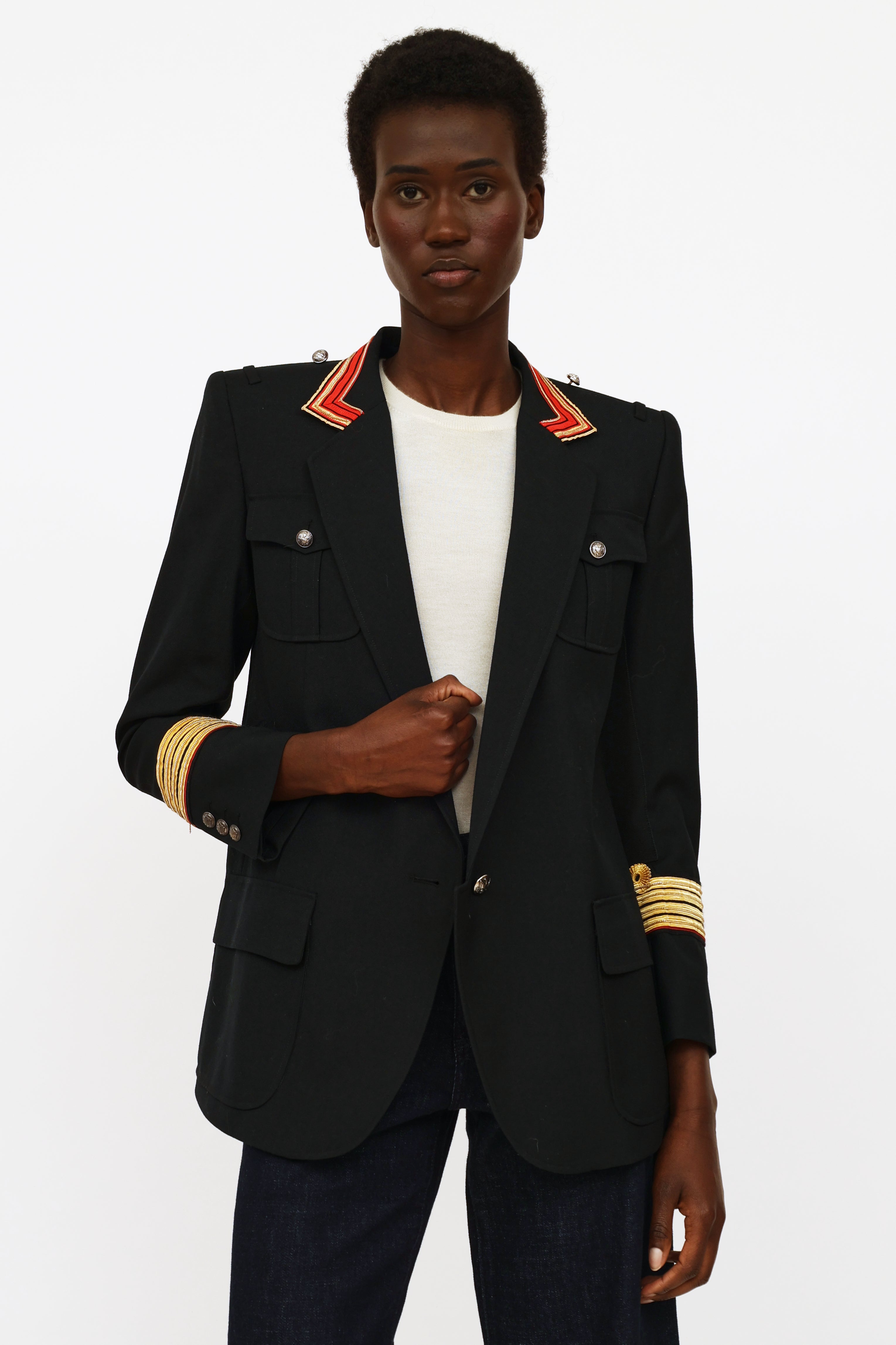 Pre-owned Balmain black wool military blazer featuring a notch lapel, heavily padded shoulders, three quarter length sleeves with buttoned cuffs, single button closure at centre front, dual patch pockets at chest, dual flap pockets at waist, single kick pleat at centre back, military style red and gold trim and silver-tone hardware.