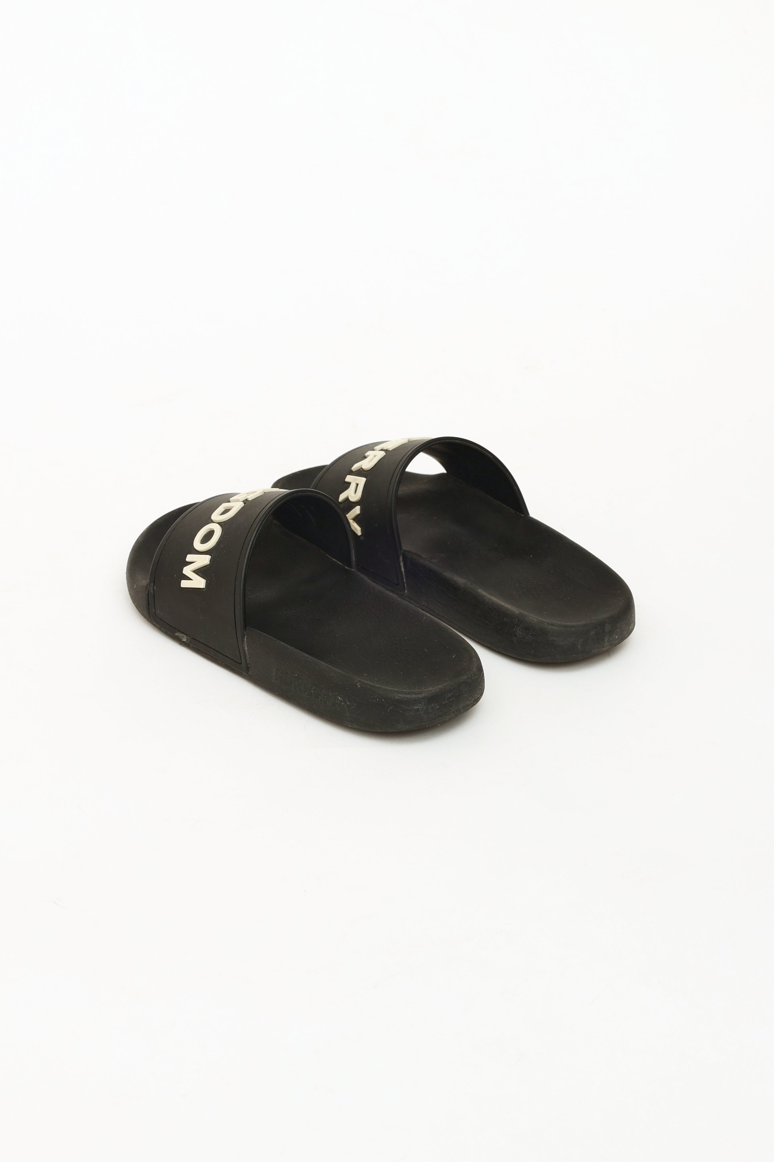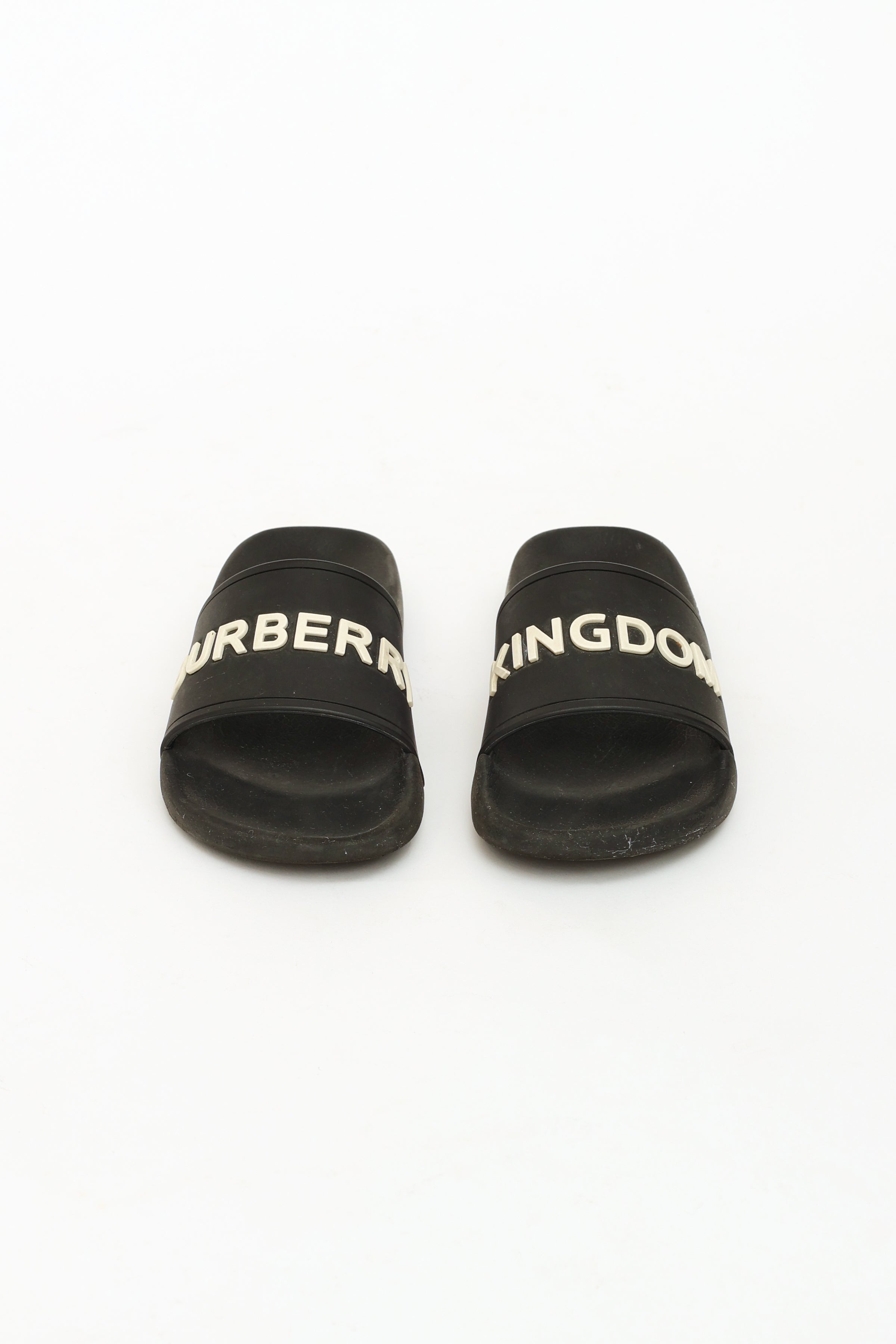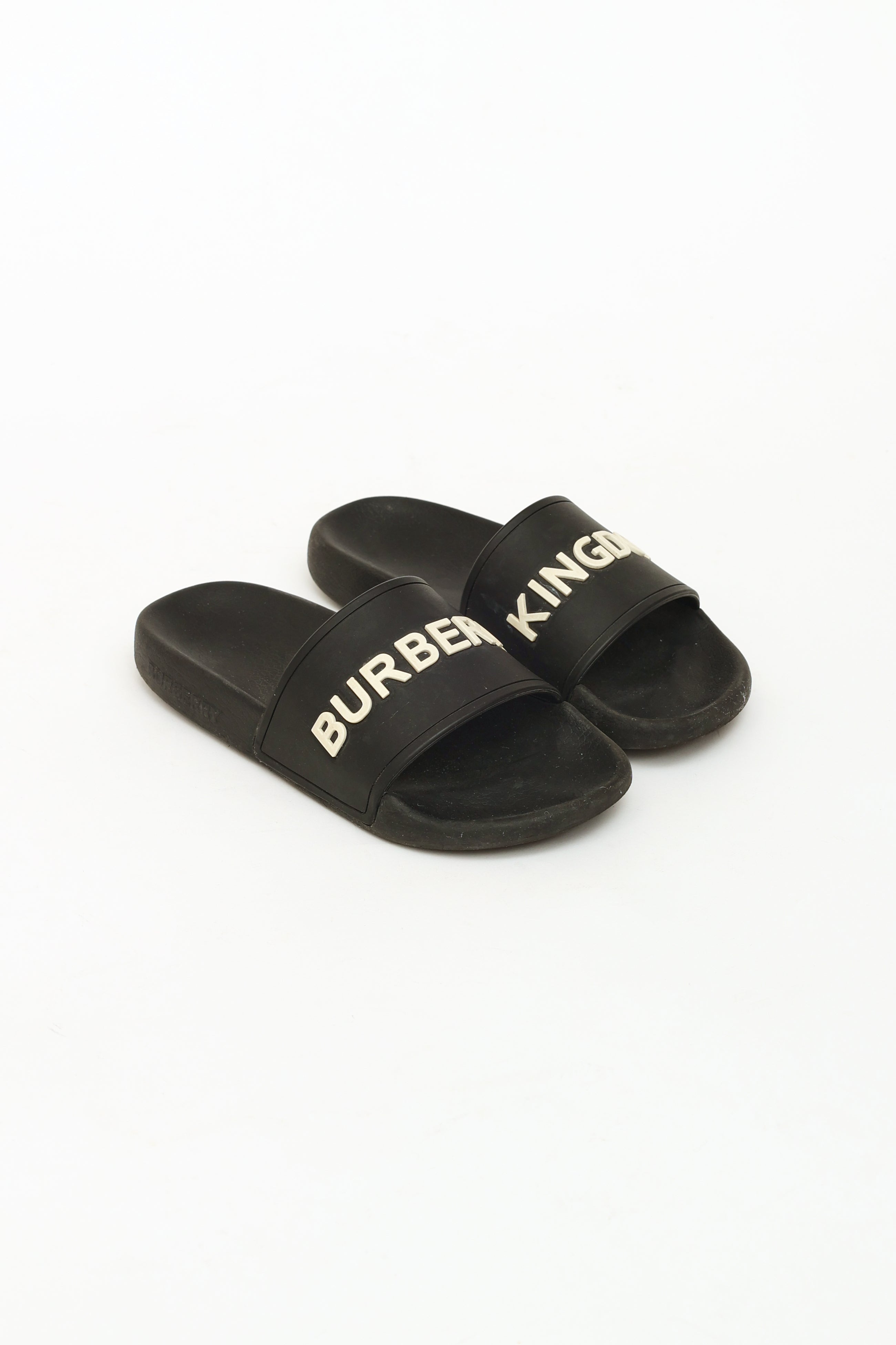 Pre-owned Burberry black slides featuring a rounded square toe, rubber strap with "Burberry Kingdom" in white across, and rubber foot bed.