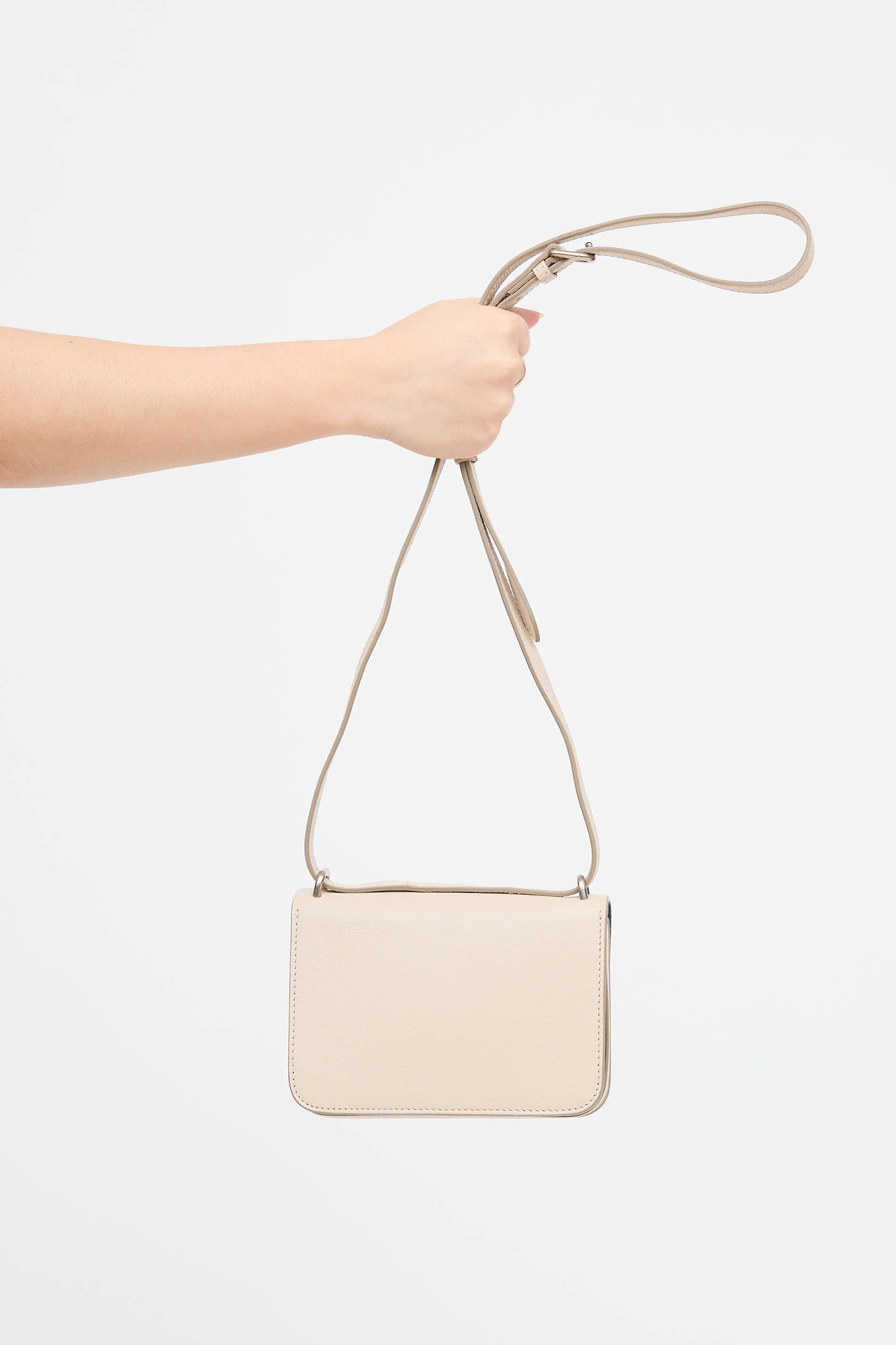 Pre-owned Burberry beige leather Mini D-Ring crossbody bag featuring silver tone hardware, removable adjustable strap, and flap d-ring lock closure. One main compartment, two slip pockets, and two card slots.
