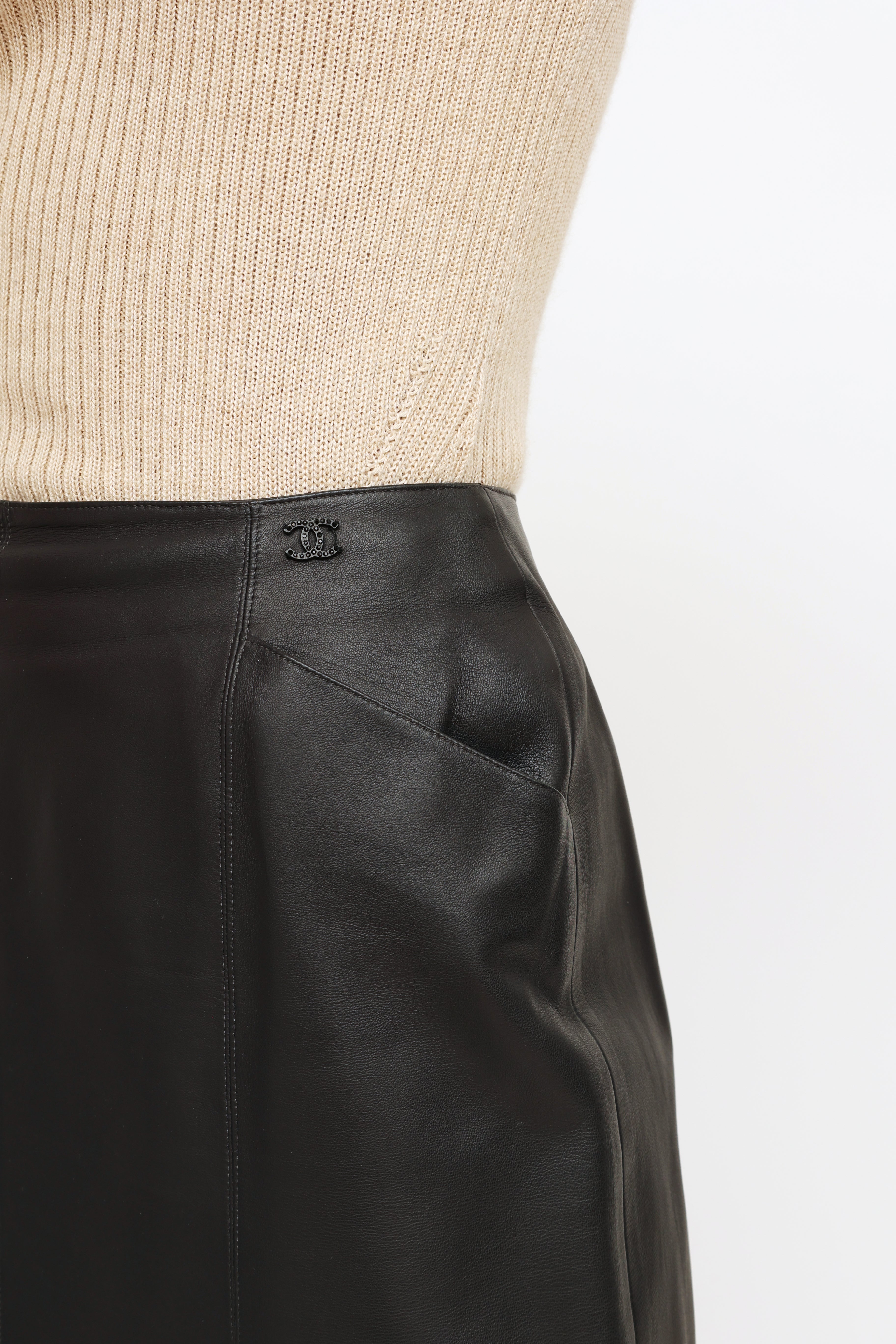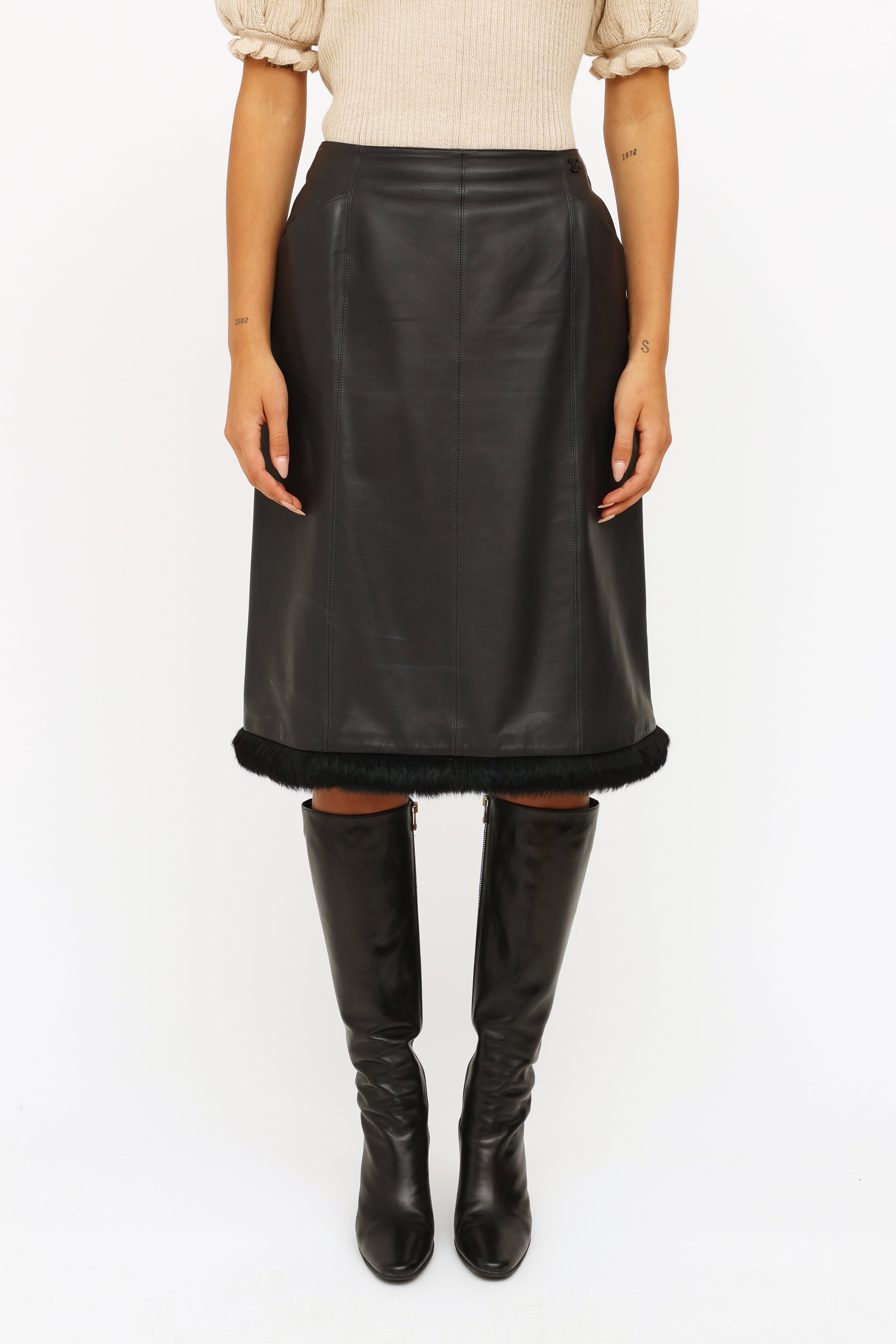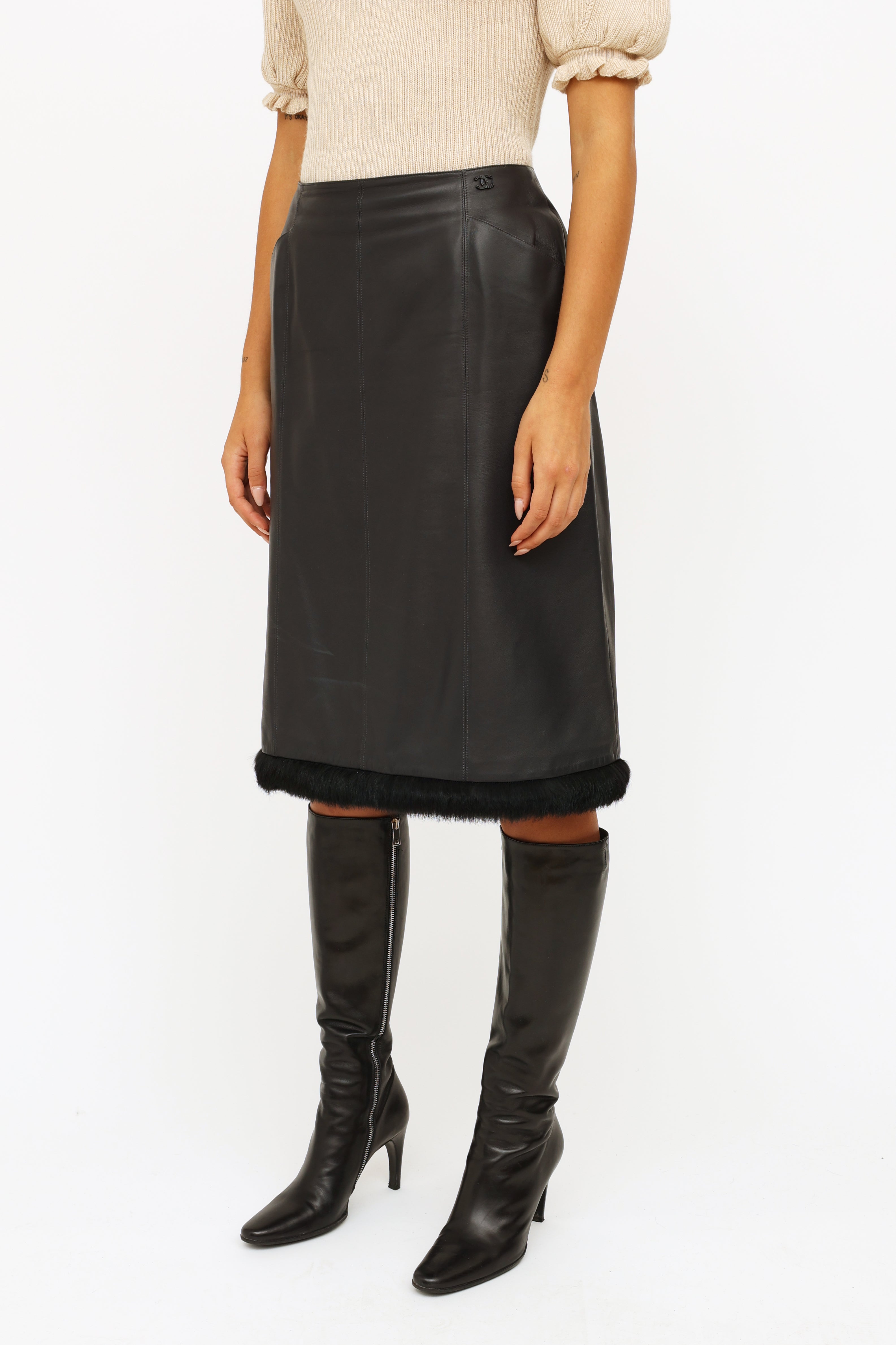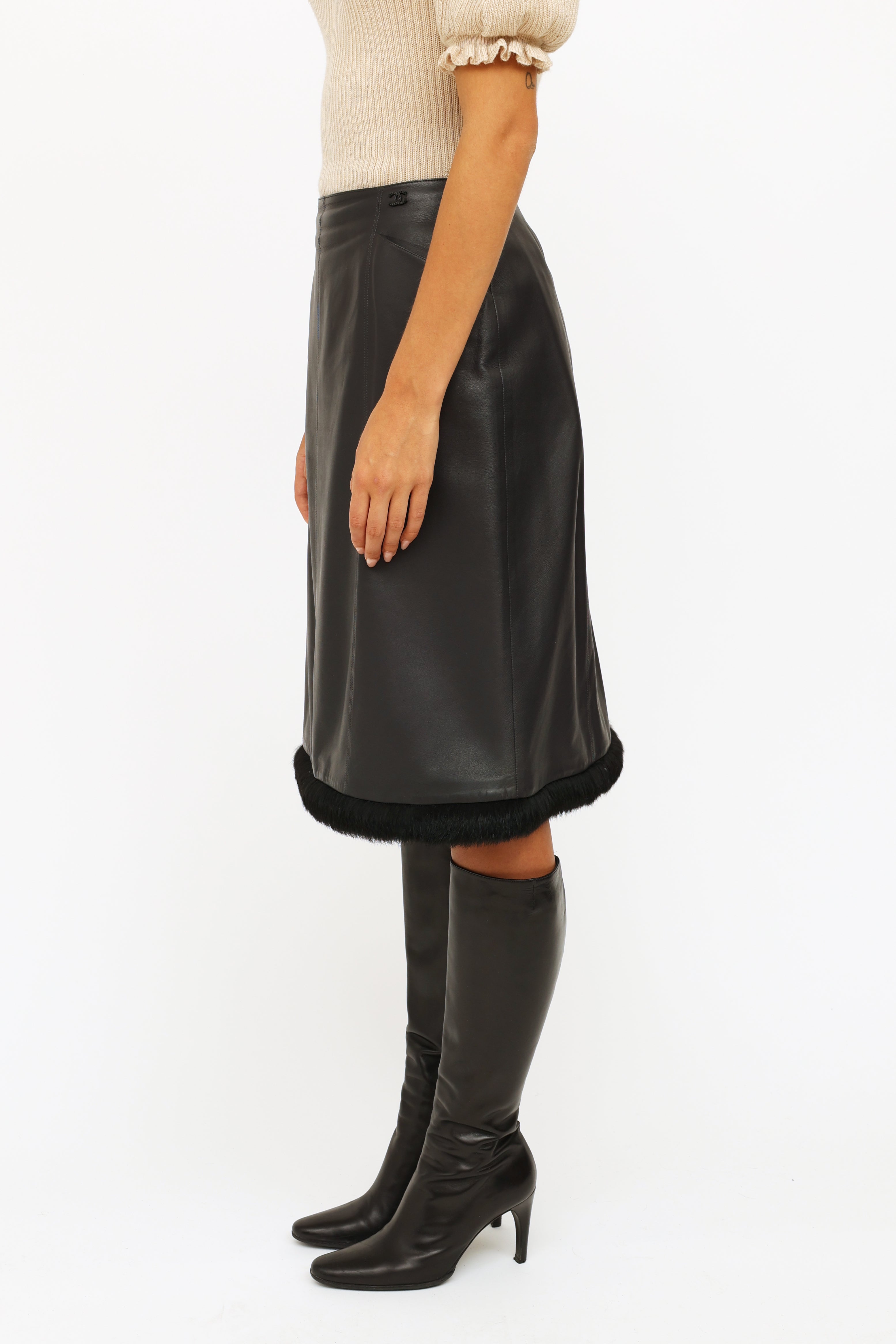 Pre-owned Chanel Fall 2002 black leather skirt featuring a flat waistline with a black crystal CC logo emblem, two flat pockets at hip, black rabbit fur trim on hemline, and a zip closure on back. Lined.