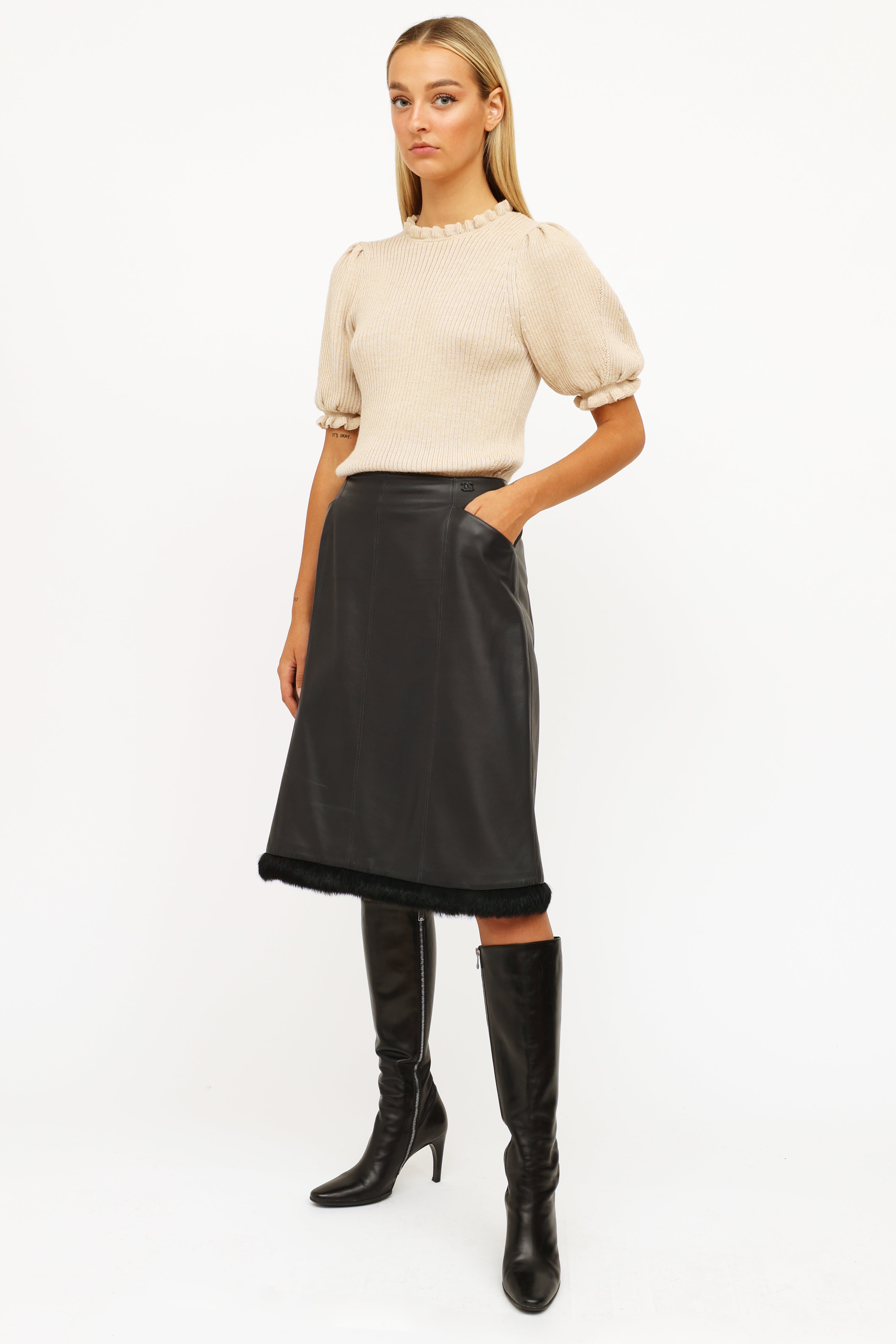 Chanel Fall 2002 Leather Fur Trim Skirt FR 40