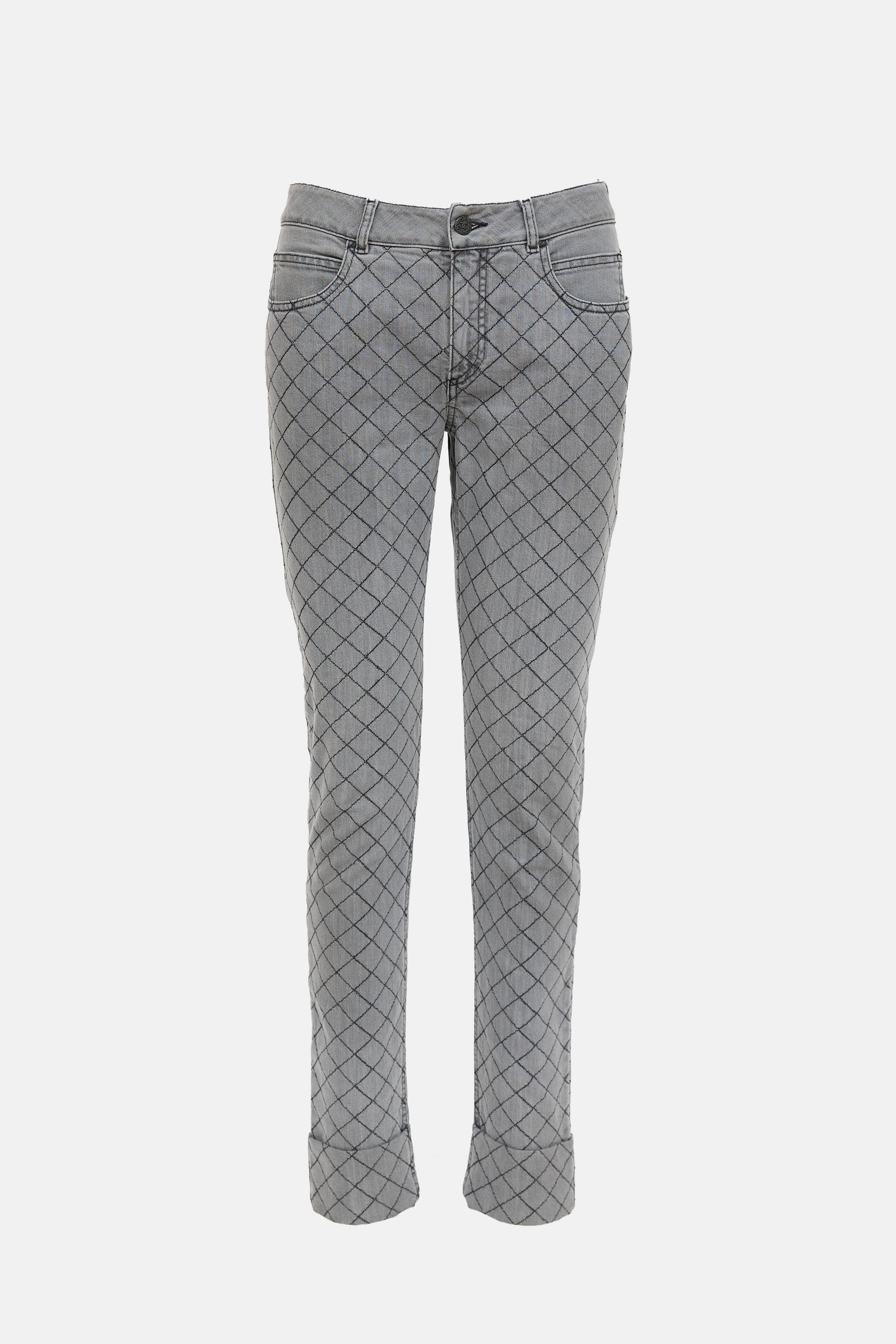 Pre-owned Chanel grey slim jeans featuring signature quilted upper, belt loops, zip fly, five pocket styling, and cuffed hem.