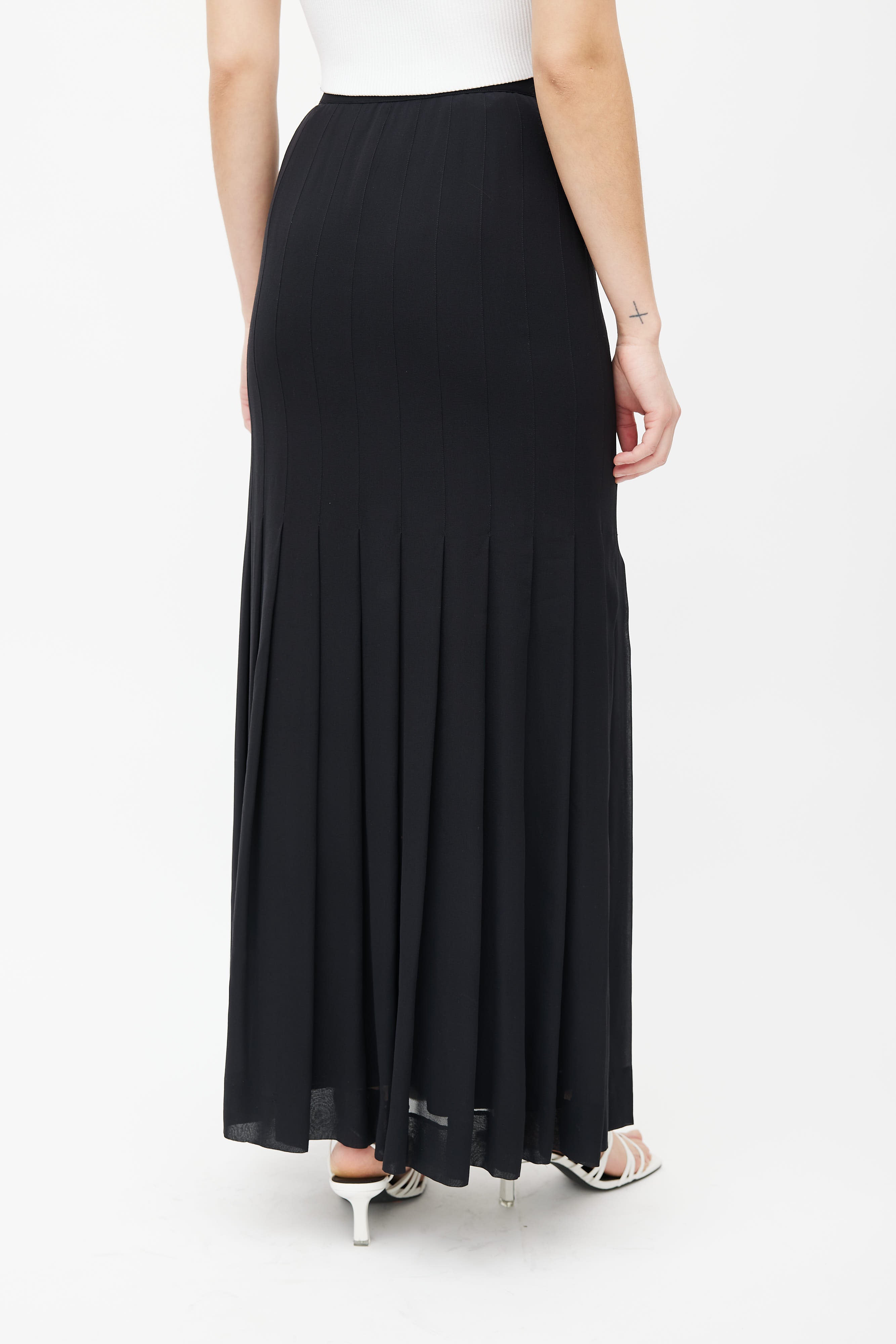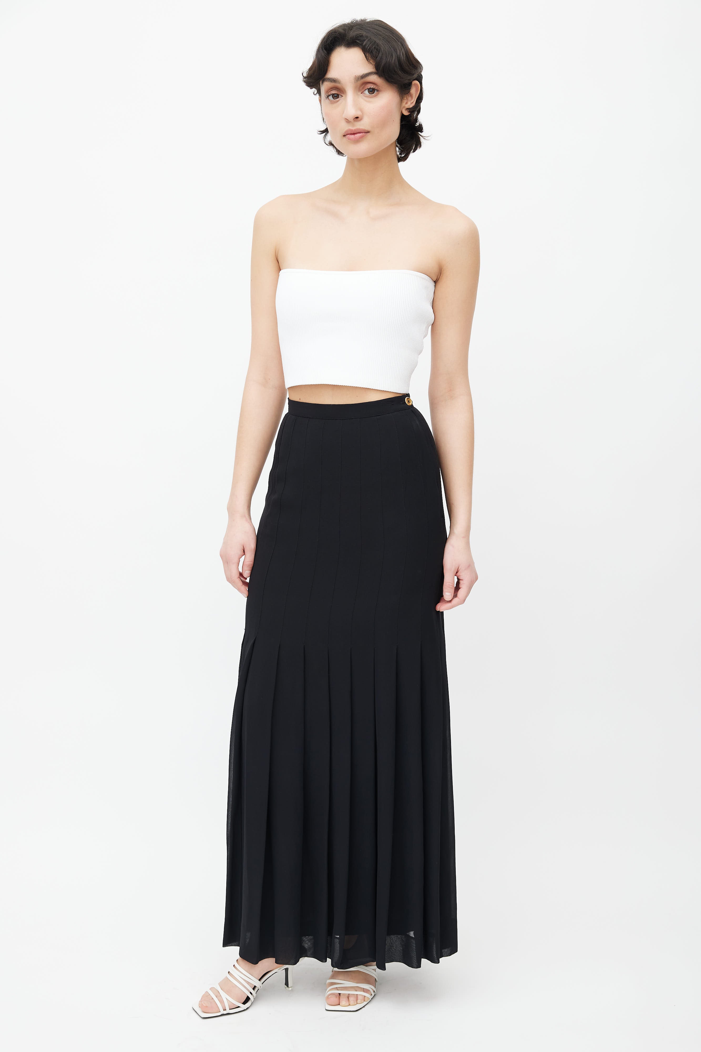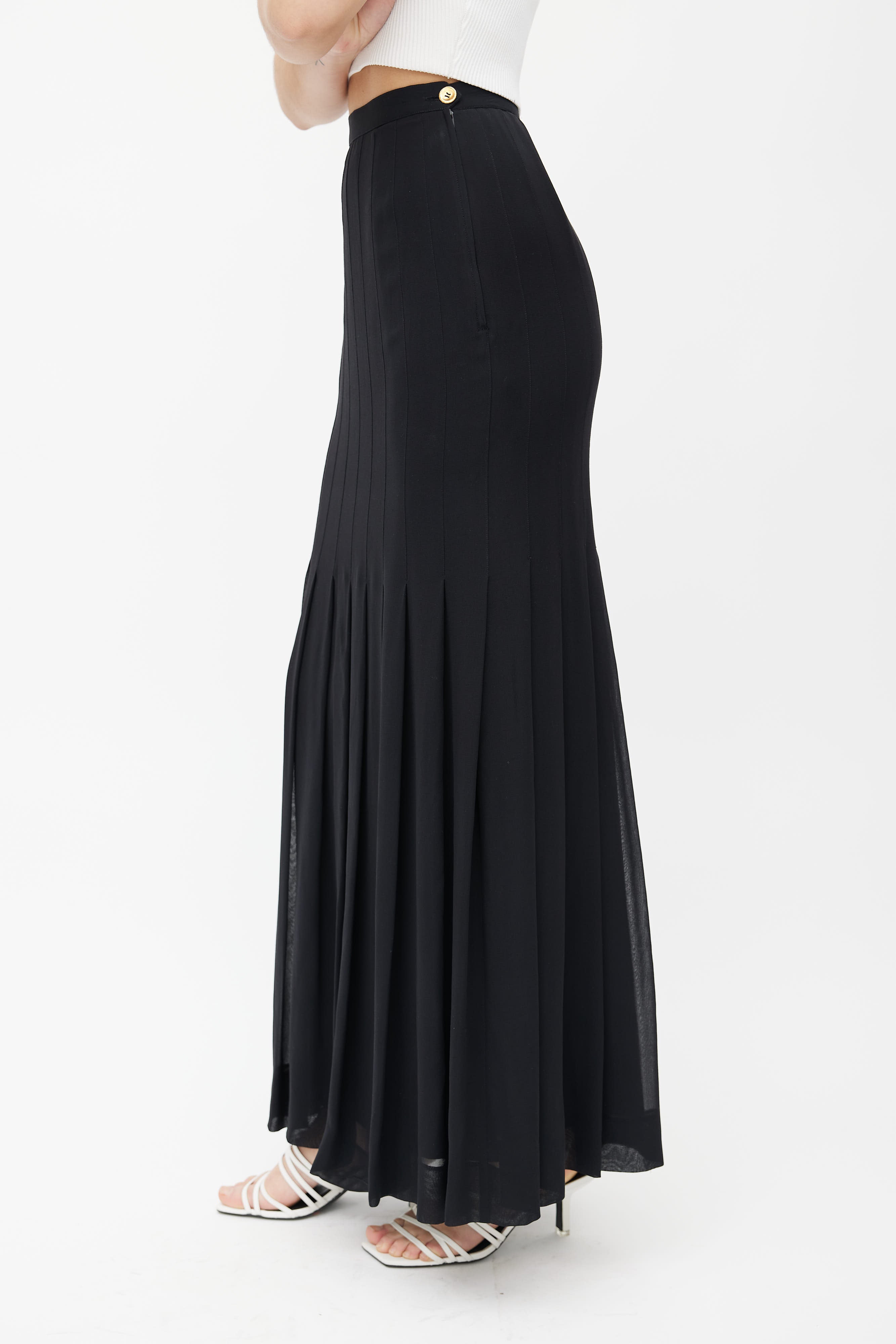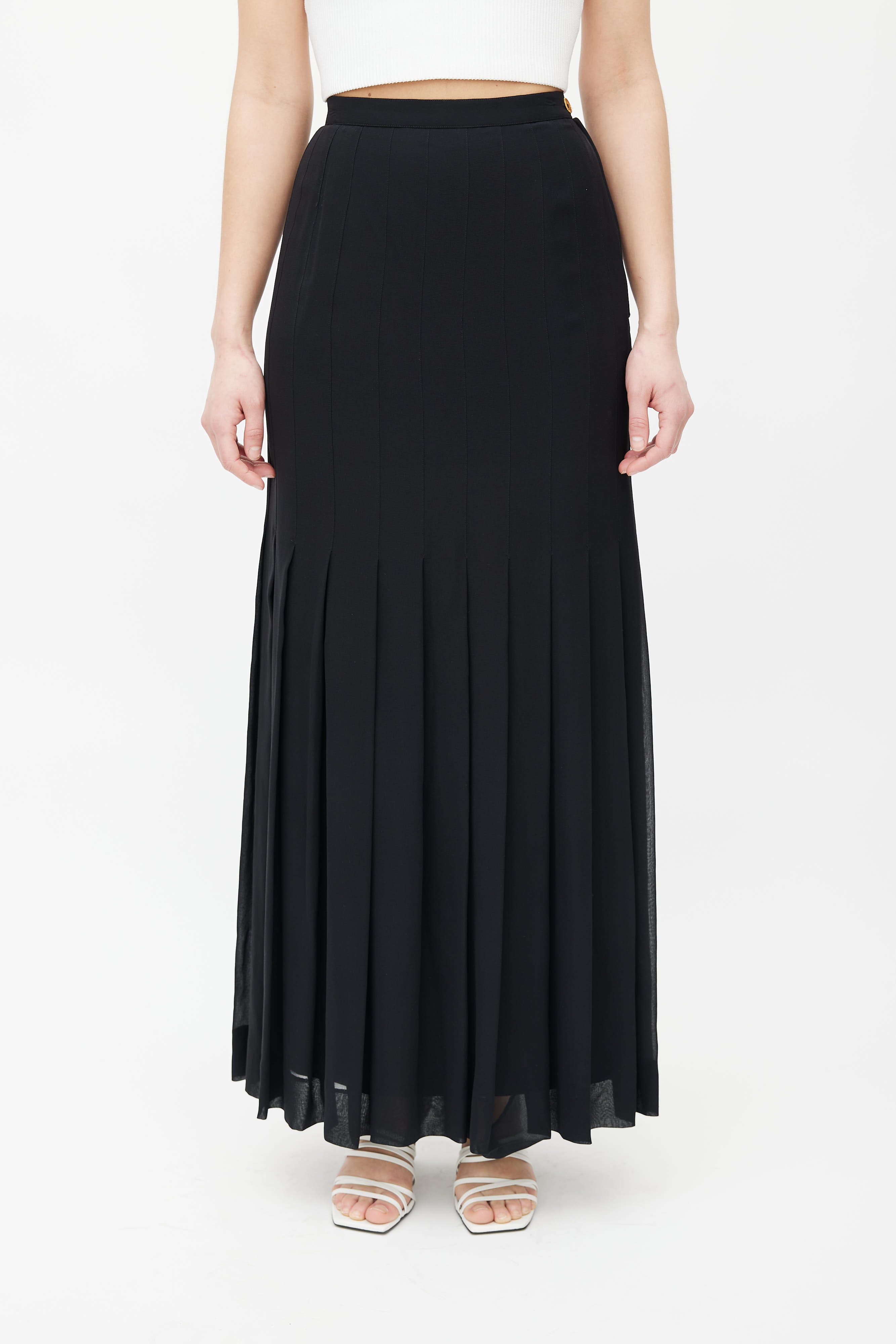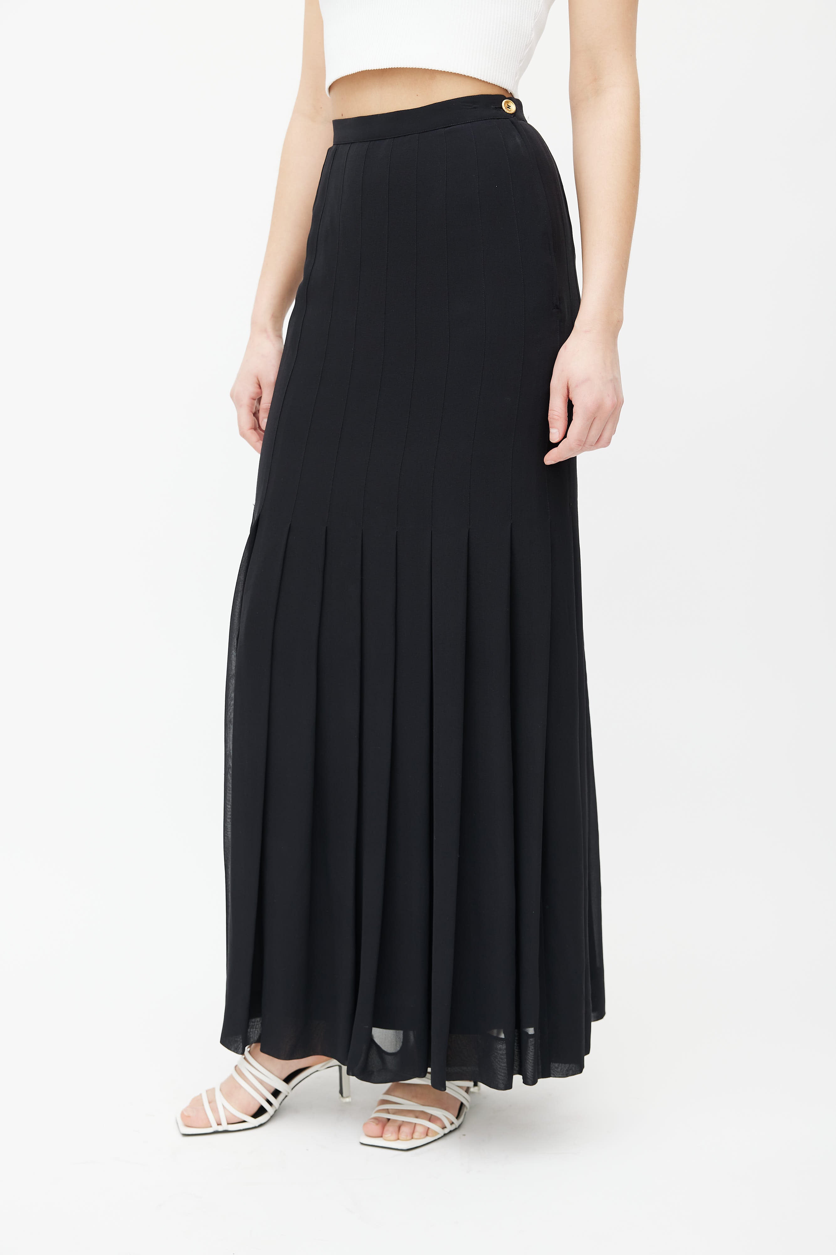 Pre-owned Chanel black vintage skirt featuring waistband with one gold-tone button and concealed zip closure, pleated details throughout and fully lined interior.