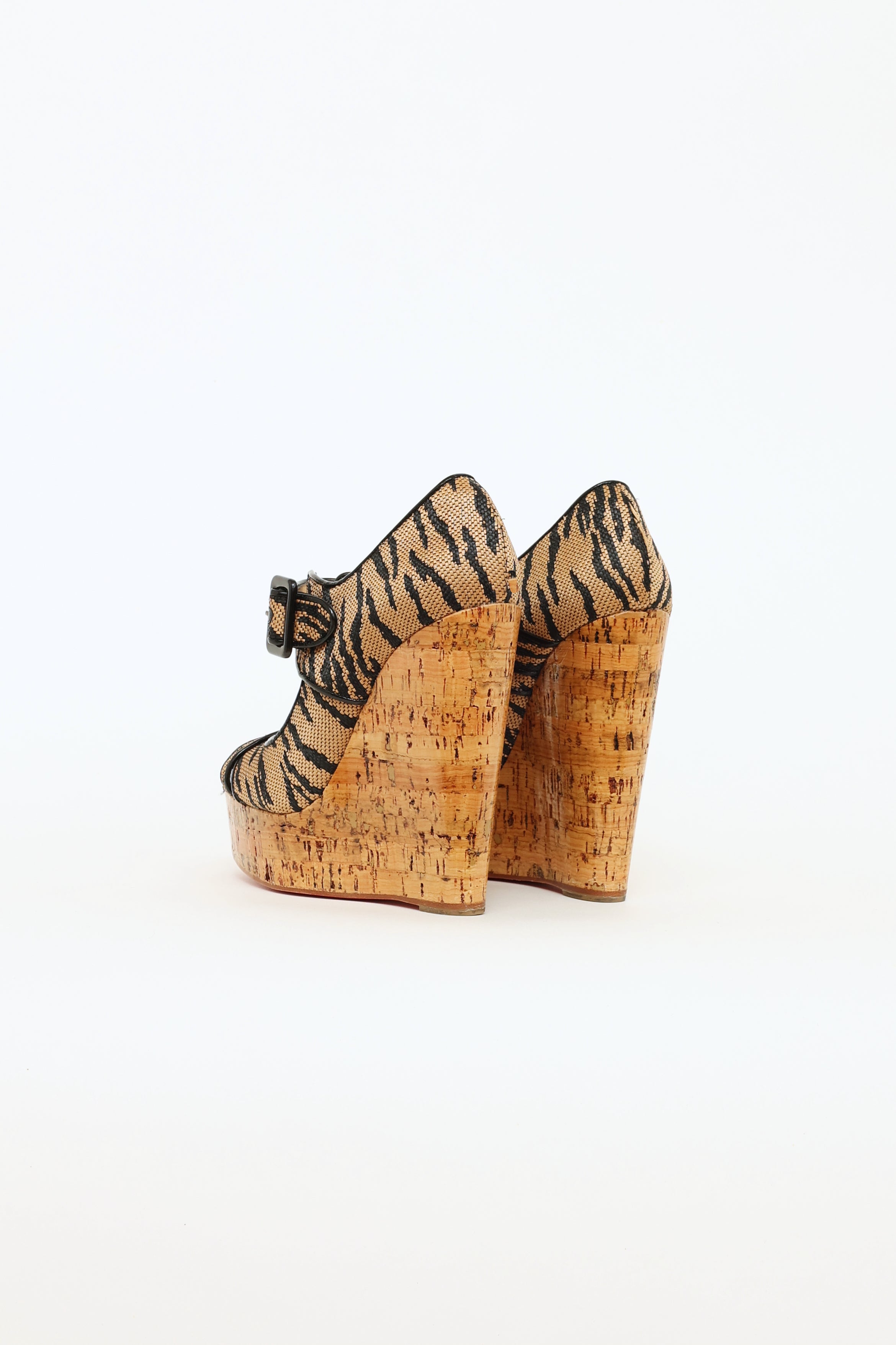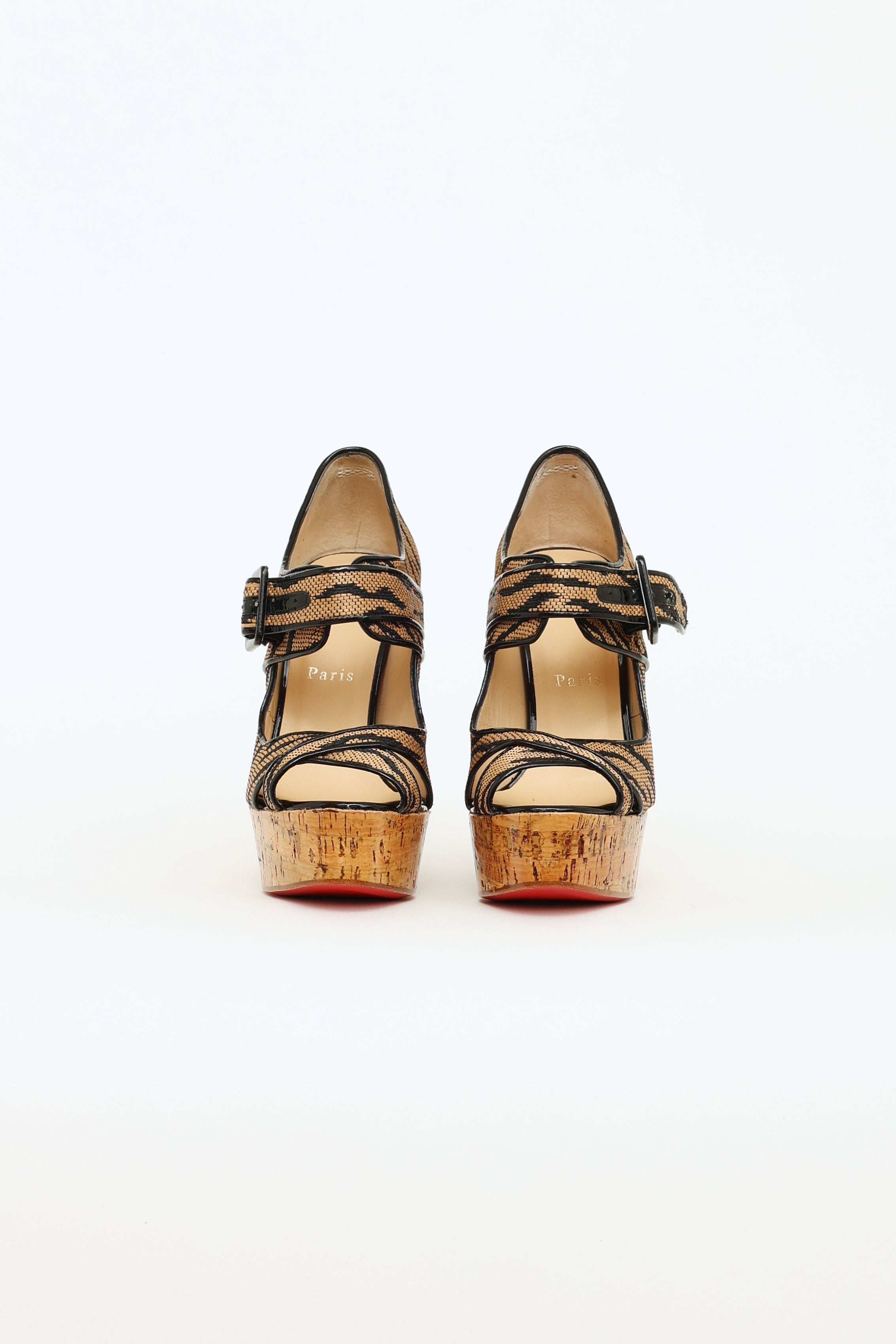 Pre-owned Christian Louboutin brown raffia cork wedge sandals featuring a peep toe, brown and black tiger print raffia exterior, dual crossover straps on toe box, strap with buckle closure over vamp, cork platform and wedge heel, leather insole and signature red lacquered outsole.