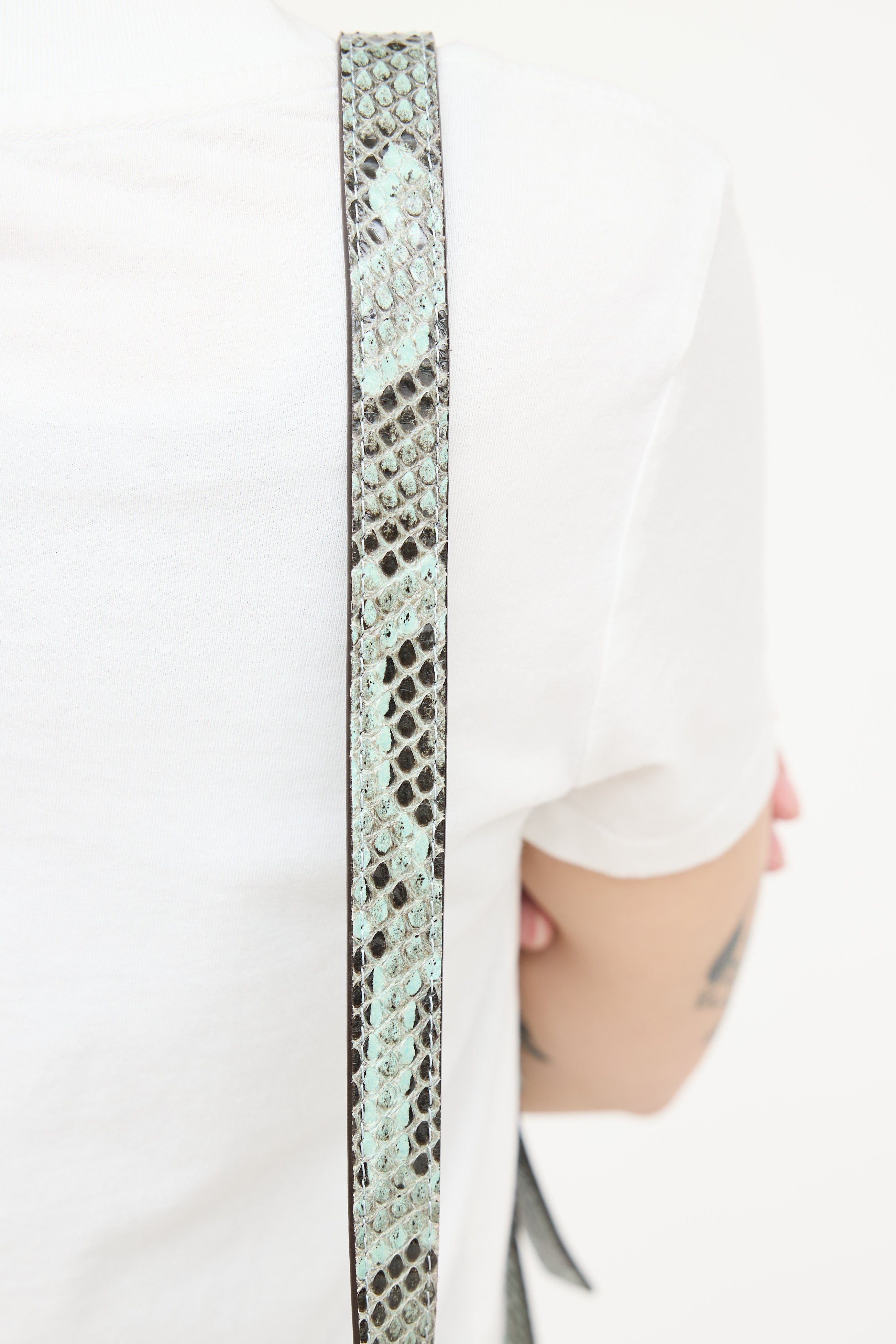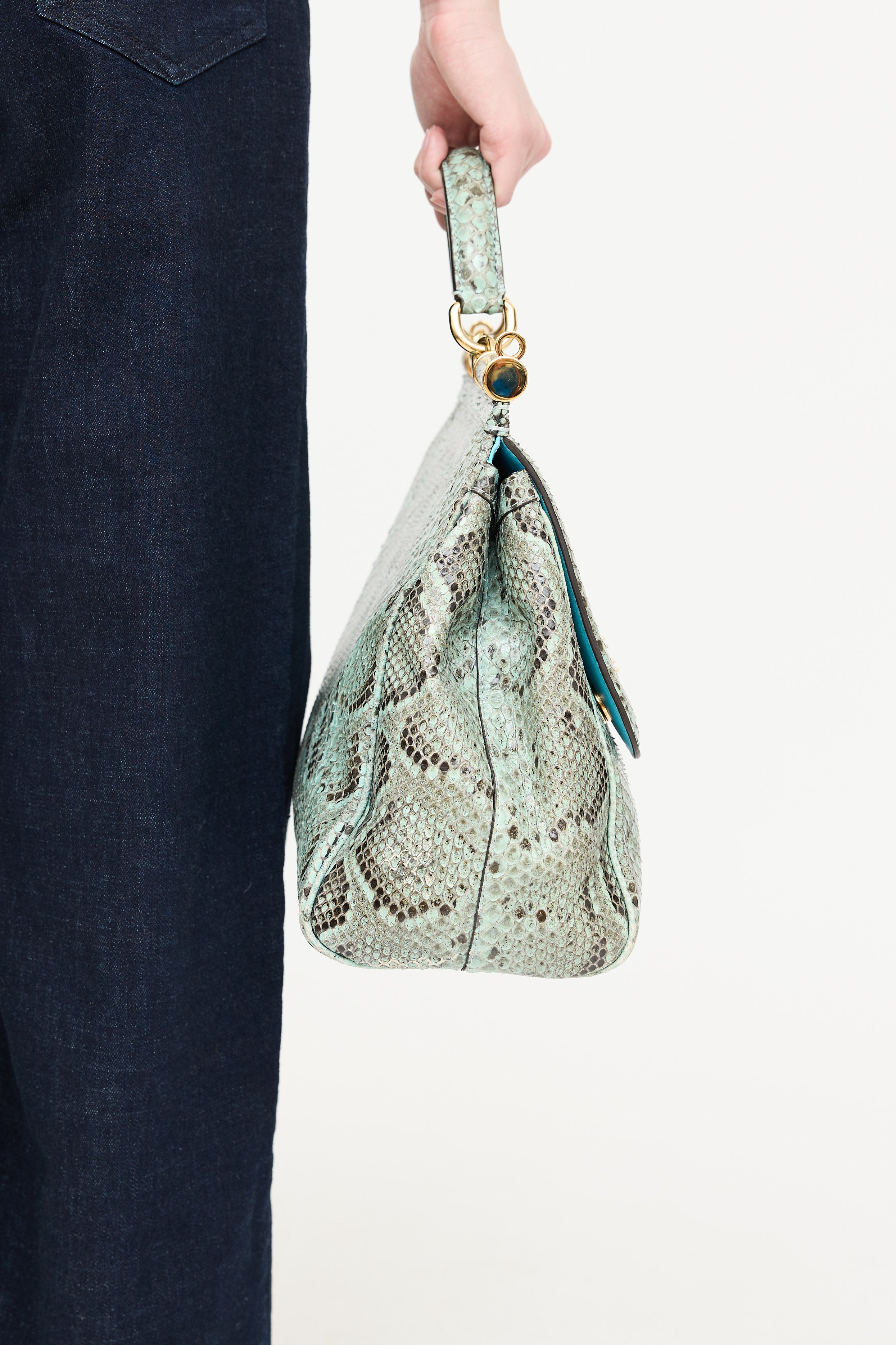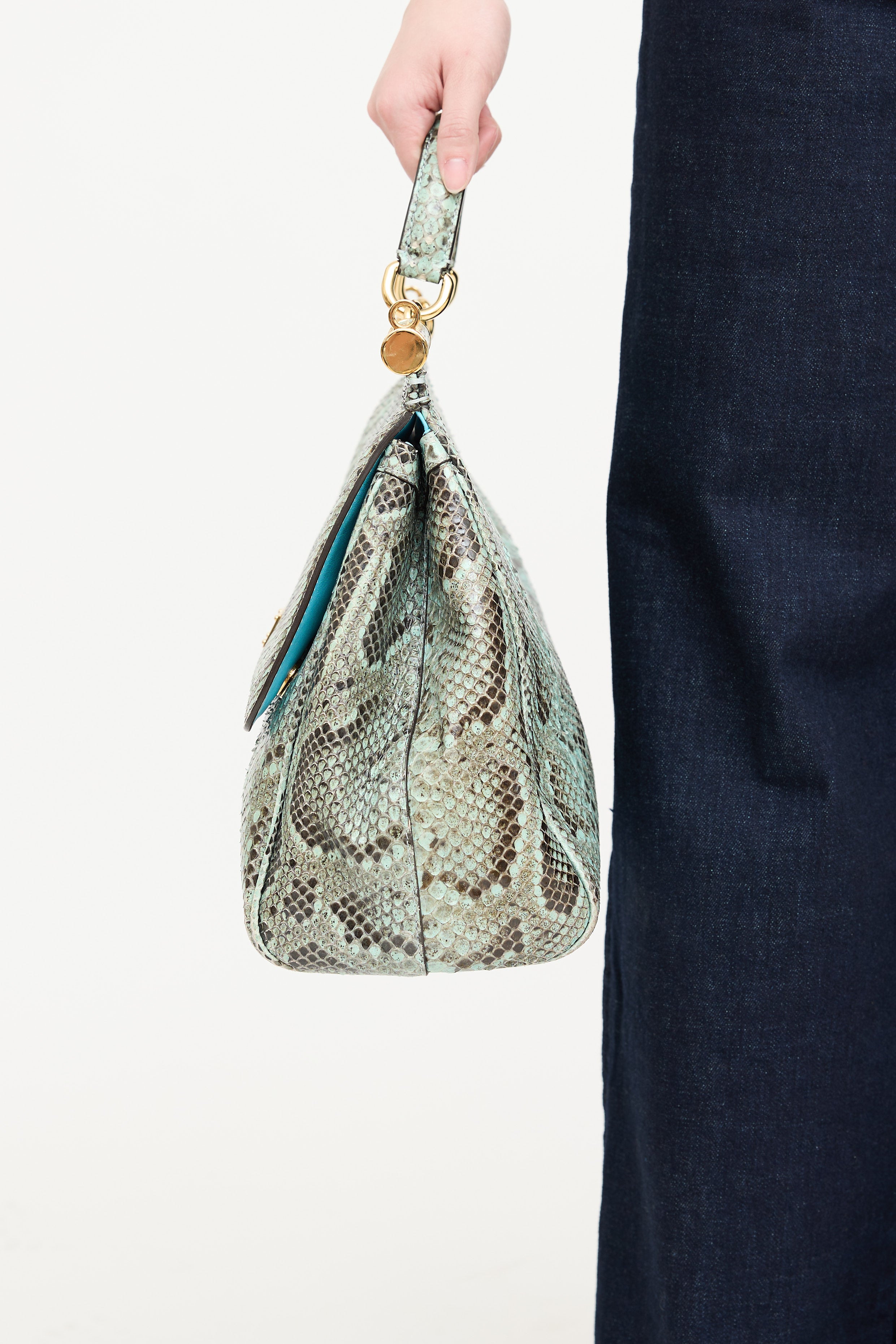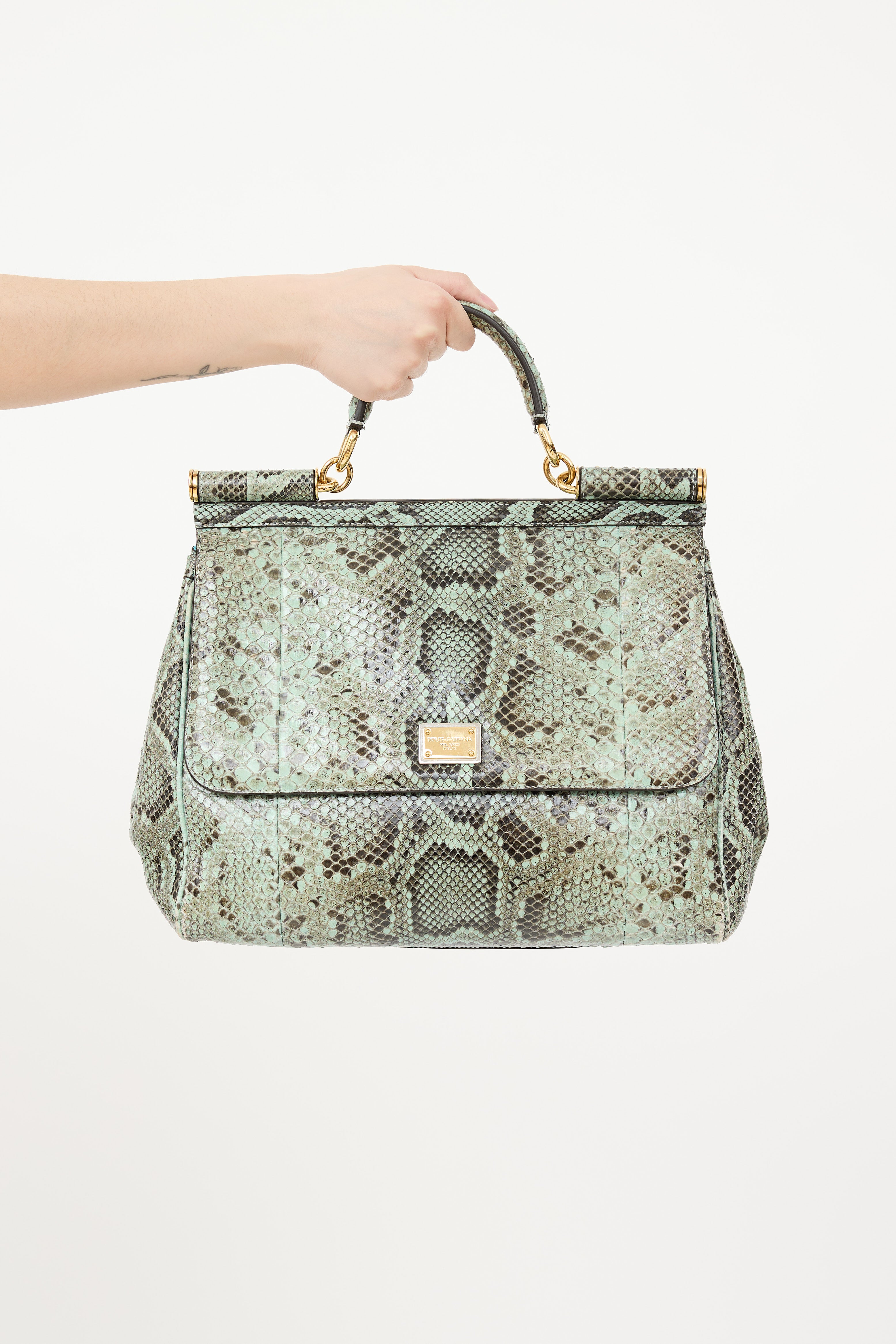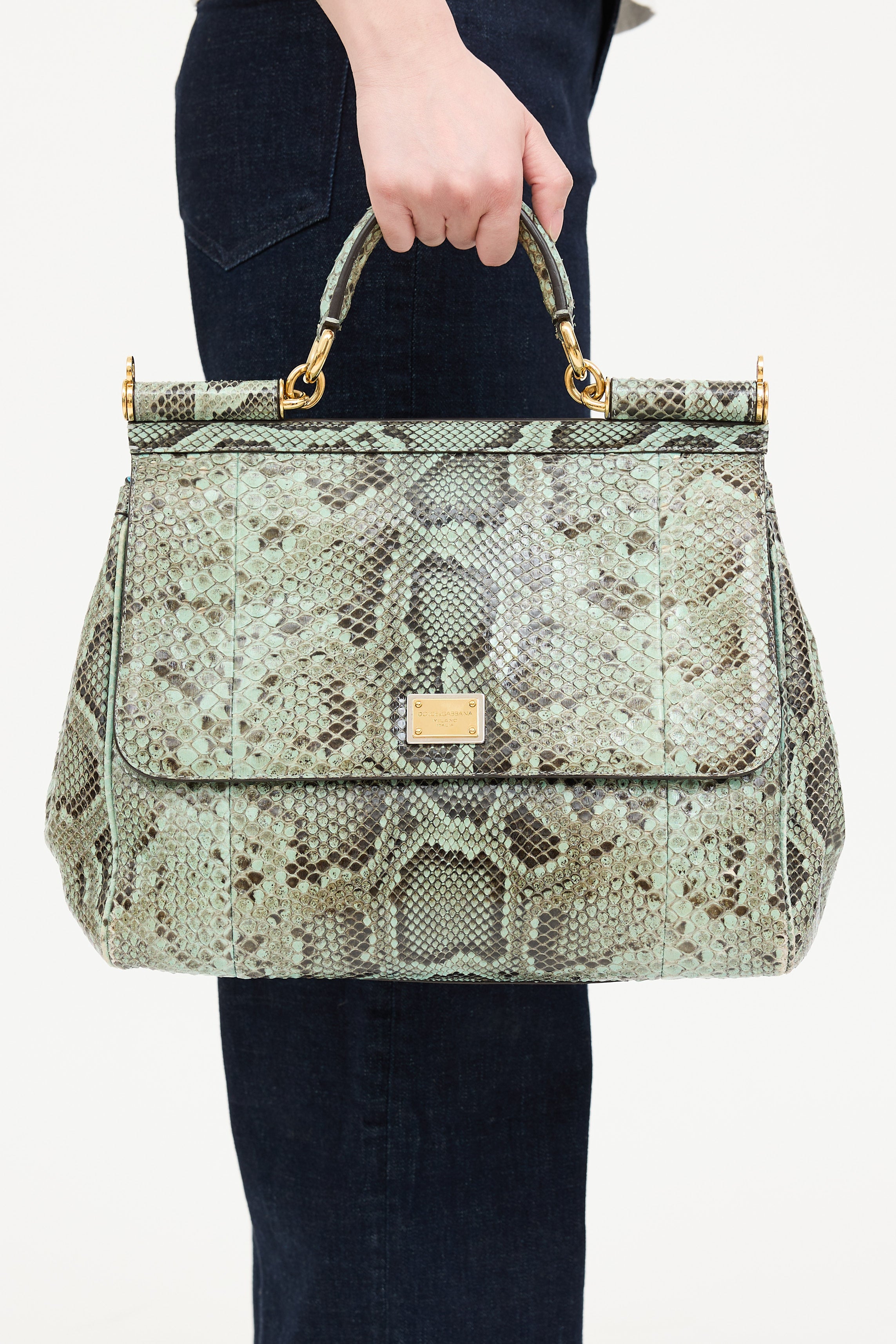 Pre-owned Dolce & Gabbana green Sicily snakeskin top handle bag featuring singular structured top handle, adjustable and detachable strap, gold tone hardware, logo plaque at front, flap top with magnetic buttons closure, structured base with metal meet, cheetah print and teal leather interior lining, one main compartment, and one zip and two slip pockets inside.