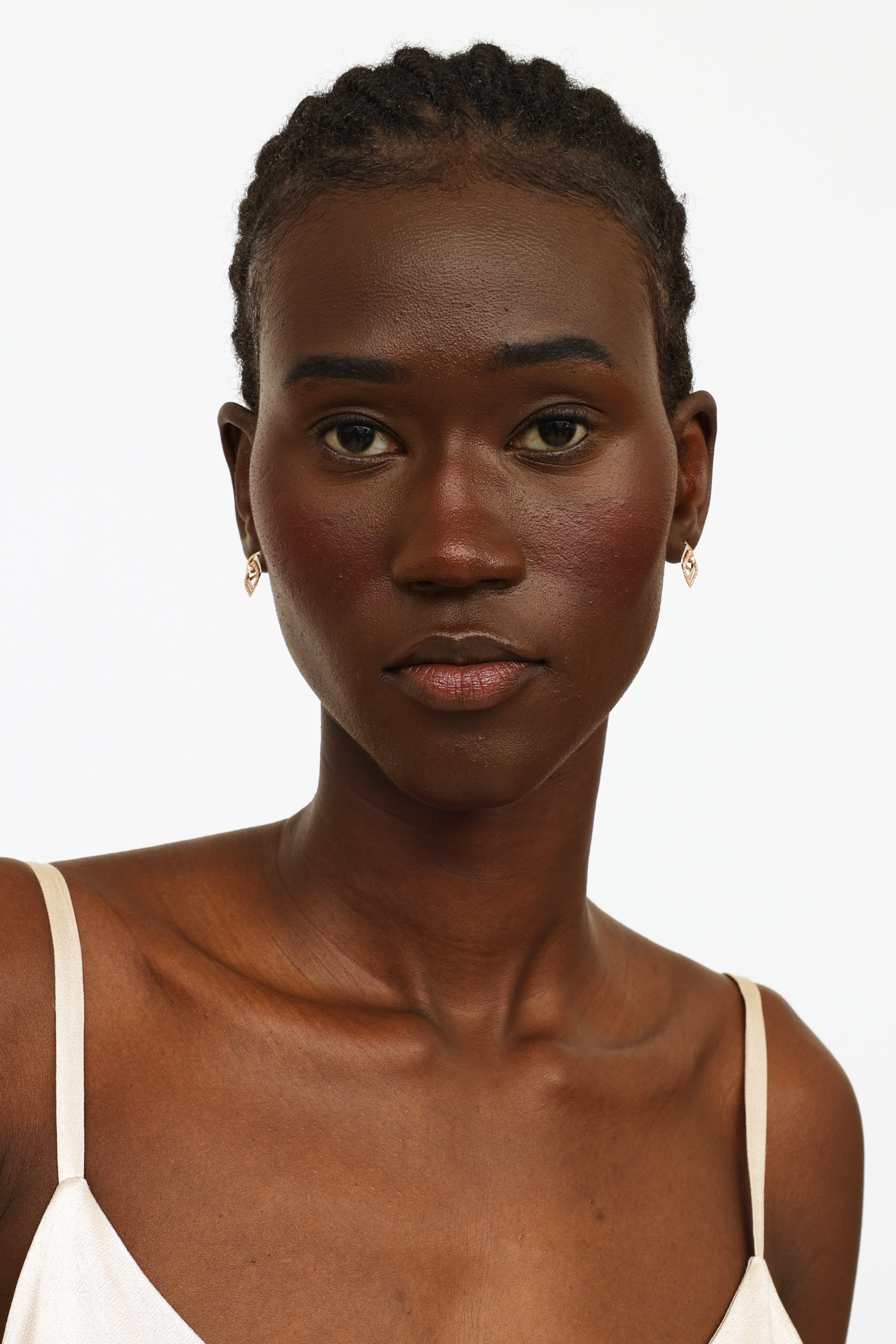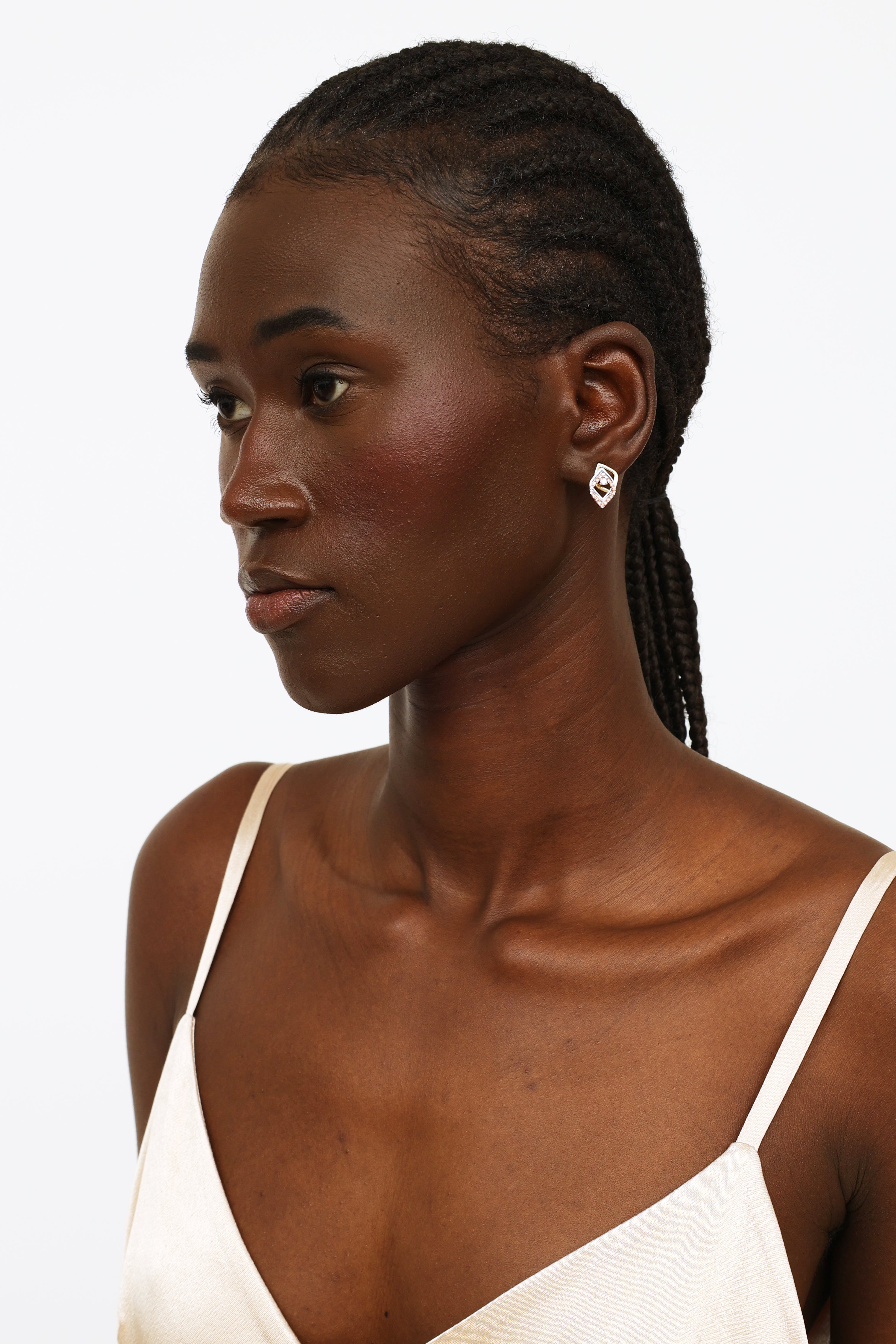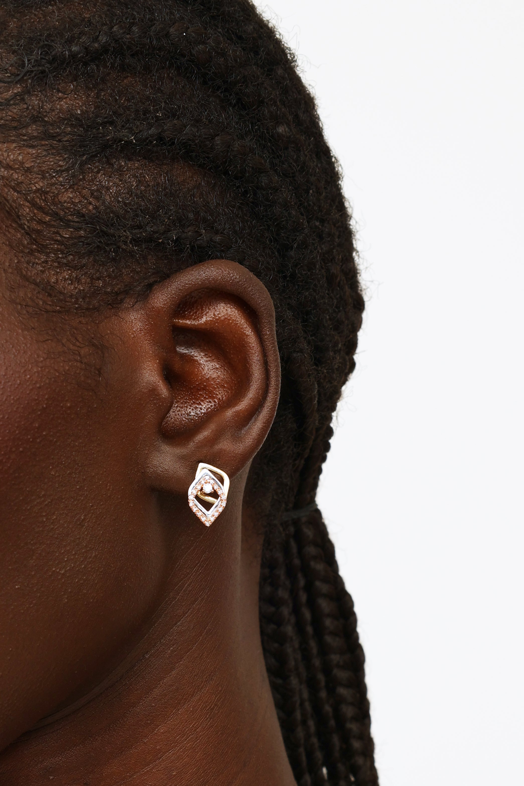 Pre-owned 10 Karat gold diamond drop earrings featuring a three layered diamond shape drop in yellow, white, and rose gold with diamonds encrusted around edges of rose gold piece, and diamond studs.