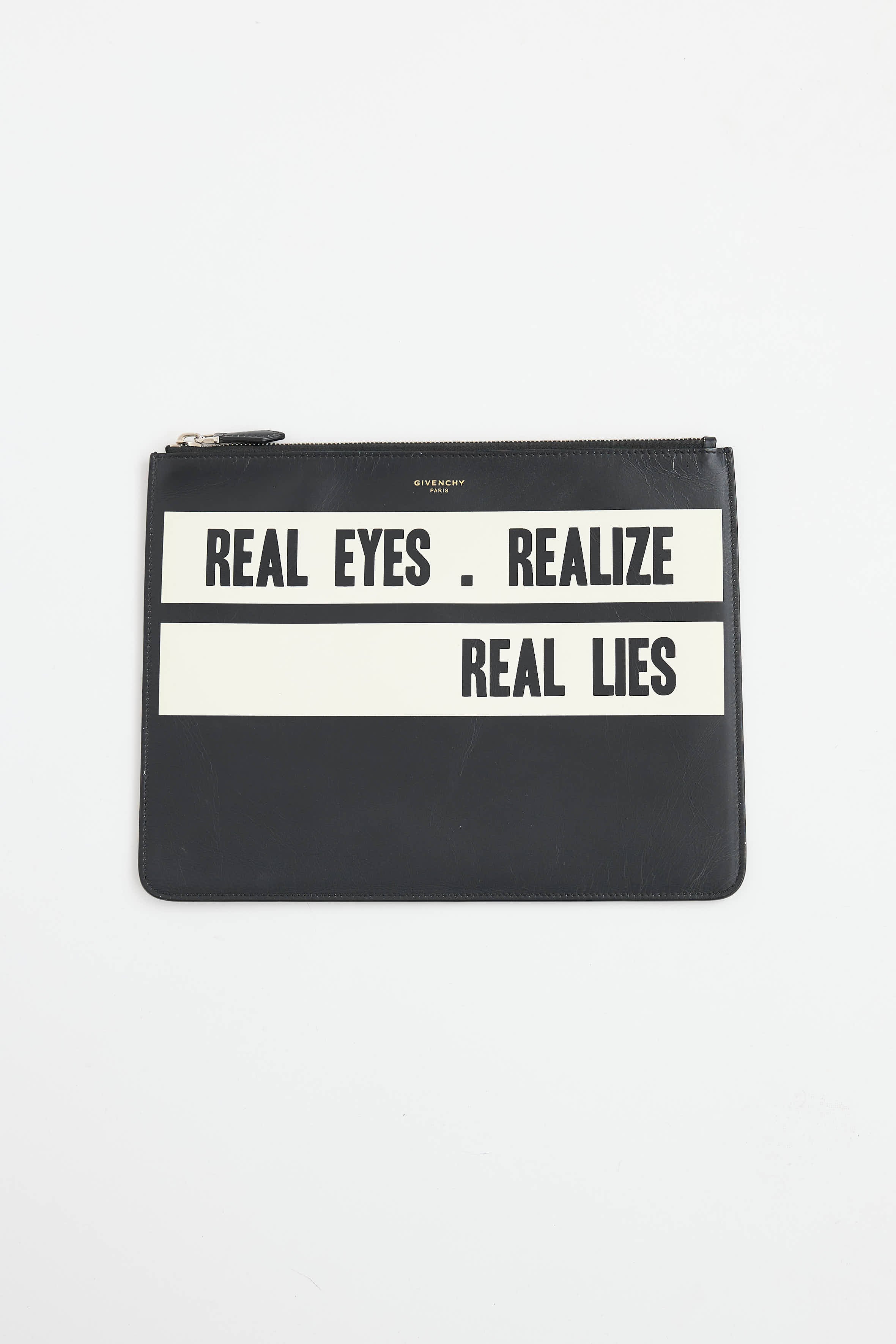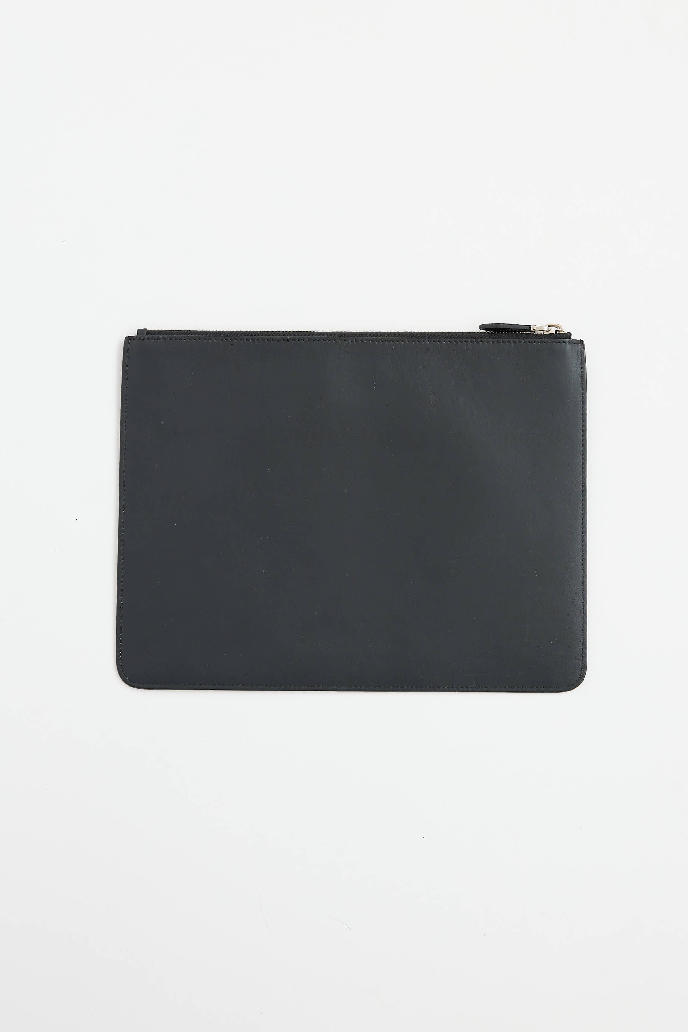 Pre-owned Givenchy black leather clutch featuring gold printed logo with text at front, silver tone zip top, and one main compartment.