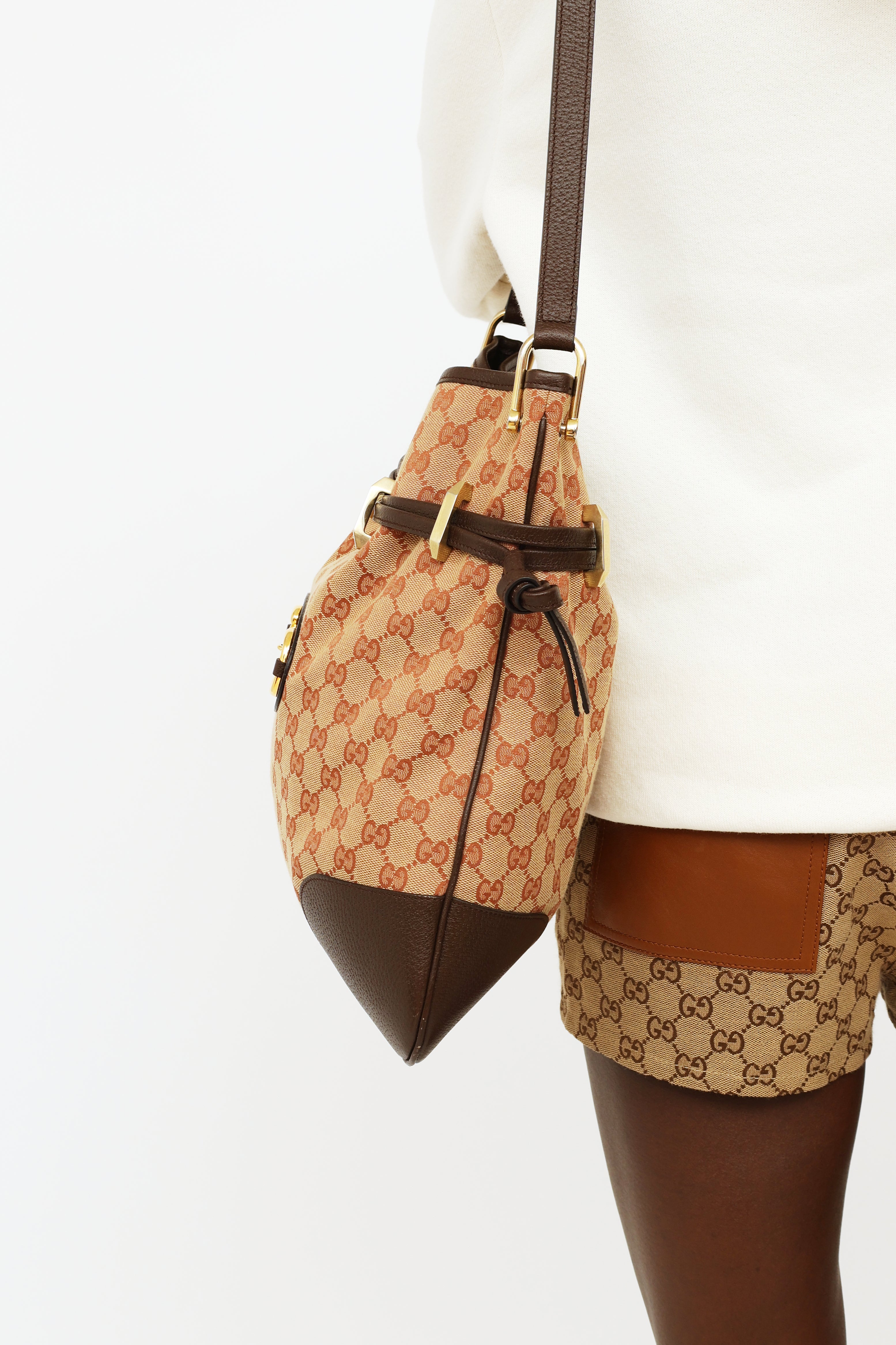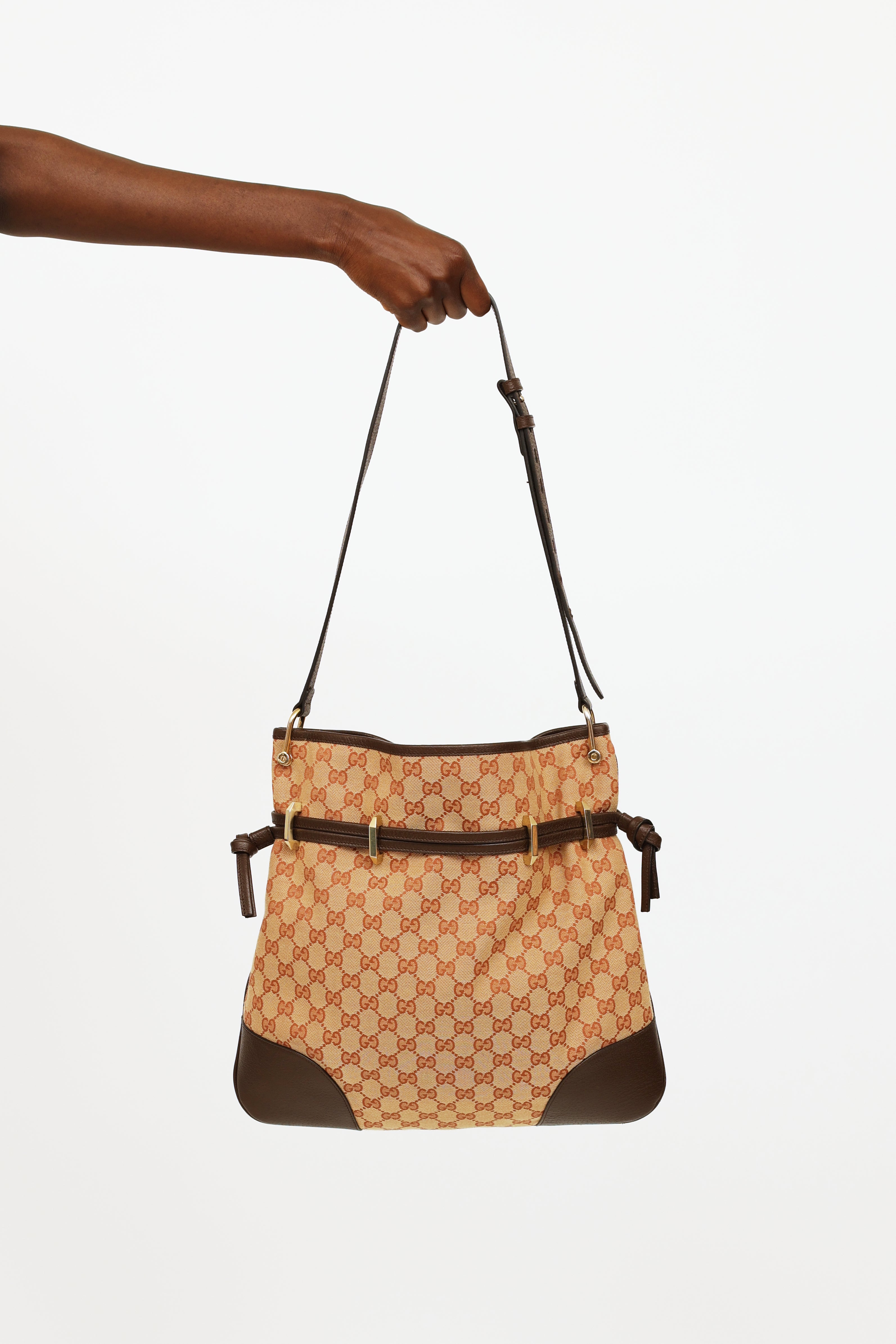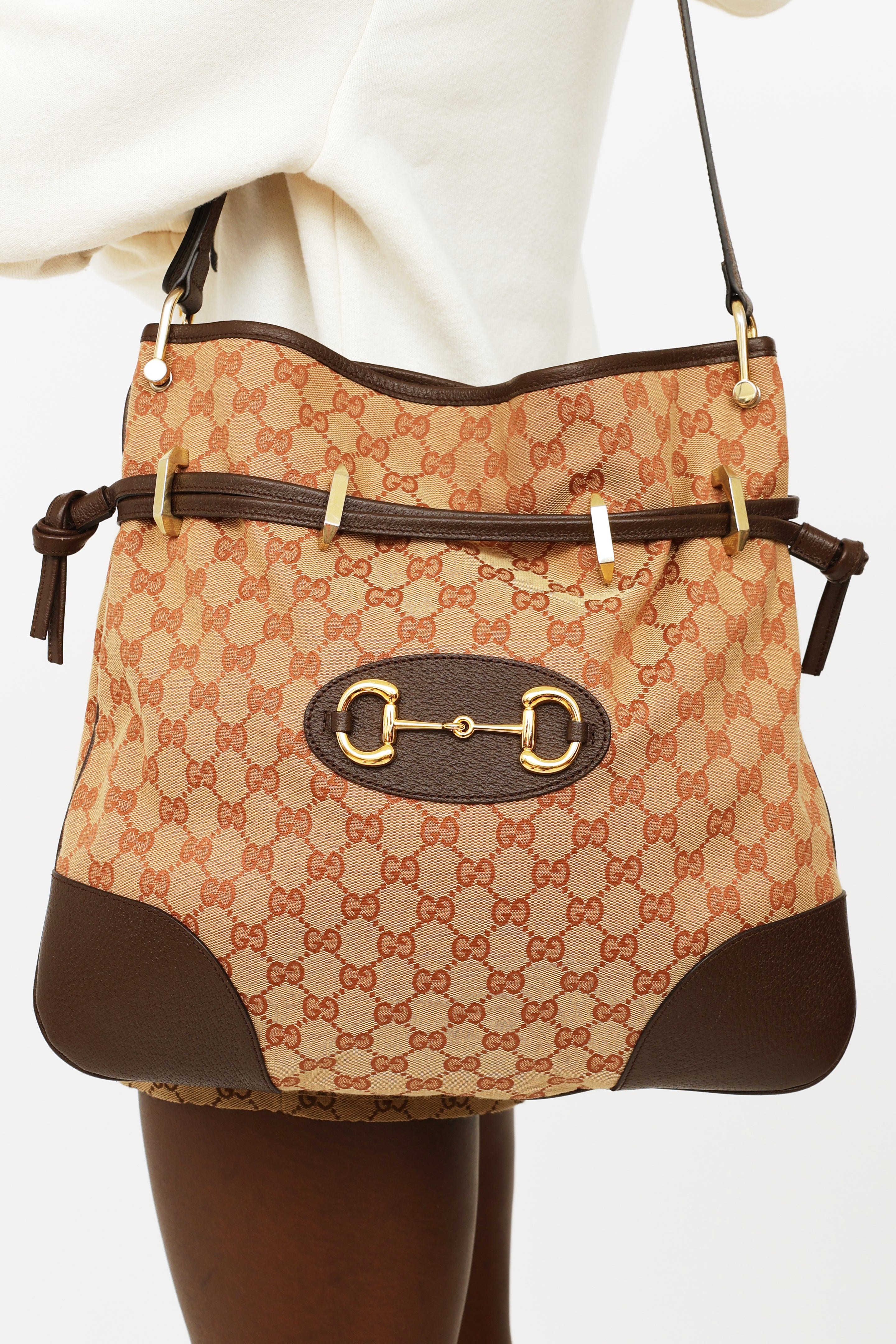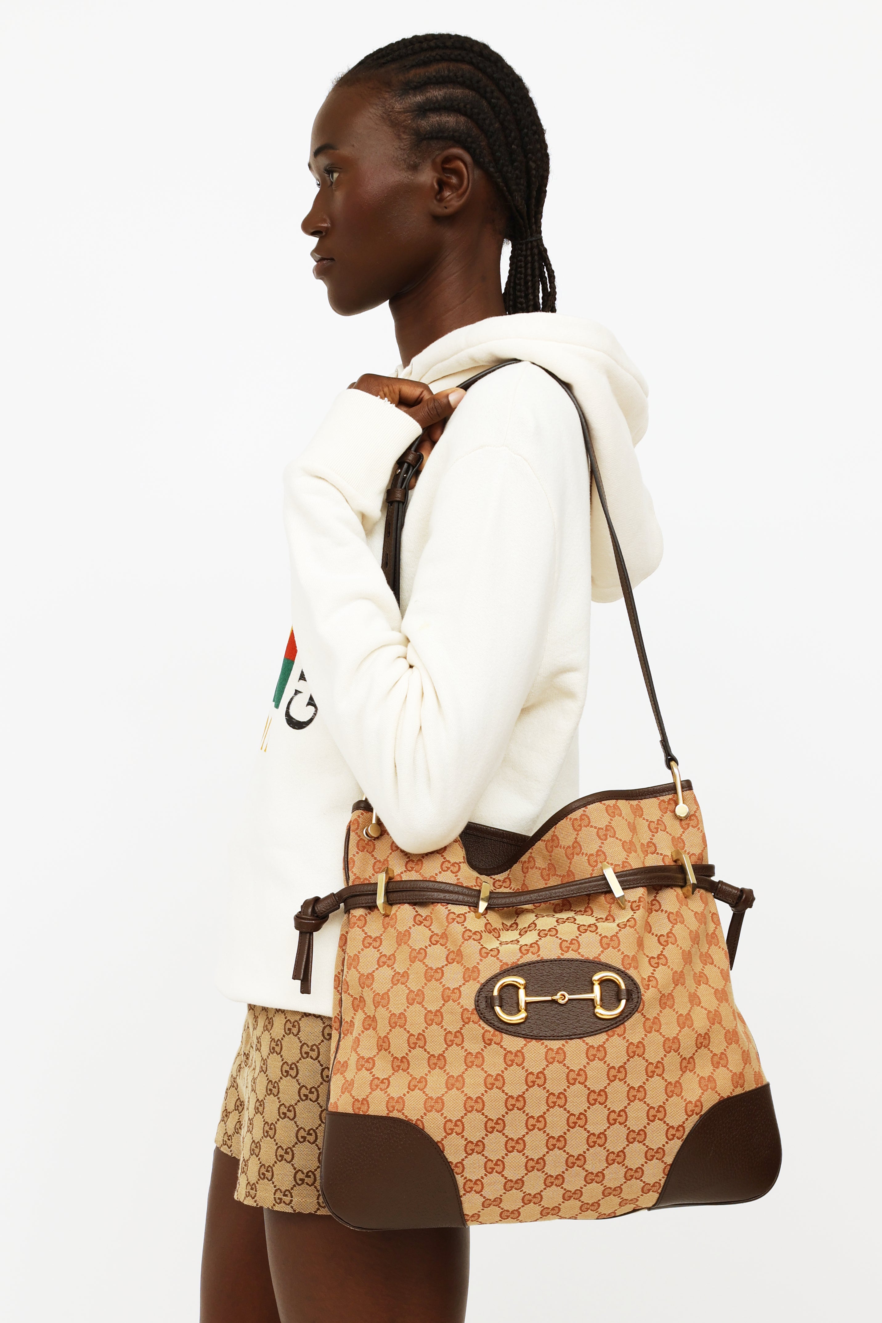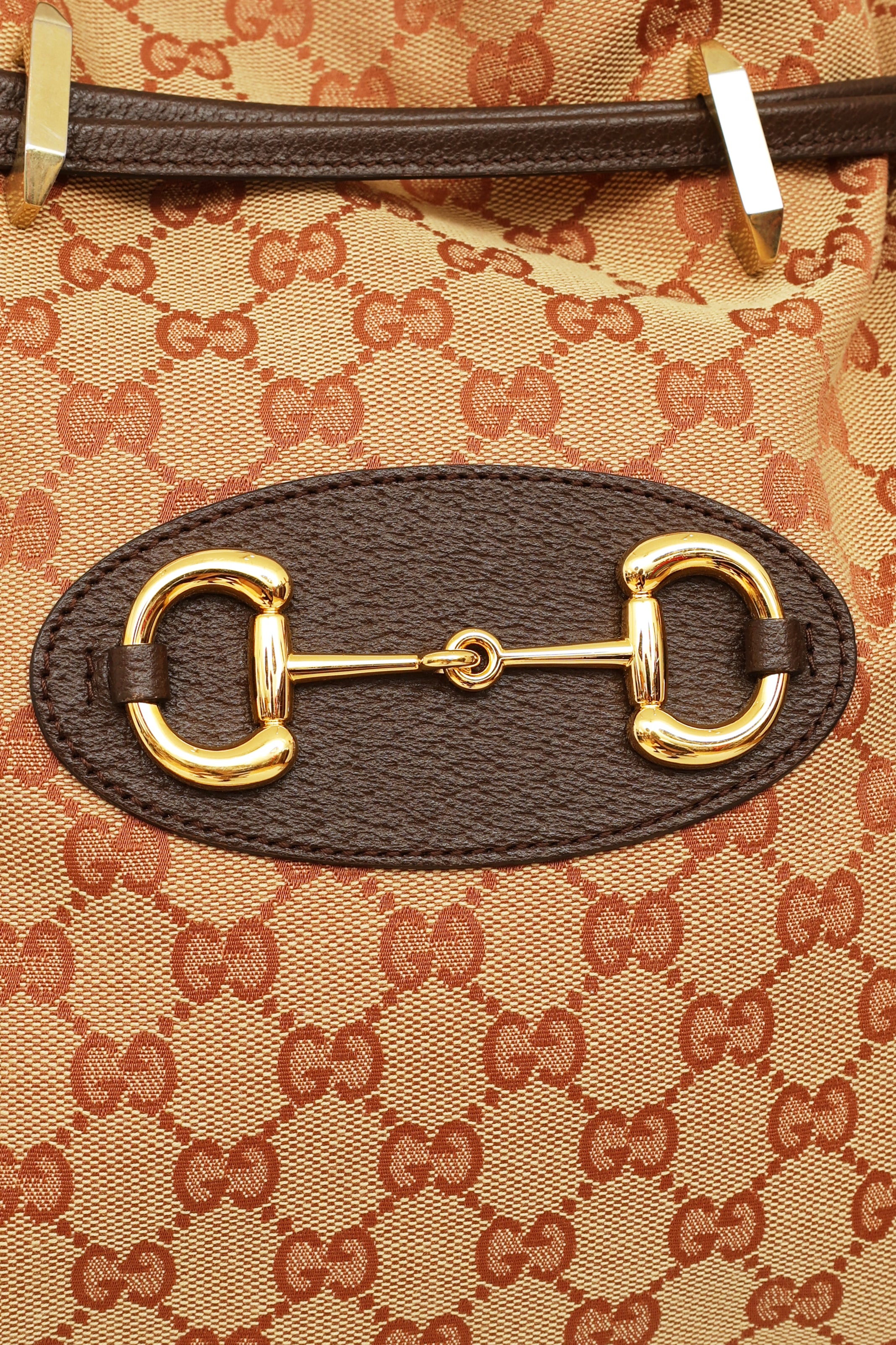 Pre-owned Gucci beige canvas 1955 messenger bag featuring monogram pattern throughout, brown leather trims, base and adjustable strap, decorative wrapped leather strap, gold-tone horsebit detail at face, singular snap button closure. Textile lined interior with one zipped pocket. From the 2020 Collection by Alessandro Michele.