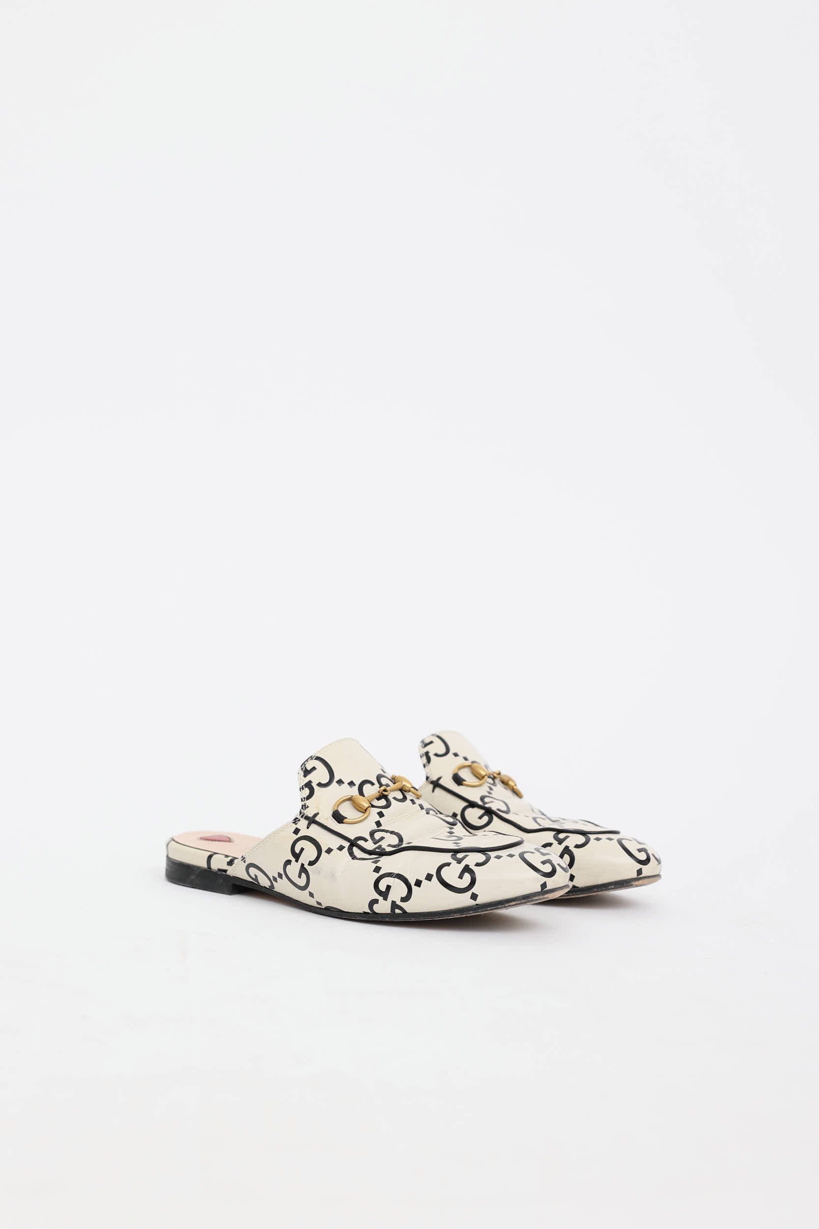 Pre-owned Gucci cream and black Princetown mules featuring a rounded toe, slip on entry, cream leather uppers with black GG print, gold toned horsebit at vamp, and a short stacked heel.
