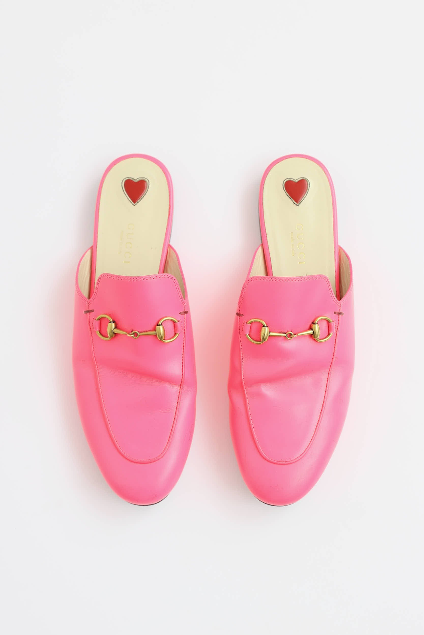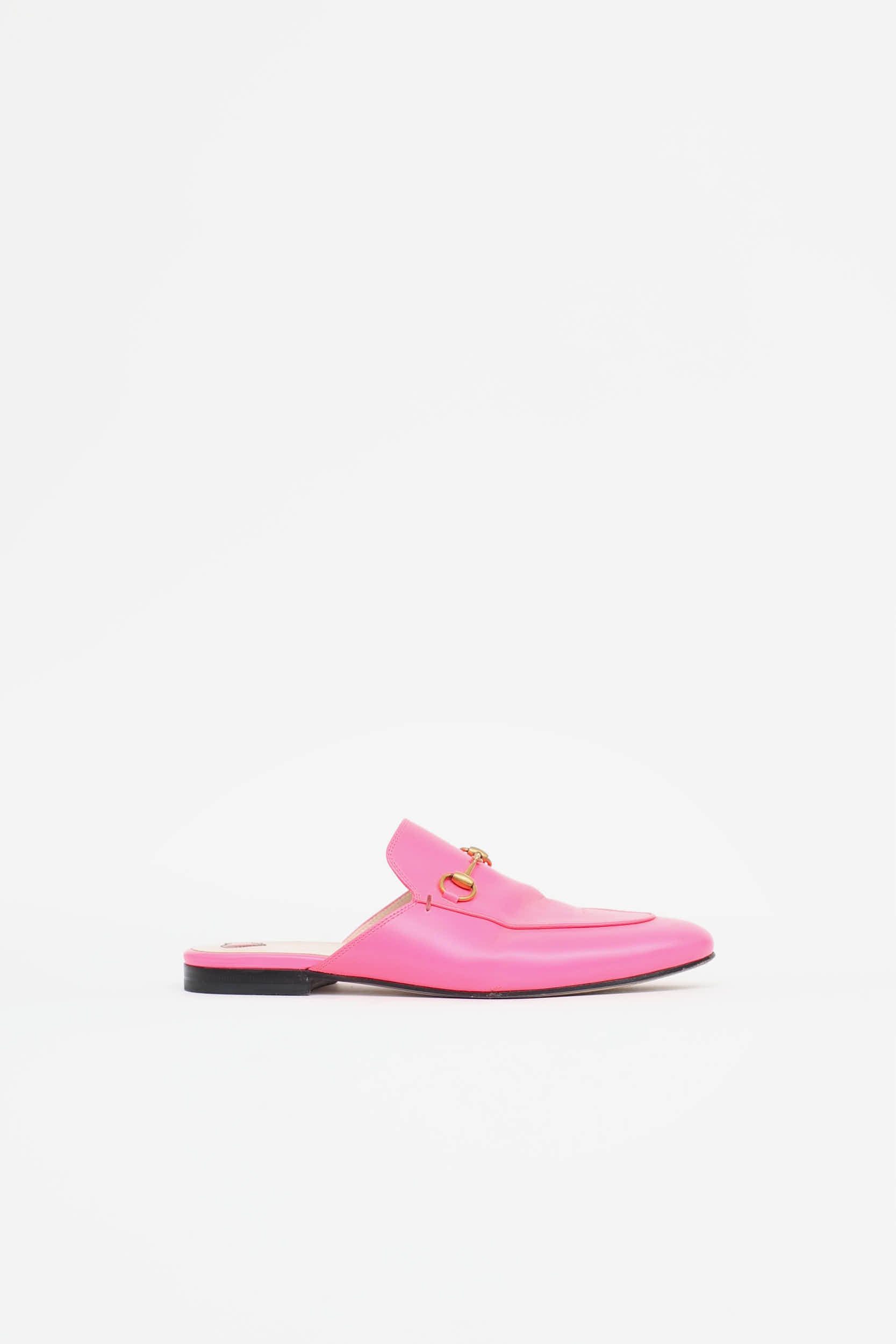 Pre-owned Gucci pink Princetown mules featuring a rounded toe, slip on entry, leather uppers, gold toned horsebit at vamp, and a short stacked heel. Comes with original dust bag.