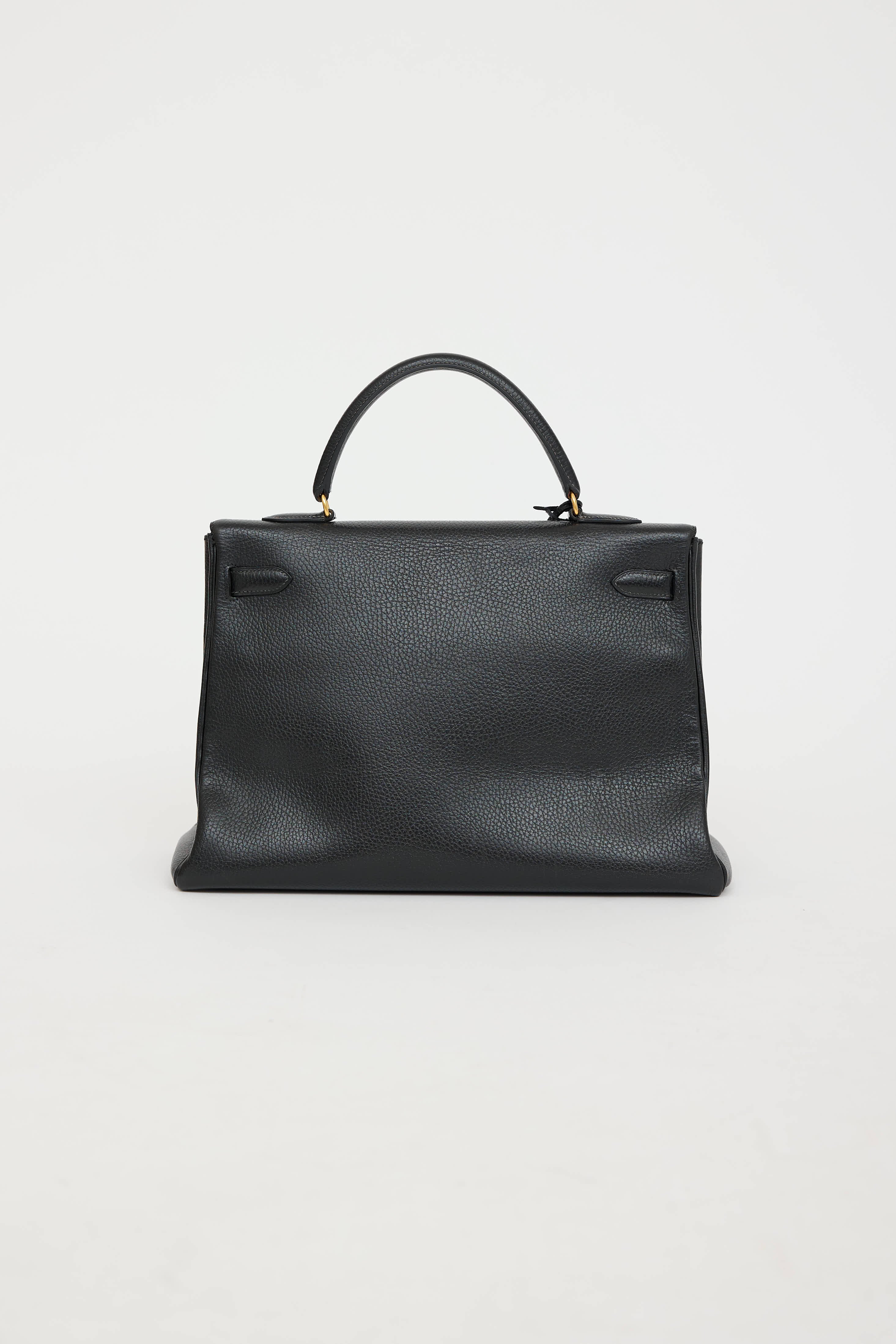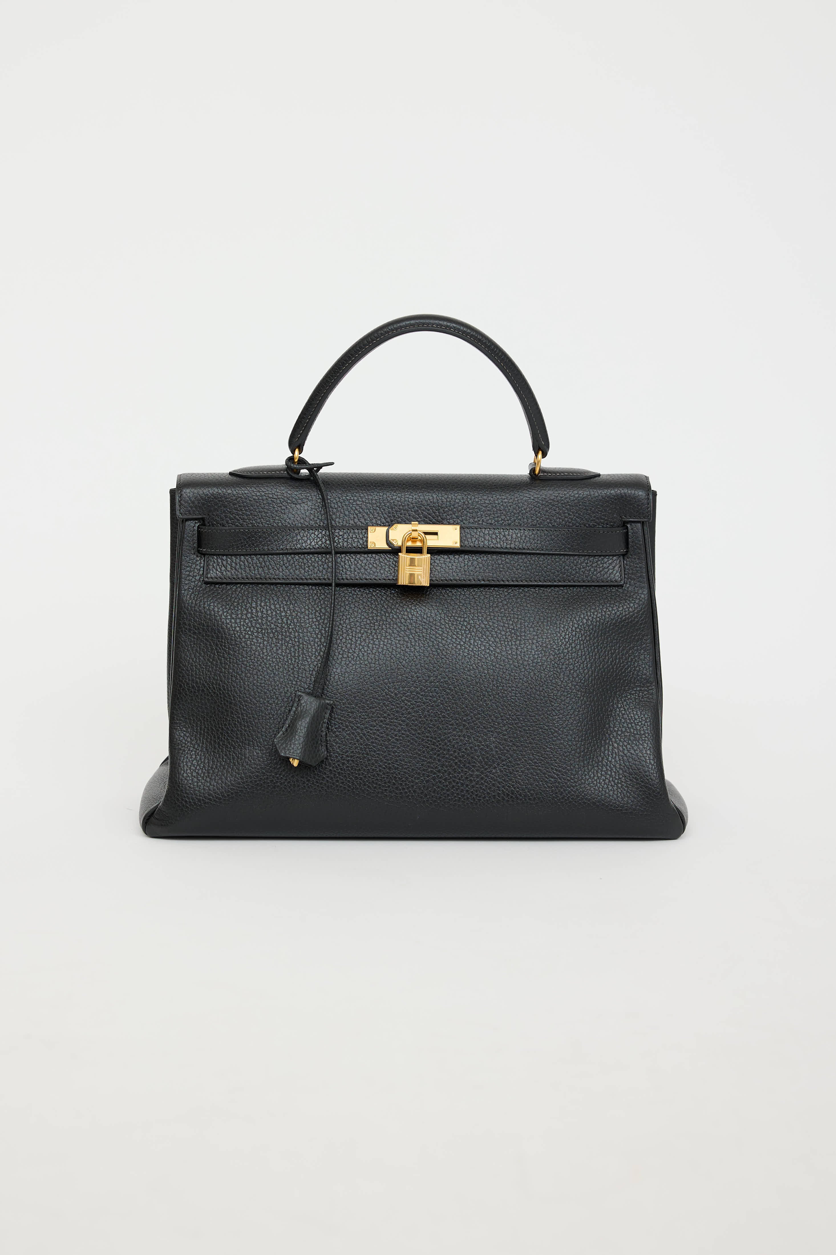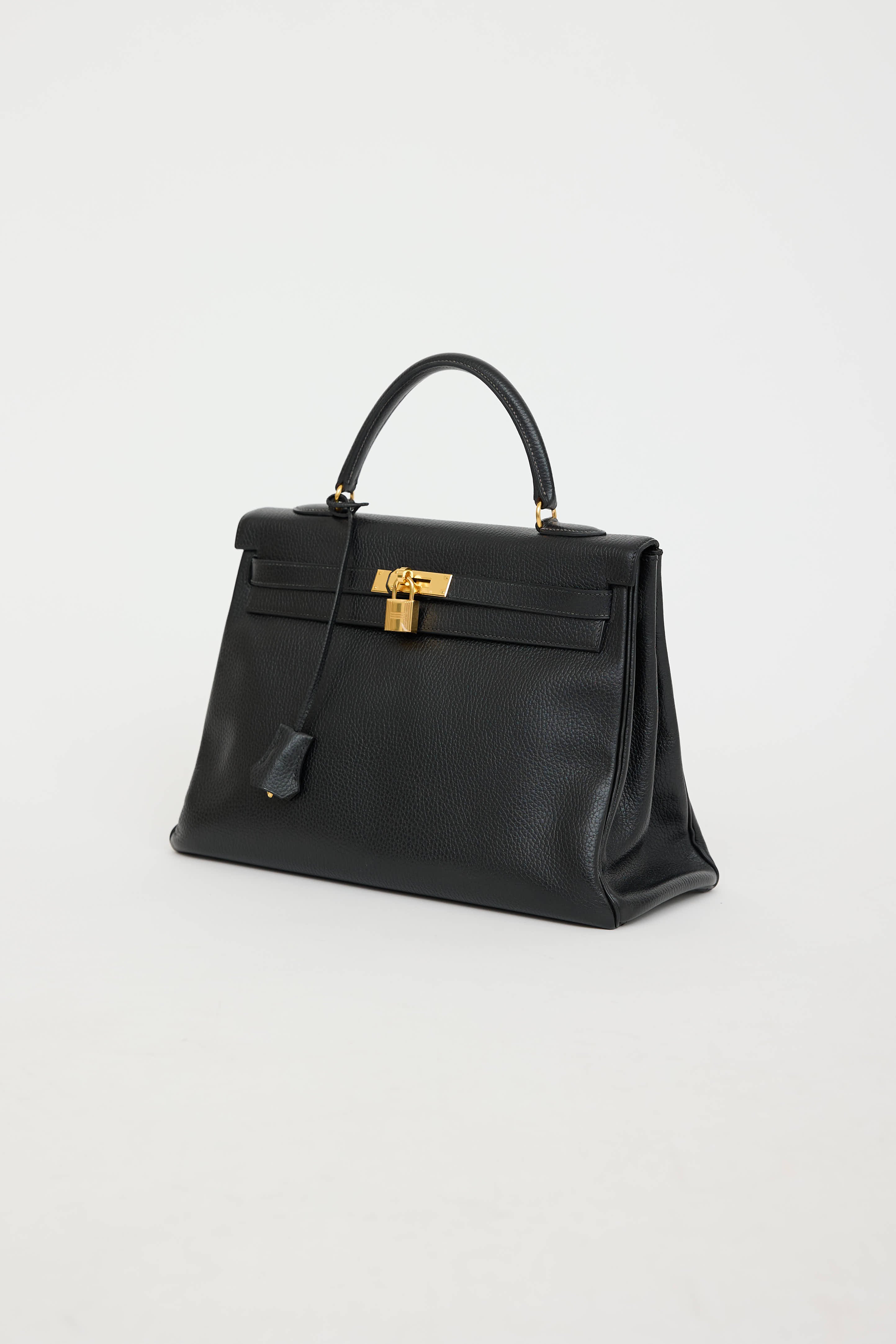 Pre-owned Hermès Noir 1992 Ardennes Kelly 35 bag featuring Ardennes leather, rolled top handle, gold plated hardware, key clochette, flap closure, brand stamp under flap, signature twist lock closure, logo engraved plaque, four clou, one main compartment, one interior zip pocket, and two slip pockets.