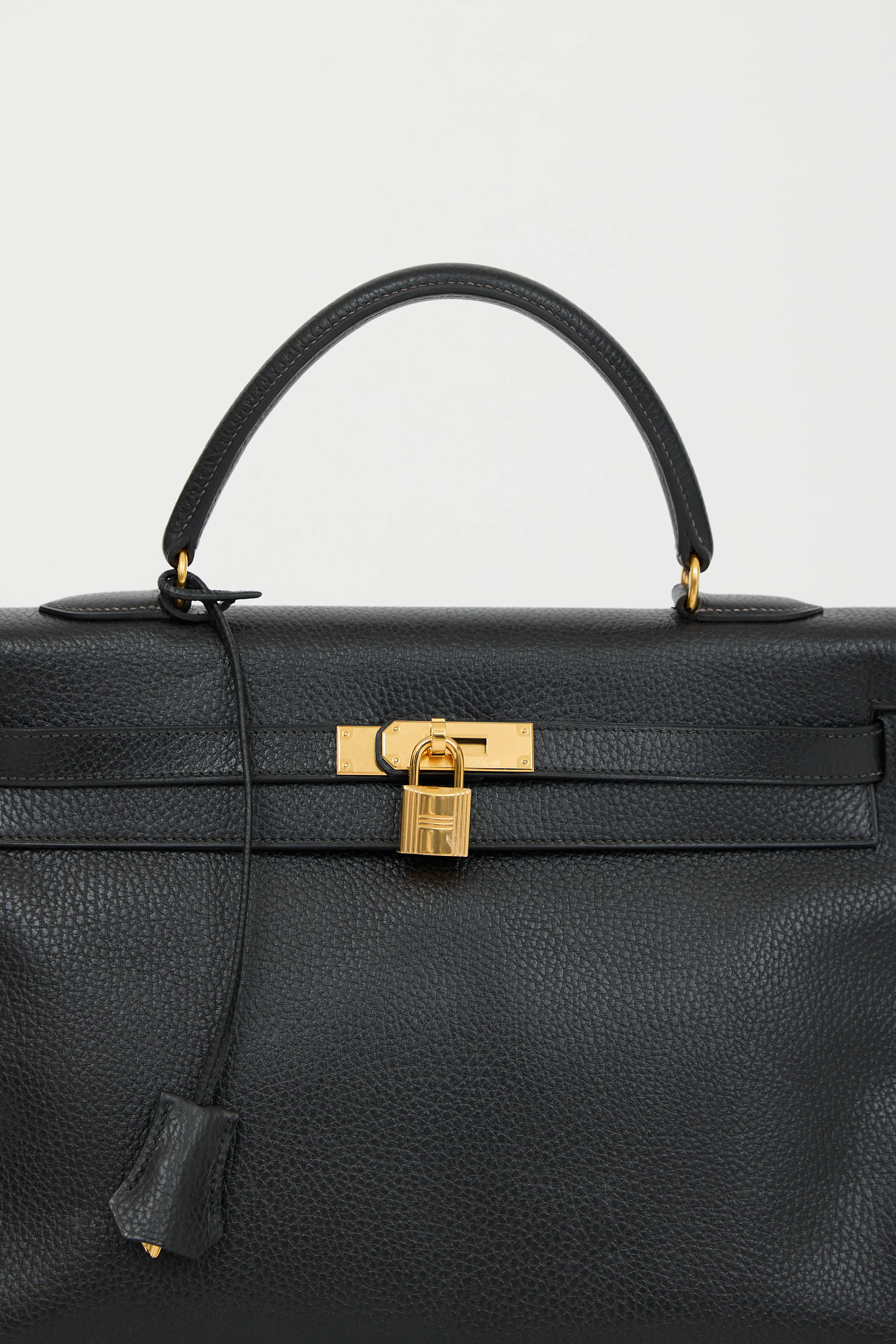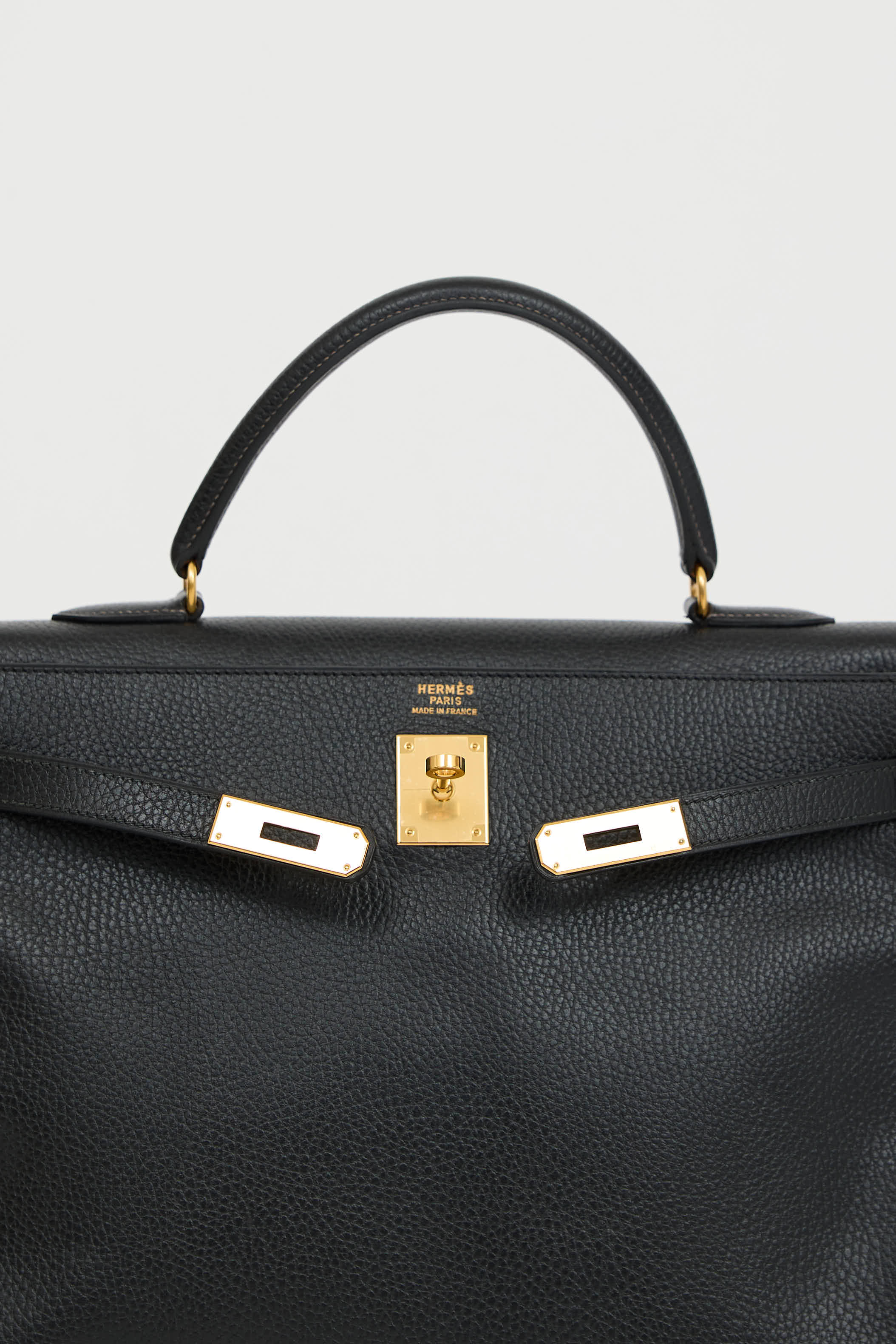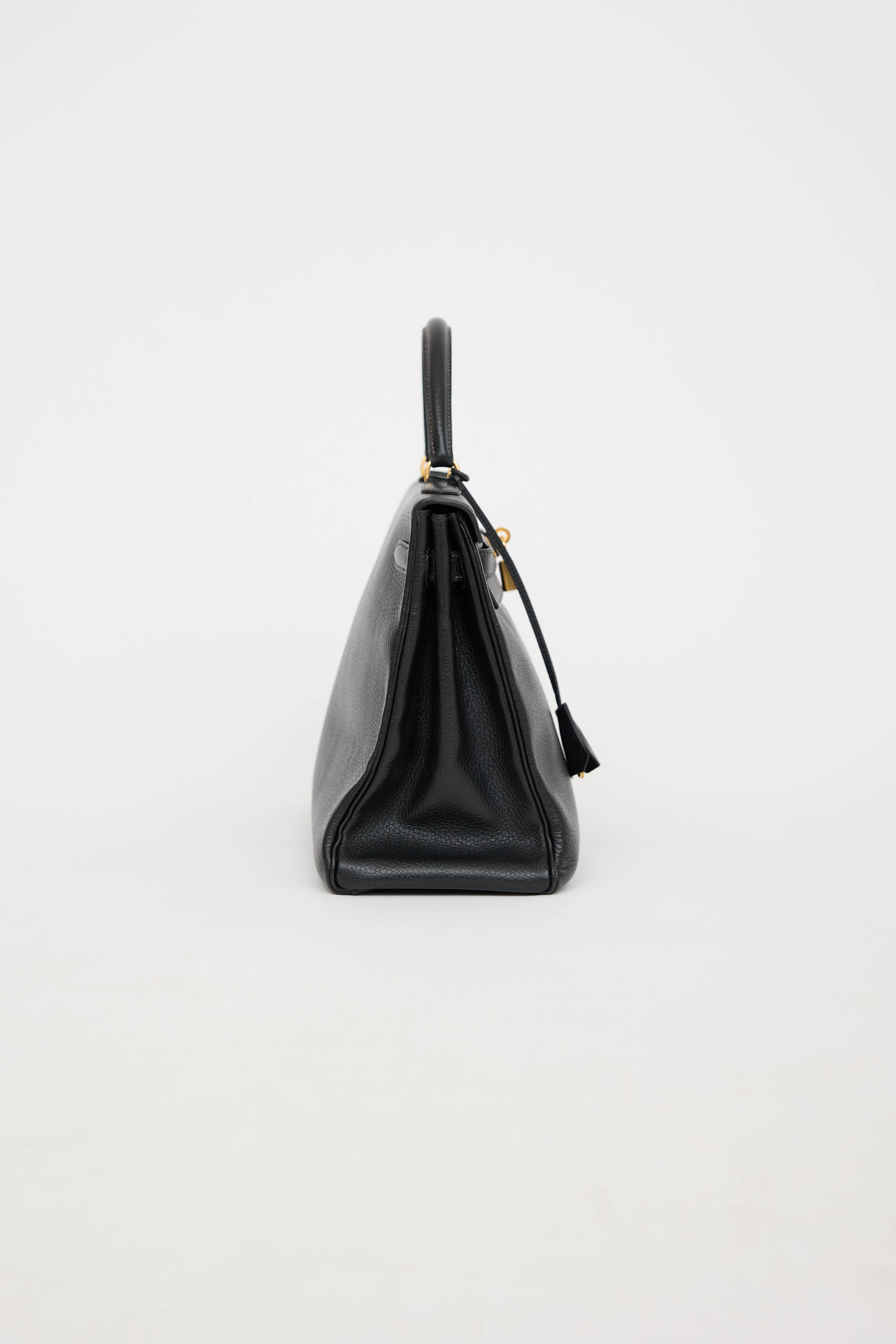 Pre-owned Hermès Noir 1992 Ardennes Kelly 35 bag featuring Ardennes leather, rolled top handle, gold plated hardware, key clochette, flap closure, brand stamp under flap, signature twist lock closure, logo engraved plaque, four clou, one main compartment, one interior zip pocket, and two slip pockets.