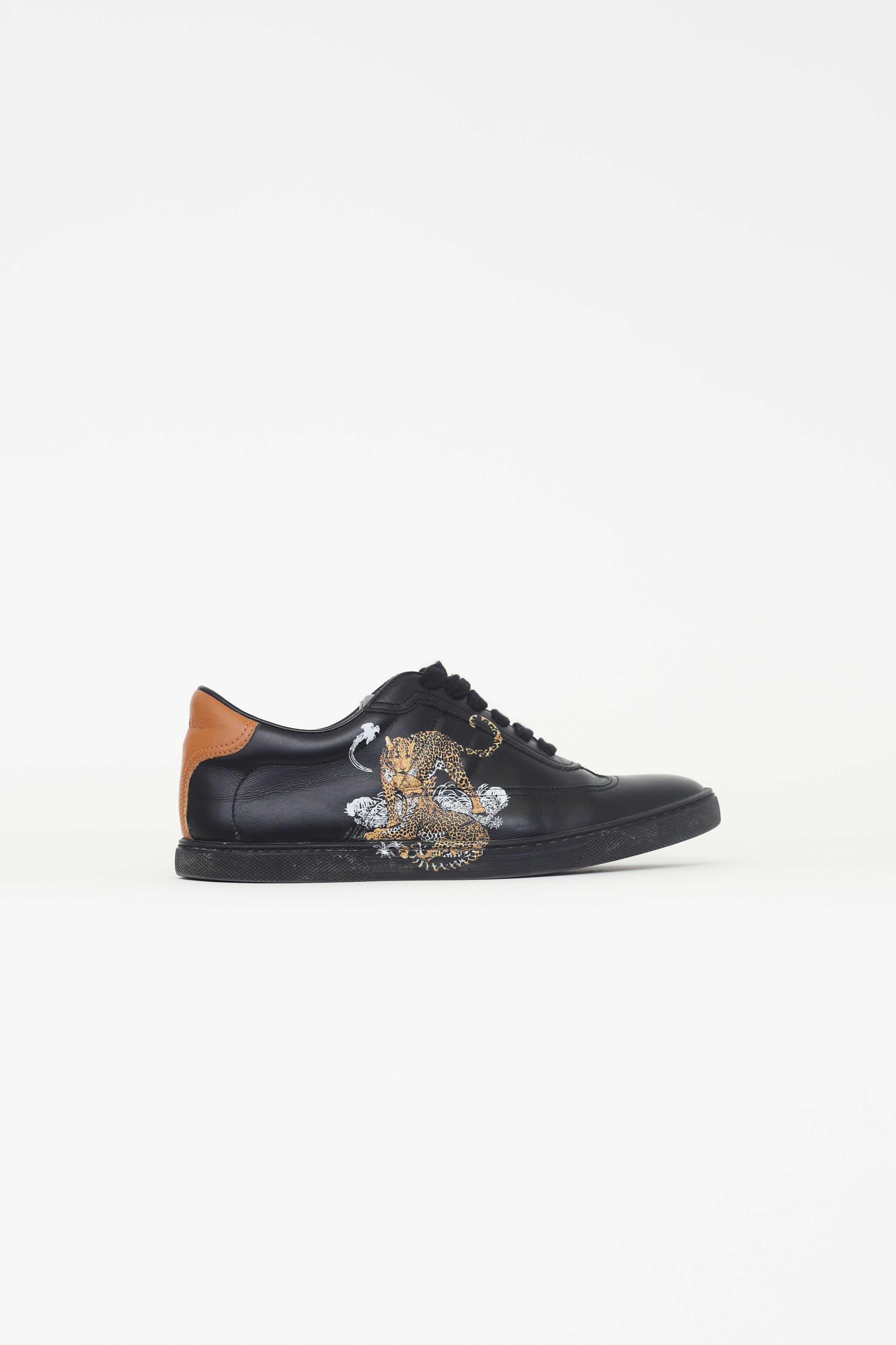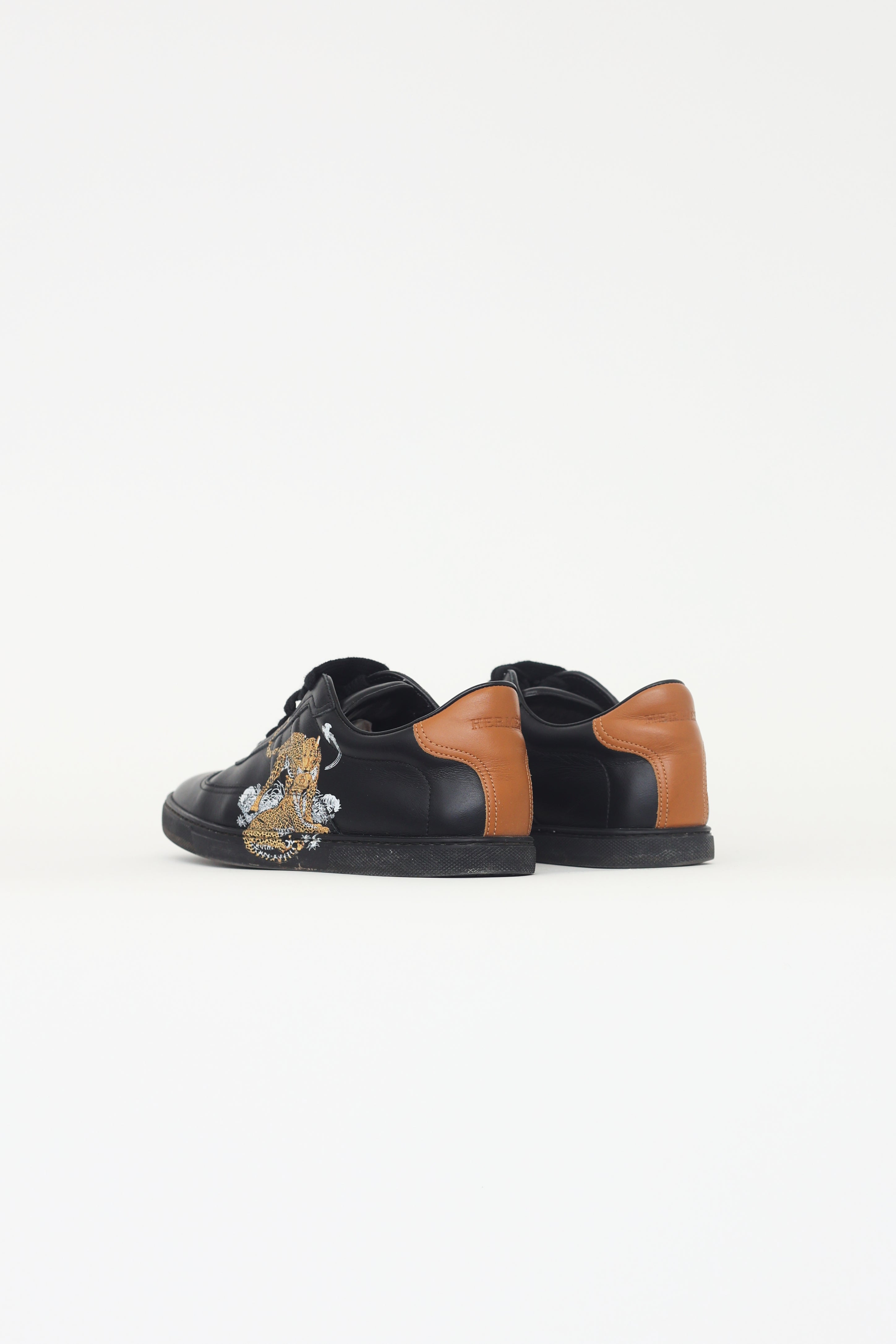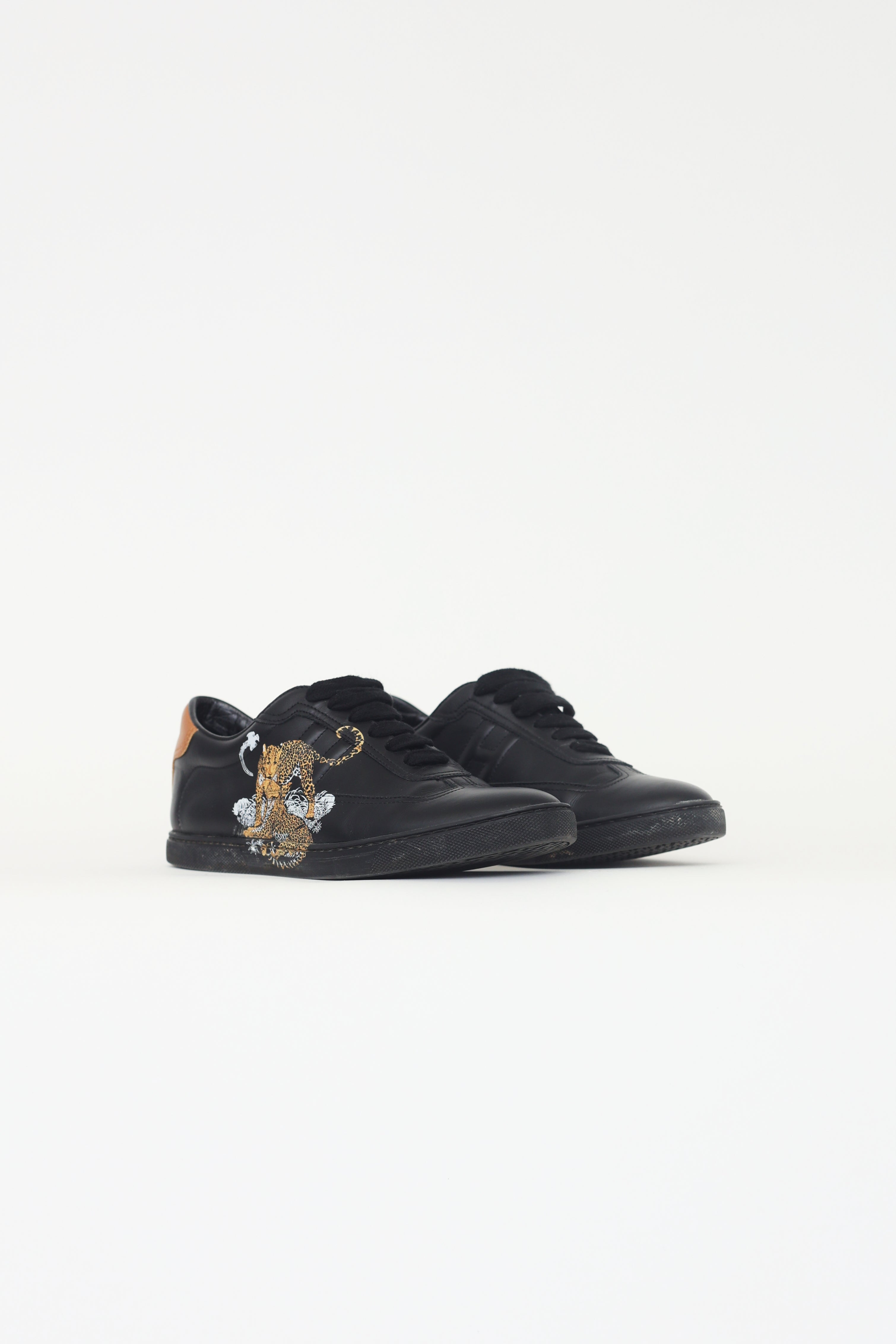 Pre-owned Hermès Quicker Jungle Love sneakers in black featuring black calfskin upper with "Jungle Love" print, iconic "H" detail quilted on outer and inner sides, rounded toe, lace up vamp, brown leather back tab, rubber midsole and outsole.