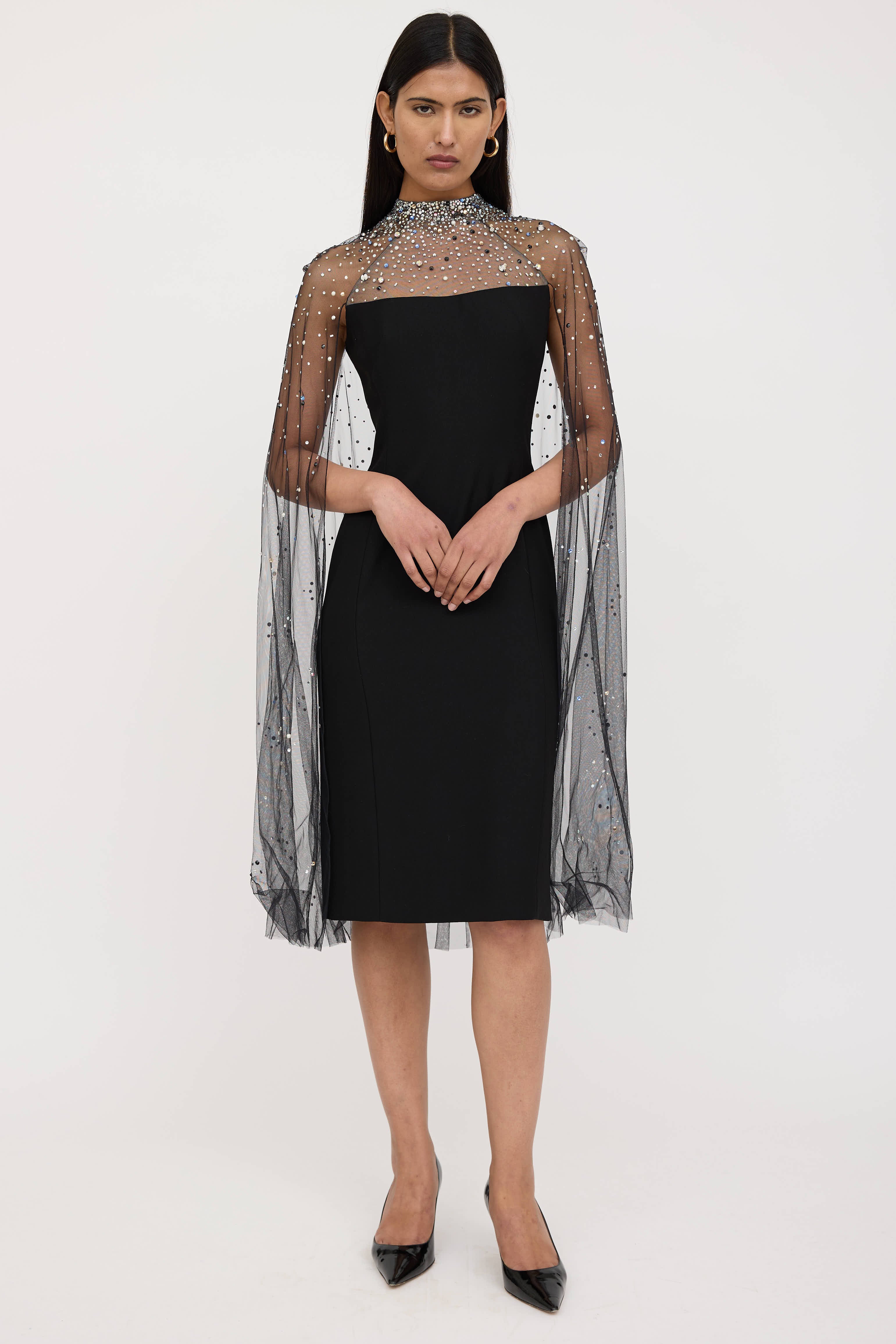 Pre-owned Jenny Packham black dress featuring a sheer overlay with multicolour crystal embellishment, mock neck collar, straight across neckline, and zip at back with hook and eye closure. Lined.
