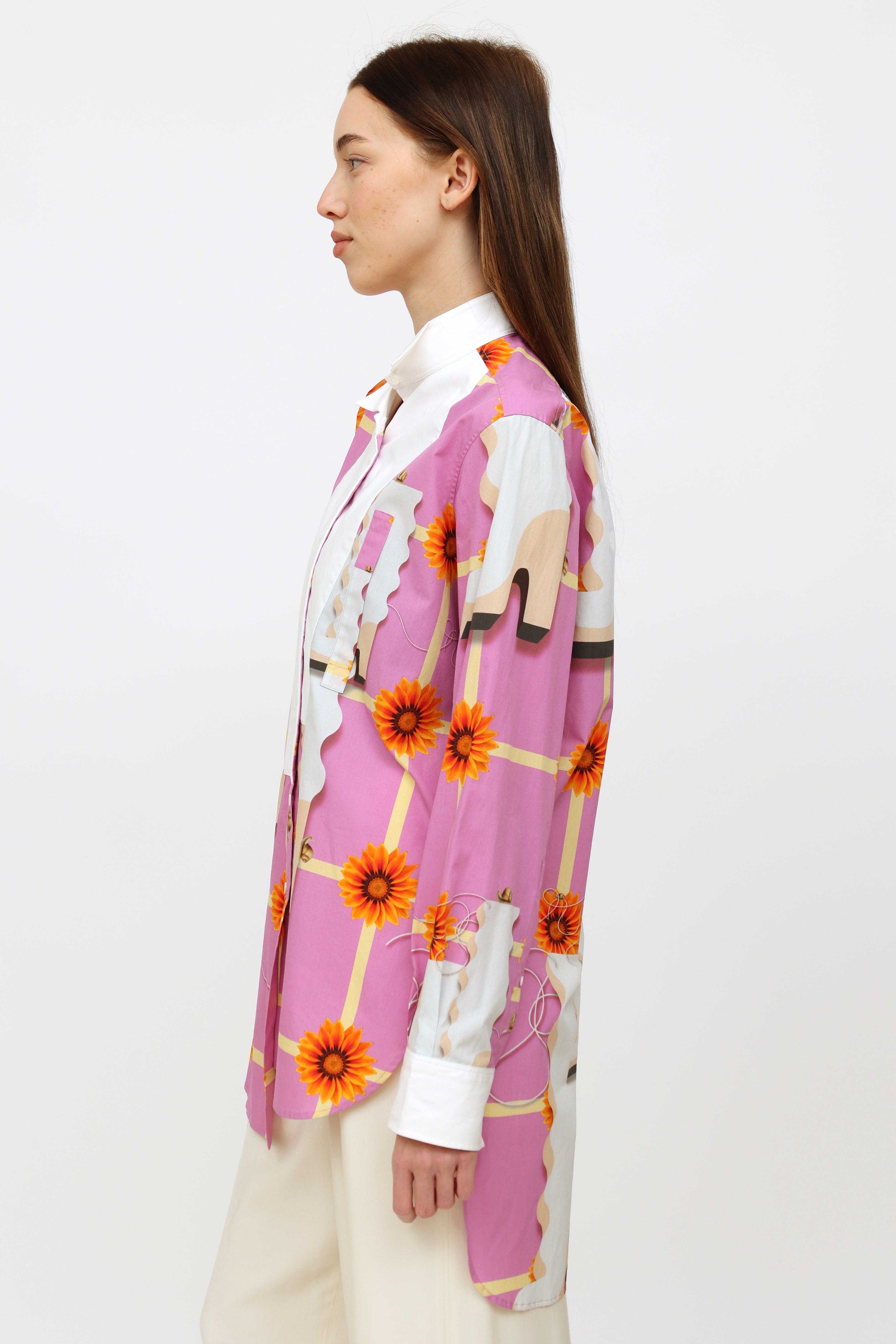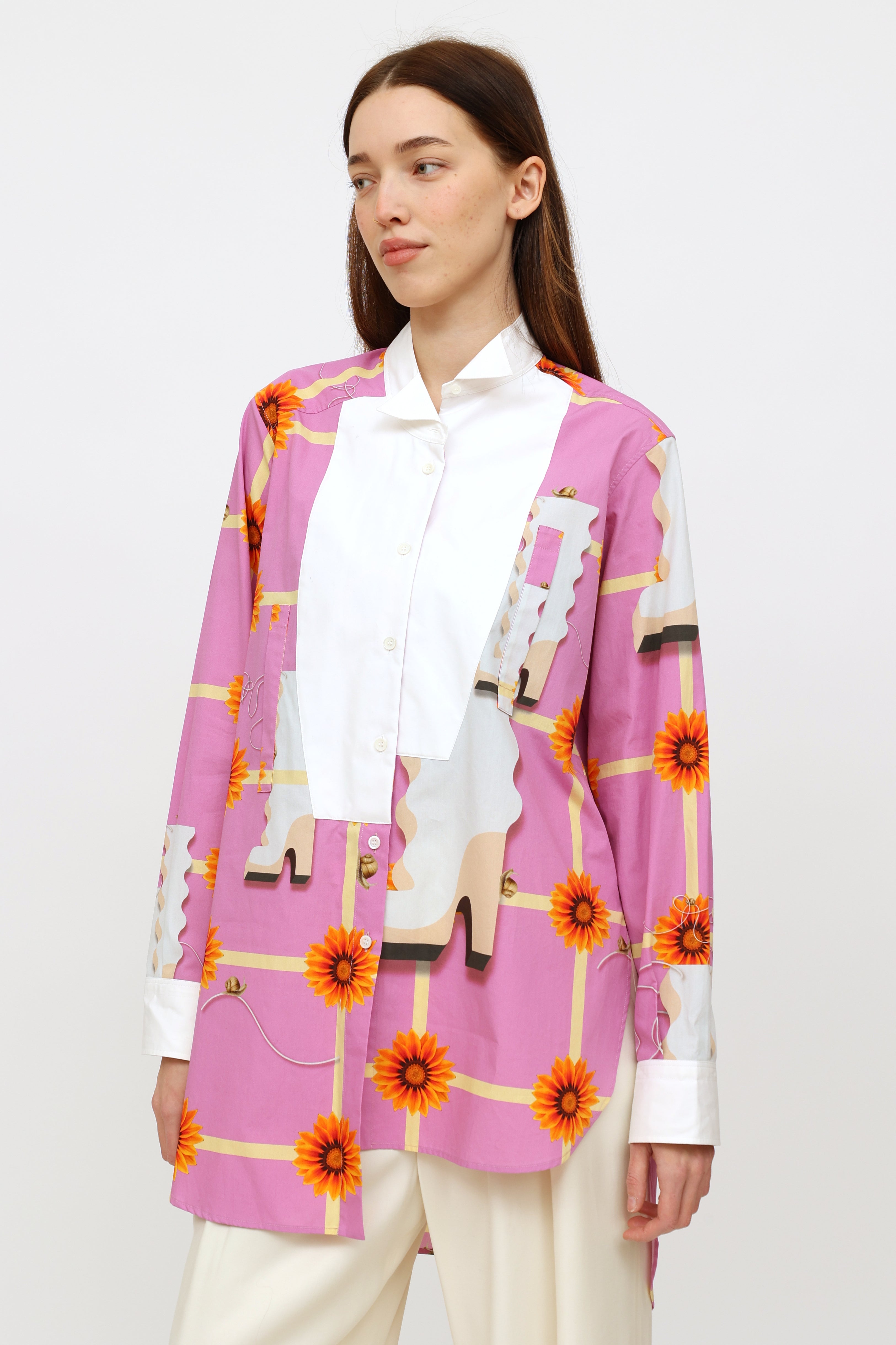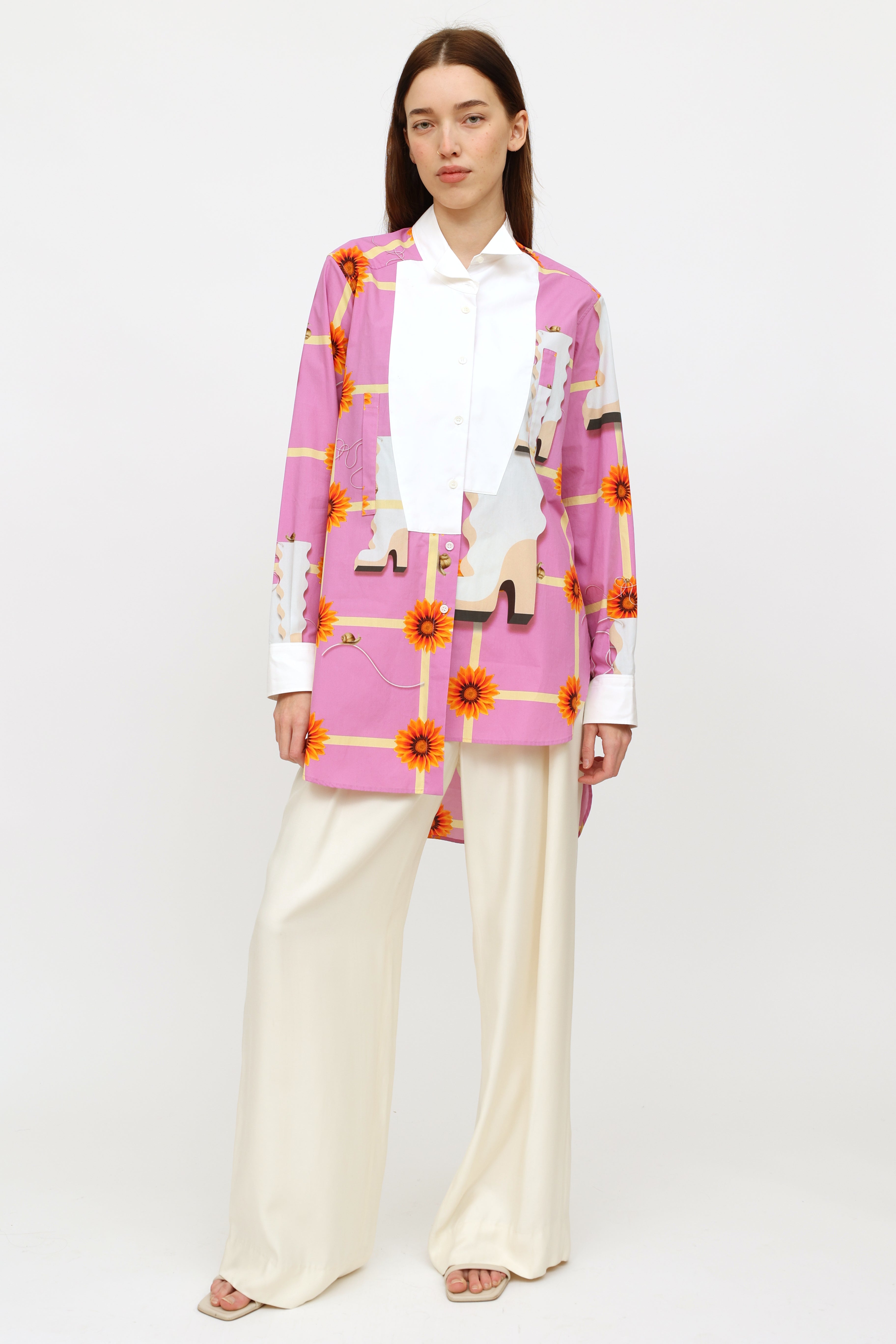 Pre-owned Loewe pink and orange floral buttoned shirt dress featuring a hyper realistic floral and snail print, wingtip collar, full length sleeves with buttoned cuffs, mis-matched asymmetrical button up closure, slits on side seams, yoke at back and extended back hemline.