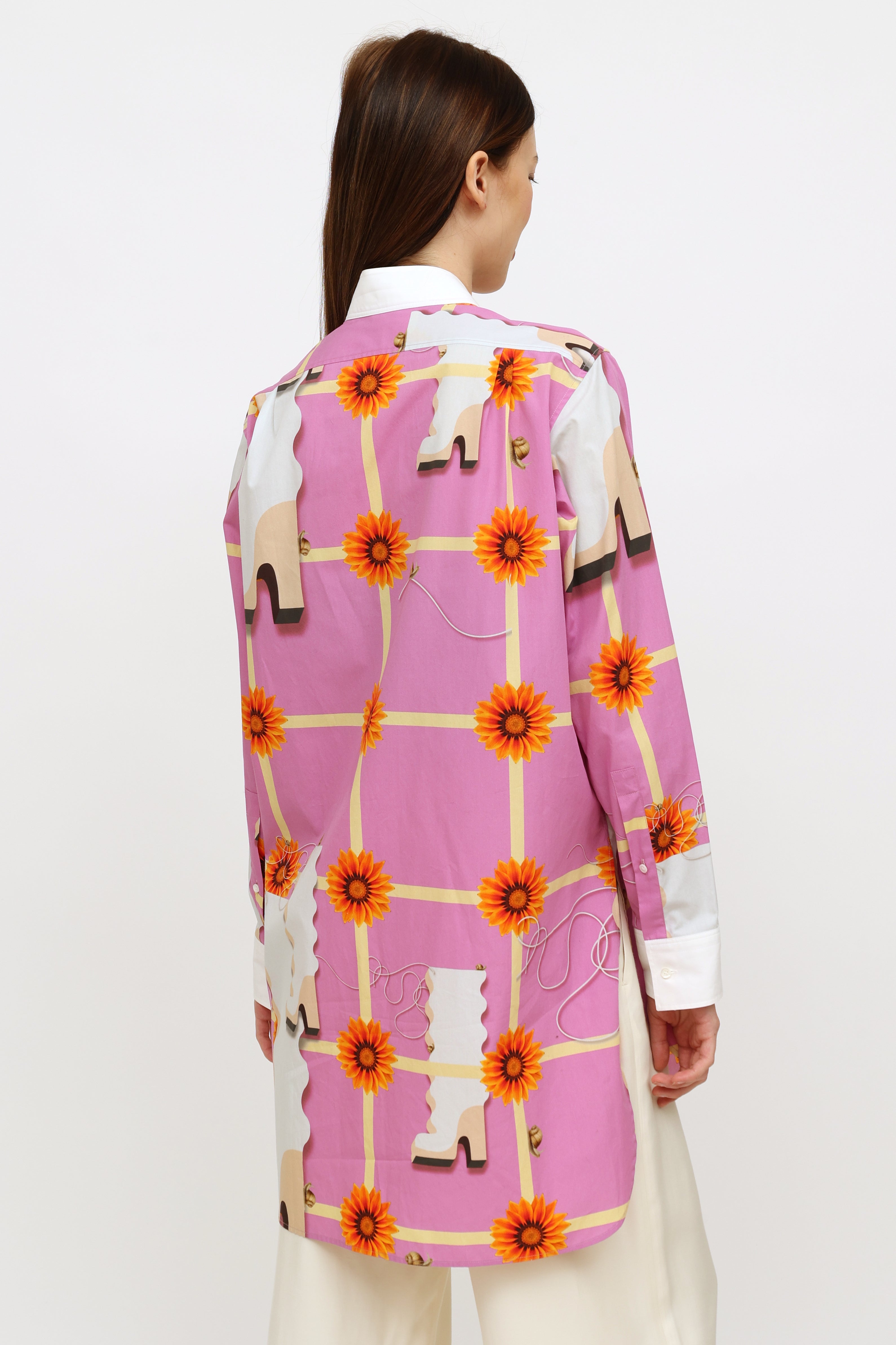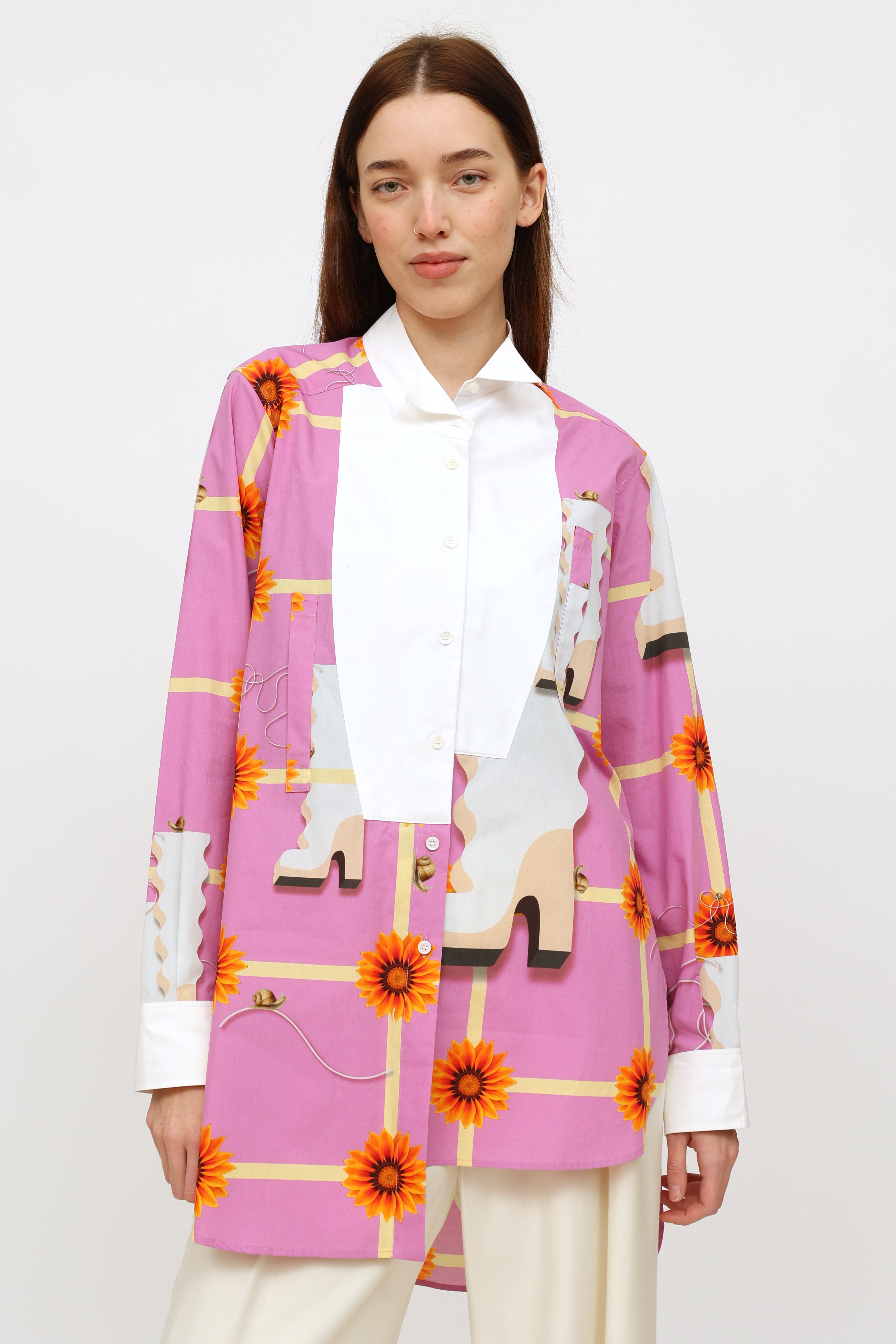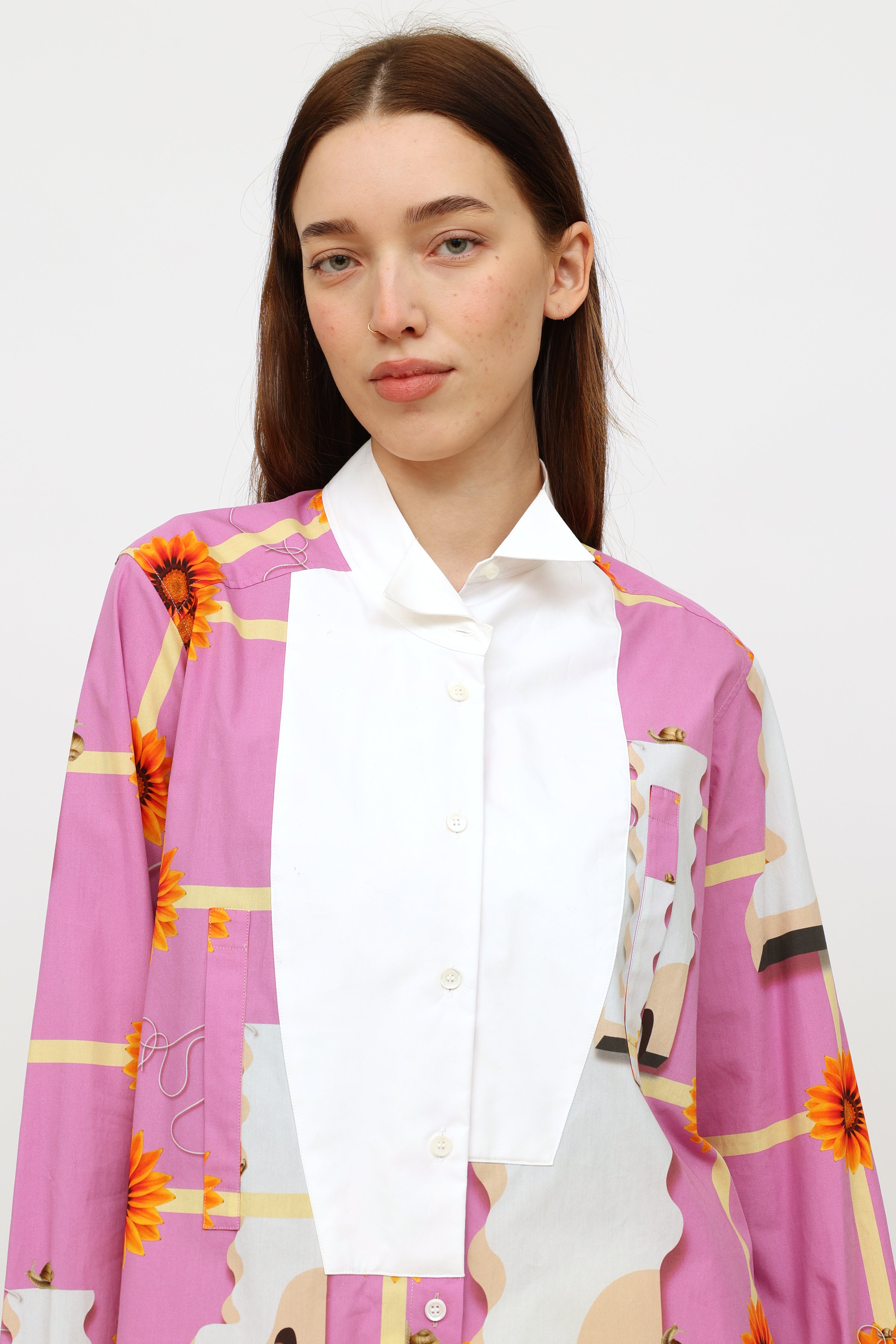 Pre-owned Loewe pink and orange floral buttoned shirt dress featuring a hyper realistic floral and snail print, wingtip collar, full length sleeves with buttoned cuffs, mis-matched asymmetrical button up closure, slits on side seams, yoke at back and extended back hemline.
