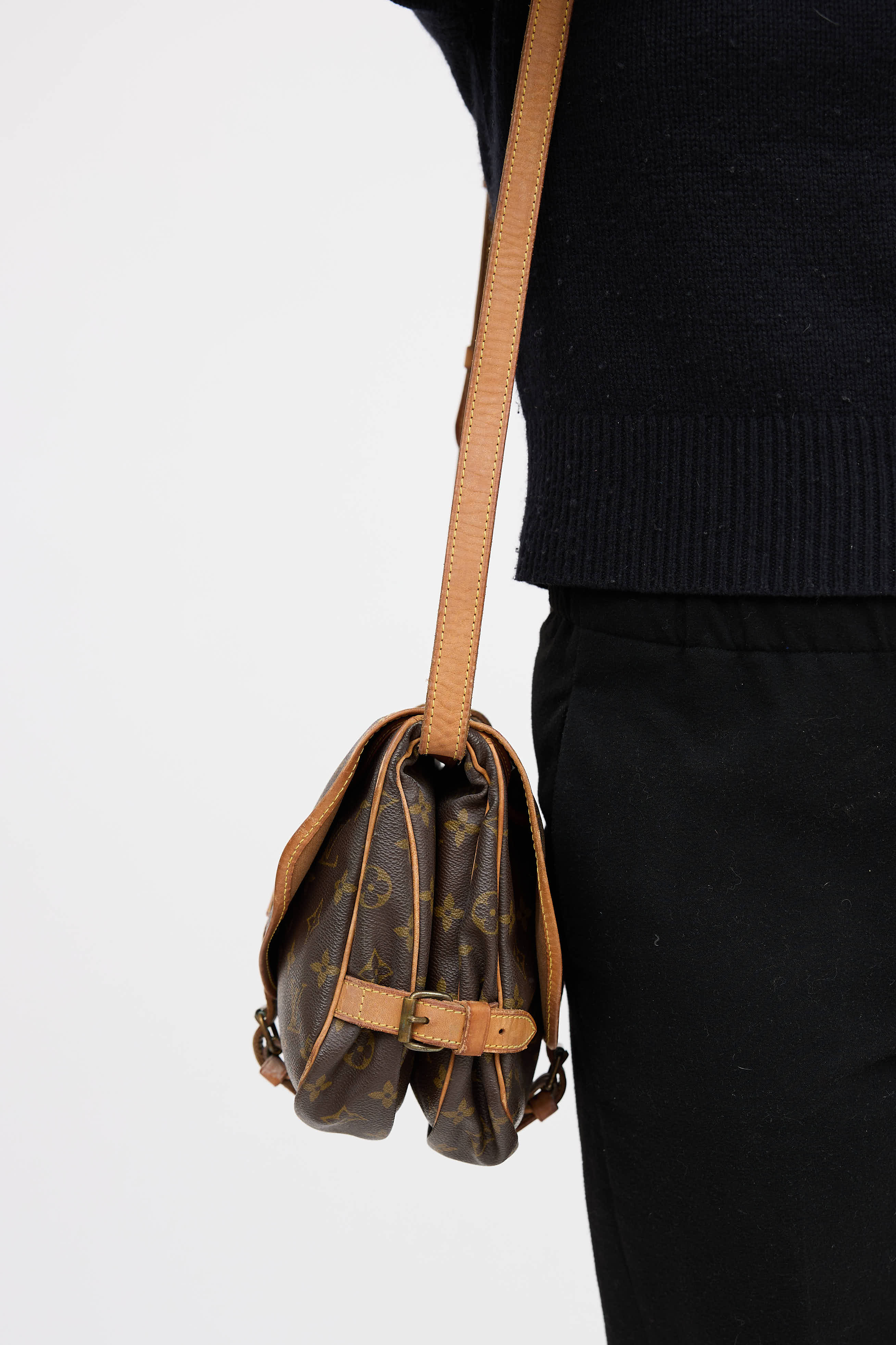 Pre-owned Louis Vuitton brown Samur bag featuring signature monogram, adjustable crossbody strap, buckle closures, adjustable straps at sides, slip pocket at back face, one main compartment, and one slip pocket.