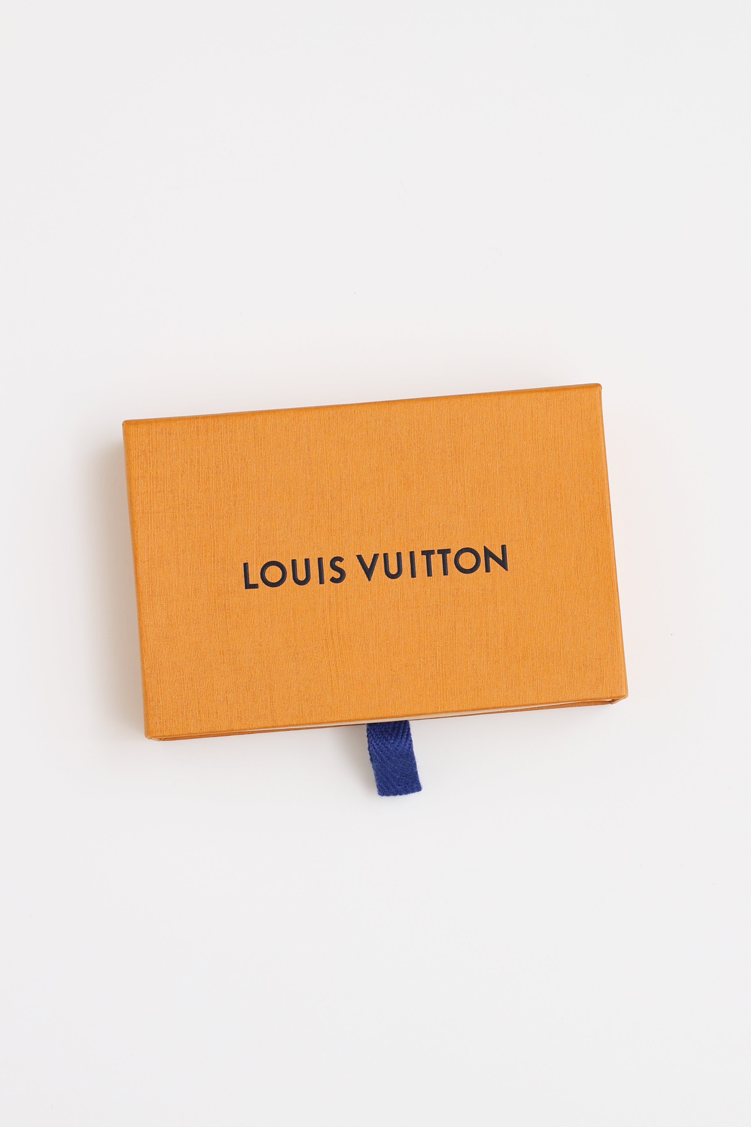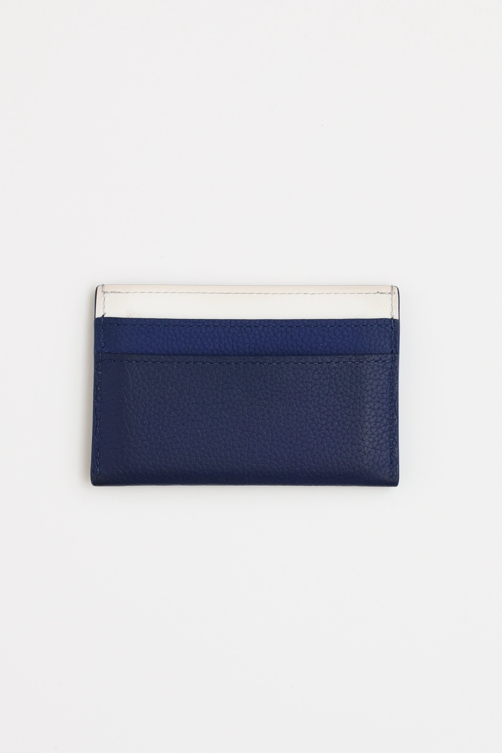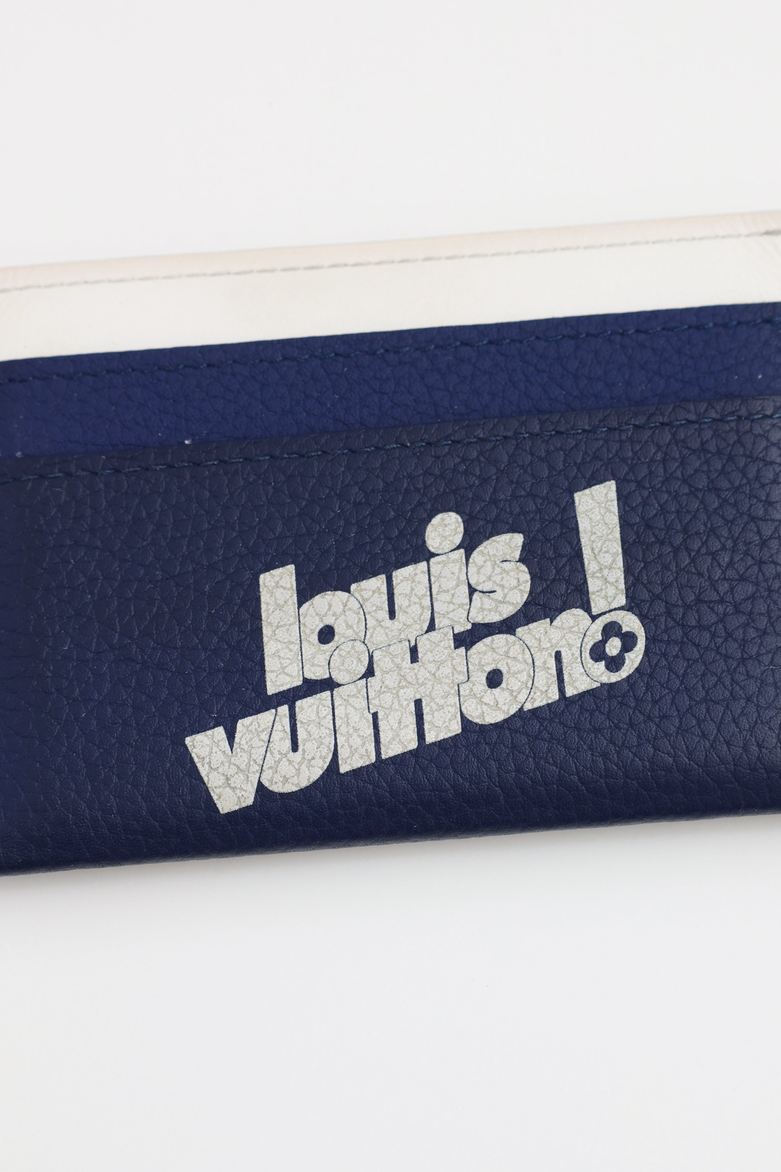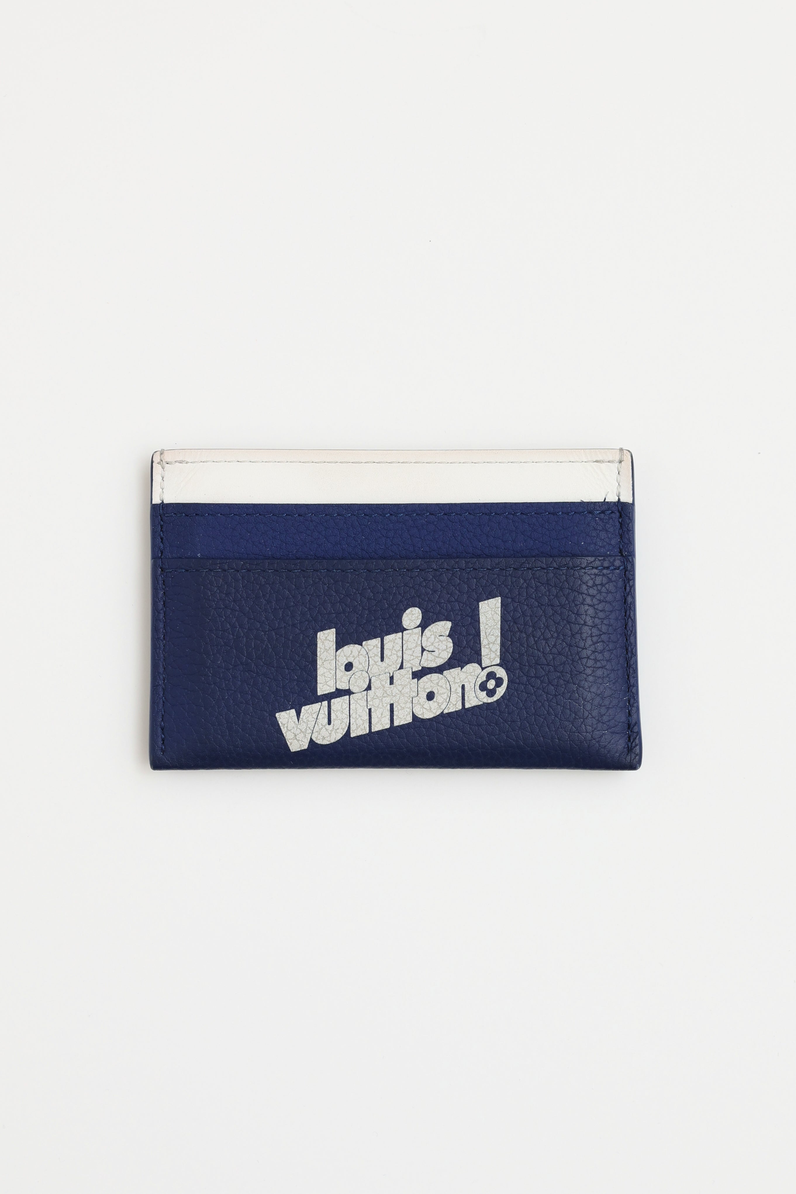 Pre-owned Louis Vuitton navy and white card holder featuring grained leather, white Louis Vuitton logo at front, four card lots and one central note slot.
