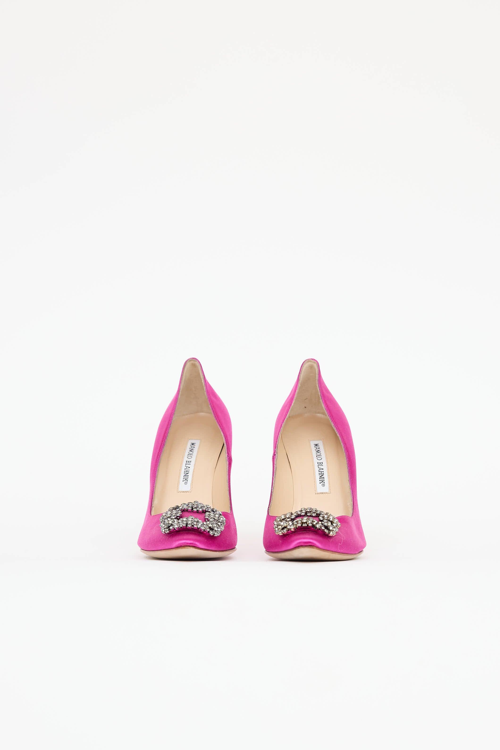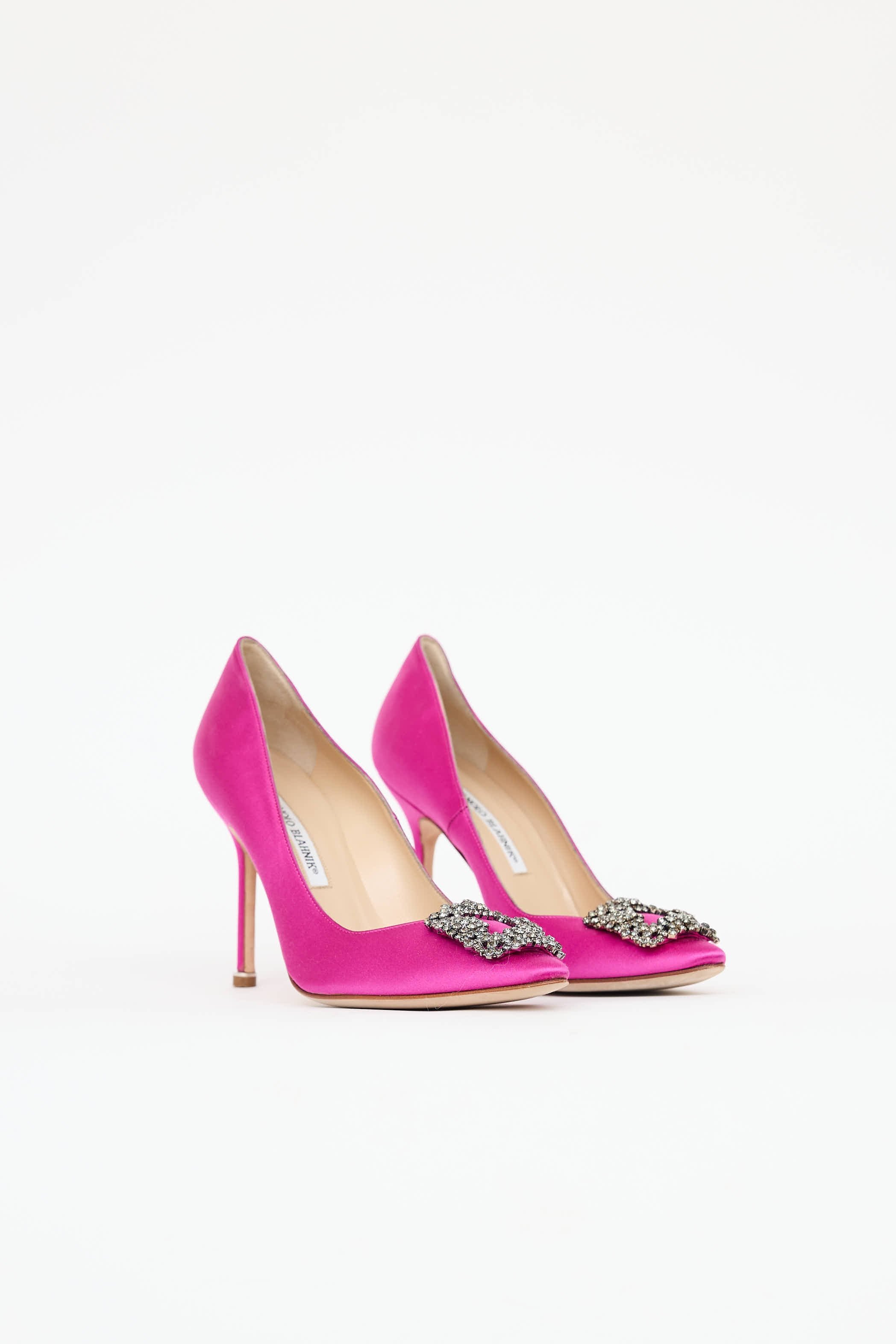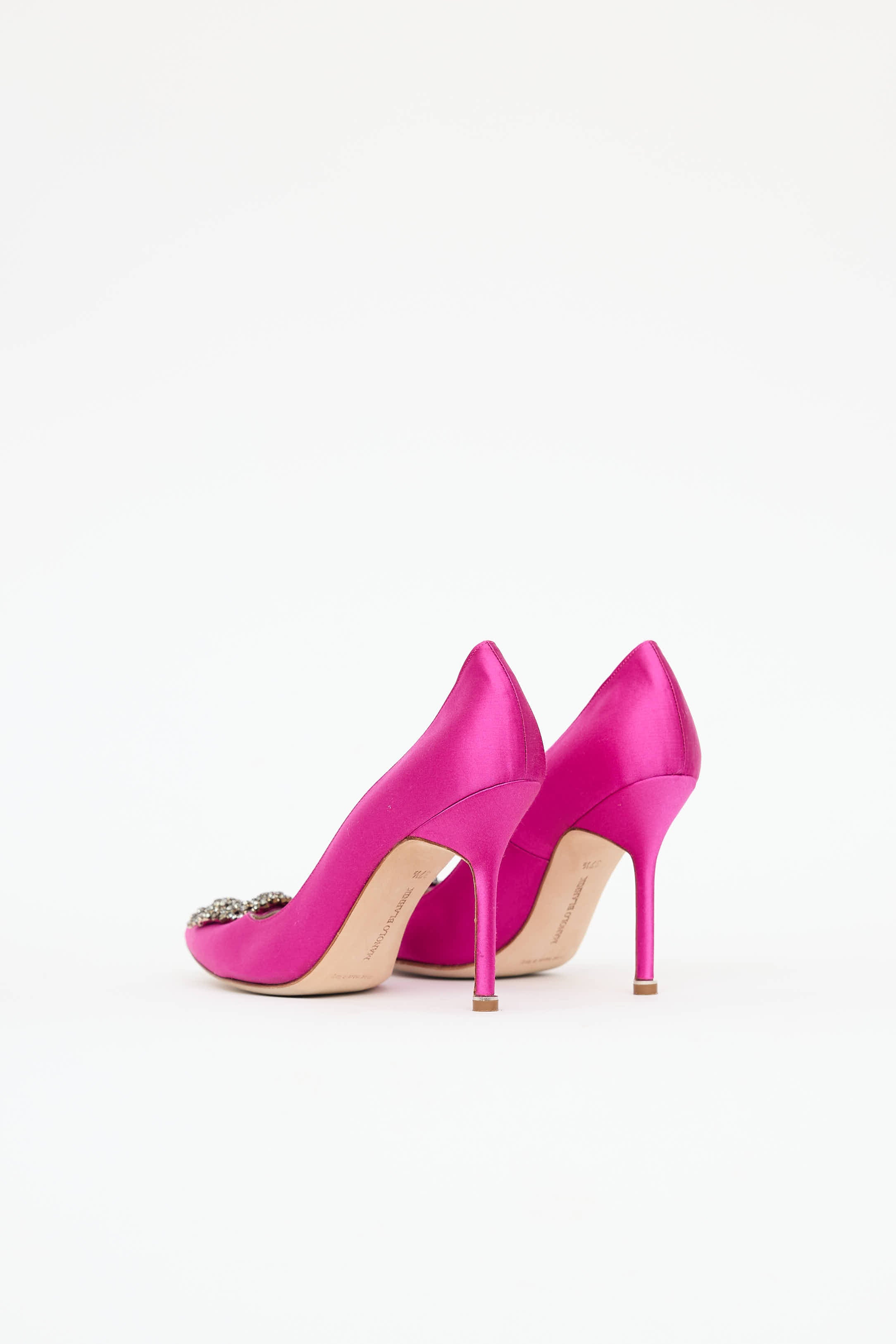 Pre-owned Manolo Blahnik pink Hangisi pumps featuring pointed toe, satin upper, signature Hangisi embellishment on vamp, and satin wrapped heel.
