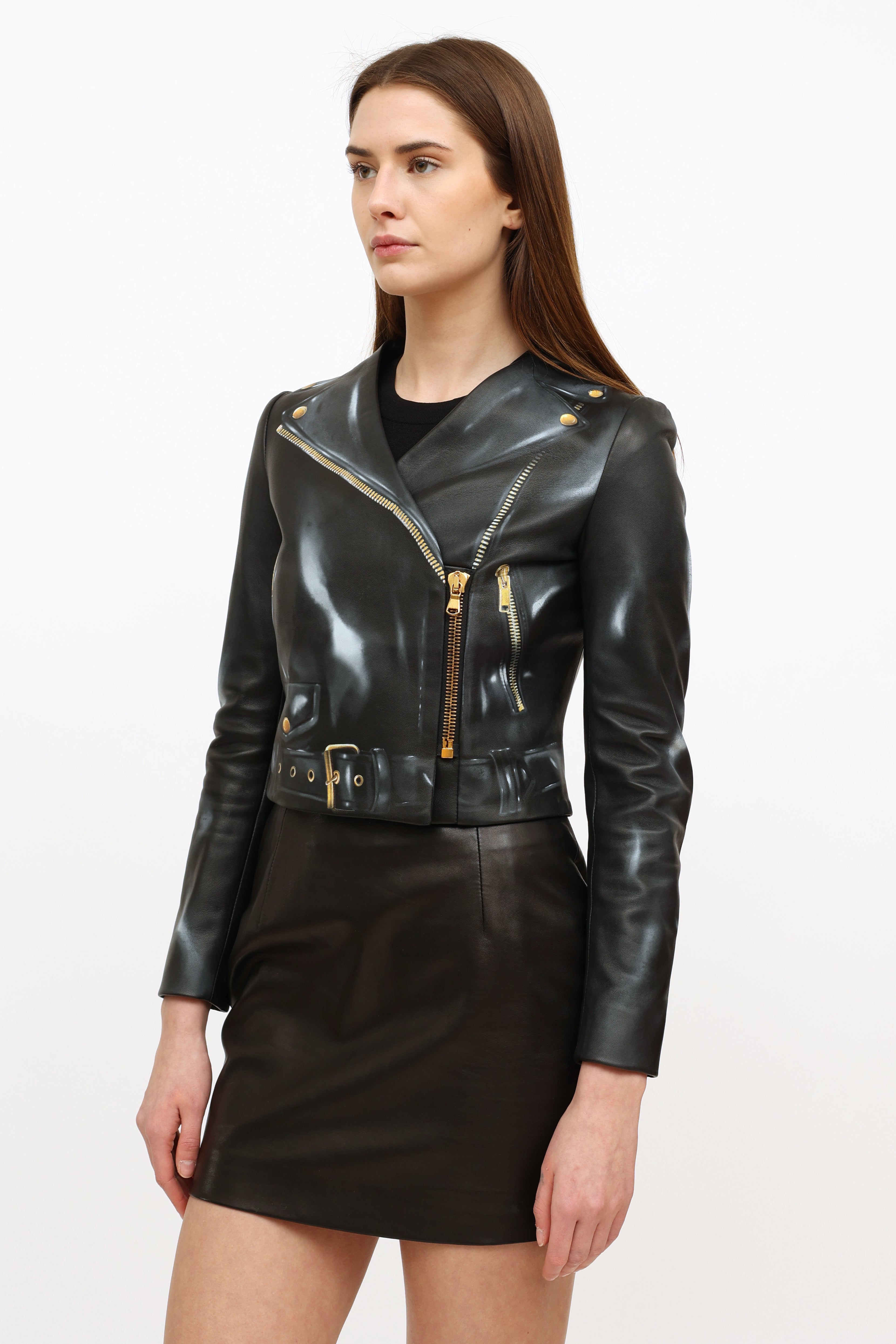 Pre-owned Moschino Couture black leather jacket featuring a collar-less styling, V-neck, full length sleeves, three-quarter asymmetrical zip closure with dual snap buttons, gold-tone hardware and fully lined. Detailing such as the collar, pockets, cuff zippers, back waistband and belt, shadows and highlights have been printed on.