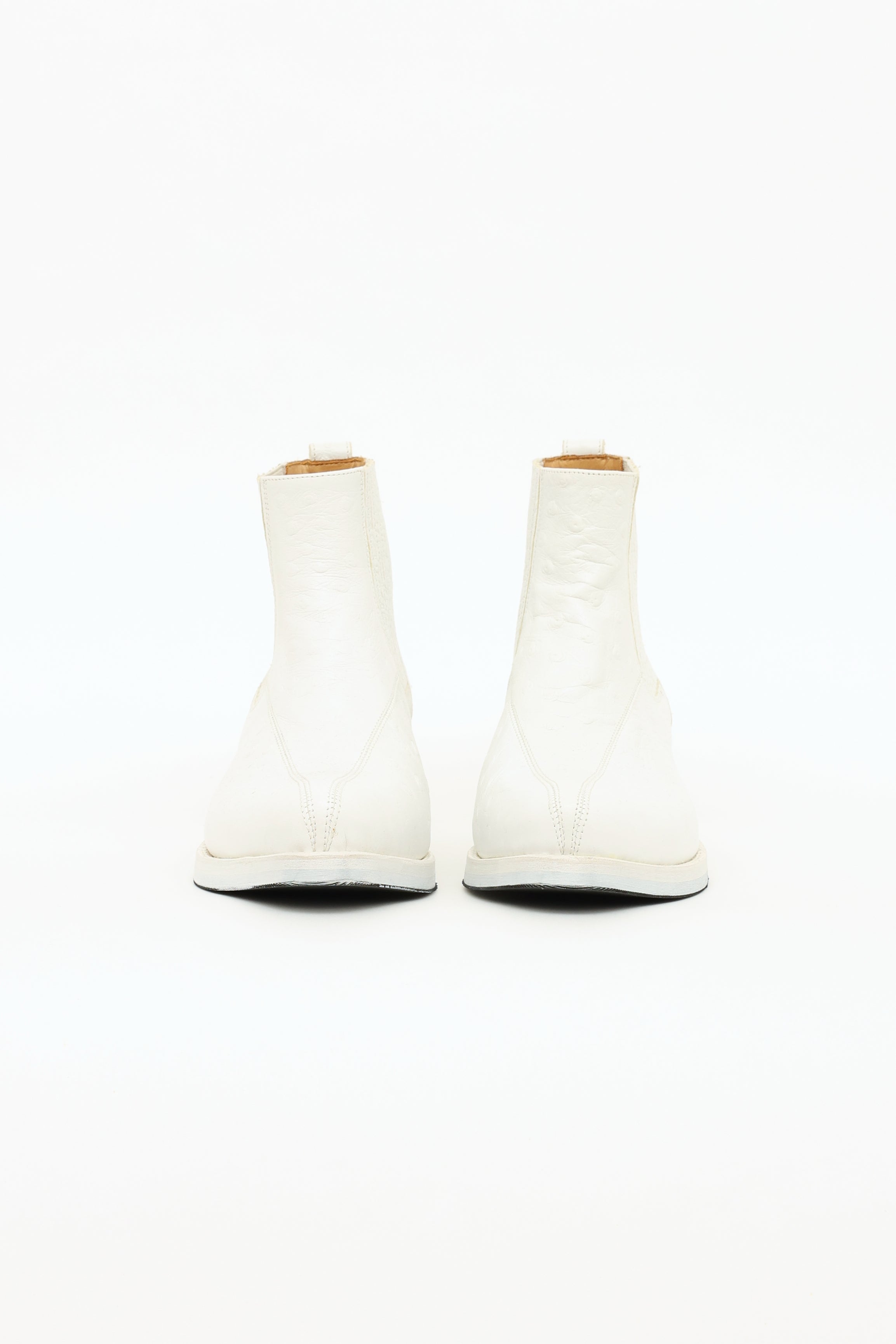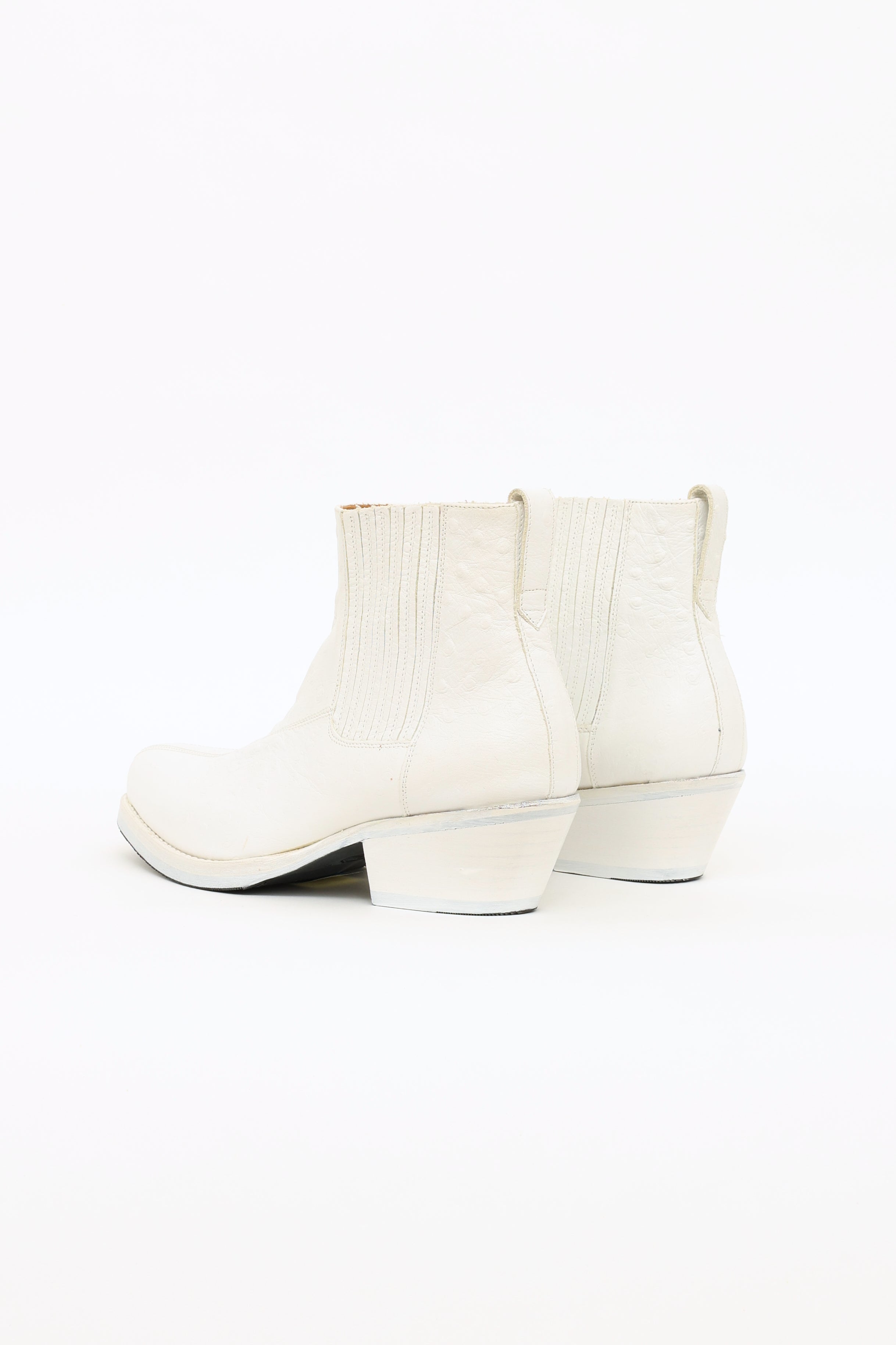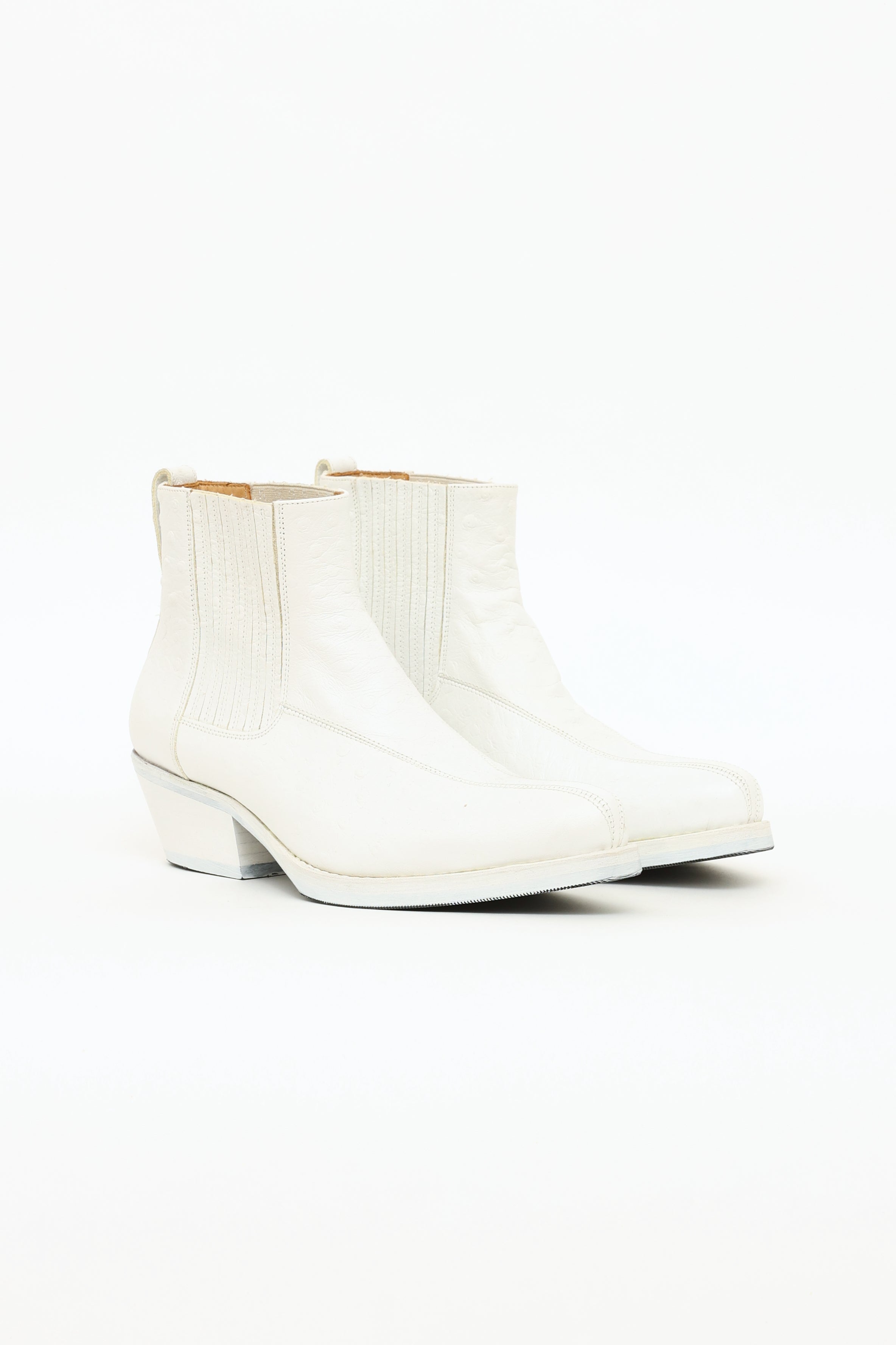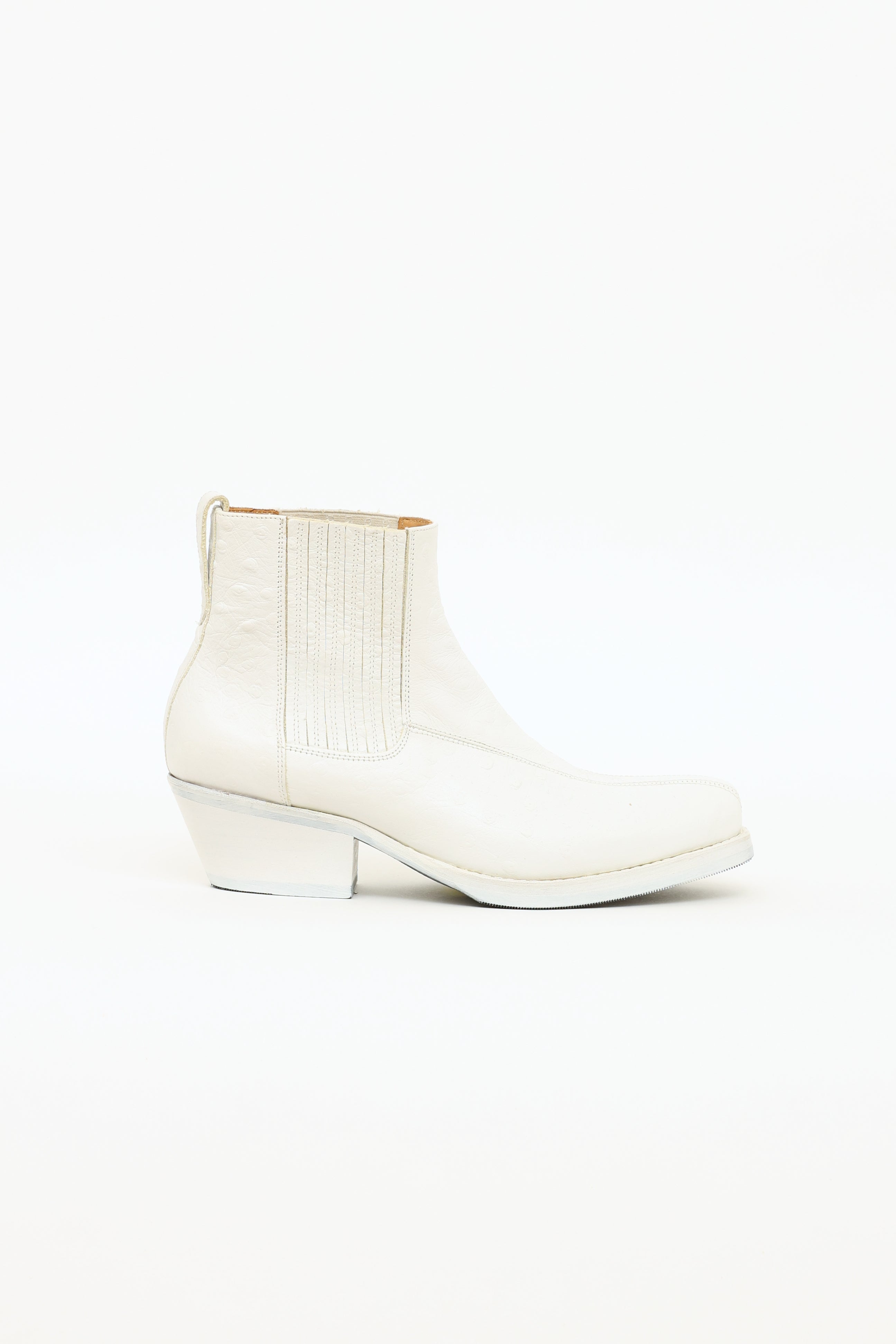 Pre-owned Our legacy white leather ankle boots featuring a pointed toe, embossed detailing throughout, gores at sides embroidered with leather, pull loops at back, block heel, leather insole, and rubber outsole.