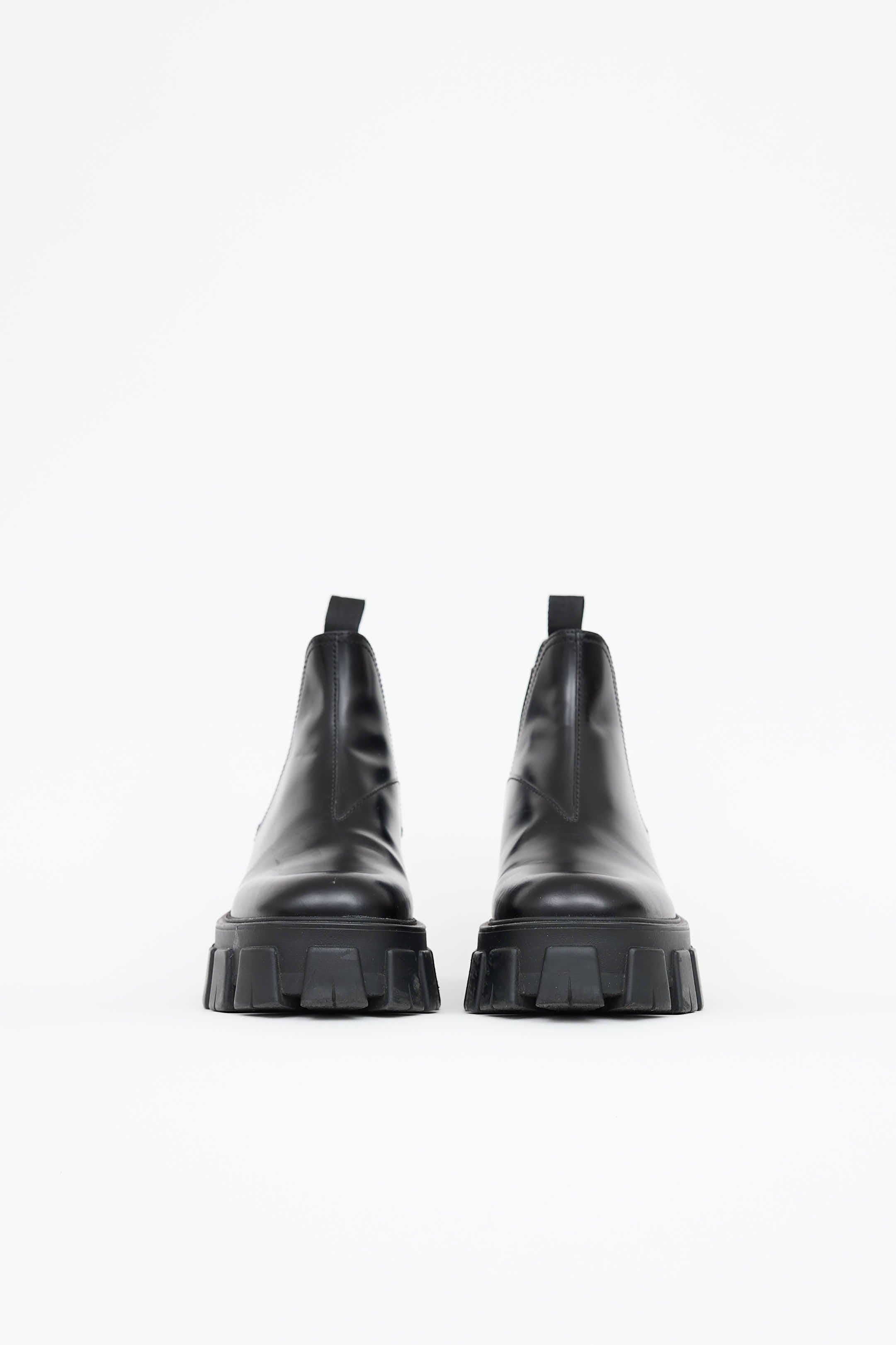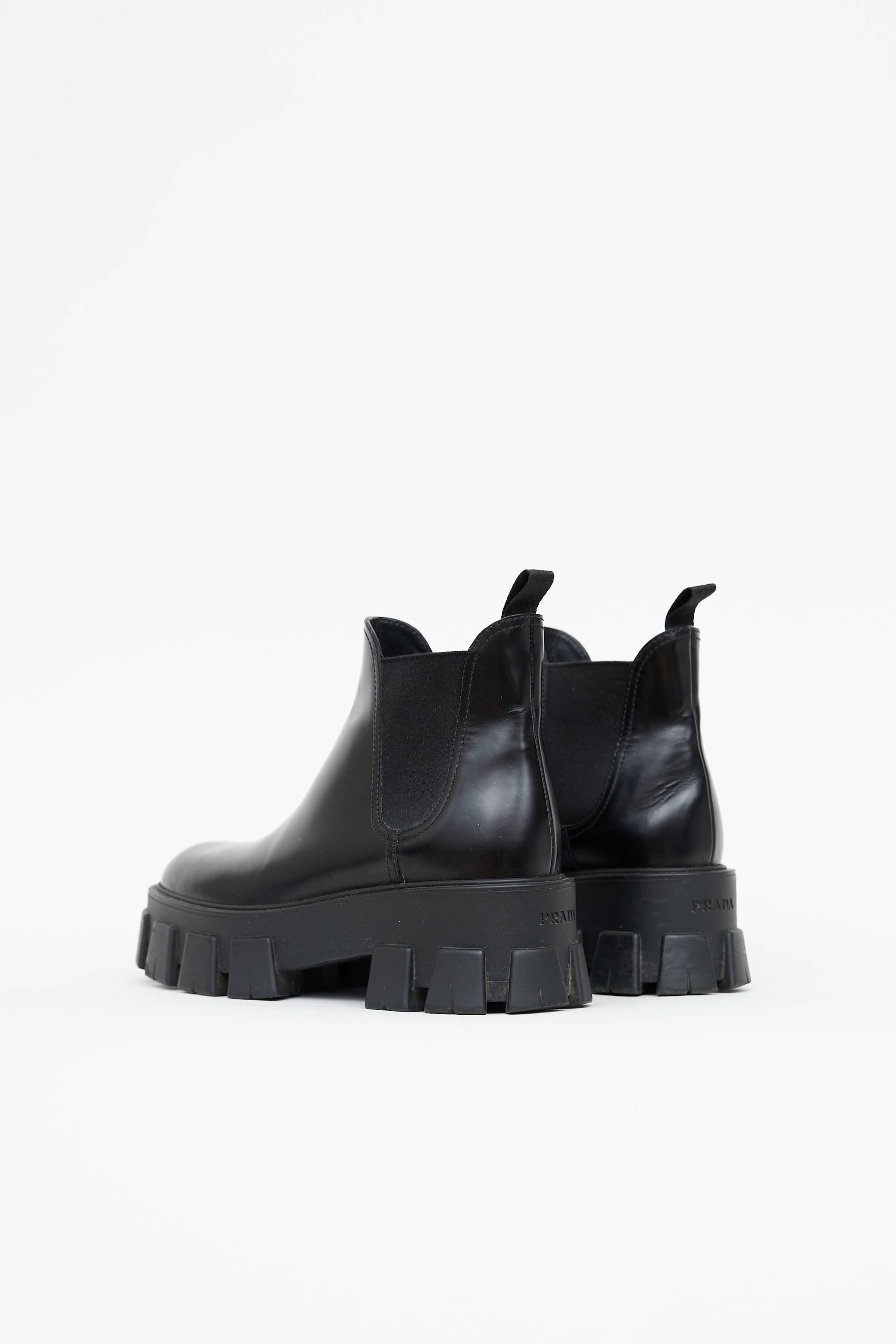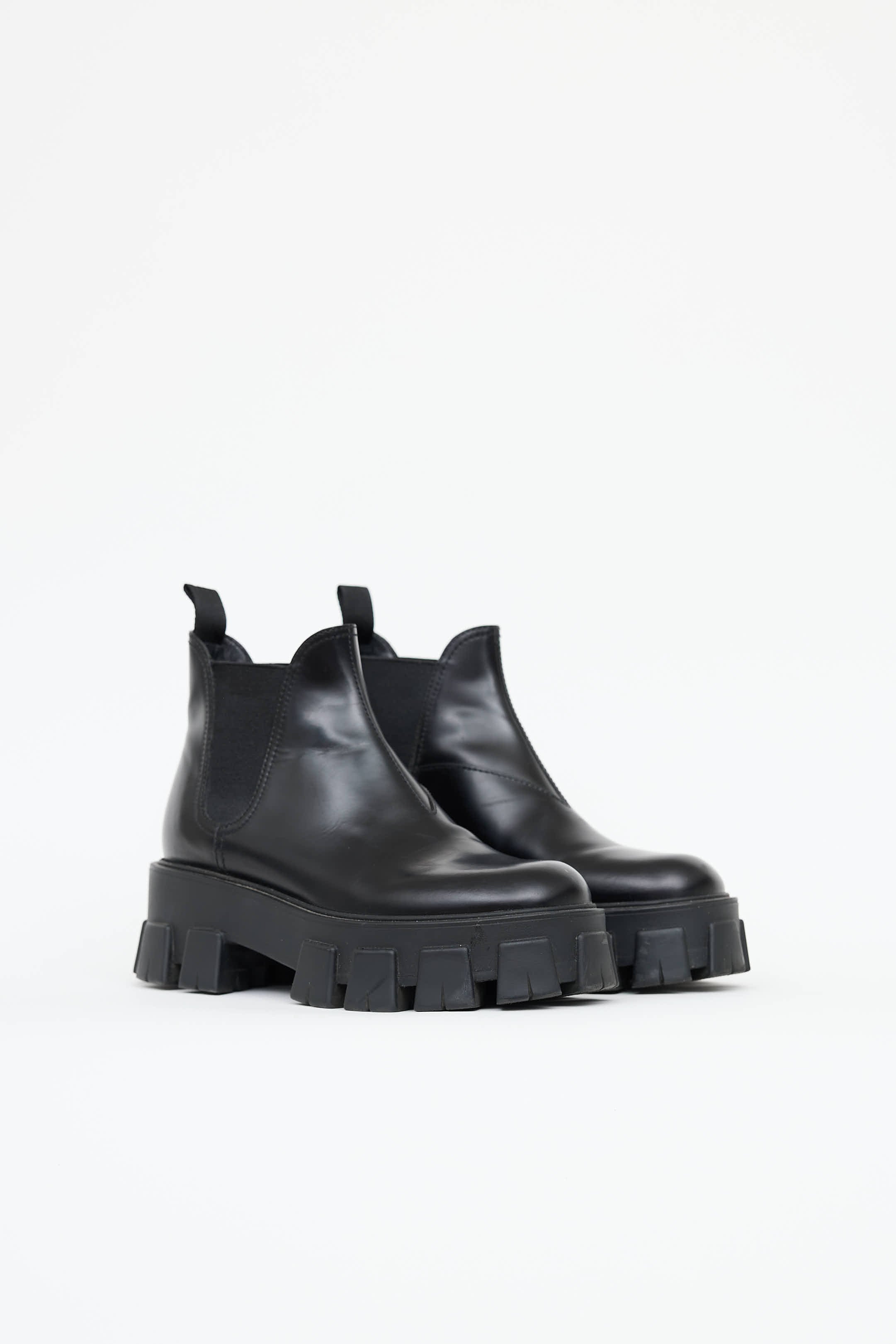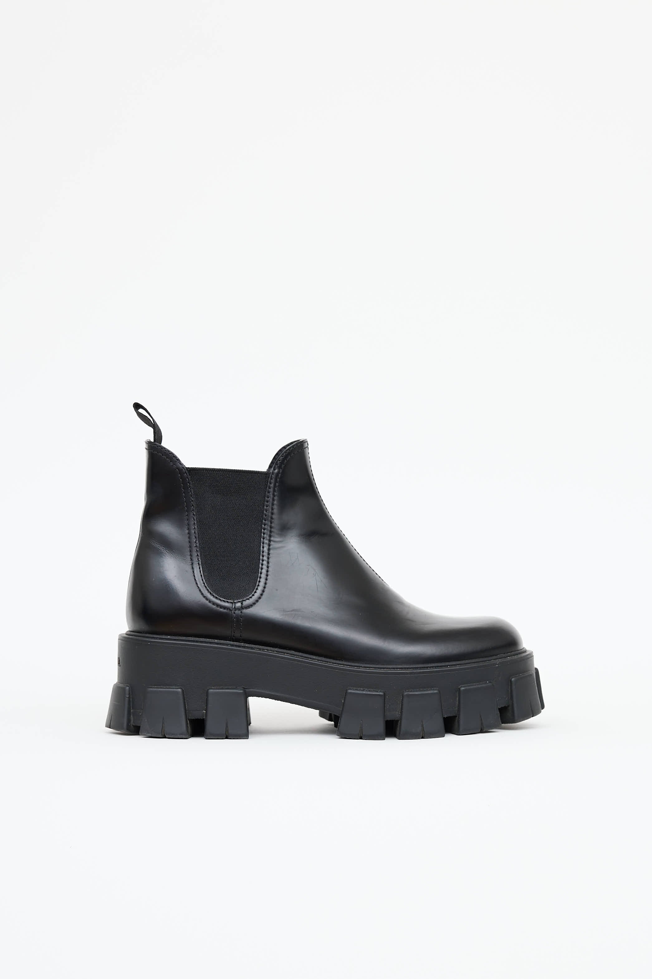 Pre-owned Prada black Monolith leather boots featuring a round toe, elasticated gussets at side, pull tab at ankle, center seam at vamp, embossed logo at counter, and platform lug sole.
