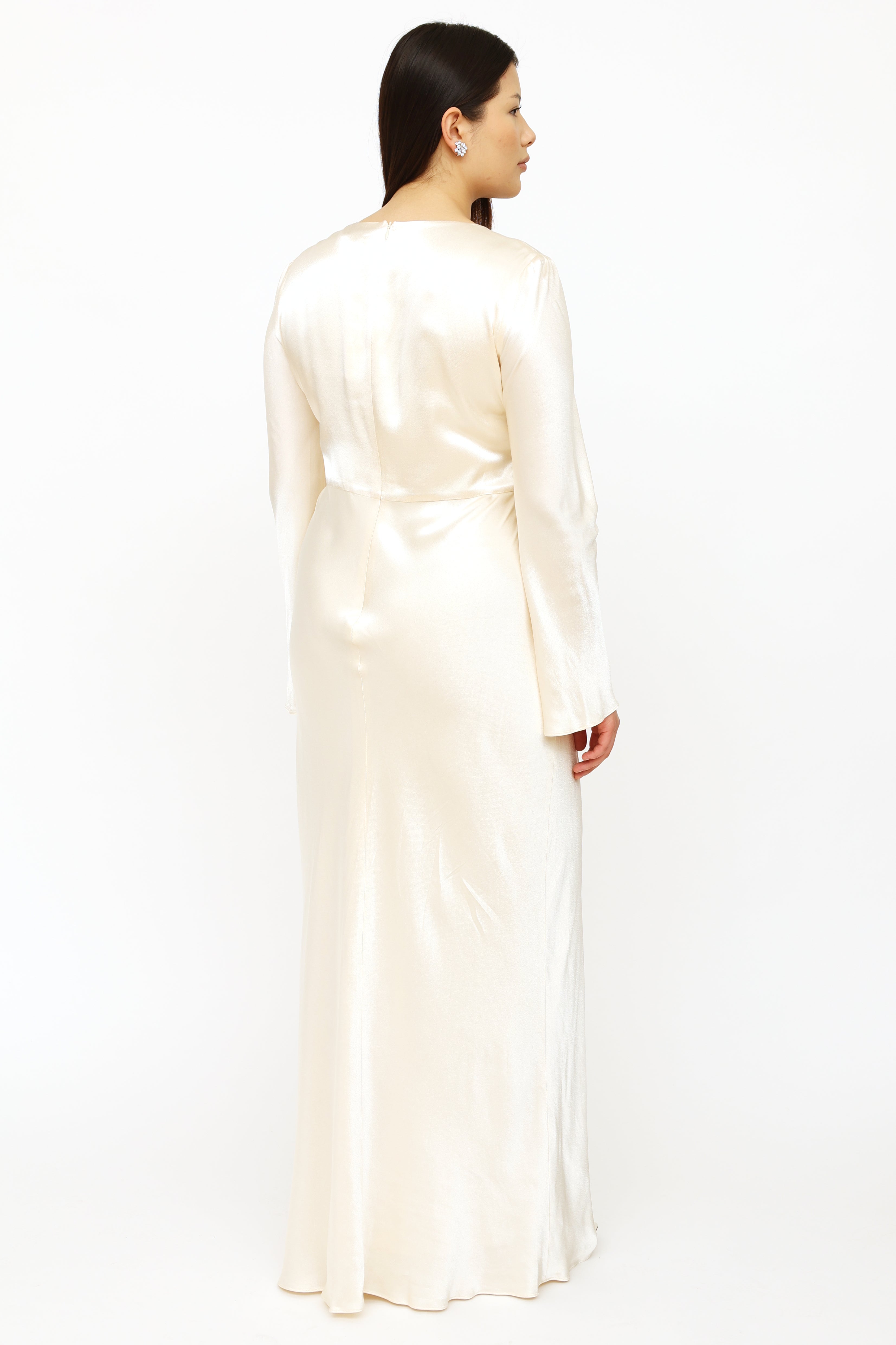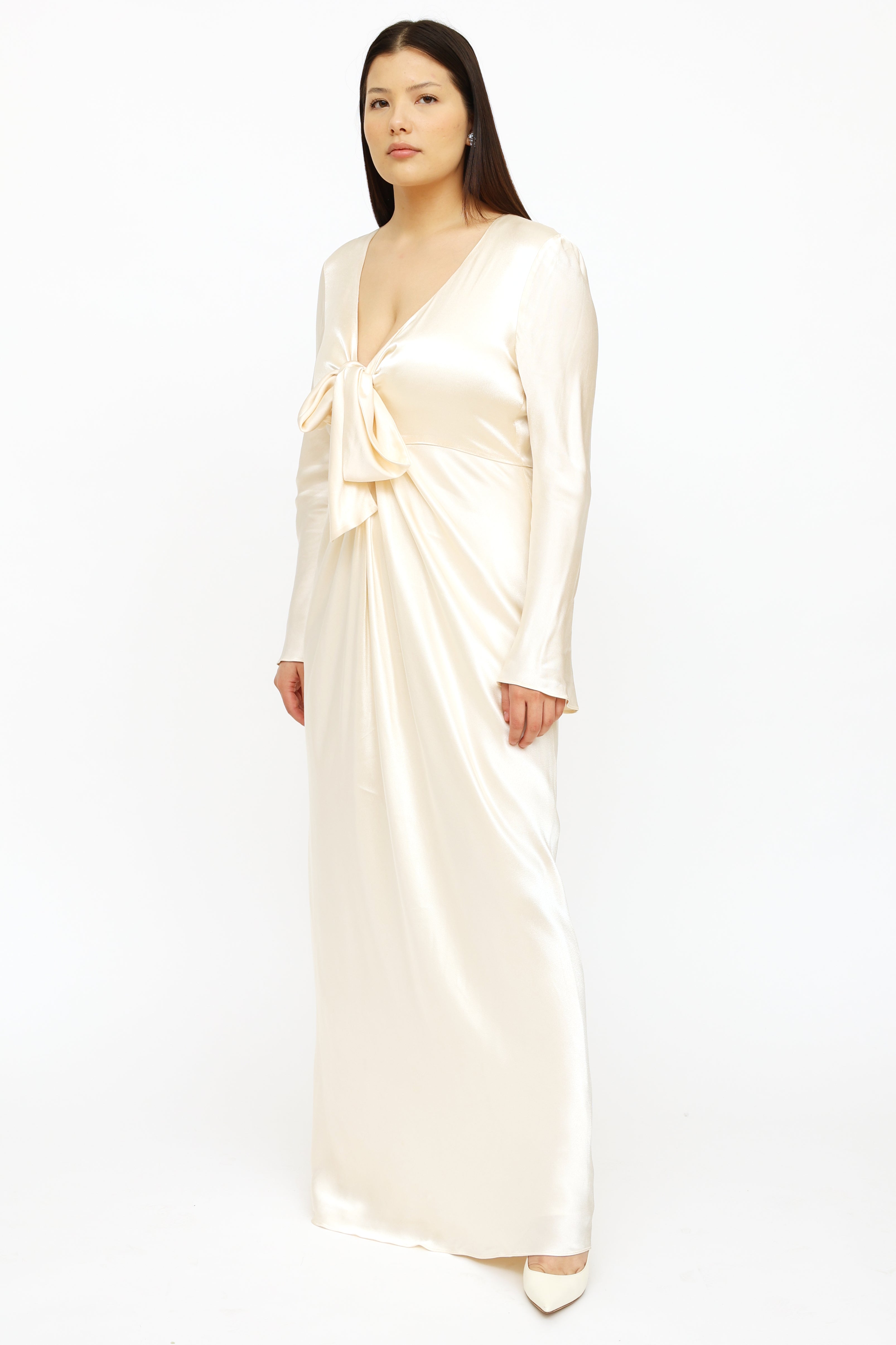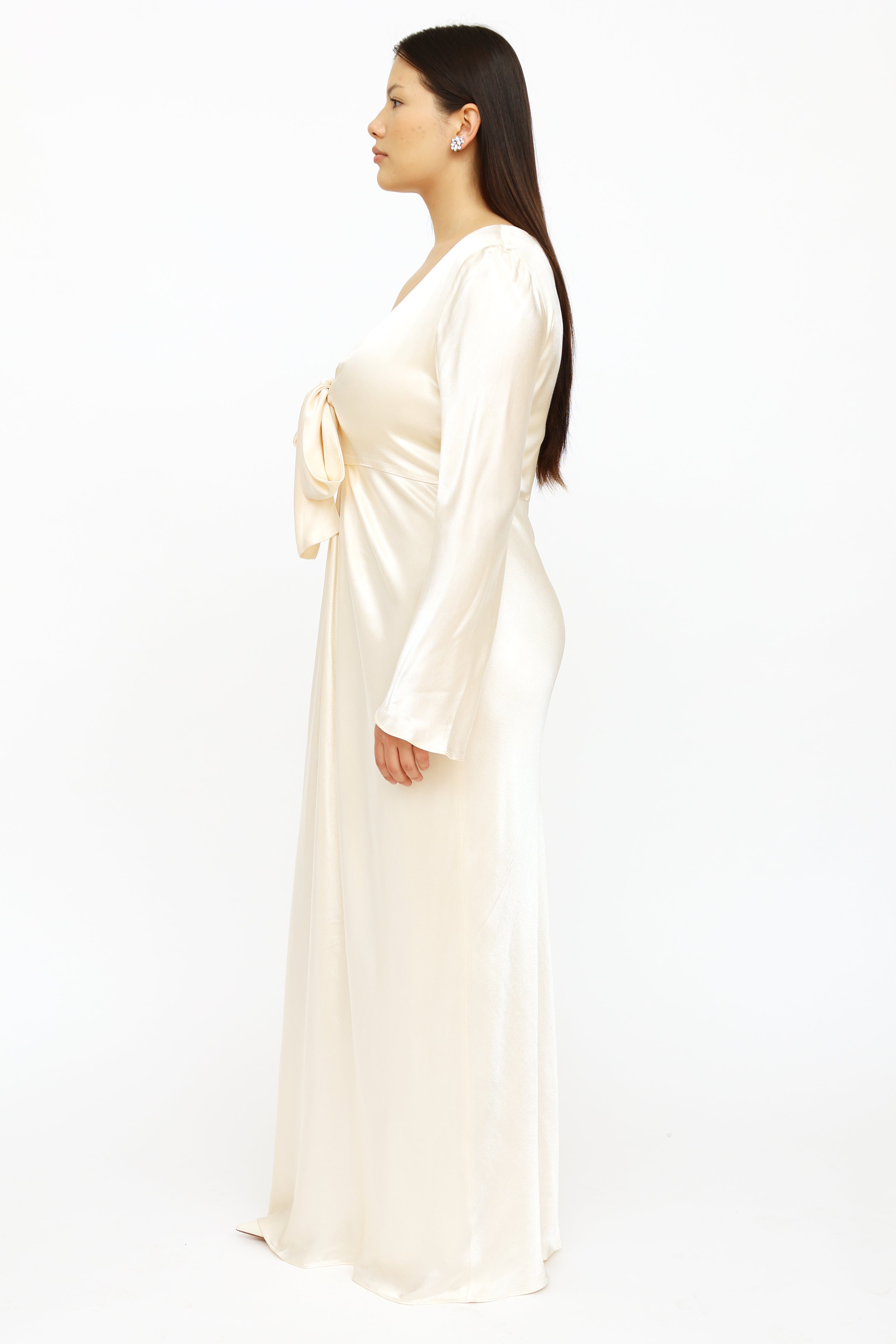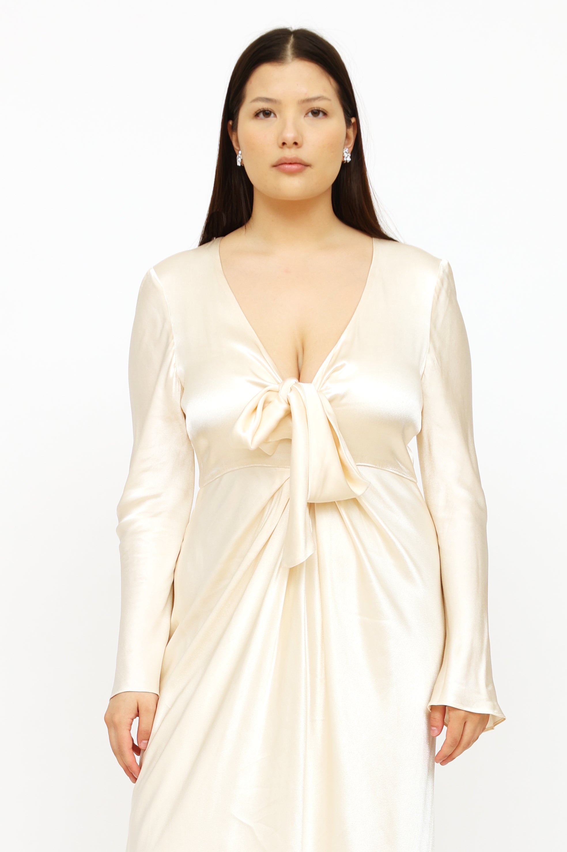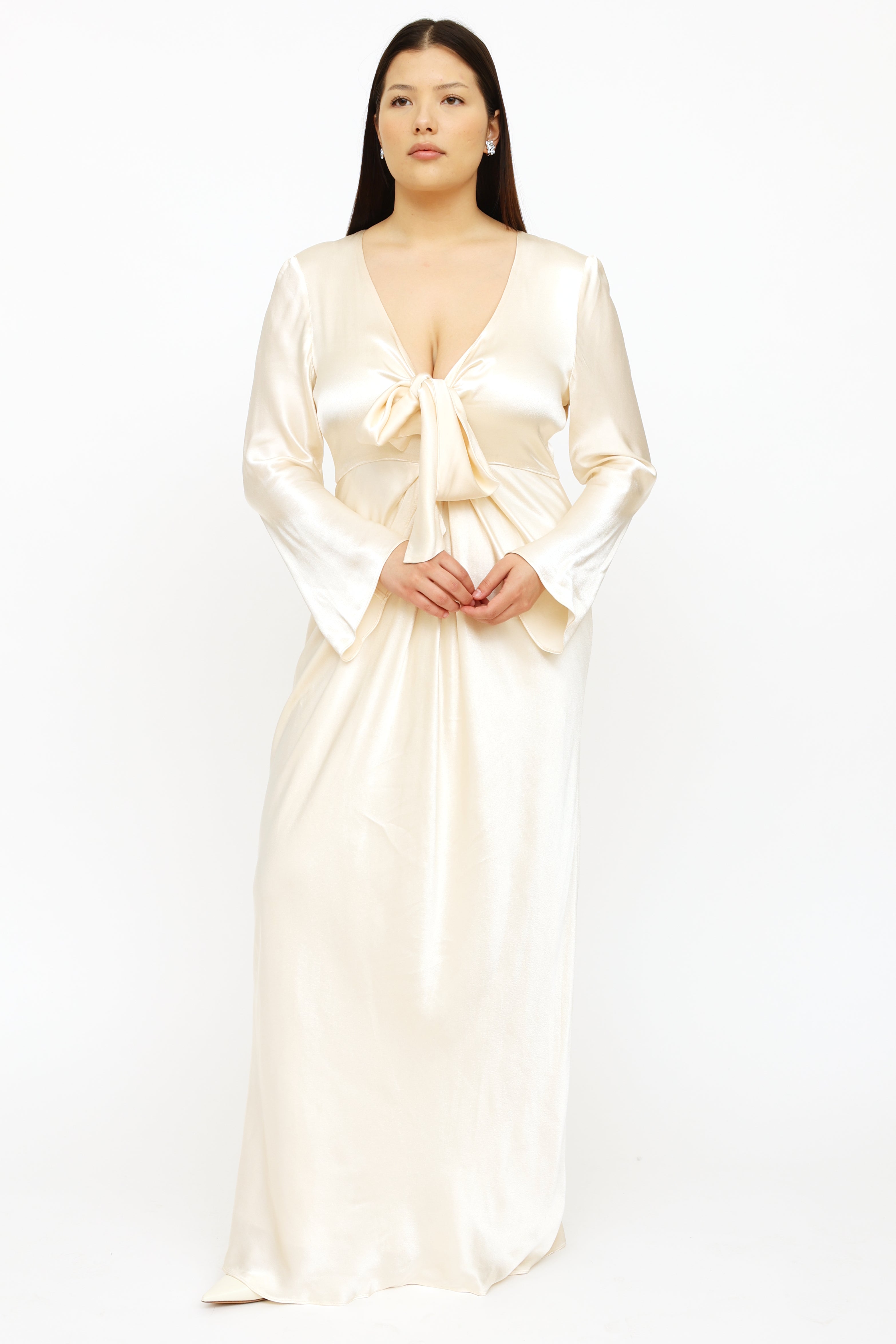 Shonajoy cream La Lune tie front gown featuring a plunging V-neck with tie closure at front, full length bell sleeves with gathered detailing on shoulder seams, pleated detailing on front waist band and zip closure at centre back. Partially lined.