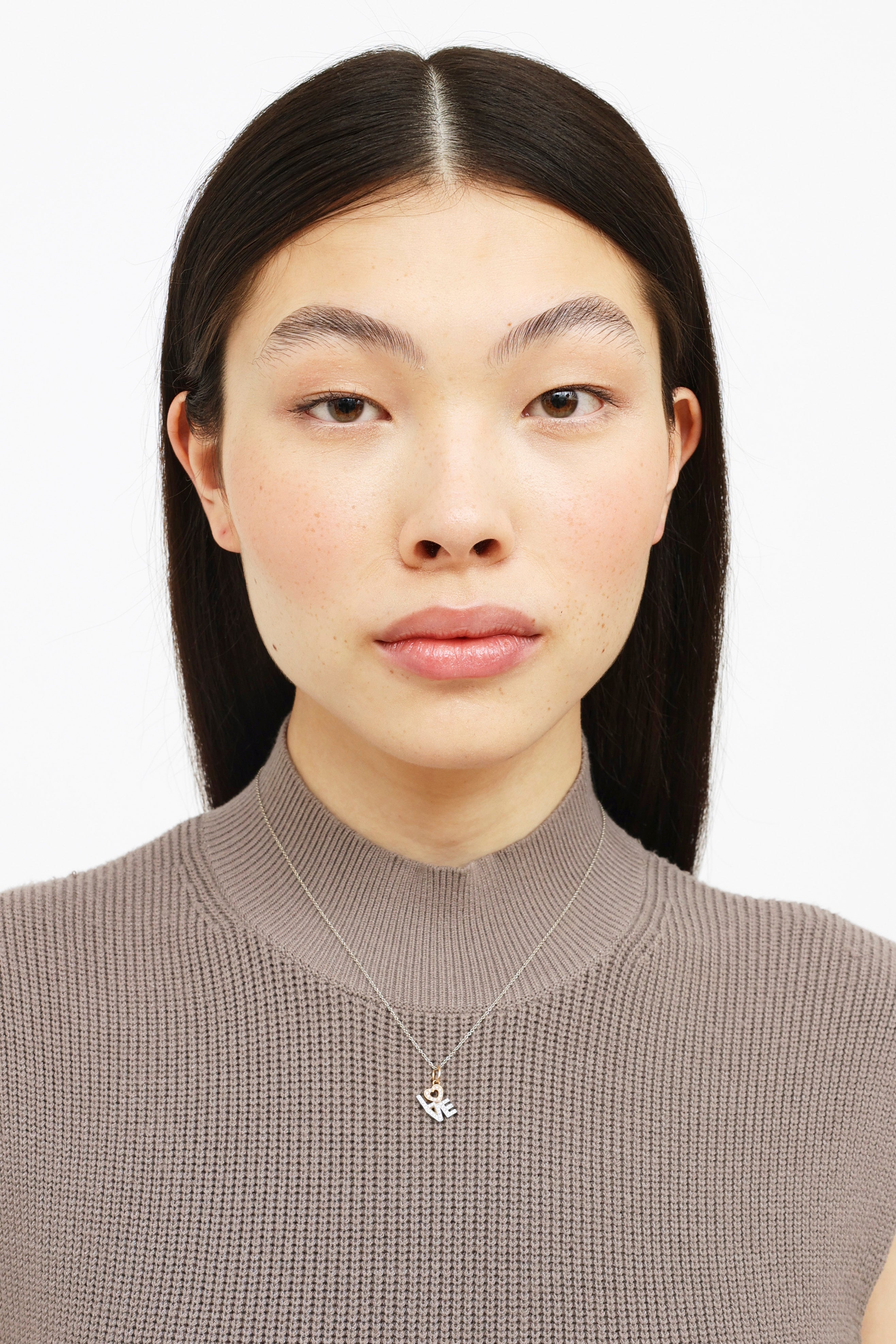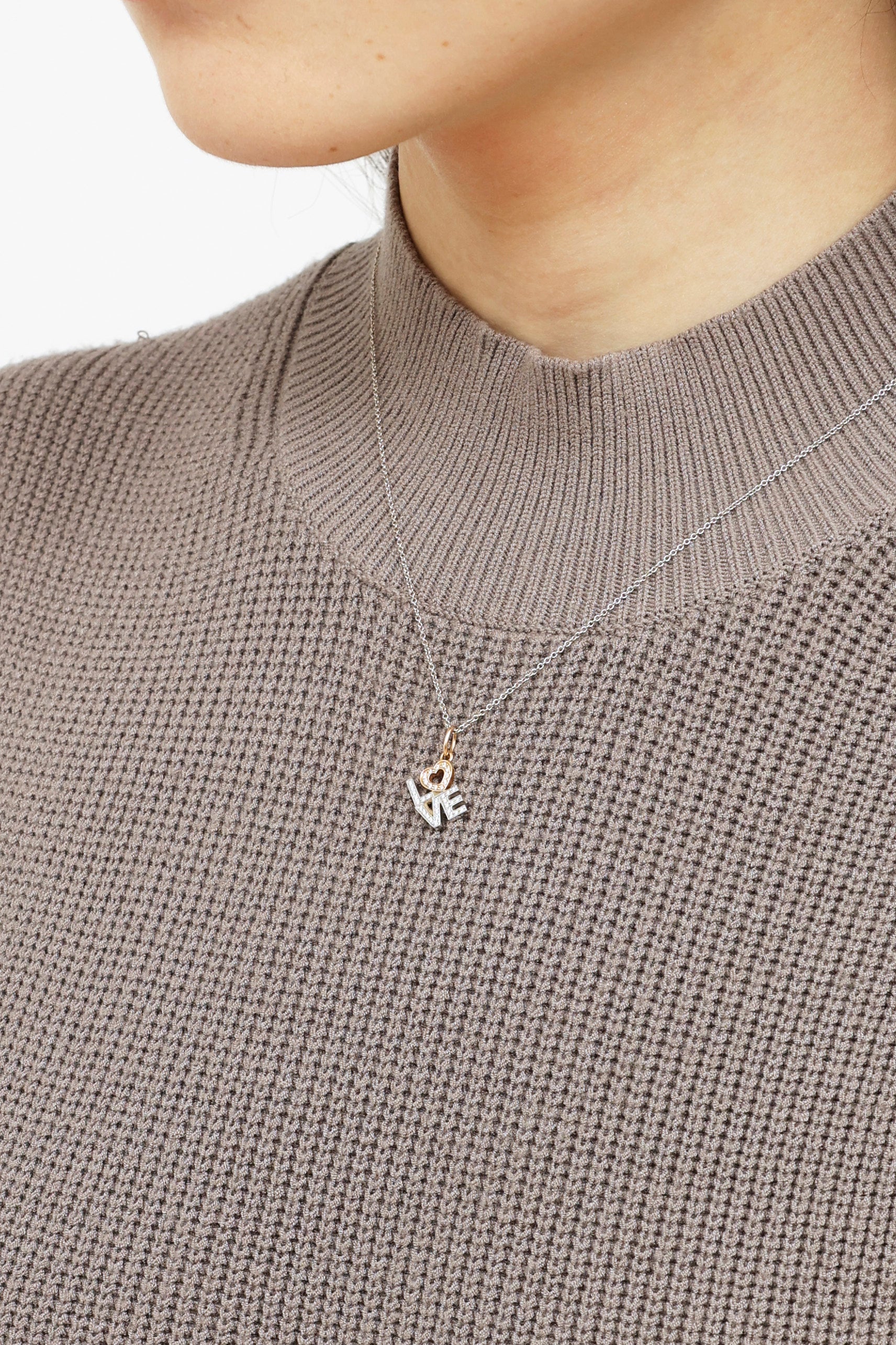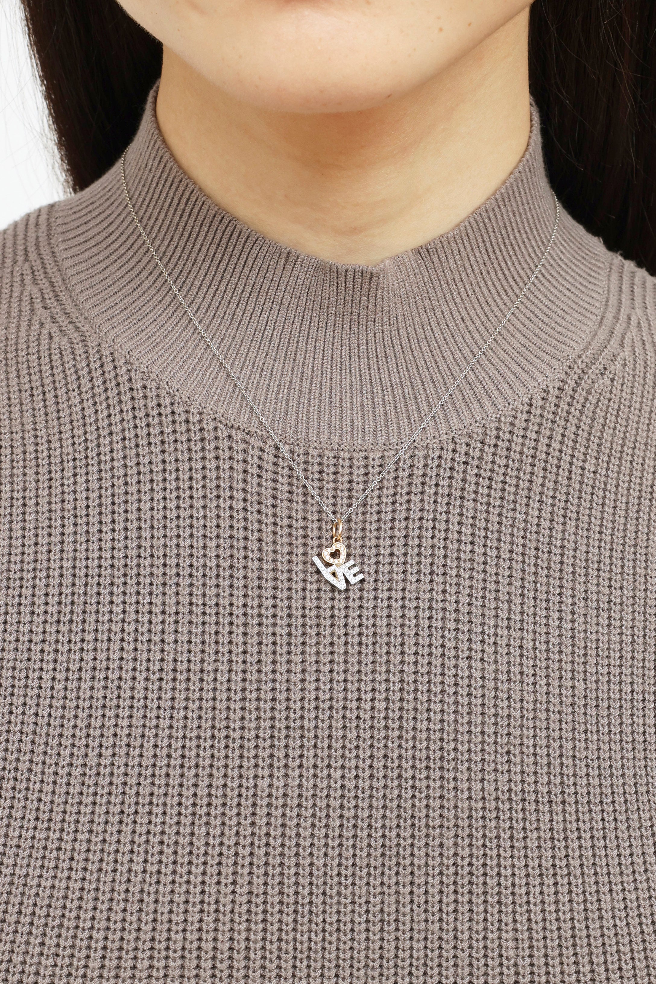 Pre-owned Tiffany & Co 18K gold love necklace featuring cable chain in 18k white gold, bead set style, 18K white and yellow gold "LOVE" pendant with round brilliant cut diamonds and ring clasp closure. Necklace is stamped with "TIFFANY & CO" and "AU750", pendant is stamped with "T & Co", "AU750" and "ITALY".