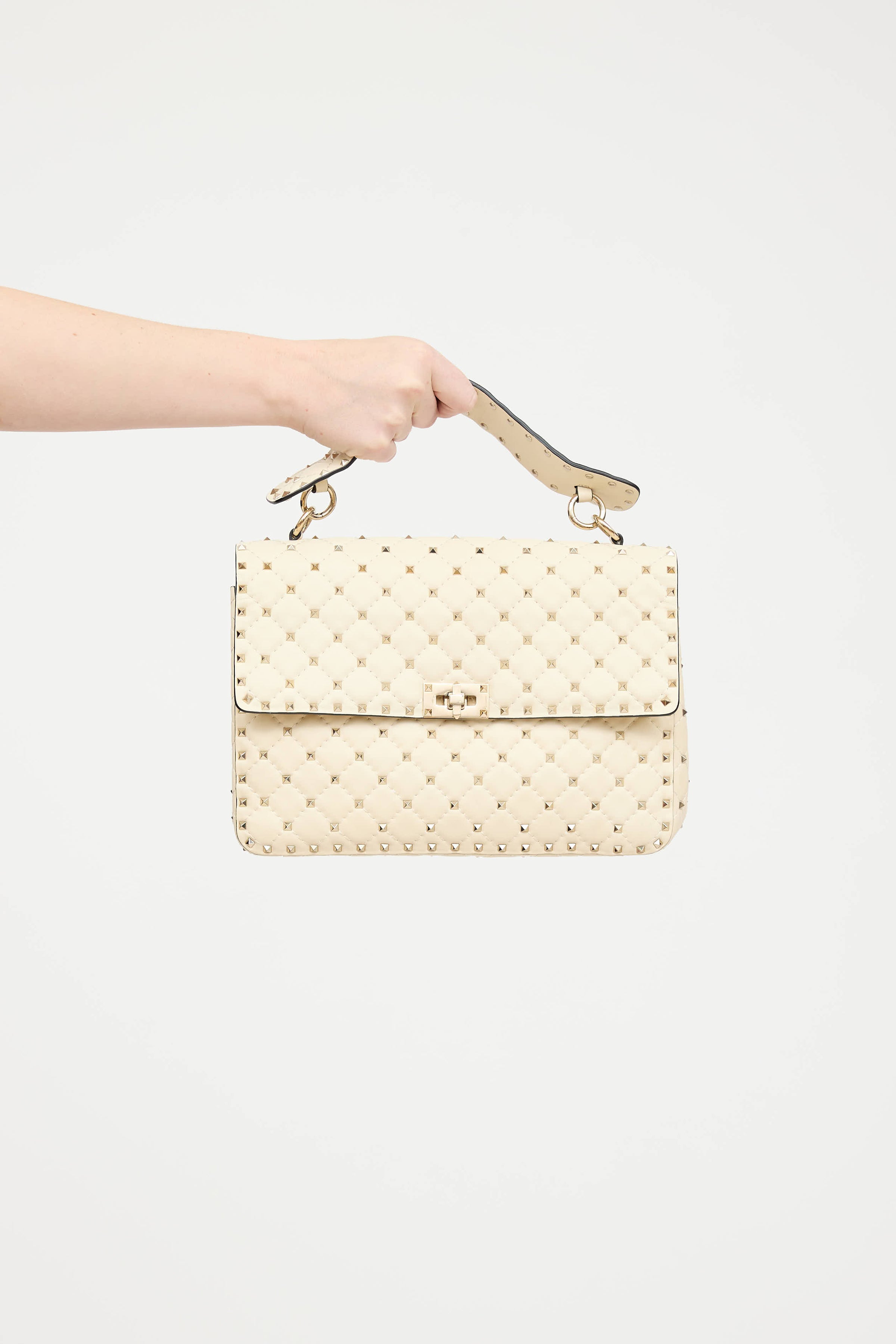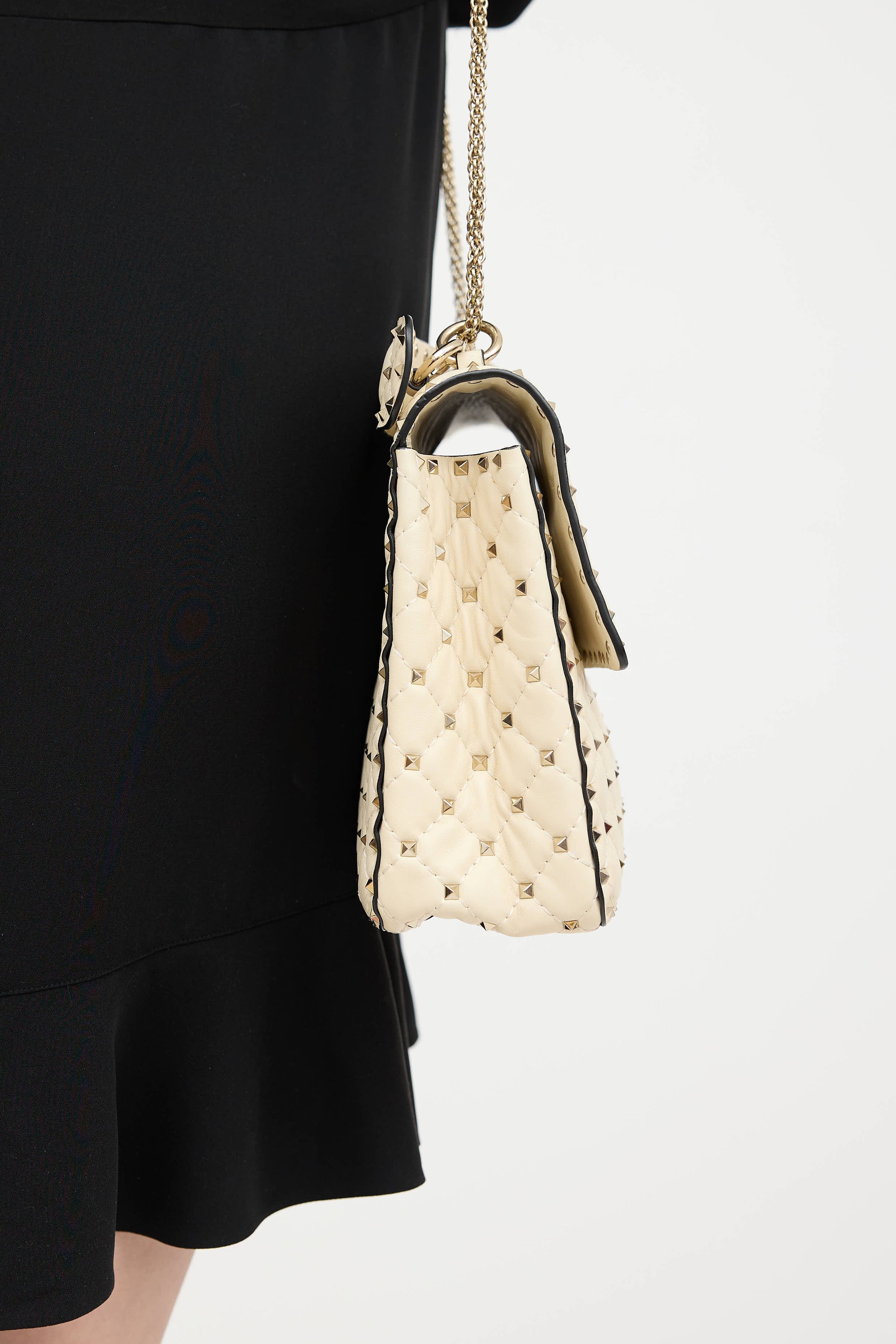 Pre-owned Valentino Spike leather cream bag featuring quilted upper with silver tone rockstud spikes throughout, detachable chain link crossbody strap, flat top handle, top flap with turnlock closure, and one main compartment with zip pocket.
