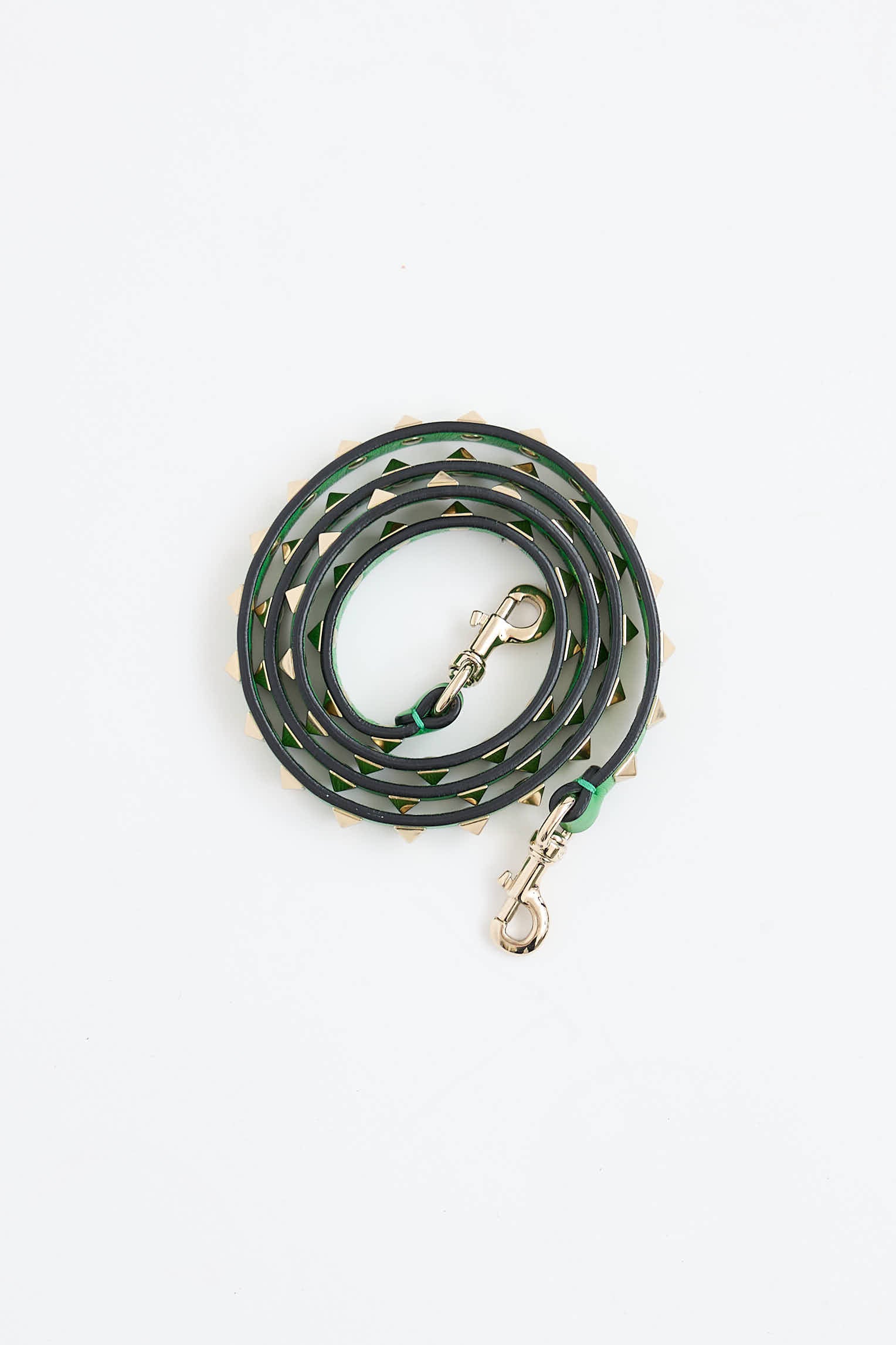 Pre-owned Valentino green rockstud Trapeze bag featuring dual rolled top handles, silver tone hardware and rockstuds, structured base, top zip with hinge closure, one main compartment with one zip pocket, and two slip pockets.