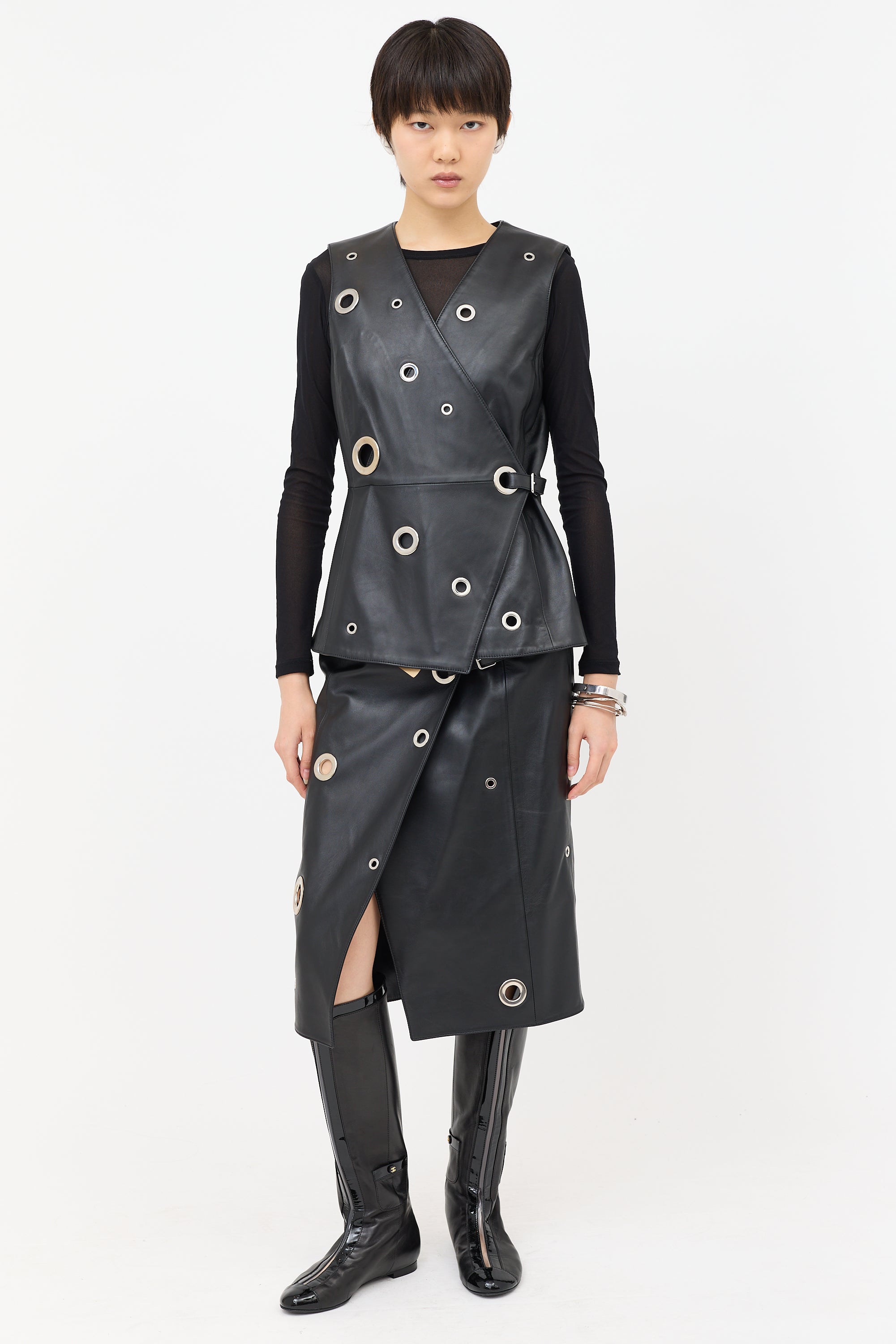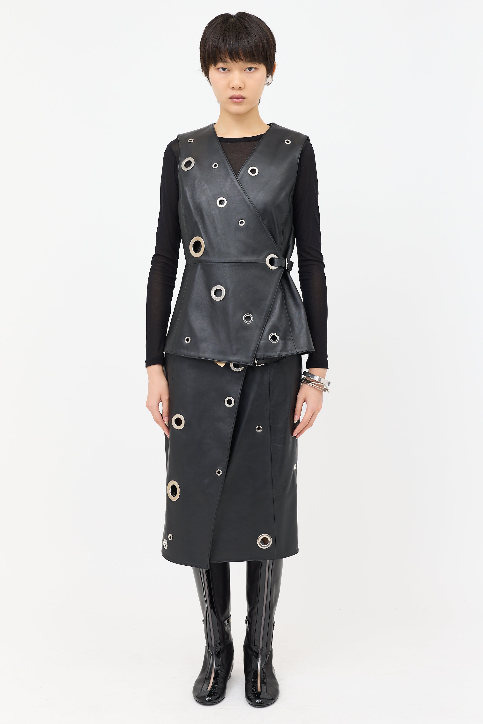 Altuzarra black leather vest featuring a V-neckline, wrap front design with interior button fastening, adjustable buckle fastening at left side, and silver tone grommet hardware throughout.