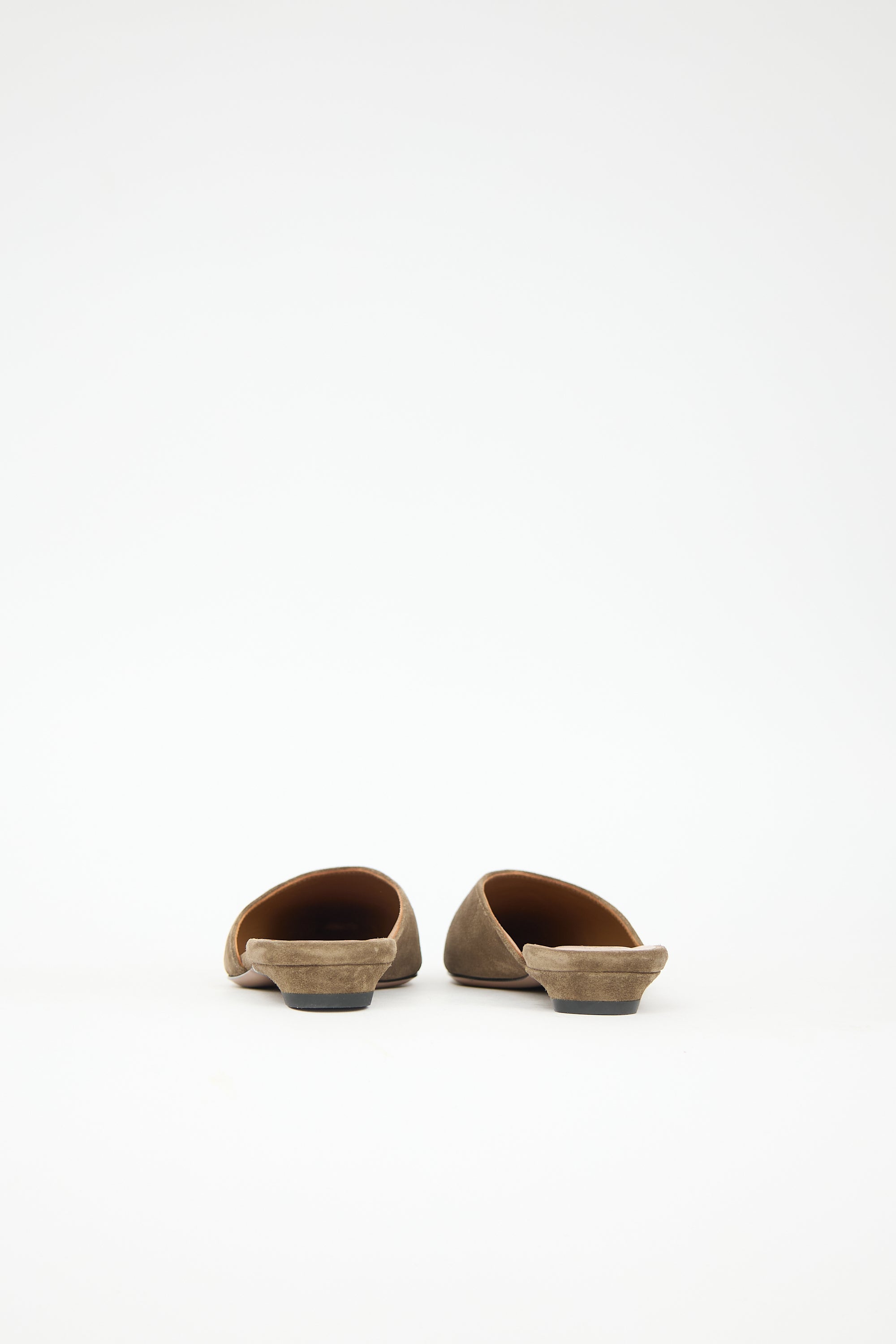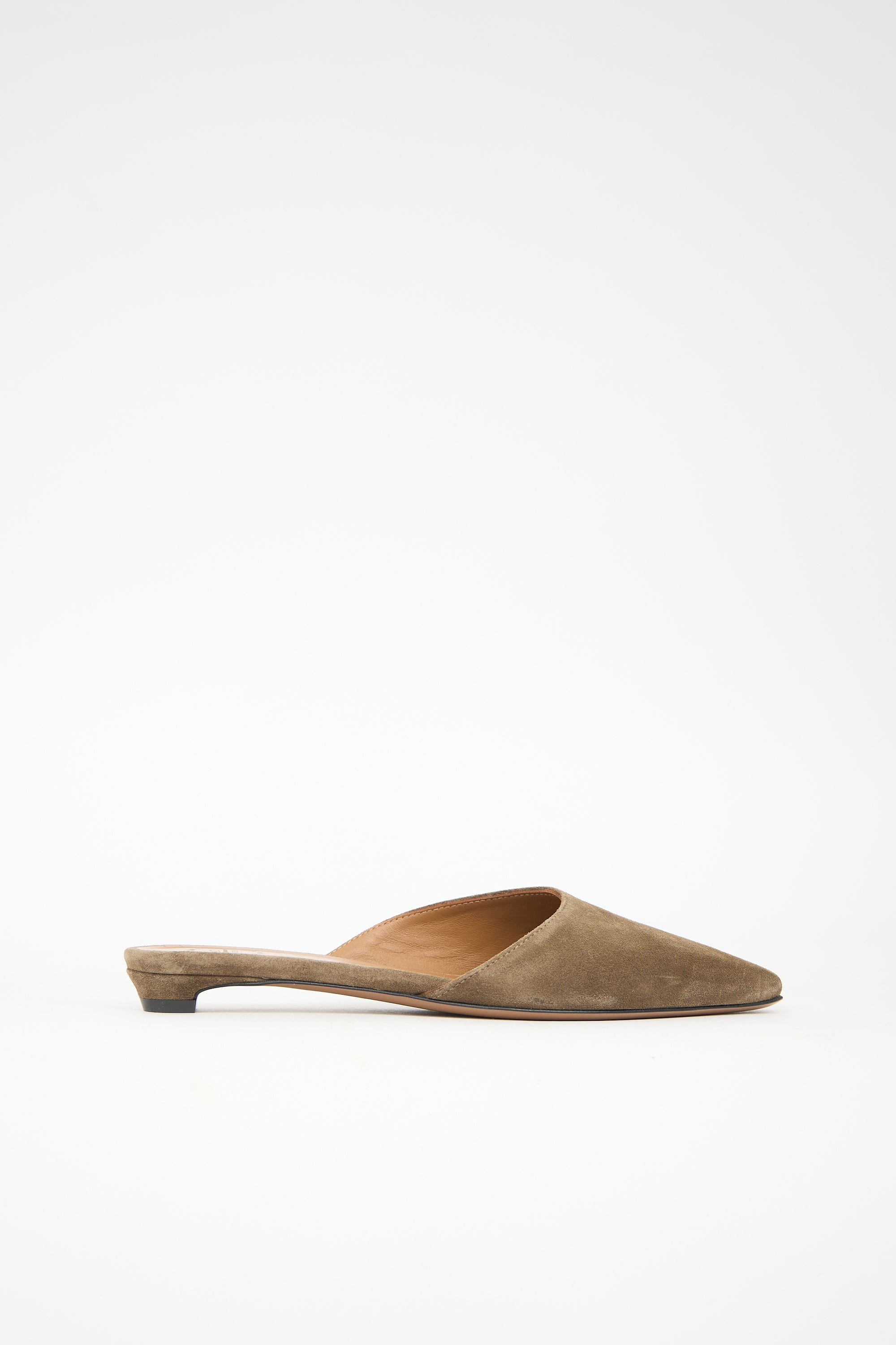 Pre-owned ATP Atelier khaki green suede Fioli mules featuring almond toe, short covered kitten heel, and leather insole and outsole.