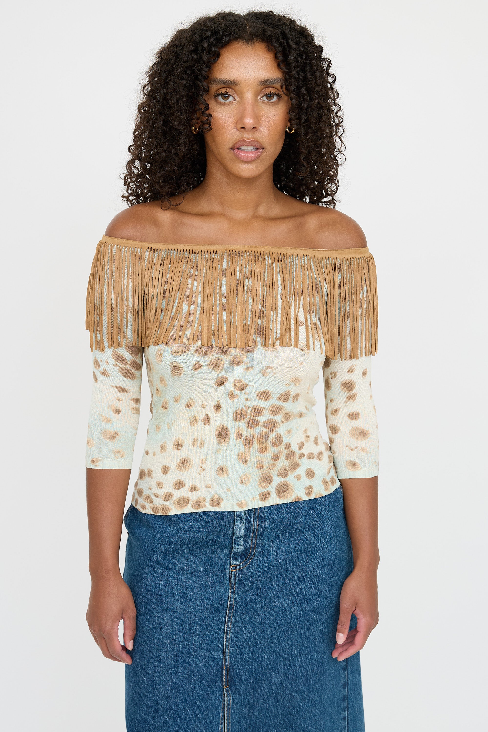Pre-owned Blumarine brown and blue off shoulder top featuring scoop neckline with fringe trim, three quarter sleeves, and dotted patterned throughout.