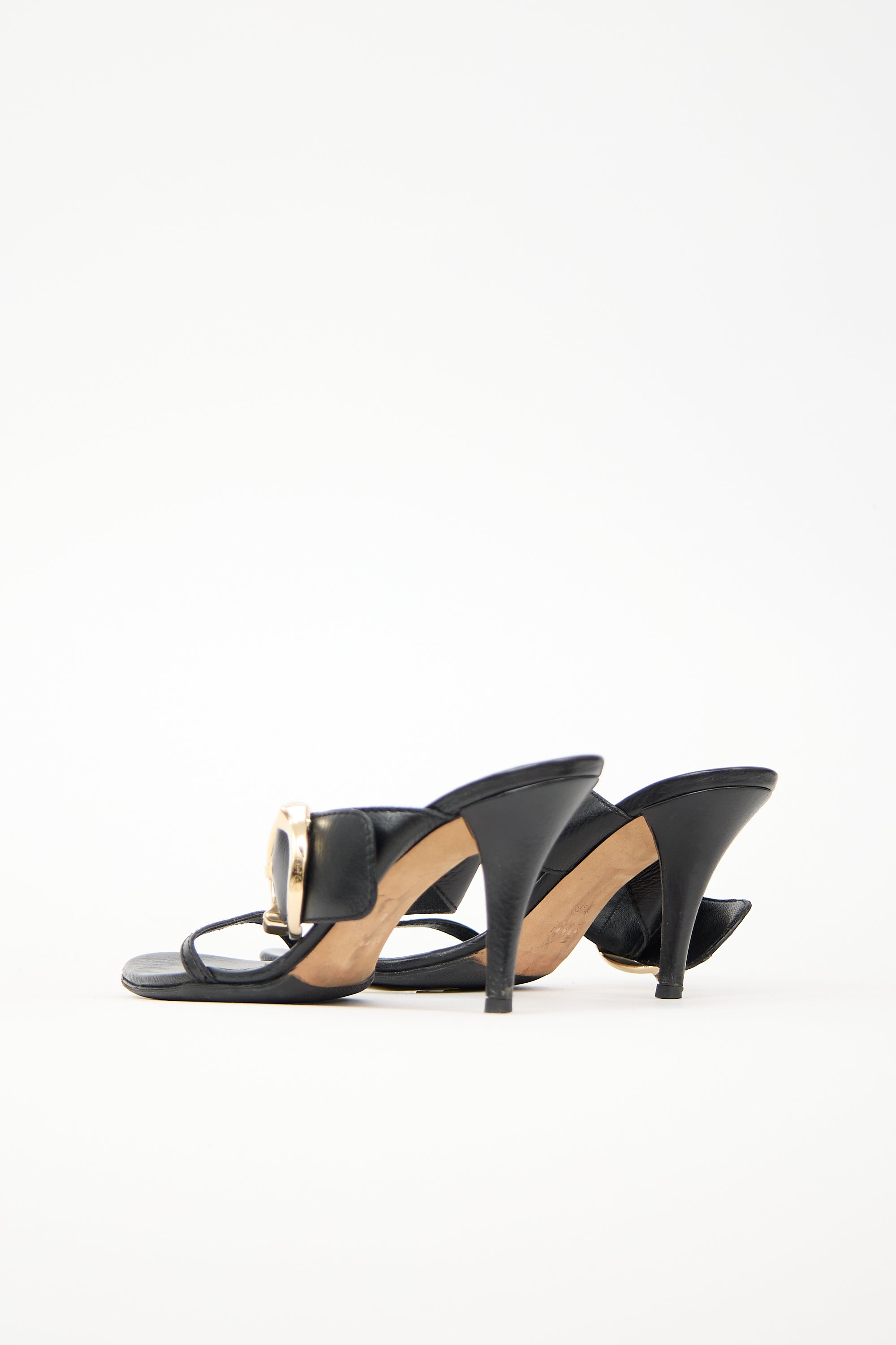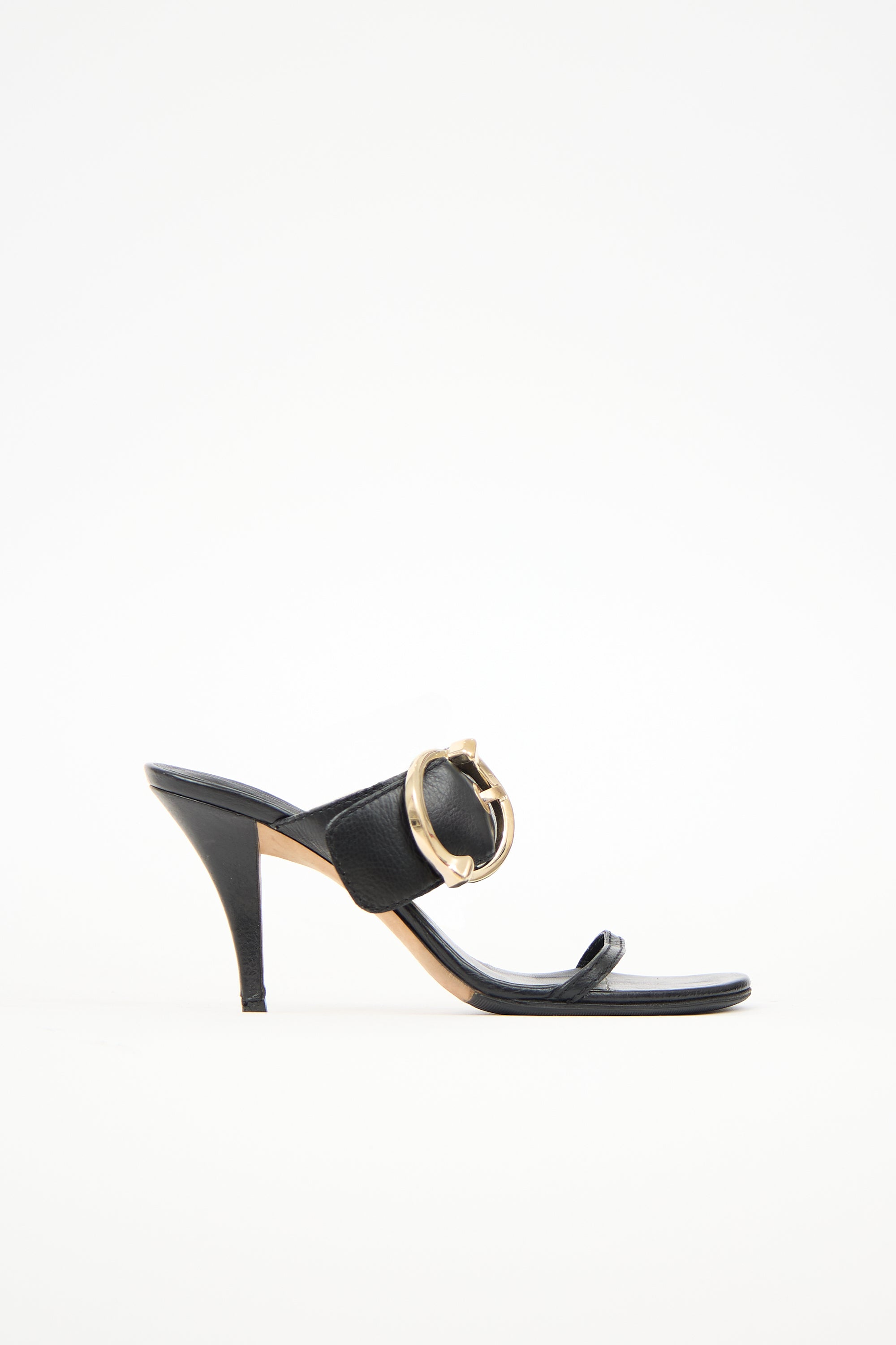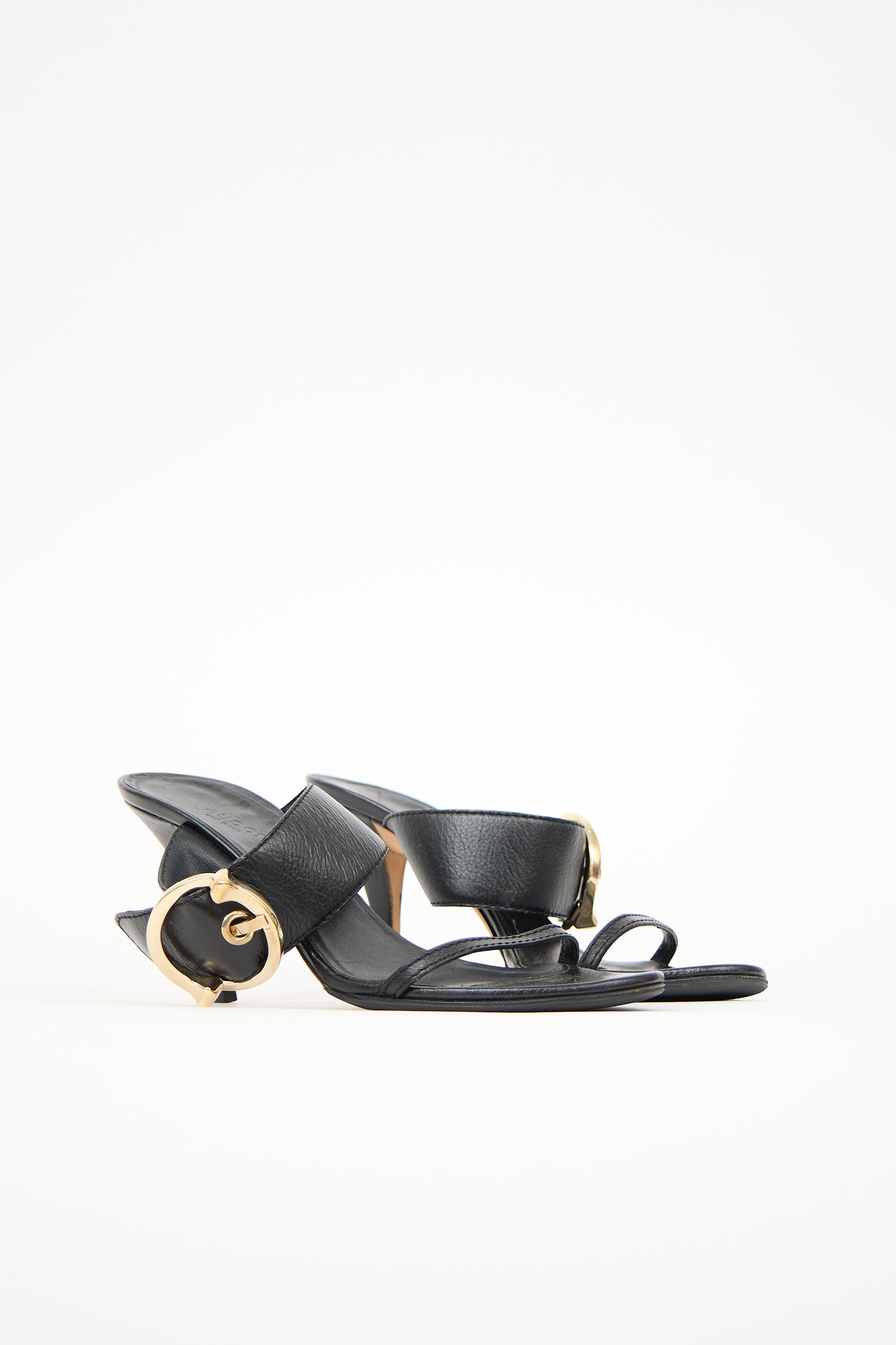 Pre-owned Gucci black leather sandals featuring rounded toe, thin vamp strap, wide instep strap with circle buckle, and covered continental heel.