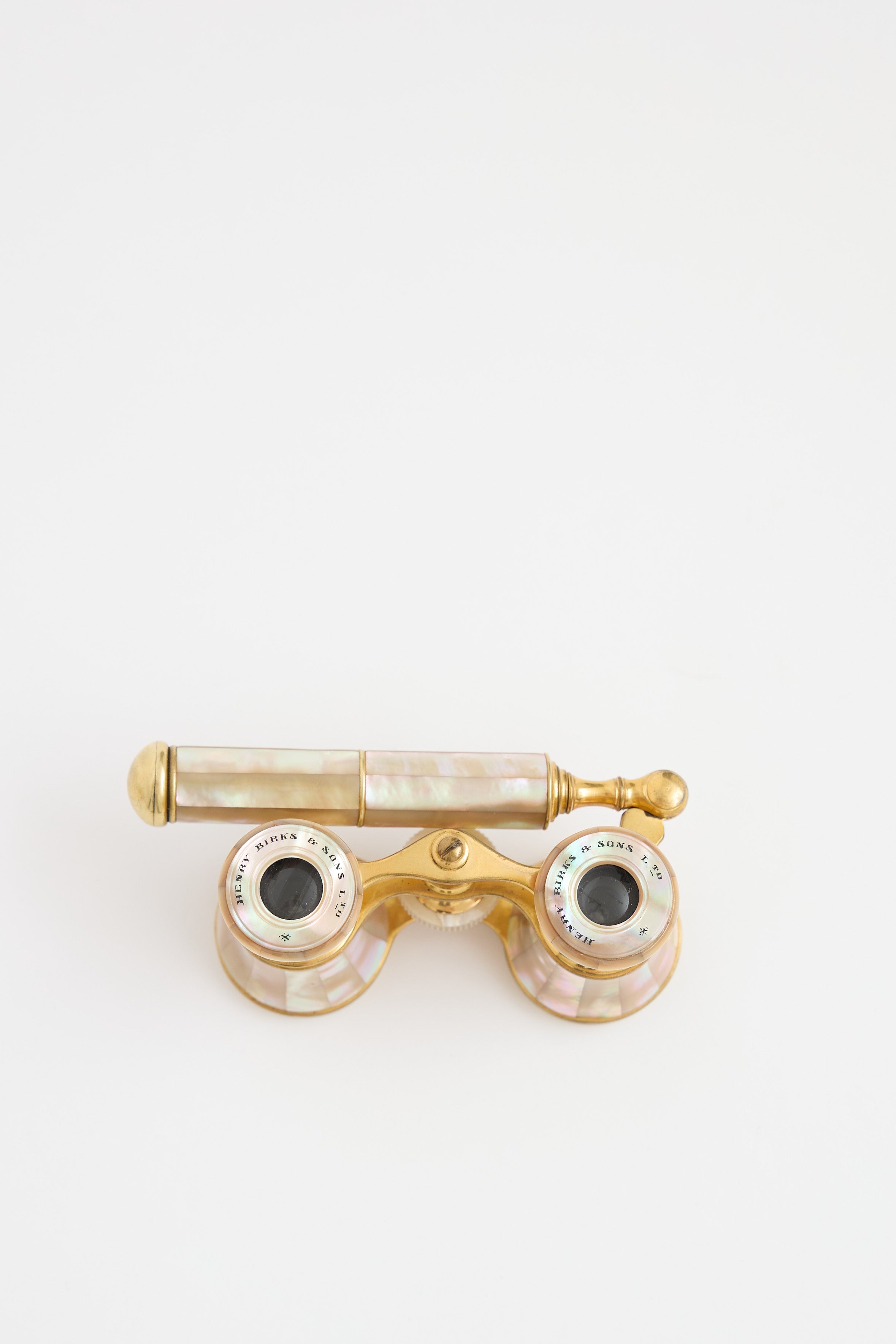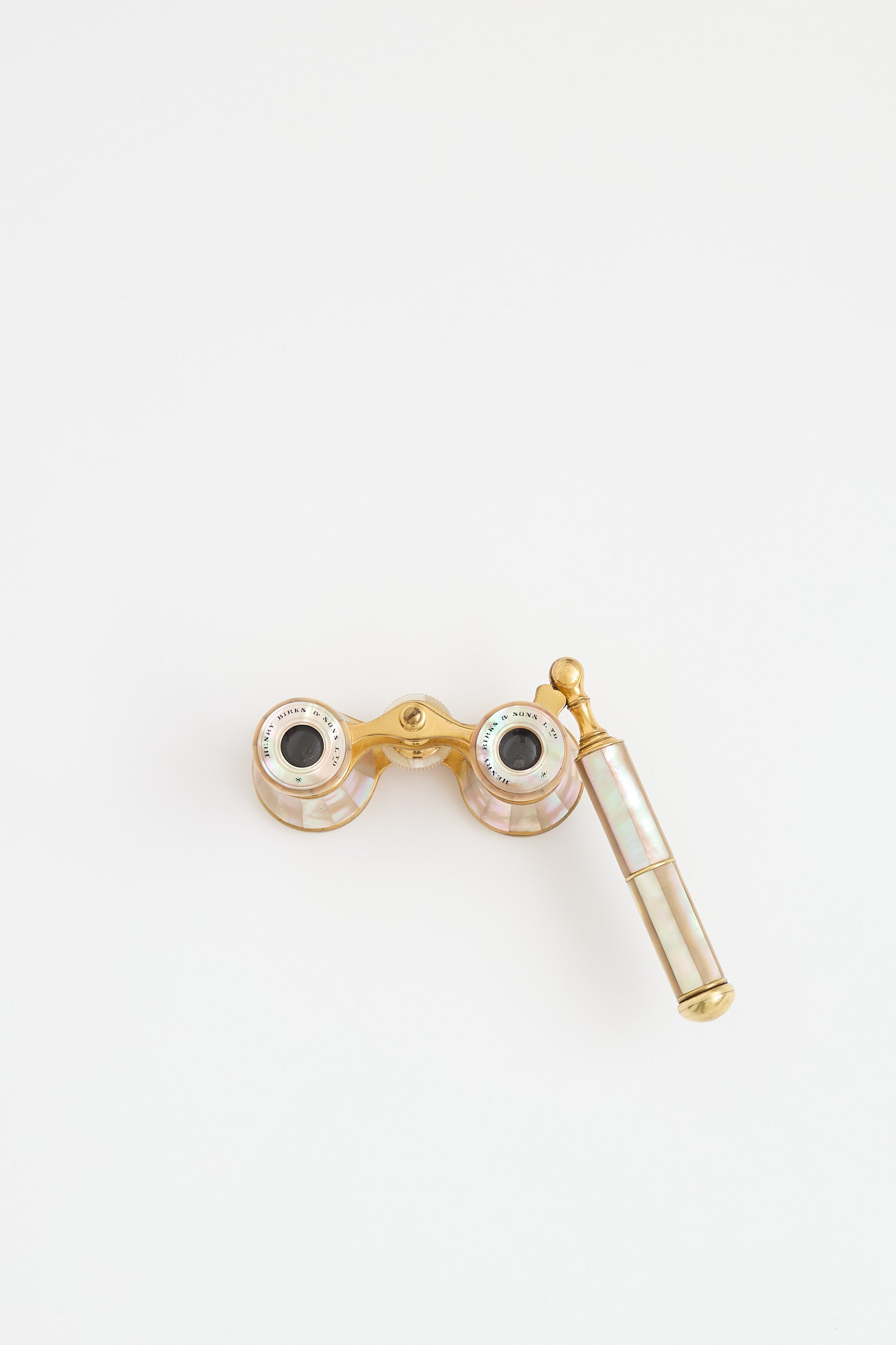 Pre-owned Henry Birks & Sons opera glasses featuring a gold tone base with Mother of Pearl accents throughout, foldable handle and adjustable focus dial.