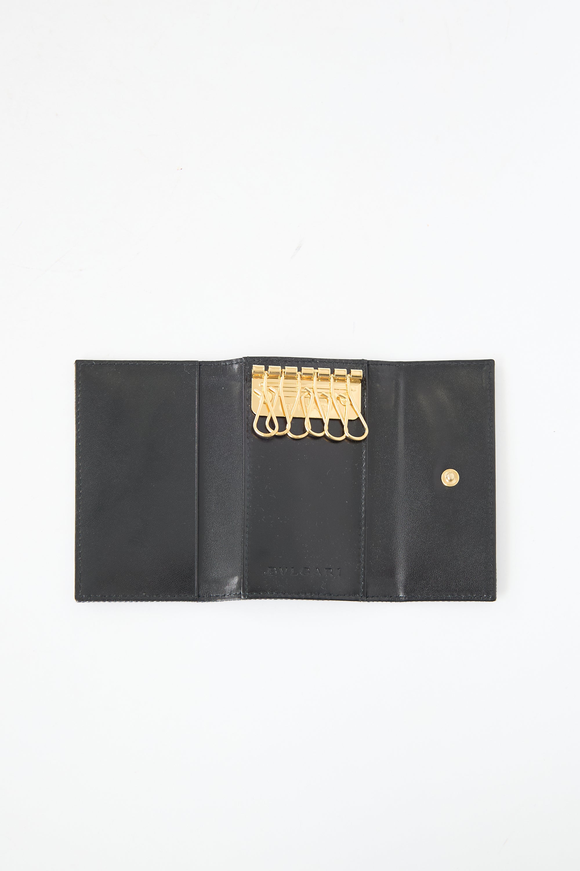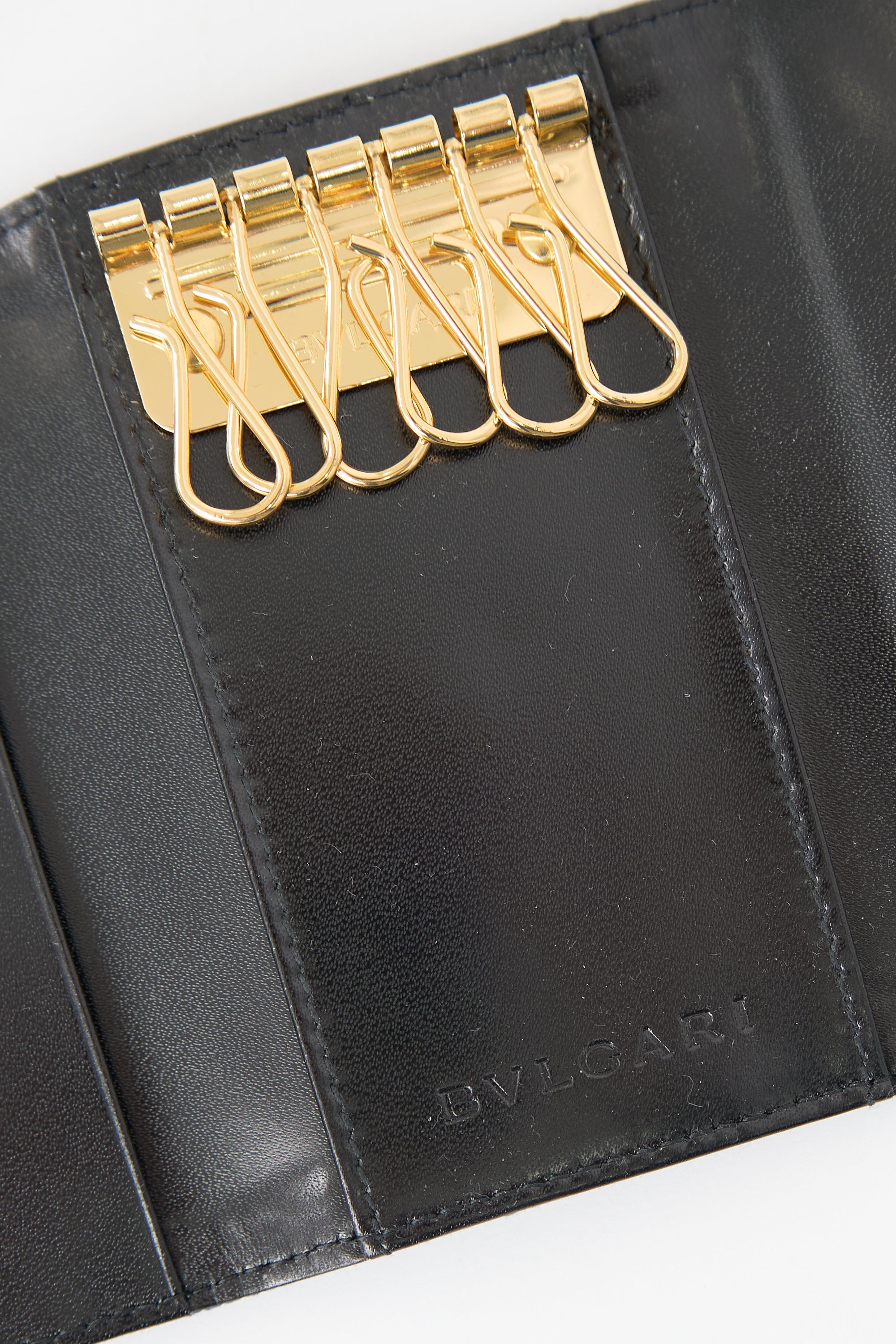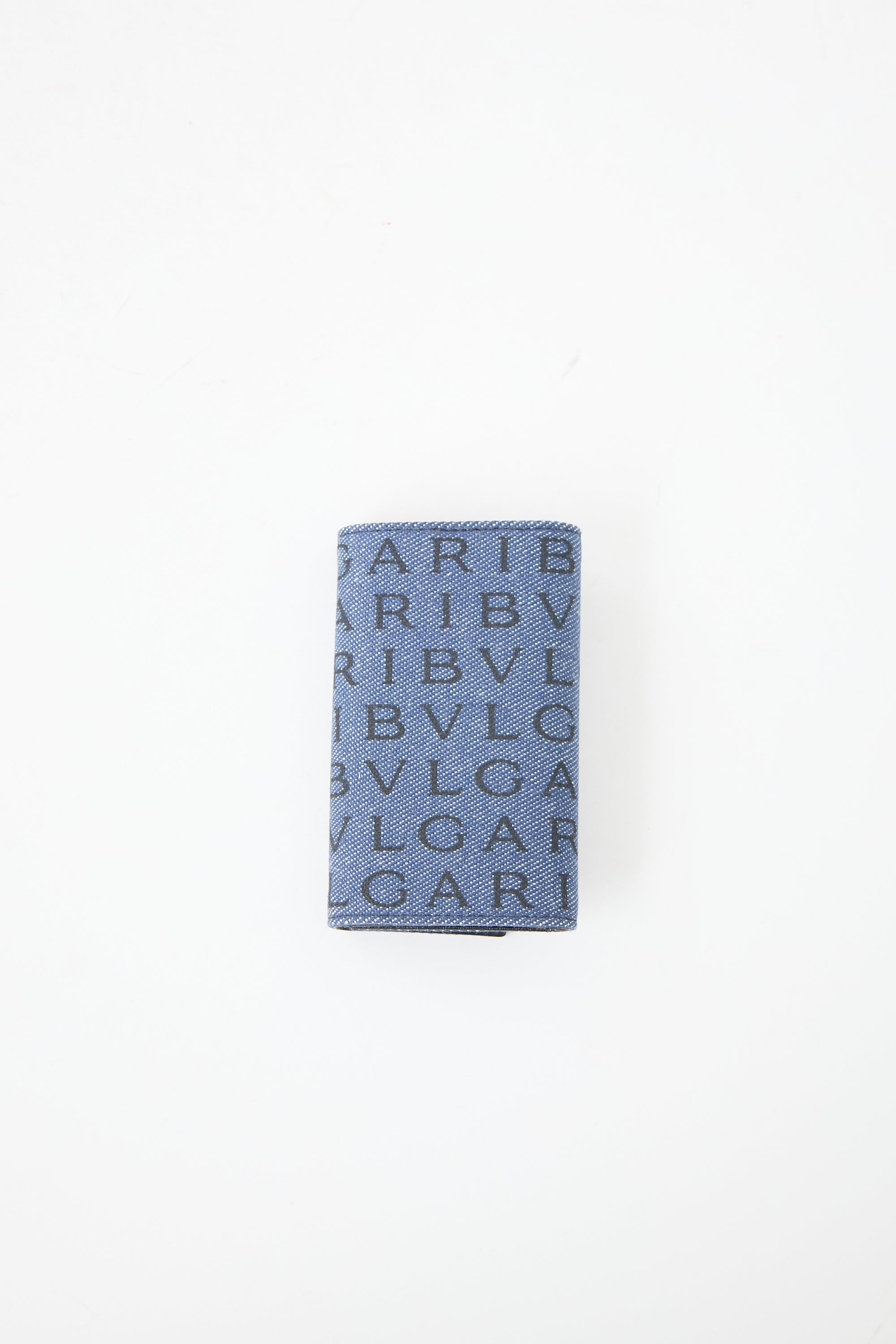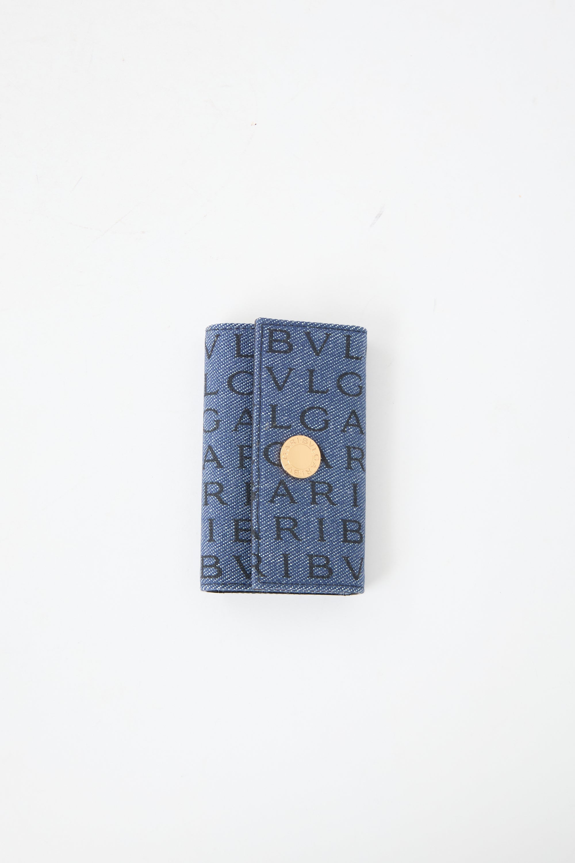 Pre-owned Bulgari blue denim key case featuring allover logo, gold tone hardware, front snap button closure with etched logo, and stamped logo, one card slot, and six key hooks at leather lined interior. Comes with original box.