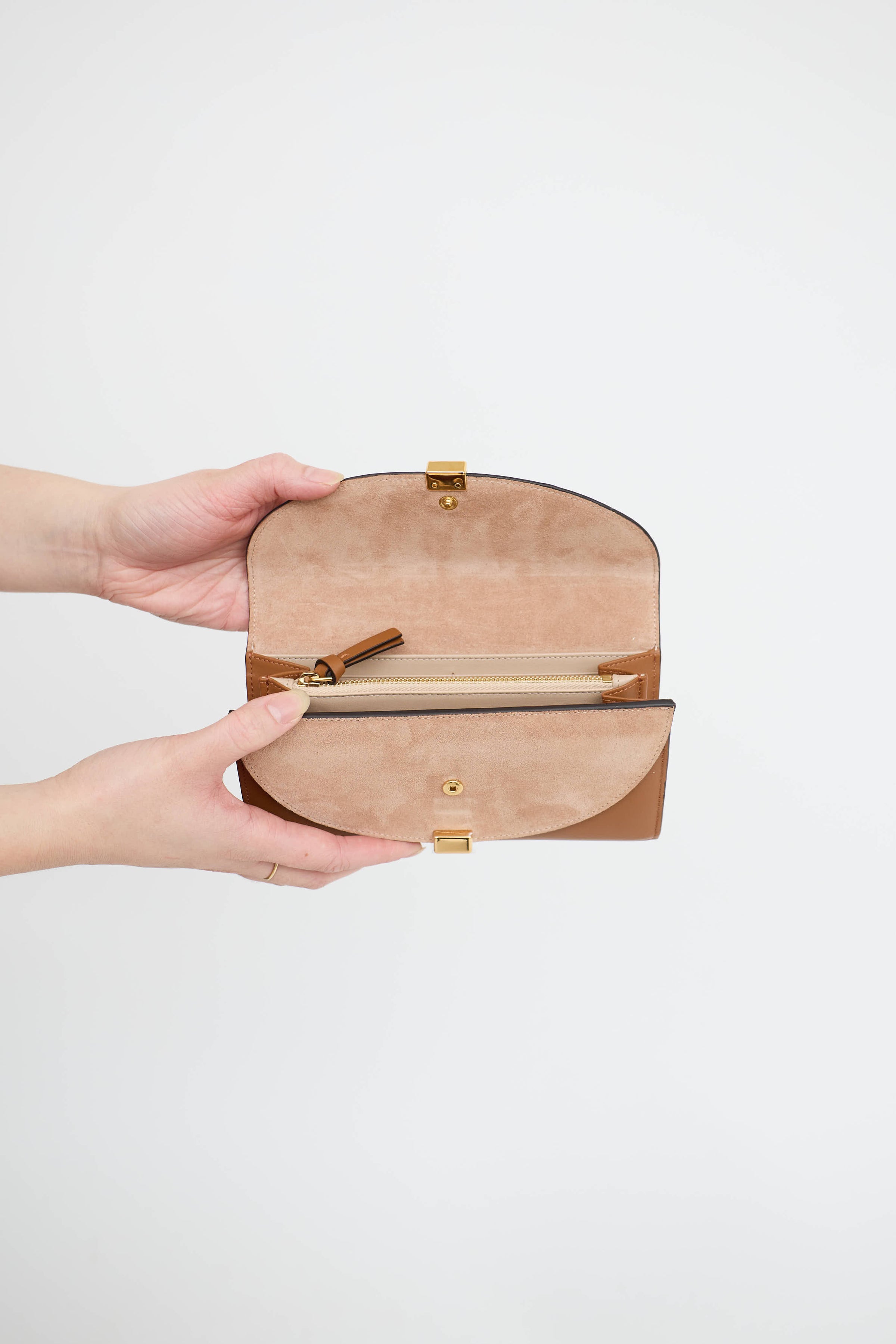 Pre-owned Chloe multicolour Georgia wallet featuring tri-colour styling, gold tone hardware, debossed logo at flap, snap closure, one main compartment, one middle zip pocket, two two bill slots, twelve card slots, and one slip pocket with snap closure.
