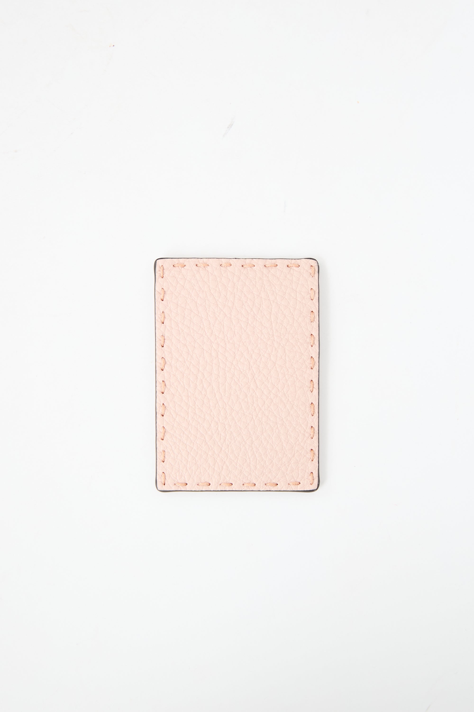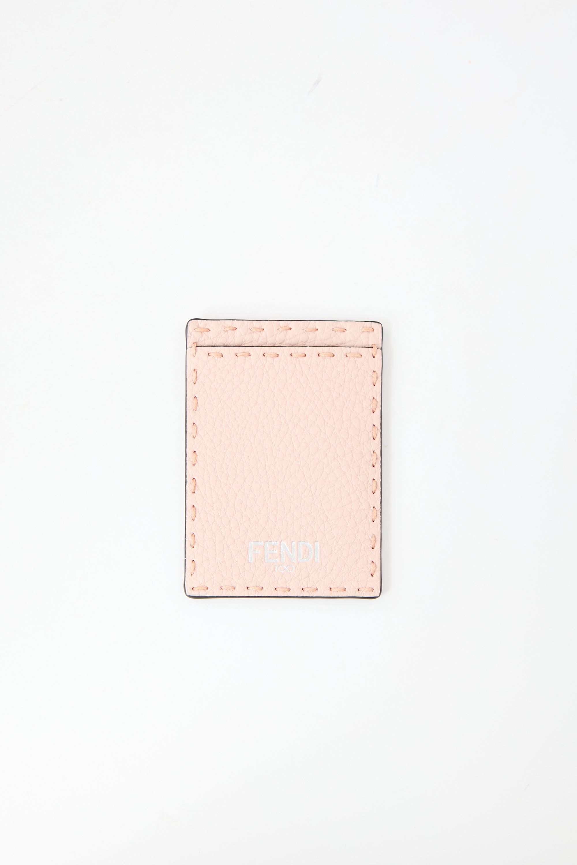 Pre-owned Fendi pink grain leather cardholder featuring tonal stitching, silver tone printed logo at bottom front, and one card slot, Comes with original dust bag.