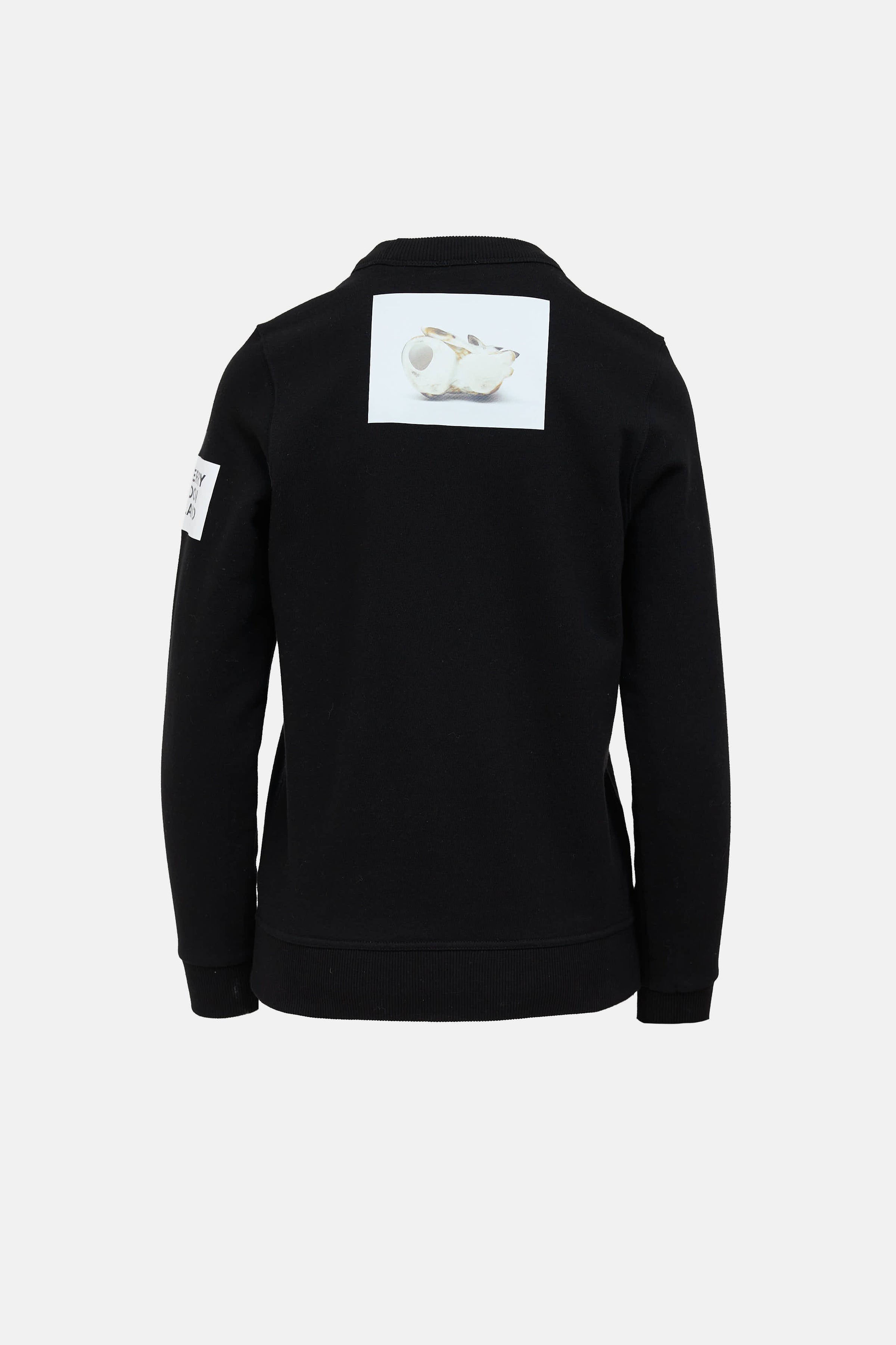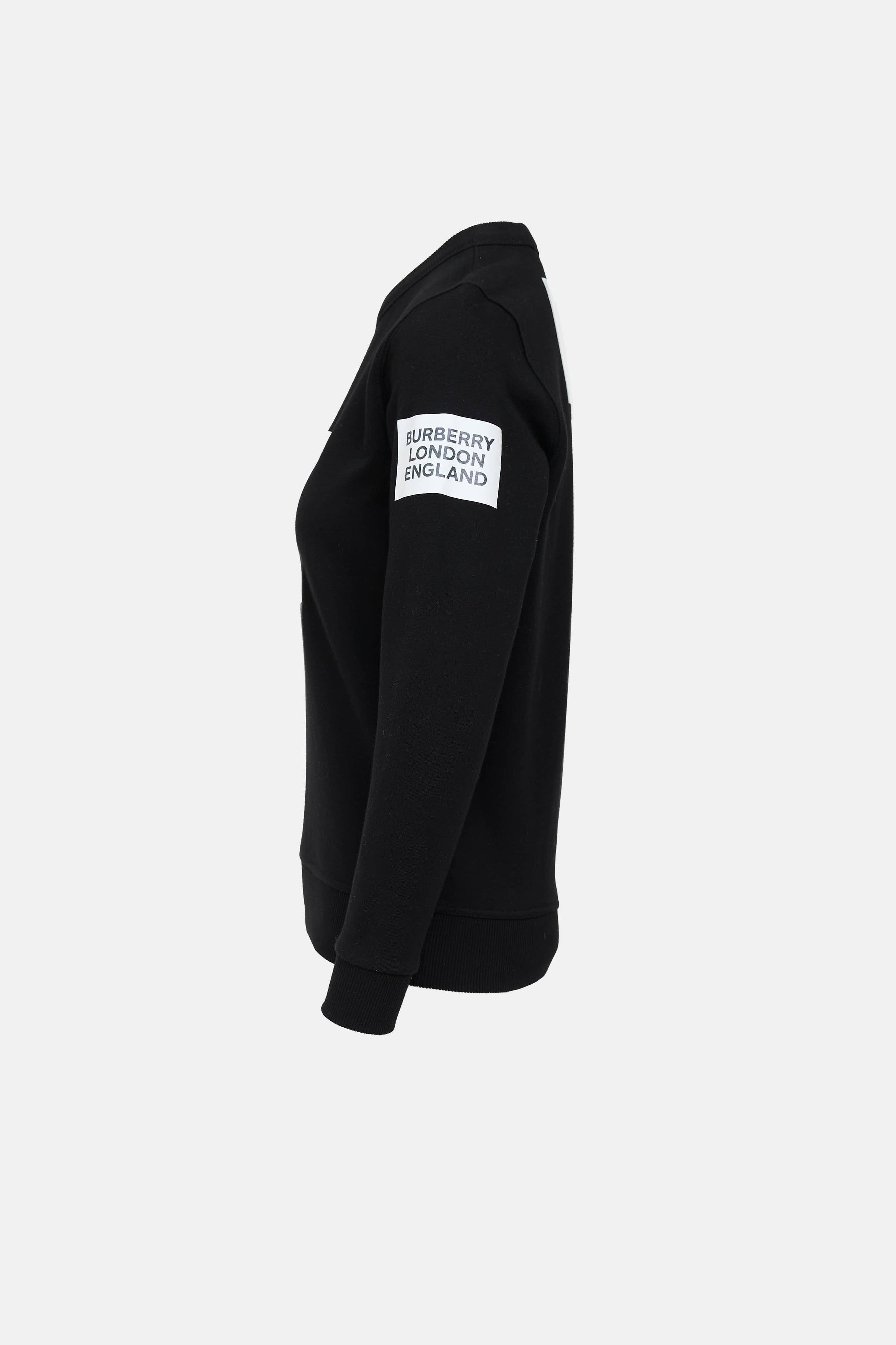 Pre-owned Burberry black sweatshirt featuring a white deer graphic logo at chest, crew neckline, long sleeves with graphic at shoulder, and ribbed hem.