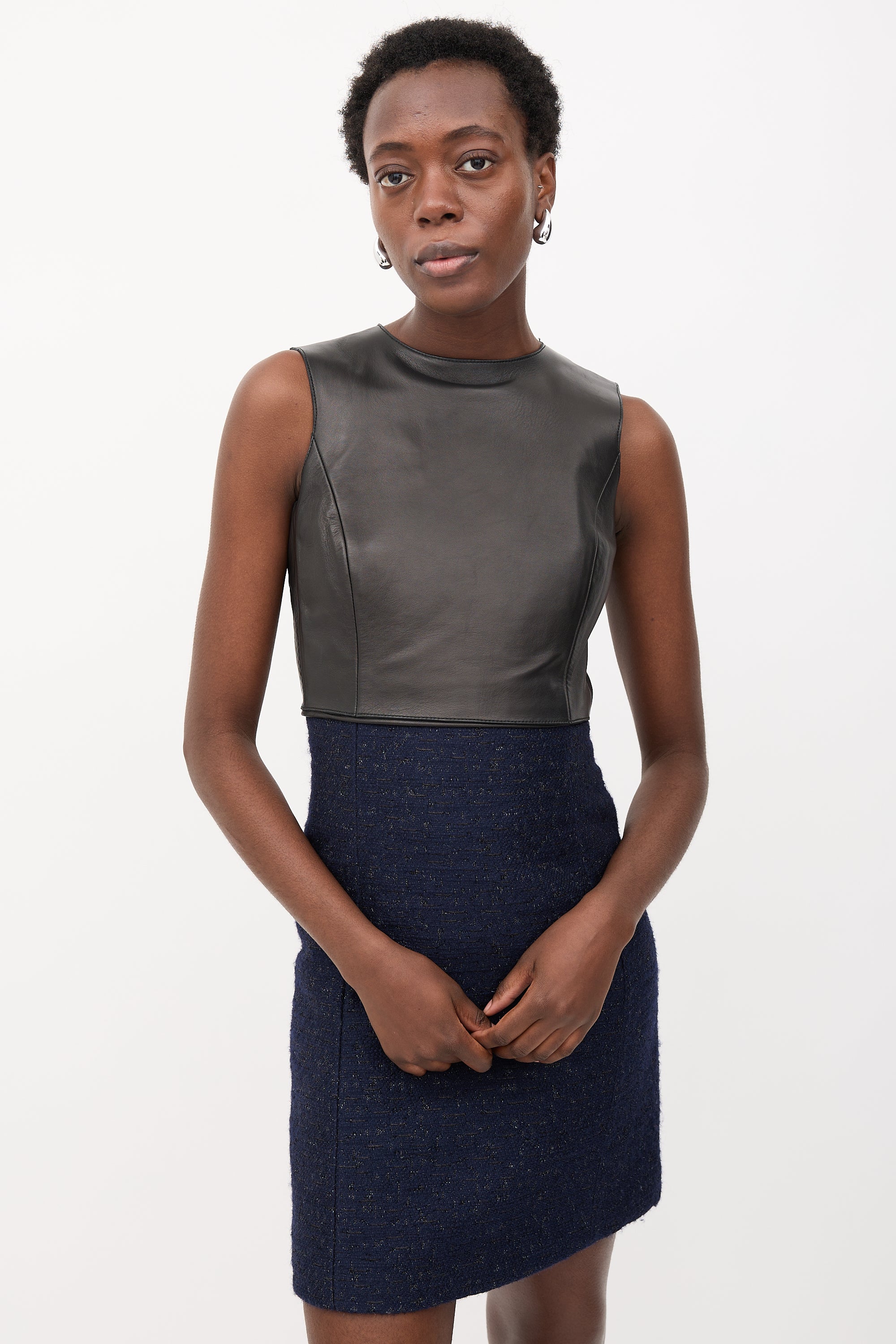 Pre-owned Celine black and navy sheath dress featuring a round neckline, darted bust at leather top, back zip closure, and sparkly tweed skirt. Lined. Phoebe Philo era design.