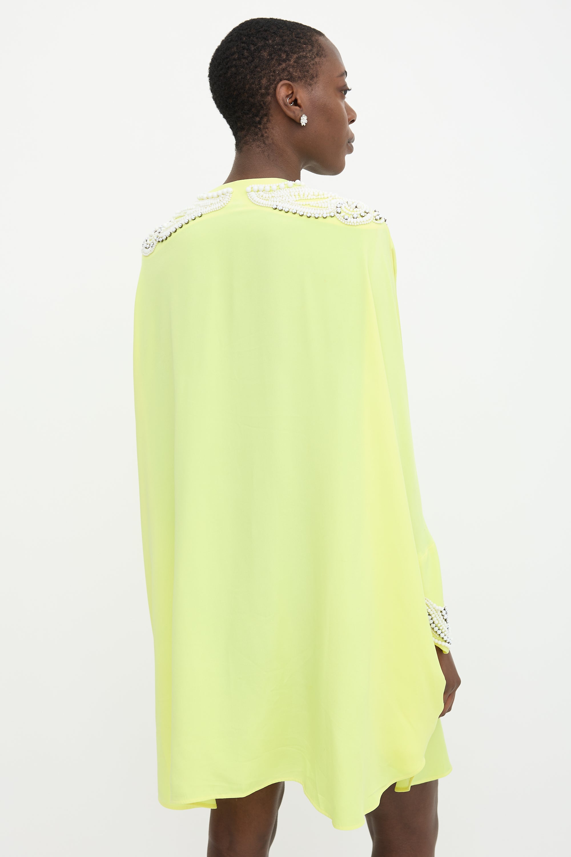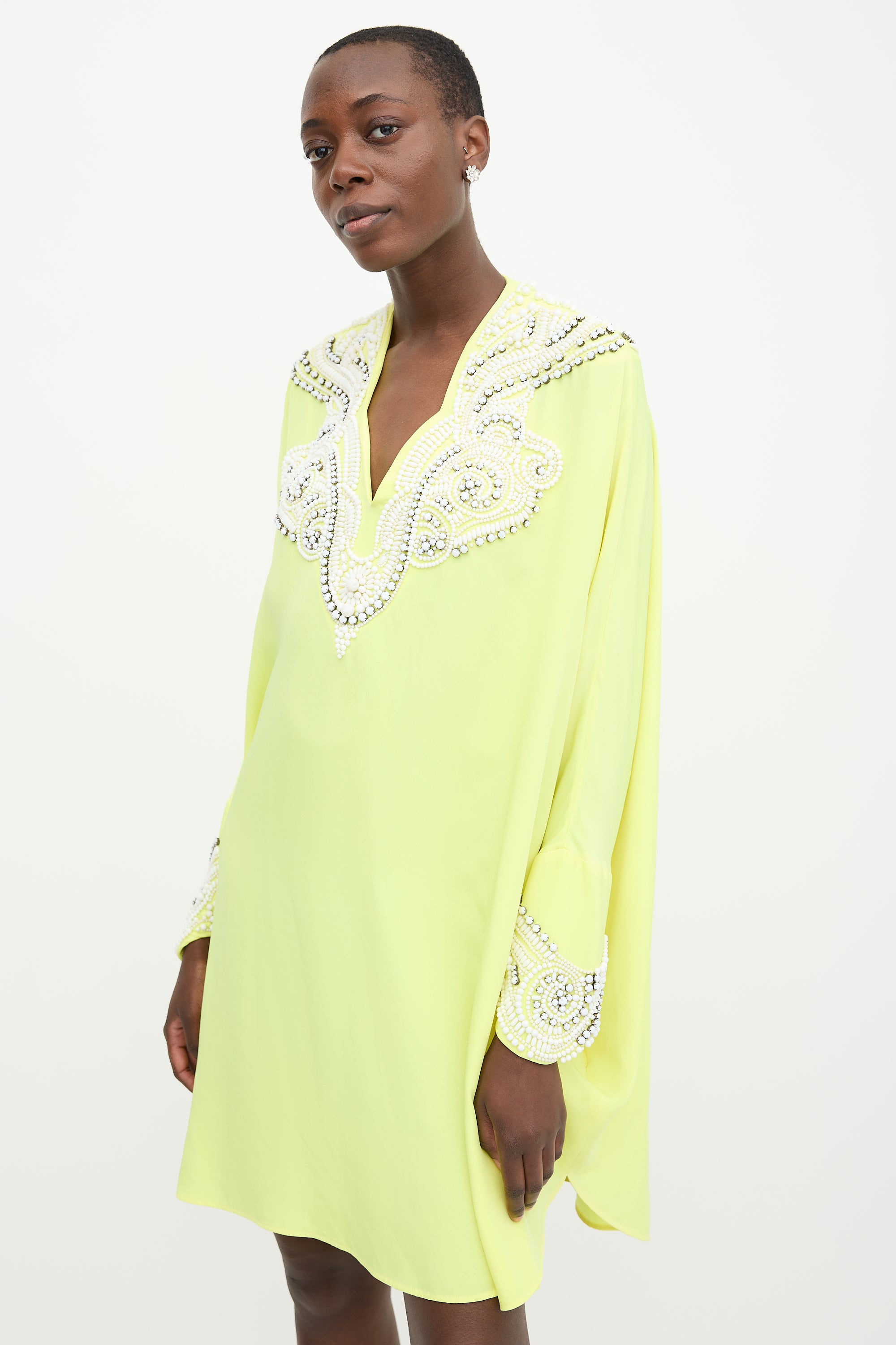 Pre-owned Emilio Pucci yellow mini tunic dress featuring white bead embellishment, split neckline, in seam pockets, and side vents.